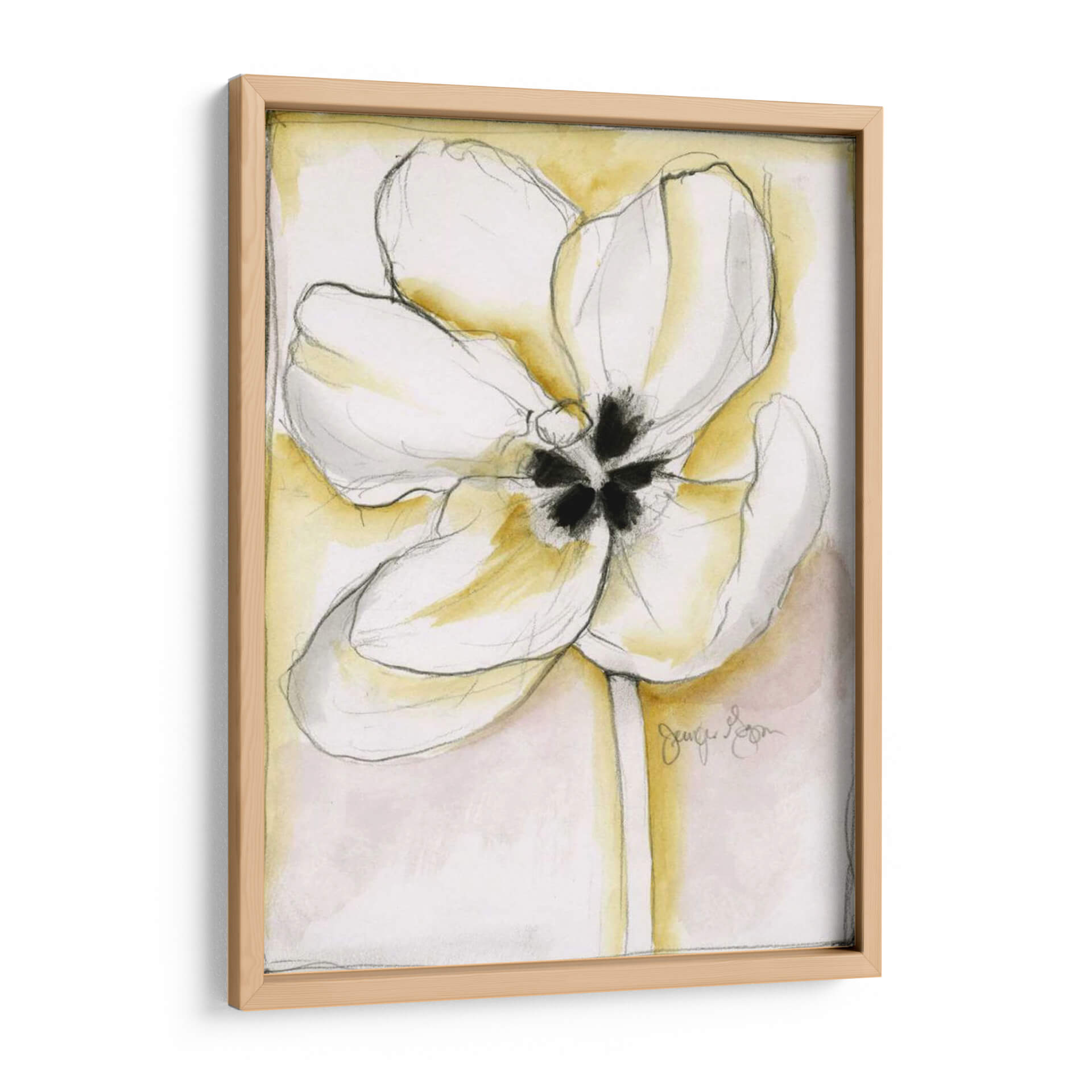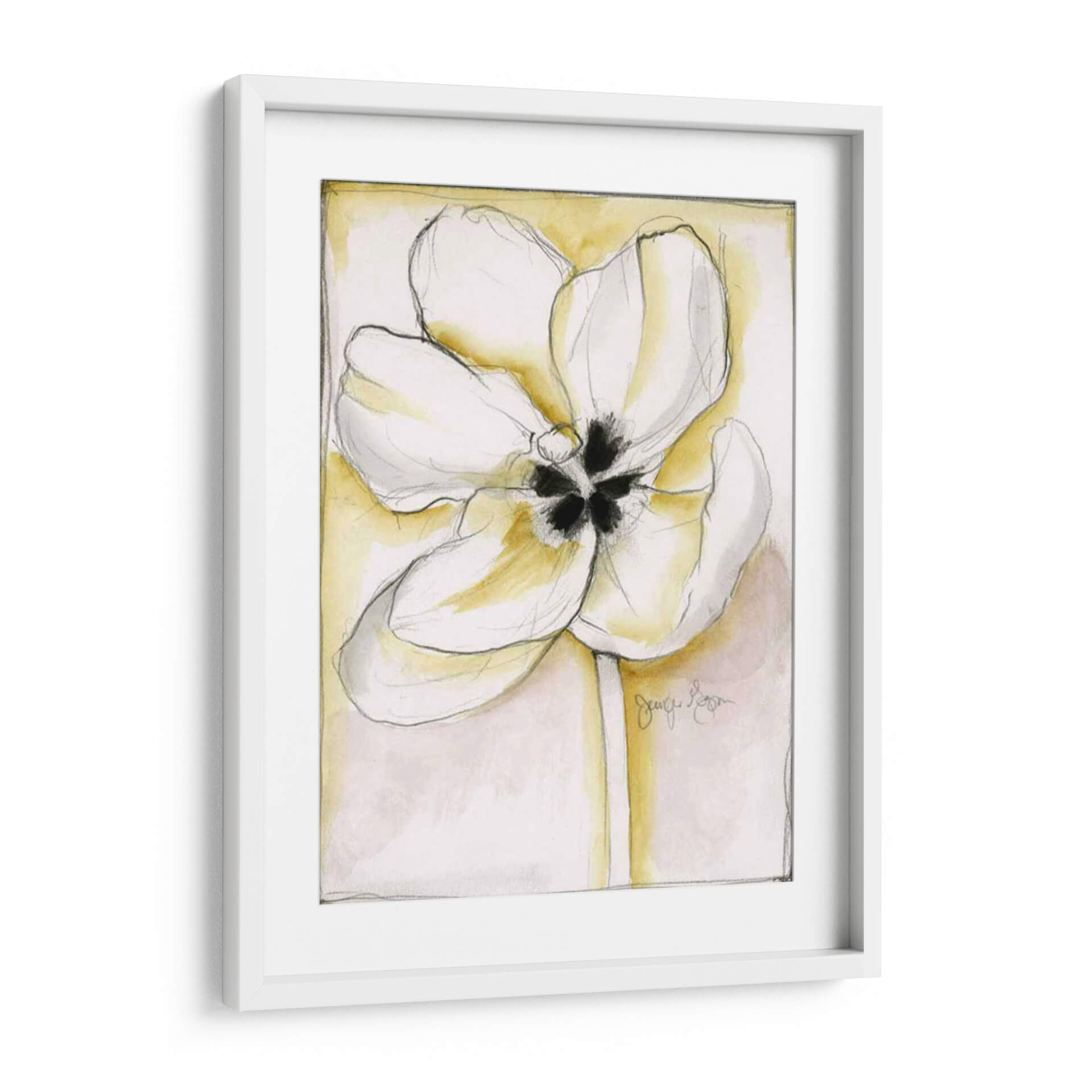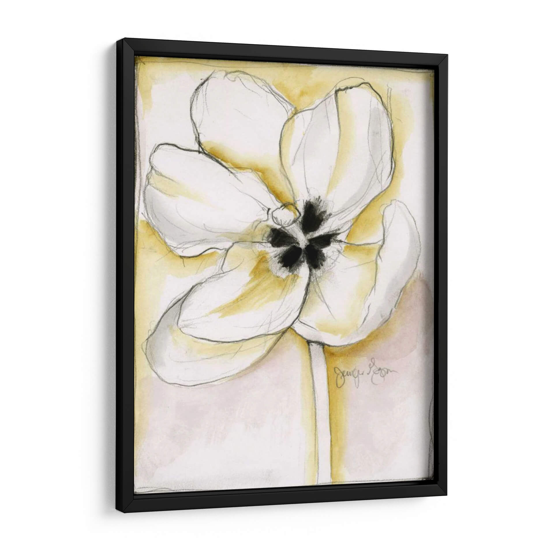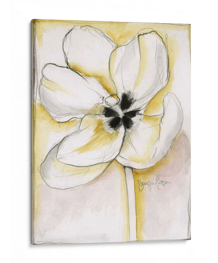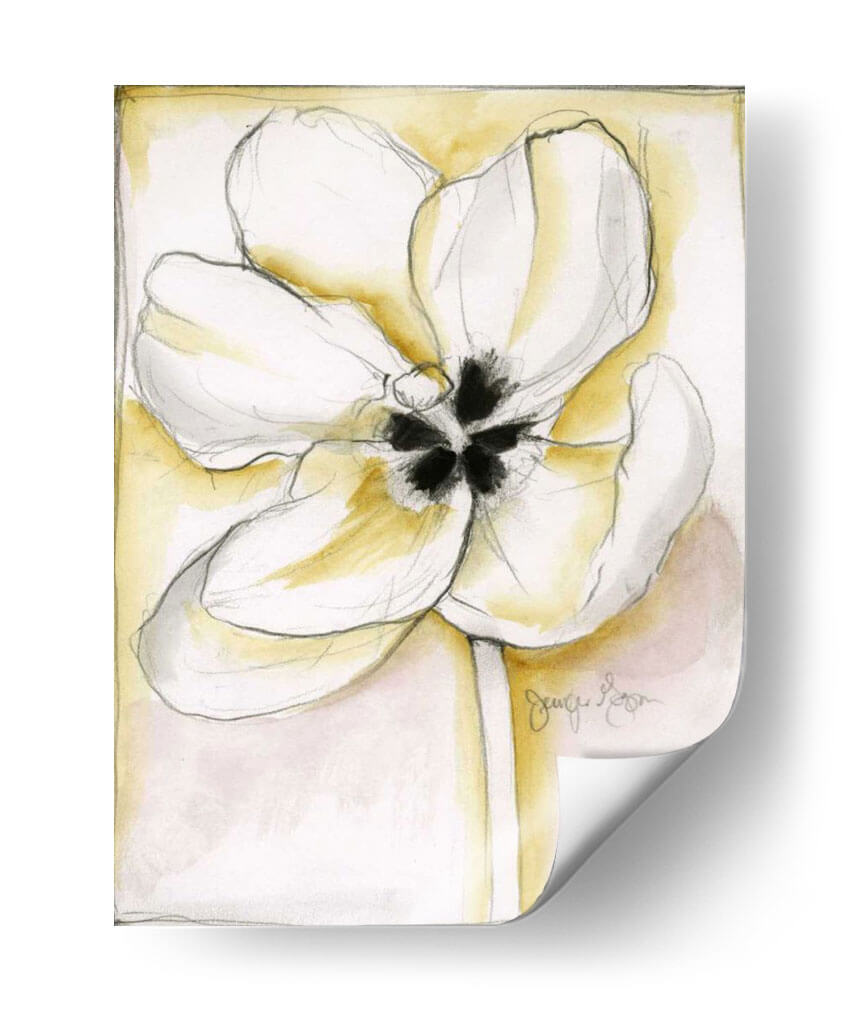 Sumérgete en la delicadeza y el encanto de "Belleza Fluida IV", una obra de arte cautivadora de Jennifer Goldberger. Este cuadro decorativo captura la esencia de una flor en plena eclosión, con sus pétalos blancos y etéreos delineados con trazos de lápiz precisos y expresivos. El fondo, bañado en suaves acuarelas de tonos amarillos y rosados pálidos, crea una atmósfera de serenidad y calidez, realzando la pureza de la flor central. La composición, centrada en la flor, invita a la contemplación, mientras que la técnica mixta de acuarela y dibujo a mano alzada le otorga una textura y profundidad únicas. Es una pieza que evoca calma, elegancia y la belleza efímera de la naturaleza, perfecta para añadir un toque de sofisticación natural a tu hogar u oficina. Ideal para quienes buscan arte que combine la delicadeza floral con un estilo contemporáneo y minimalista, este cuadro decorativo es un acierto seguro para crear un ambiente tranquilo y acogedor en cualquier espacio. Su diseño versátil se adapta a salones, dormitorios o estudios, aportando luz y un toque artístico inconfundible.