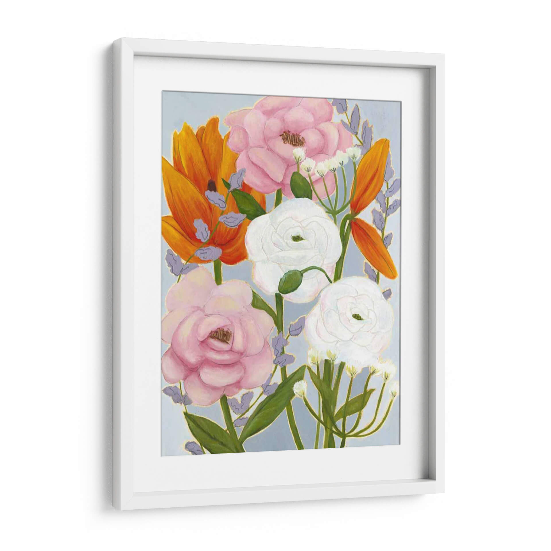 Inunda tus espacios con la frescura y vitalidad del cuadro decorativo 'Bouquet De La Mañana II' de Grace Popp. Esta obra de arte contemporáneo captura la delicadeza de un arreglo floral matutino, presentando una vibrante explosión de colores que transformará cualquier habitación. La composición presenta una mezcla armoniosa de grandes flores en tonos rosa empolvado y blanco puro, contrastando audazmente con pétalos naranjas intensos y delicadas pinceladas de lavanda. El fondo en un suave tono azul pálido resalta la riqueza cromática de las flores, creando una atmósfera serena y a la vez enérgica. El estilo artístico, que evoca una sensibilidad moderna con toques de expresionismo floral, invita a la contemplación y añade un punto focal sofisticado. Ideal para dar vida a salones, dormitorios o recibidores, este cuadro decorativo es perfecto para quienes buscan añadir un toque de naturaleza estilizada y color a su hogar u oficina. Permite que la belleza atemporal de las flores llene tu vida de alegría y optimismo. Añade esta pieza única a tu colección y experimenta la transformación de tu espacio con arte que inspira y deleita.