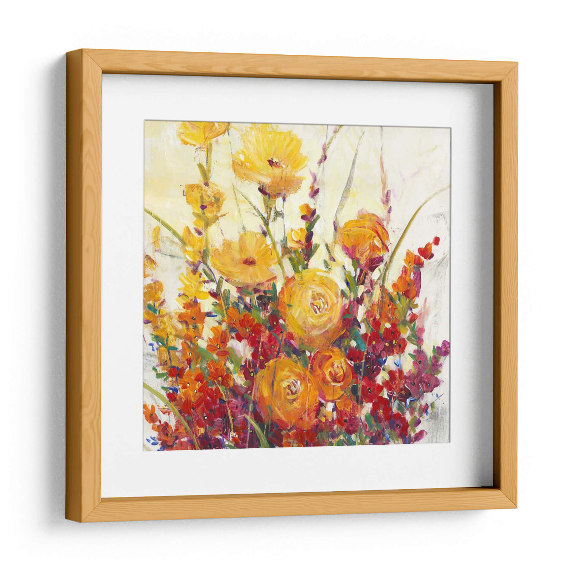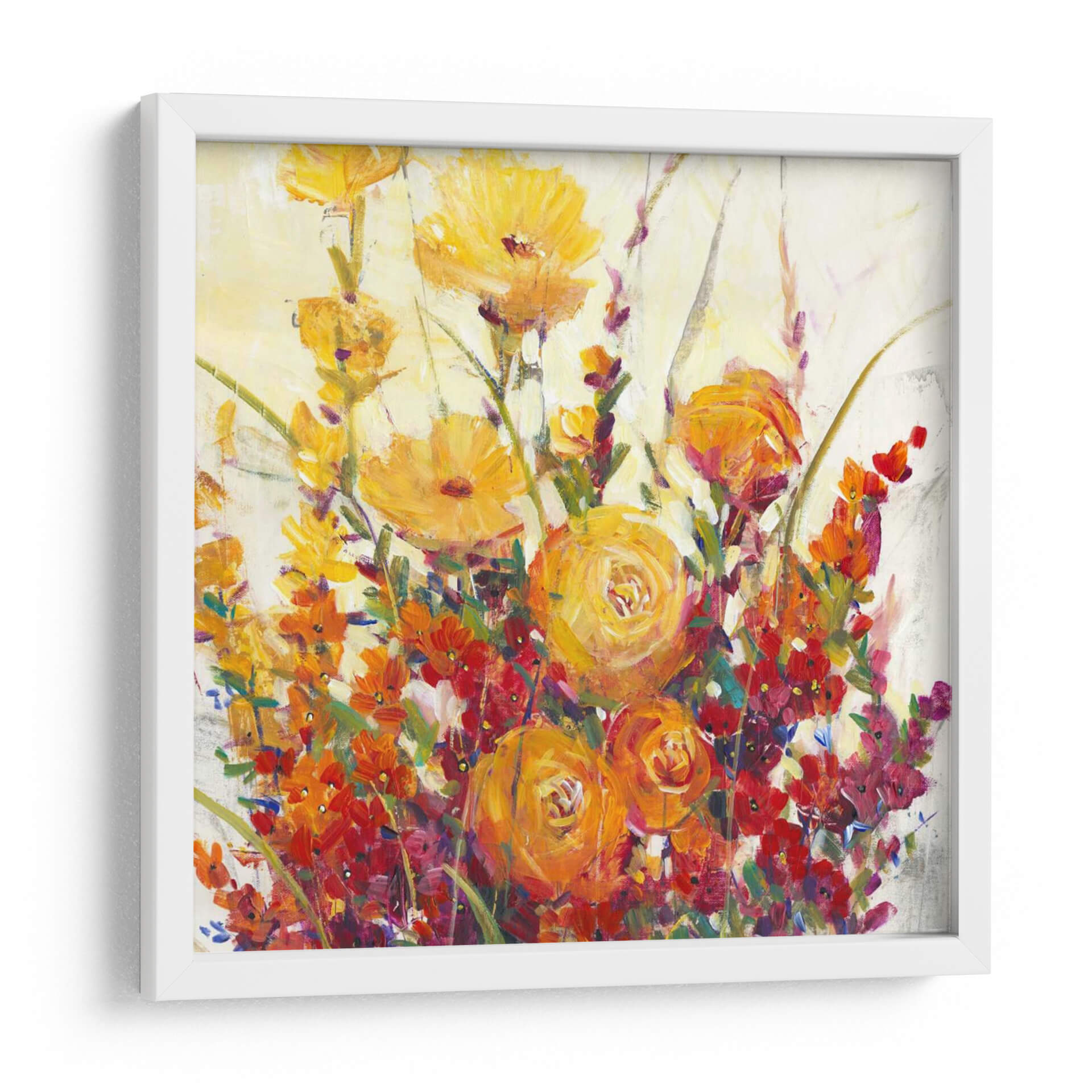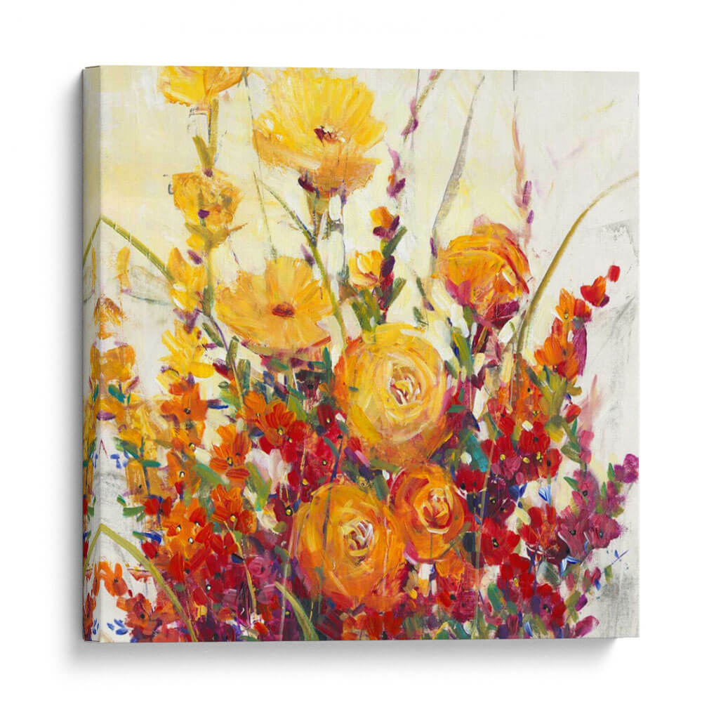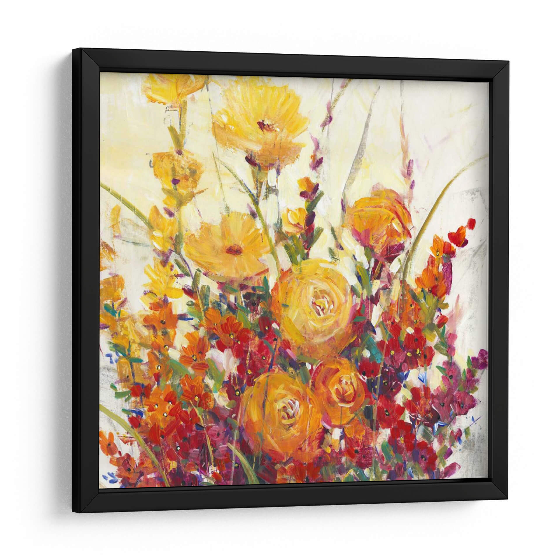 Sumérgete en la vitalidad y el color con "Bouquet Mixto I", una obra de arte contemporáneo que captura la esencia de un jardín exuberante en plena floración. Las pinceladas expresivas del artista Tim OToole dan vida a un vibrante arreglo floral, dominado por tonos cálidos de amarillo, naranja y rojo, salpicados con toques de púrpura y verde. Cada flor parece bailar sobre un fondo etéreo y texturizado, creando una atmósfera de alegría y energía que ilumina cualquier espacio. Este cuadro decorativo es perfecto para añadir un estallido de color y vida a tu sala de estar, comedor o incluso a un espacio de oficina. Su estilo semi-abstracto permite una interpretación personal, invitando al espectador a perderse en los detalles y sentir la frescura de la naturaleza. "Bouquet Mixto I" no es solo una pieza decorativa, sino una ventana a un mundo de optimismo y belleza natural, ideal para quienes buscan infundir calidez y un toque artístico único en su hogar. Descubre la magia de las flores a través de la mirada de un artista contemporáneo y transforma tu ambiente.