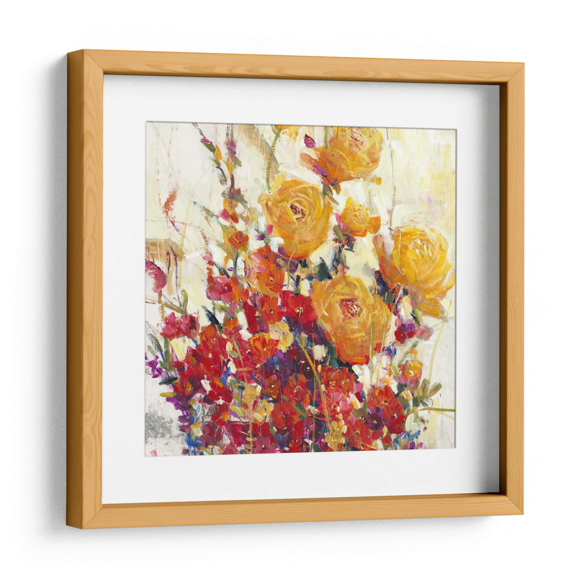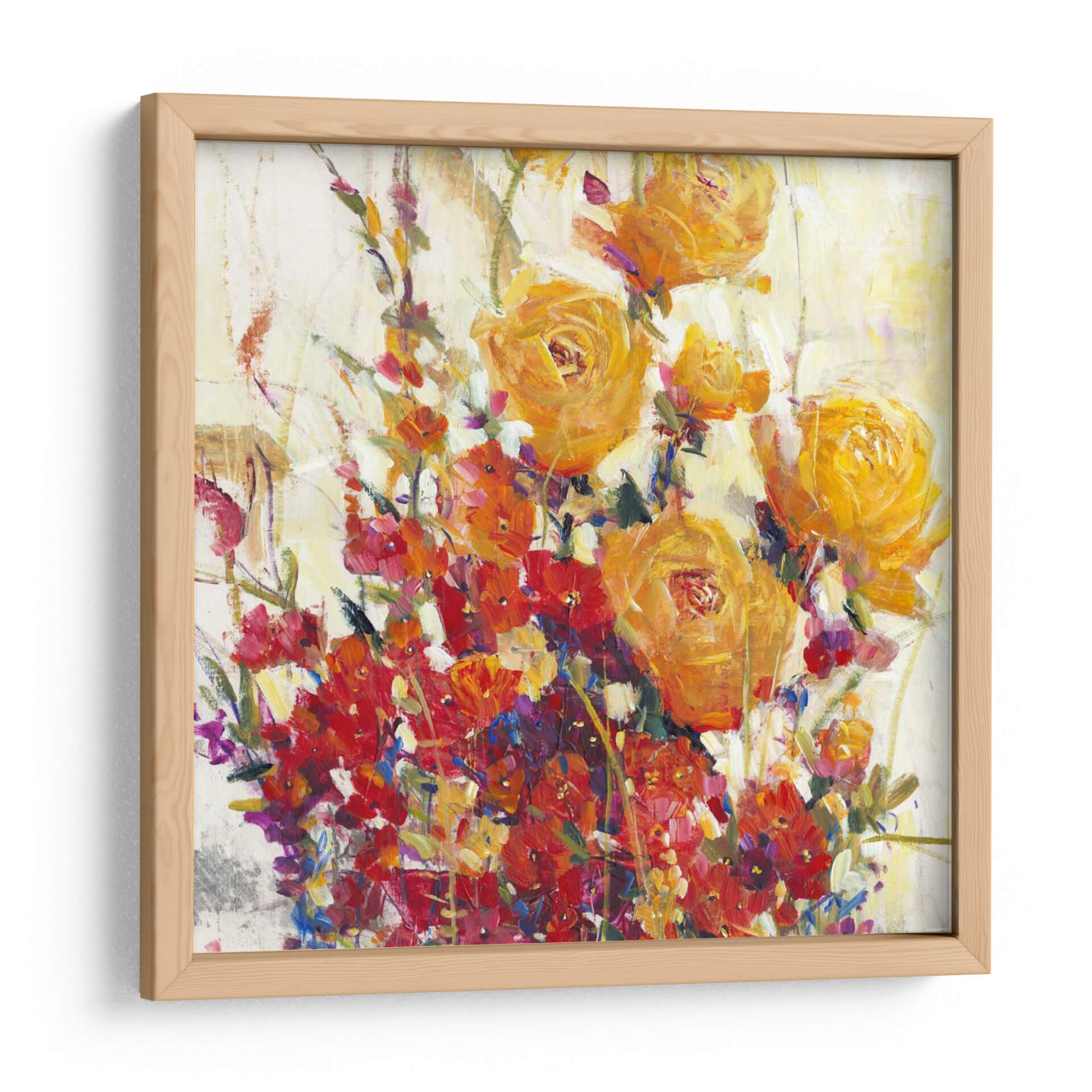 Sumérgete en la vibrante belleza de "Bouquet Mixto II", una obra de arte cautivadora de Tim O'Toole. Este cuadro decorativo es una explosión de color y vida, con un arreglo floral que irradia energía y alegría. Las rosas amarillas y anaranjadas se entrelazan con vibrantes flores rojas y toques de púrpura, creando una composición dinámica y cautivadora. La técnica de pincelada suelta y expresiva aporta una textura rica y una sensación de movimiento, como si las flores estuvieran danzando ante tus ojos. El fondo claro y texturizado proporciona un contraste sutil que permite que el exuberante ramo floral sea el protagonista indiscutible. "Bouquet Mixto II" es una pieza perfecta para añadir un toque de vitalidad y calidez a cualquier espacio, desde una sala de estar moderna hasta un comedor acogedor o un estudio inspirador. Su estilo contemporáneo y su paleta de colores cálidos lo convierten en una adición versátil que complementará una variedad de decoraciones interiores, infundiendo a tu hogar una atmósfera de optimismo y frescura.