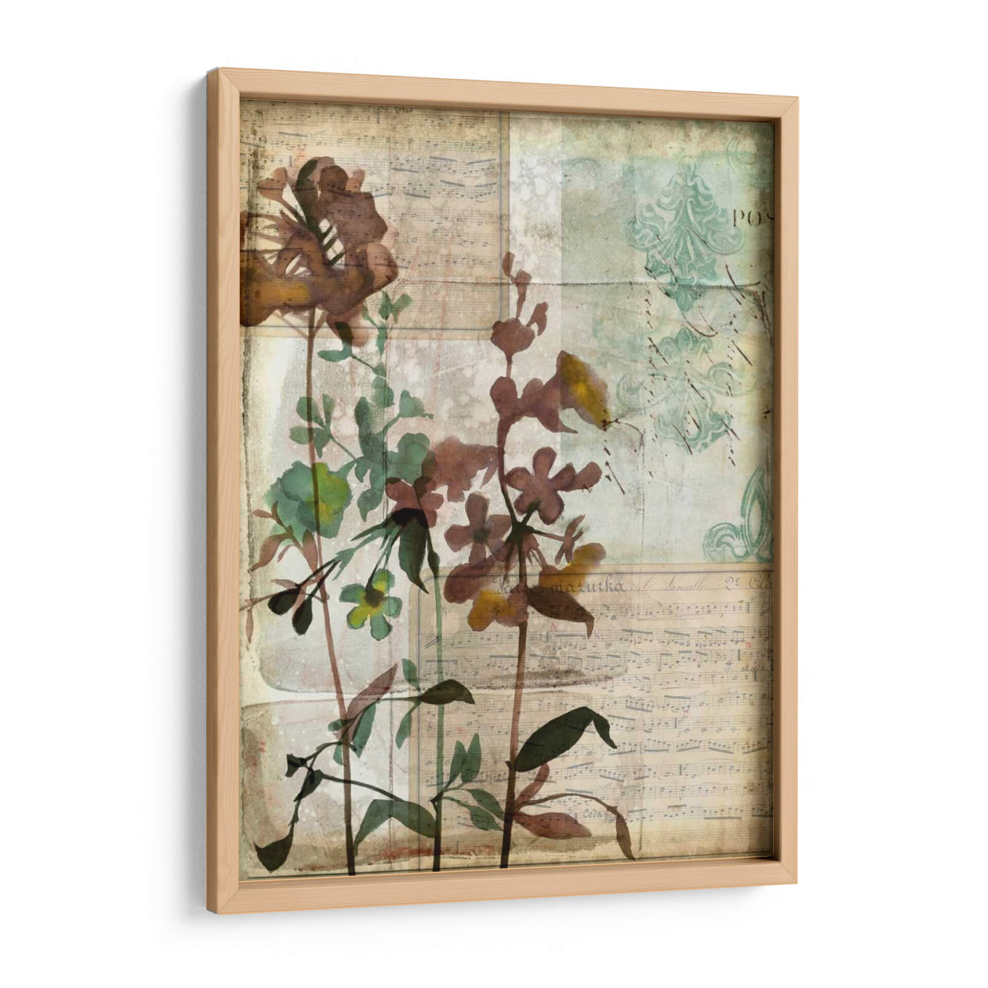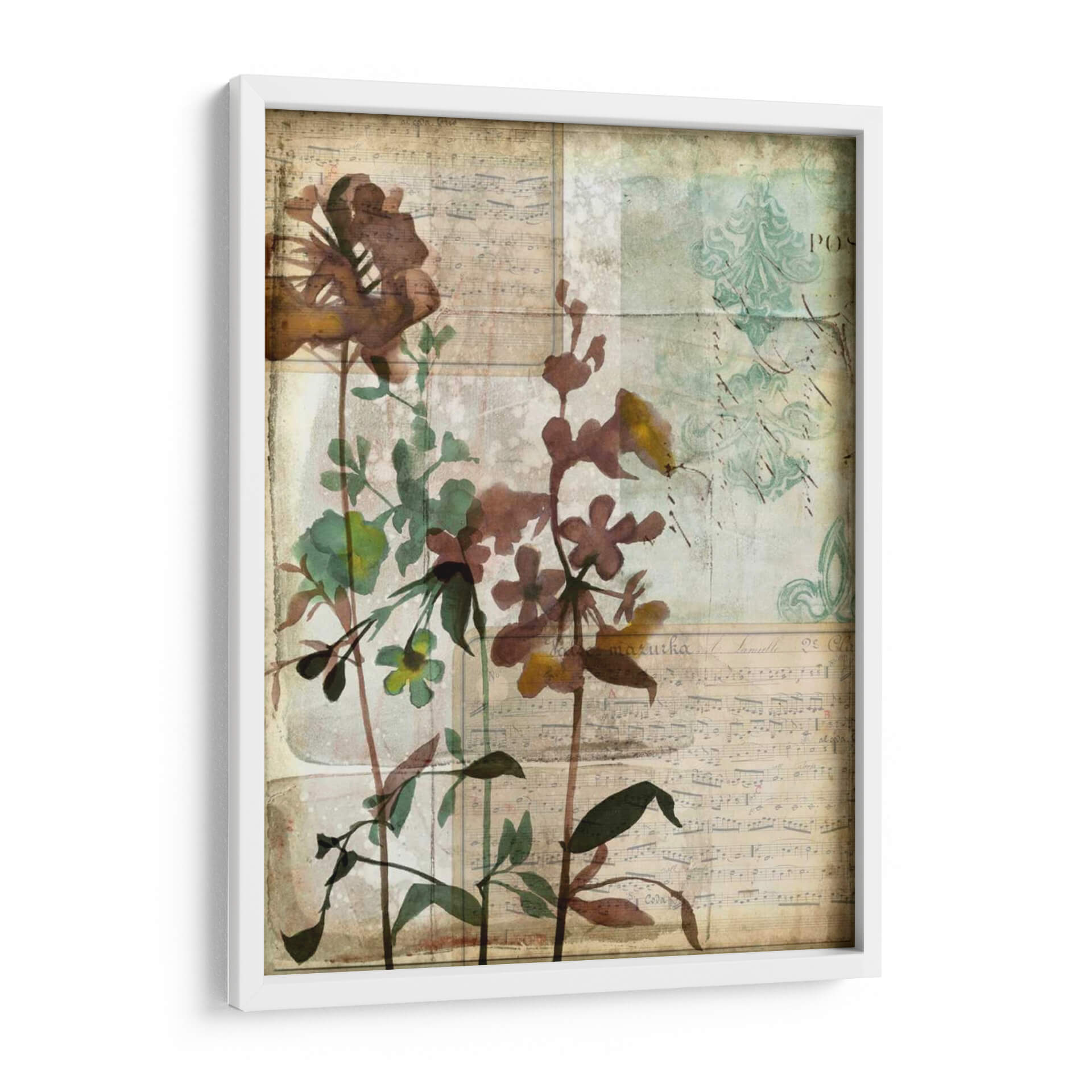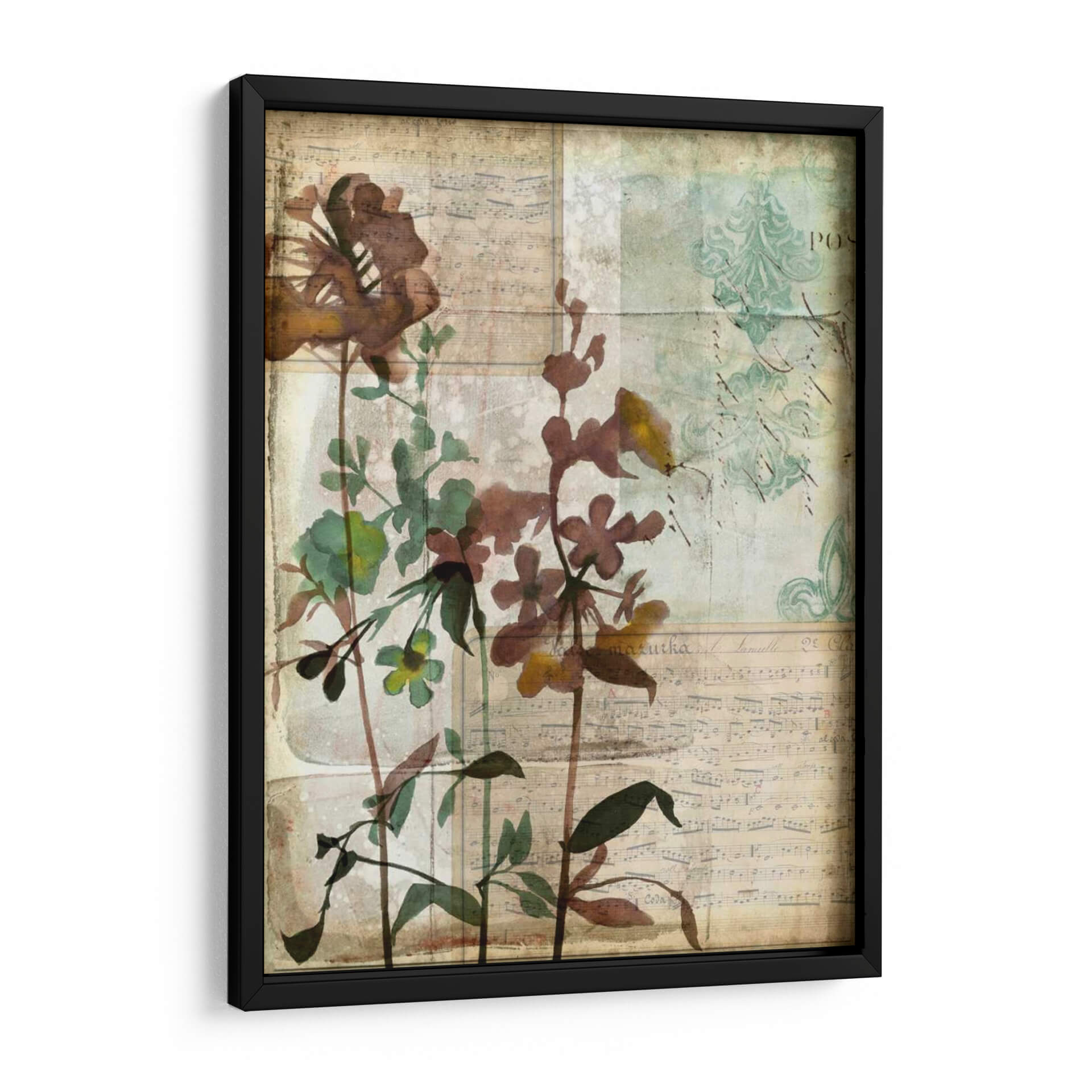 Sumérgete en la delicadeza y el encanto atemporal de "Caja De Música Floral I", una obra de arte que evoca una profunda sensación de nostalgia y belleza natural. Jennifer Goldberger, la artista, ha tejido magistralmente elementos florales etéreos sobre un fondo de partituras antiguas y texturas desgastadas, creando una composición visualmente rica y emocionalmente resonante. Los tonos tierra, marrones suaves, verdes apagados y toques de amarillo ocre se entrelazan con delicados adornos en tono aguamarina, aportando una atmósfera serena y soñadora. Las siluetas de flores y hojas, pintadas con una técnica que recuerda a la acuarela o al aguafuerte, parecen flotar sobre el papel, sugiriendo un delicado vals musical. Esta pieza es ideal para quienes buscan añadir un toque de elegancia clásica y un aire de historia a sus espacios. Perfecta para un rincón de lectura, un dormitorio tranquilo o como acento sofisticado en un estudio, "Caja De Música Floral I" invita a la contemplación y transforma cualquier ambiente en un refugio de paz y arte refinado. Descubre la sinfonía visual que esta obra maestra contemporánea tiene para ofrecer.