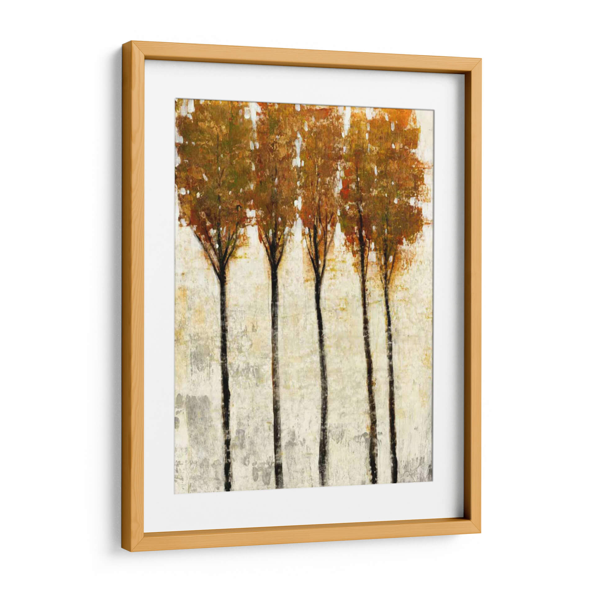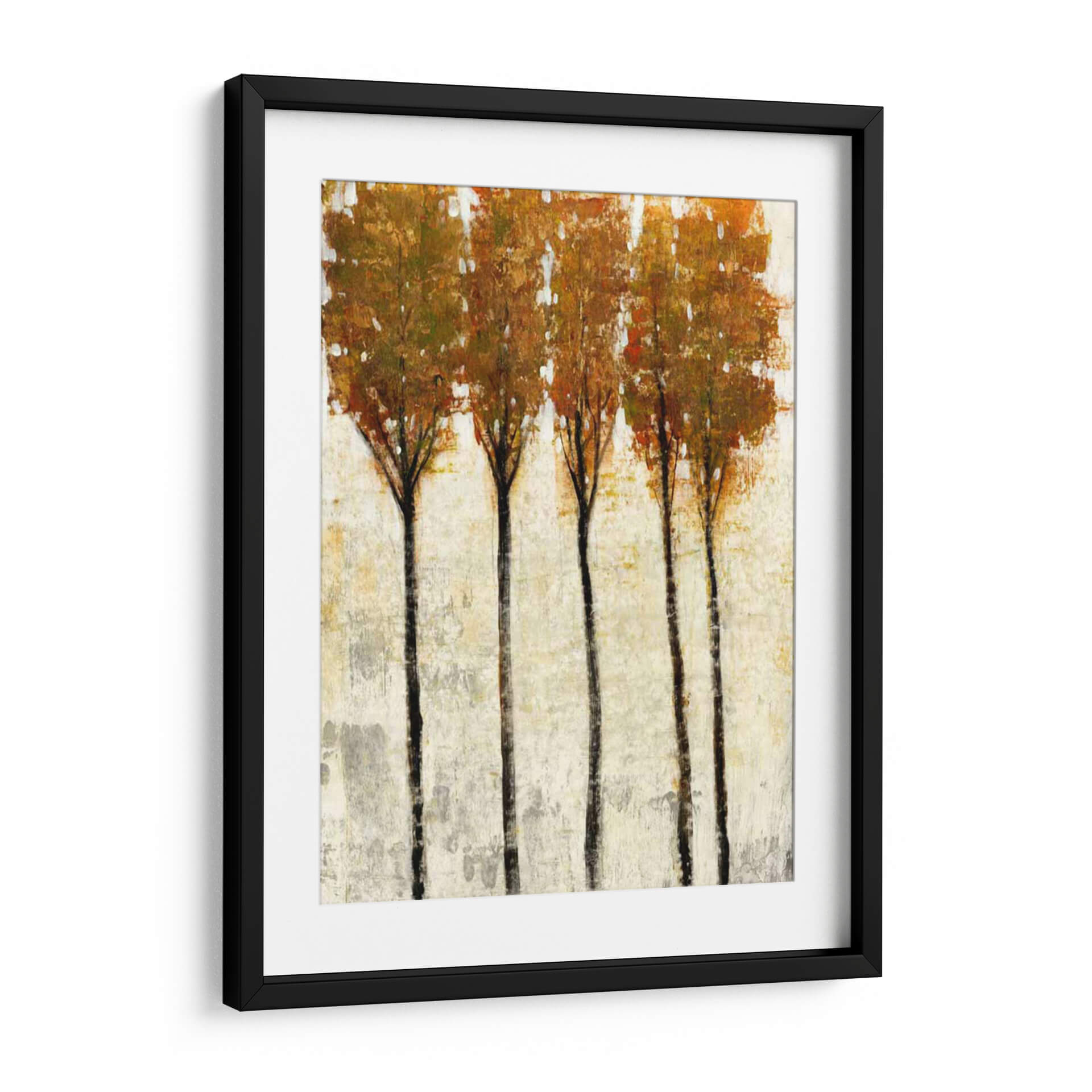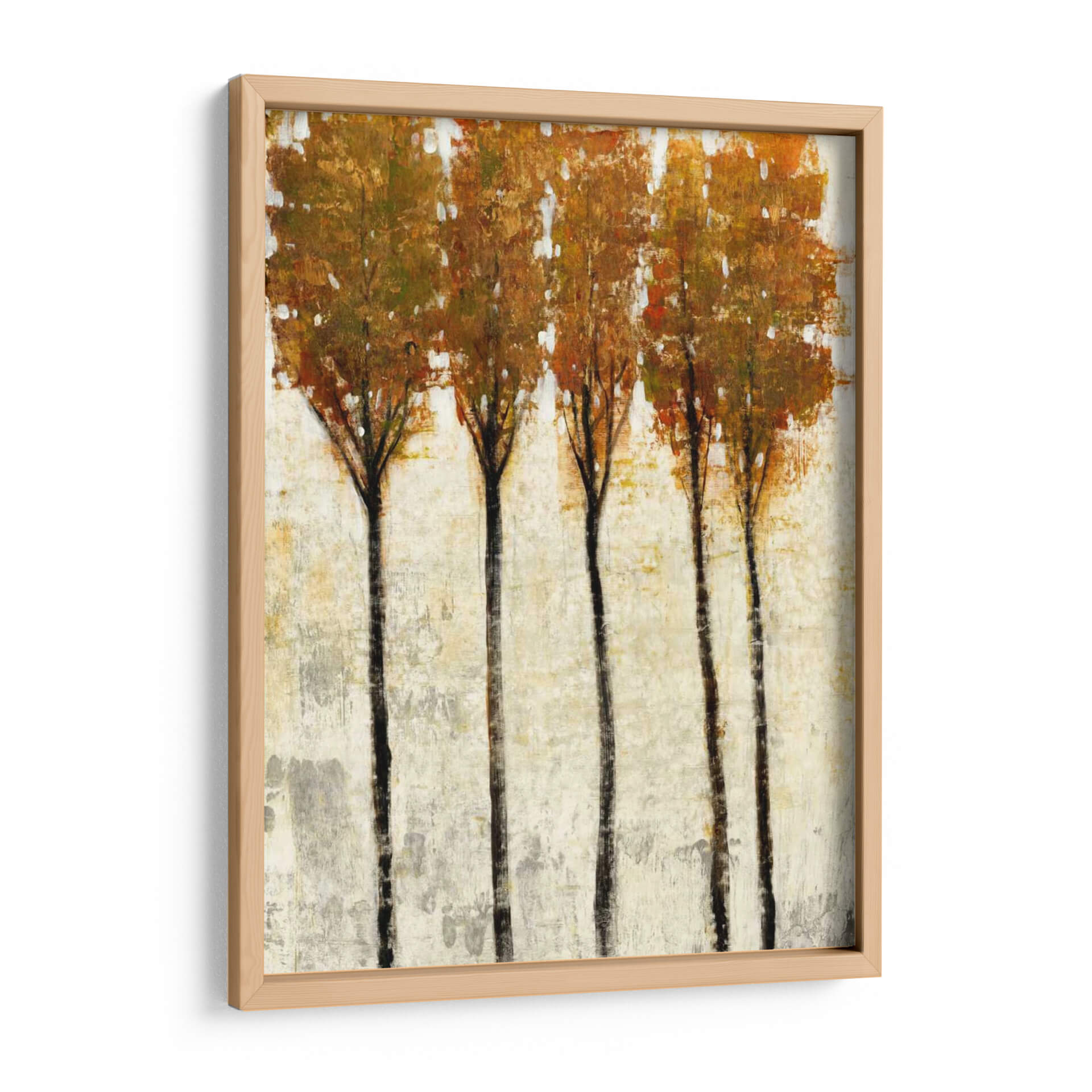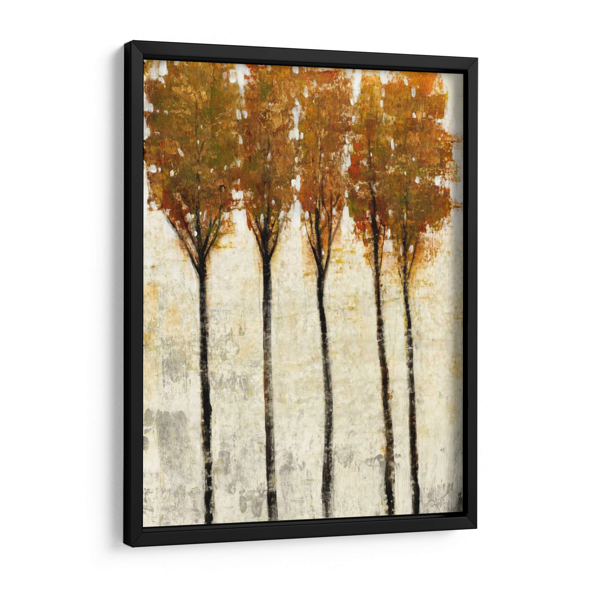 Sumérgete en la serenidad otoñal con "Canopy De Cristal I", una obra de arte que captura la esencia de un bosque en transición. Este cuadro decorativo presenta una hilera de árboles esbeltos con copas exuberantes en tonos cálidos de ocre, naranja y verde musgo, contrastando bellamente con los troncos oscuros y las pinceladas texturizadas que evocan la corteza. El fondo, con su paleta de blancos sucios, grises sutiles y toques de amarillo pálido, aporta una atmósfera etérea y texturizada, reminiscente de un lienzo desgastado o un paisaje brumoso. El estilo abstracto-impresionista de Tim O'Toole permite que la obra transmita una sensación de calma y contemplación, invitando a la introspección. Ideal para espacios que buscan un toque de naturaleza y sofisticación, este cuadro es perfecto para salones modernos, comedores acogedores o incluso como pieza central en una oficina que desee transmitir tranquilidad y conexión con el exterior. La composición vertical y la repetición de los árboles crean un ritmo visual armonioso, haciendo de "Canopy De Cristal I" una adición atemporal y evocadora a cualquier decoración.