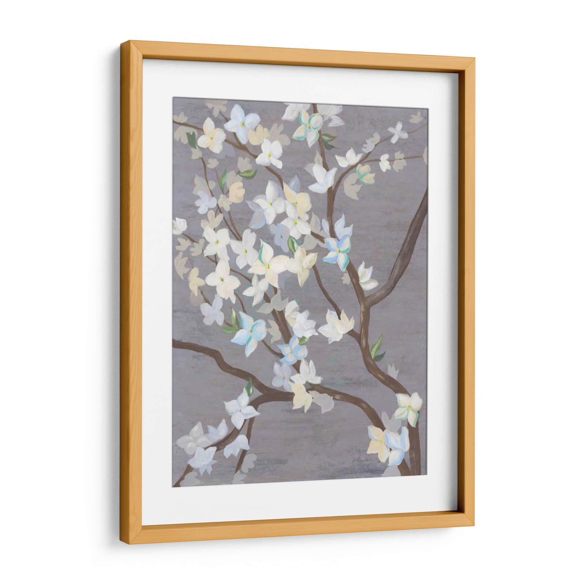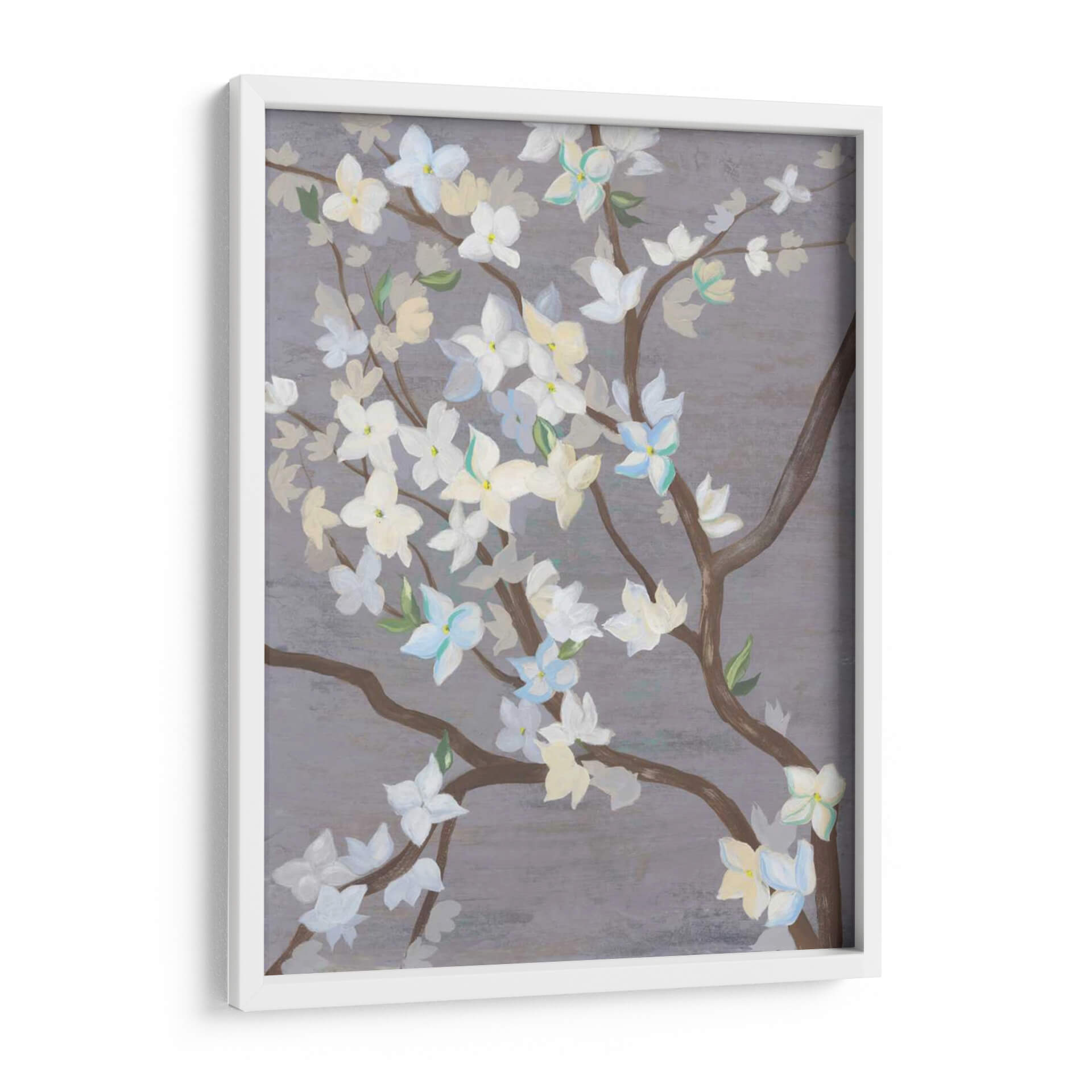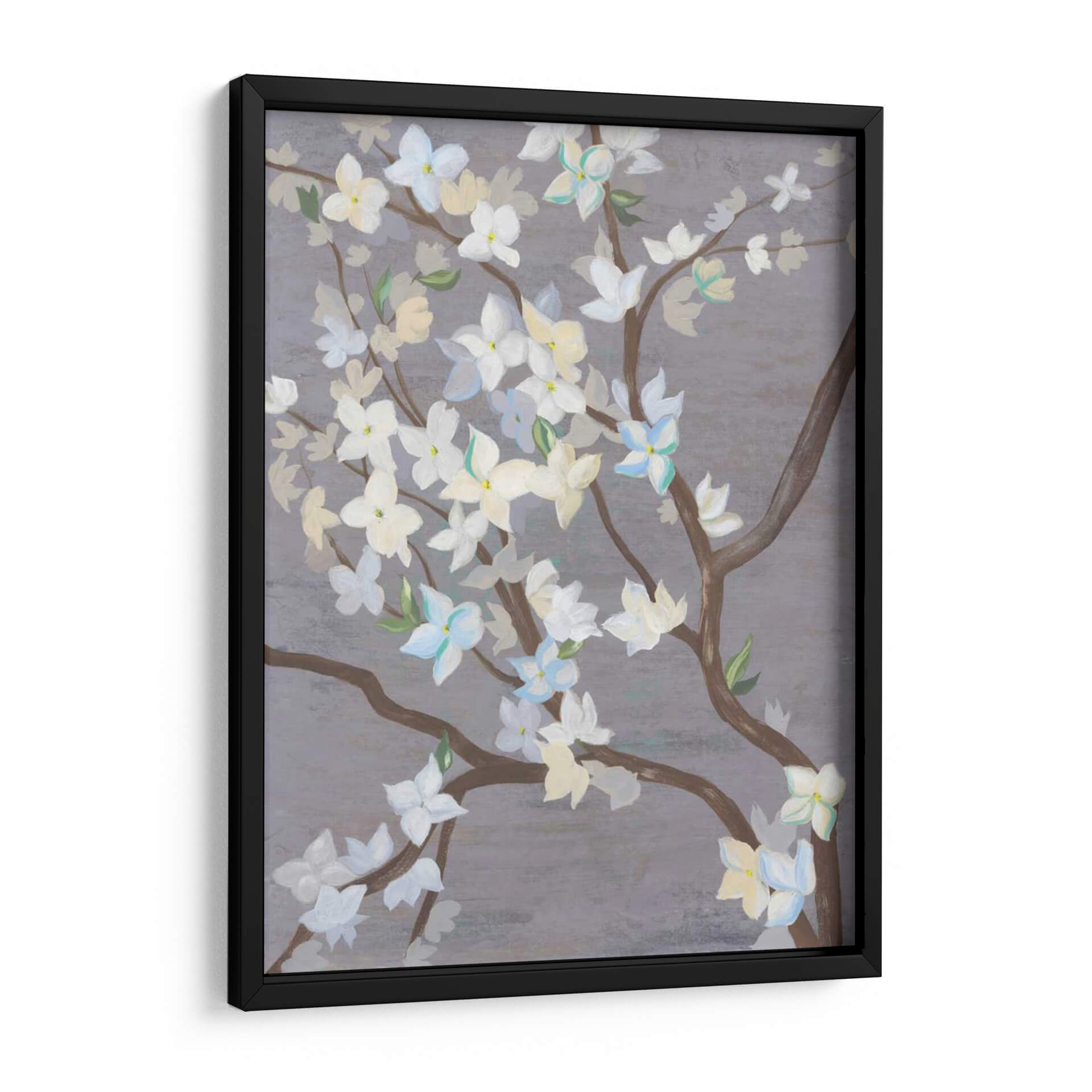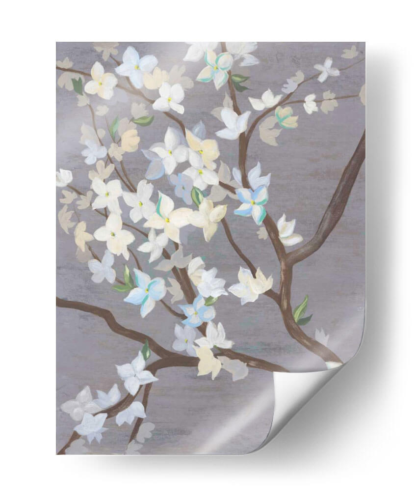 Sumérgete en la delicadeza etérea de "Cherry Blossom Haze II" de Grace Popp, una obra de arte que captura la efímera belleza de los cerezos en flor con una elegancia sutil. Este cuadro decorativo presenta un delicado despliegue de ramas marrones entrelazadas, adornadas con una profusión de flores blancas y toques de azul pálido y crema. La paleta de colores, dominada por un fondo grisáceo texturizado y suave, realza la frescura y la fragilidad de los pétalos, creando una atmósfera de serenidad y calma contemplativa. El estilo, que combina elementos figurativos con una ejecución casi impresionista, invita a la introspección y a la apreciación de los pequeños milagros de la naturaleza. La composición, centrada en el crecimiento orgánico de las ramas y la explosión floral, aporta movimiento y vida a la pieza. Ideal para añadir un toque de sofisticación natural a cualquier espacio, desde un dormitorio tranquilo hasta un salón moderno o una oficina que busque un ambiente de paz y renovación. Este cuadro decorativo es una invitación a la contemplación, un recordatorio de la belleza transitoria y el renacimiento cíclico.