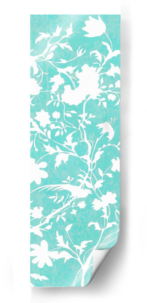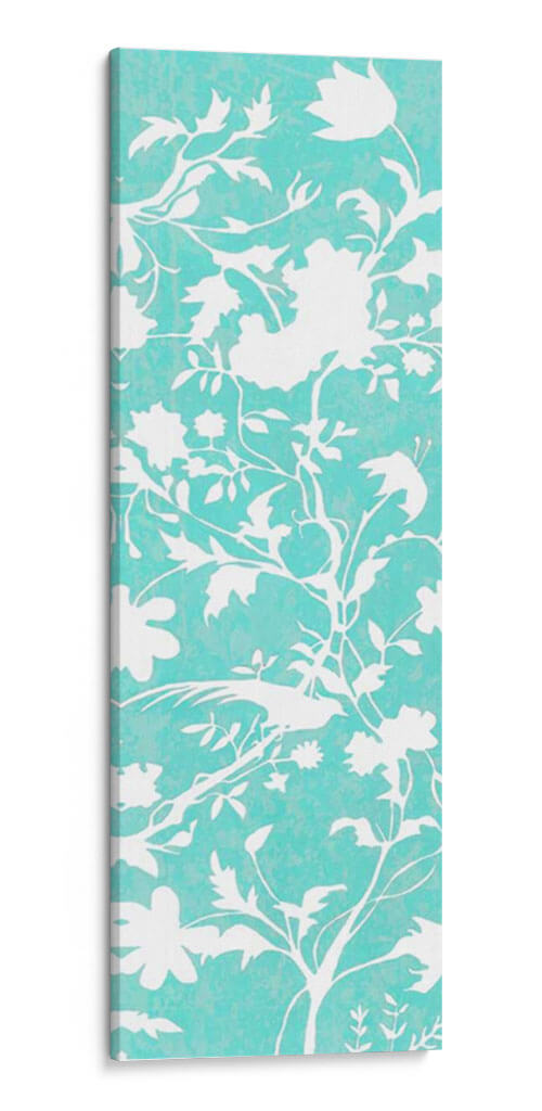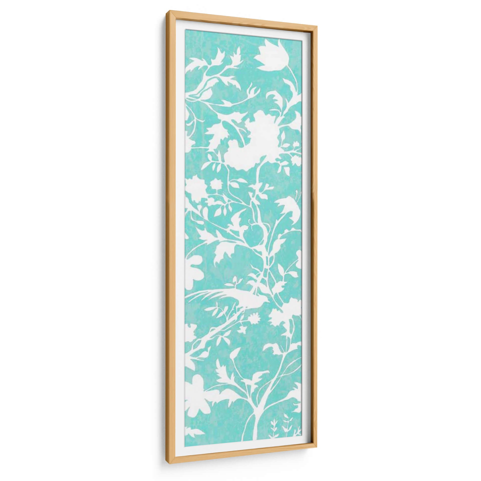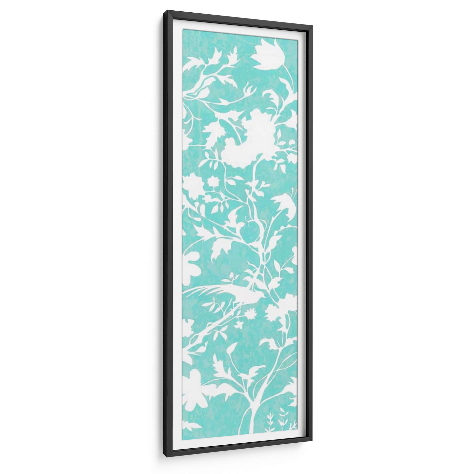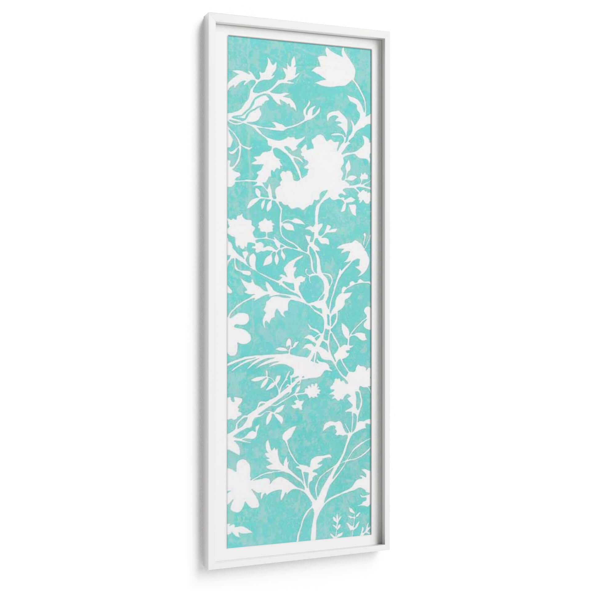 Sumérgete en la delicada belleza de "Chinoiserie Gráfica II", una obra de arte que evoca la elegancia de los diseños orientales con un toque contemporáneo. Esta pieza, creada por Naomi McCavitt, presenta un intrincado patrón de flores y follaje en silueta blanca sobre un vibrante fondo turquesa que recuerda a la porcelana antigua o a un cielo sereno. La composición vertical y el contraste nítido entre el blanco y el azul crean un punto focal dinámico, ideal para añadir un aire de sofisticación y tranquilidad a cualquier espacio. Las formas orgánicas de las ramas, hojas y flores, junto con la sutil presencia de aves, invitan a la contemplación y aportan una sensación de conexión con la naturaleza. Este cuadro decorativo es perfecto para salas de estar, dormitorios o pasillos donde se busca un acento de color y un diseño distintivo que sea a la vez moderno y atemporal. Su estilo gráfico y estilizado lo hace versátil, complementando decoraciones minimalistas, eclécticas o inspiradas en la estética asiática. "Chinoiserie Gráfica II" no es solo una adición a tu pared, sino una ventana a un mundo de serenidad y arte refinado, capaz de transformar tu hogar en un santuario de estilo y paz.