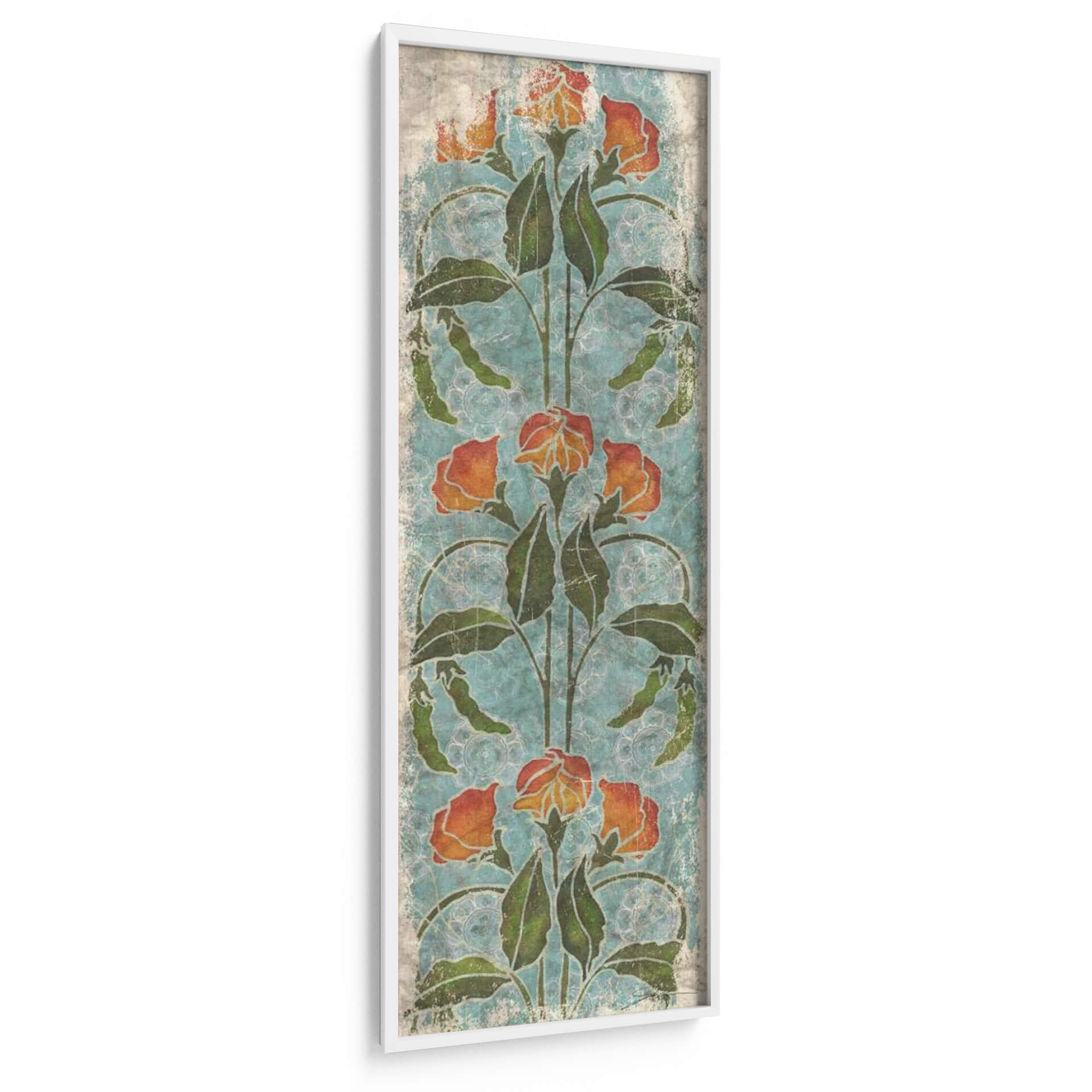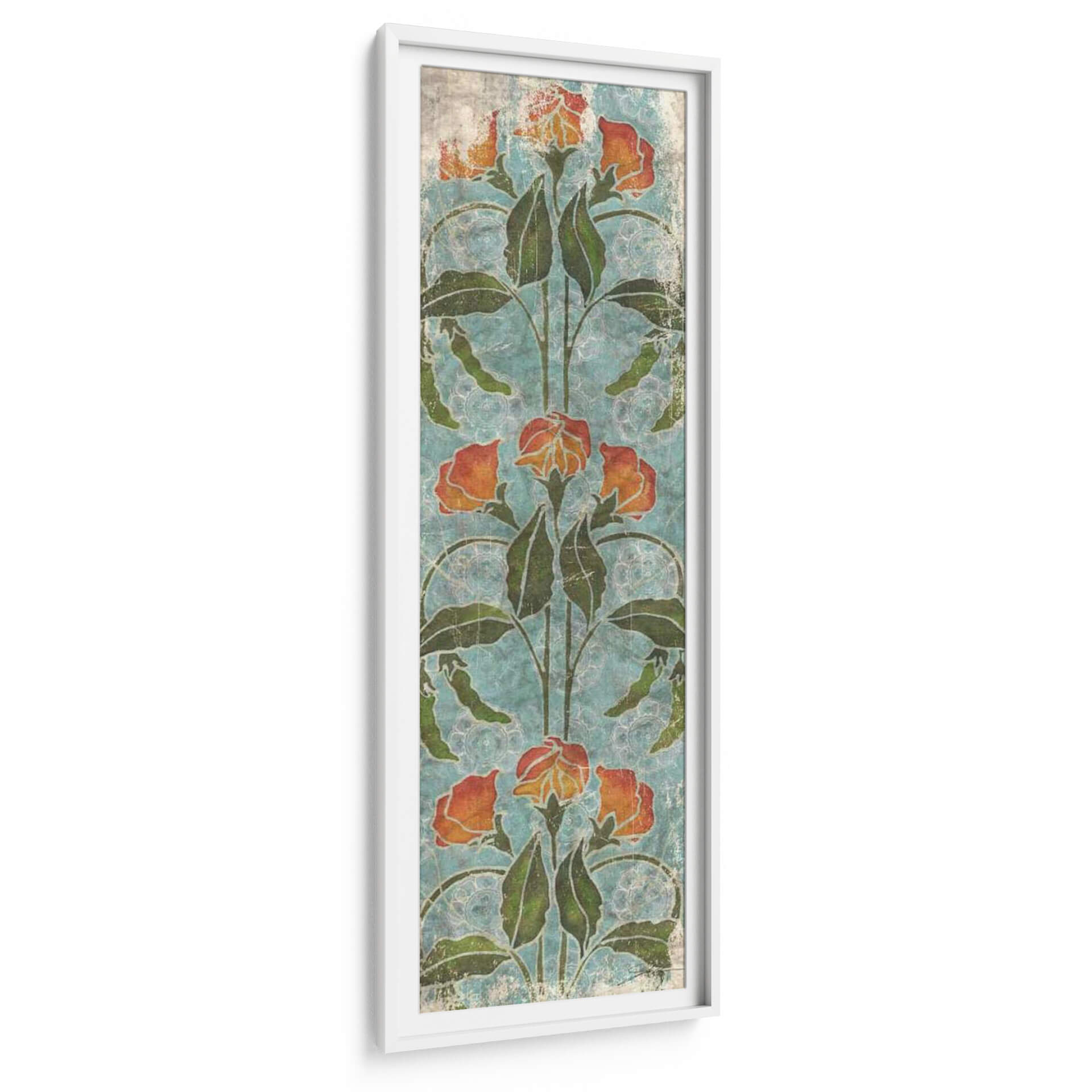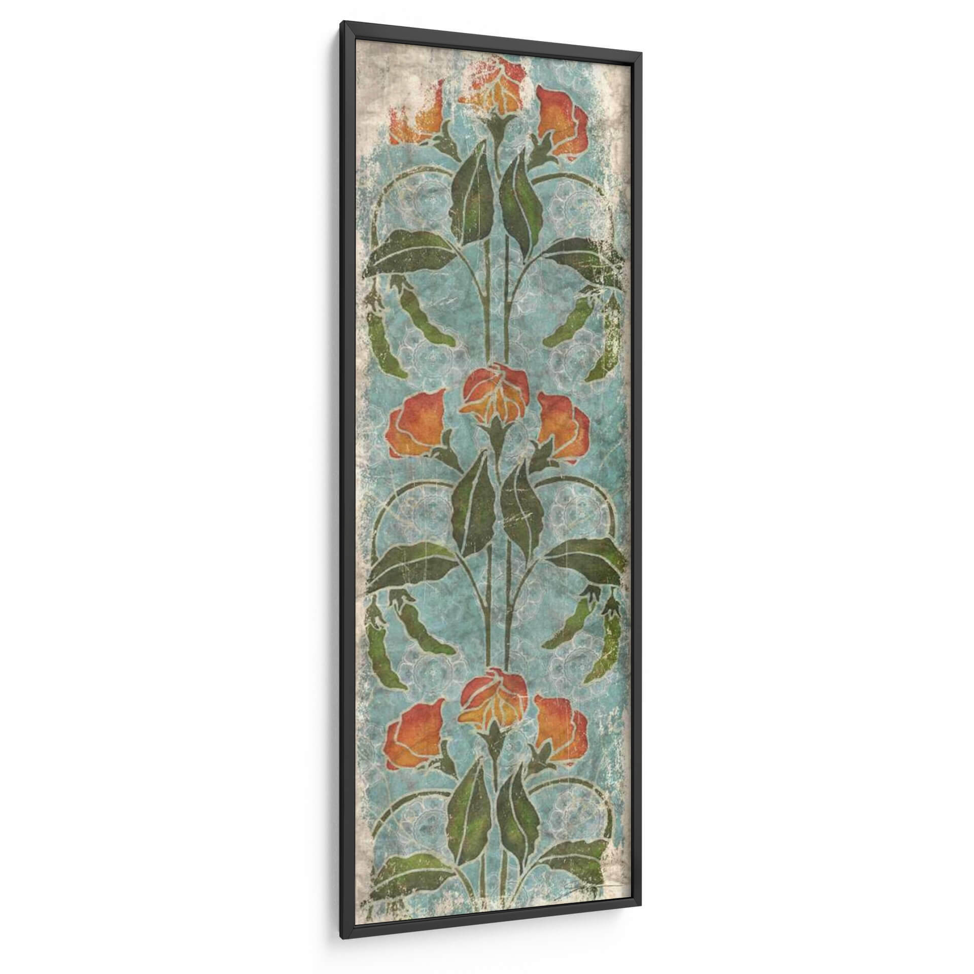 Sumérgete en la delicadeza botánica con 'Club De Nouveau III', una obra de arte de Jason Higby que captura la esencia de la naturaleza con un toque contemporáneo. Este cuadro decorativo presenta un diseño vertical que evoca la gracia de un jardín estilizado. Las flores en tonos anaranjados vibrantes, junto con las hojas verdes profundas y las sutiles vainas, se despliegan sobre un fondo azul verdoso texturizado. La composición simétrica y los patrones ornamentales que se entrelazan suavemente añaden una capa de sofisticación y profundidad visual. La técnica utilizada, que simula un acabado envejecido o desgastado, confiere a la pieza un aire de historia y autenticidad, haciéndola sentir como un hallazgo vintage. Es una pieza ideal para añadir un acento de color y serenidad a cualquier espacio, desde un recibidor moderno hasta un rincón de lectura tranquilo. 'Club De Nouveau III' es más que una simple decoración; es una invitación a la contemplación, perfecta para quienes aprecian el arte que combina la belleza natural con un diseño moderno y una atmósfera nostálgica. Añade esta joya a tu colección y transforma tu hogar u oficina en un oasis de estilo y calma.