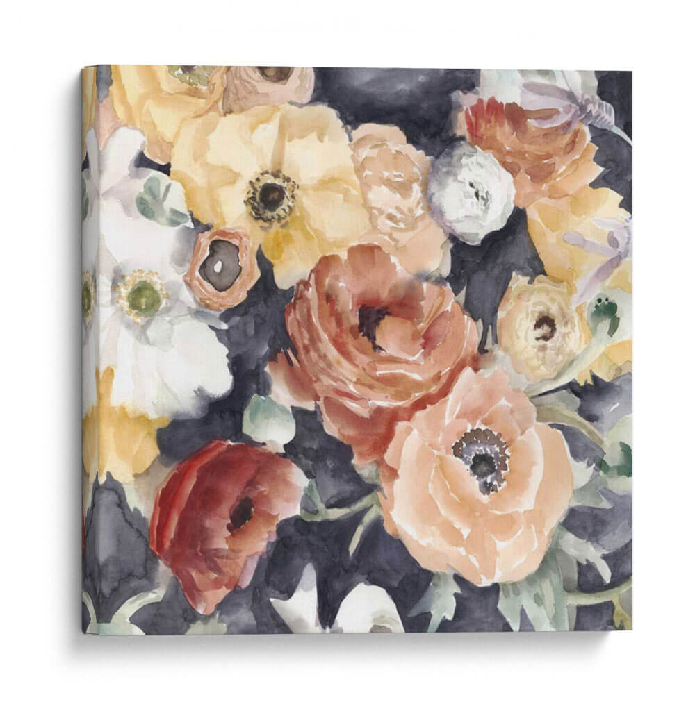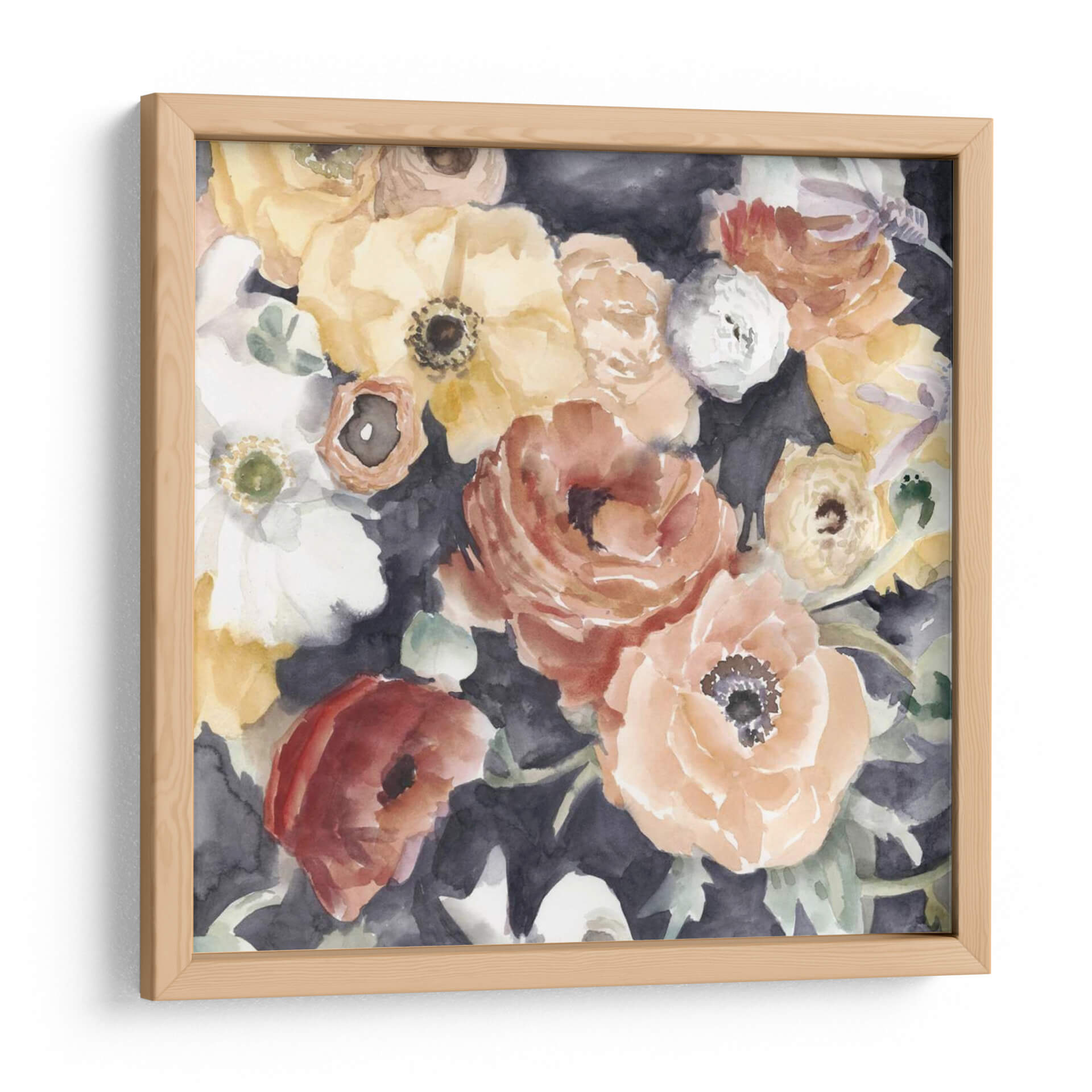 Inmortaliza la belleza efímera con 'Composición Floral I', una obra de arte que captura la delicadeza y vitalidad de un arreglo floral pintado al acuarela. Megan Meagher nos presenta un despliegue de texturas y colores que evocan la riqueza de la naturaleza en su máxima expresión. Los pétalos de ranúnculos y anémonas se despliegan en tonos cálidos de melocotón, amarillo dorado y toques de rojo intenso, contrastando magistralmente con un fondo oscuro y profundo que resalta la luminosidad de cada flor. La técnica de acuarela aporta una cualidad etérea y fluida, permitiendo que los colores se mezclen y creen transiciones sutiles, dotando a la pieza de una profundidad y un movimiento cautivador. Este cuadro decorativo es ideal para añadir un toque de sofisticación y calidez a cualquier espacio, ya sea una sala de estar, un comedor o incluso un dormitorio, invitando a la contemplación y al disfrute de la belleza floral. Su estilo contemporáneo, con reminiscencias clásicas, lo convierte en una pieza versátil que complementará una amplia gama de decoraciones interiores, desde las más modernas hasta las más tradicionales. Transforma tu hogar en una galería personal con esta exquisita representación de la flora.