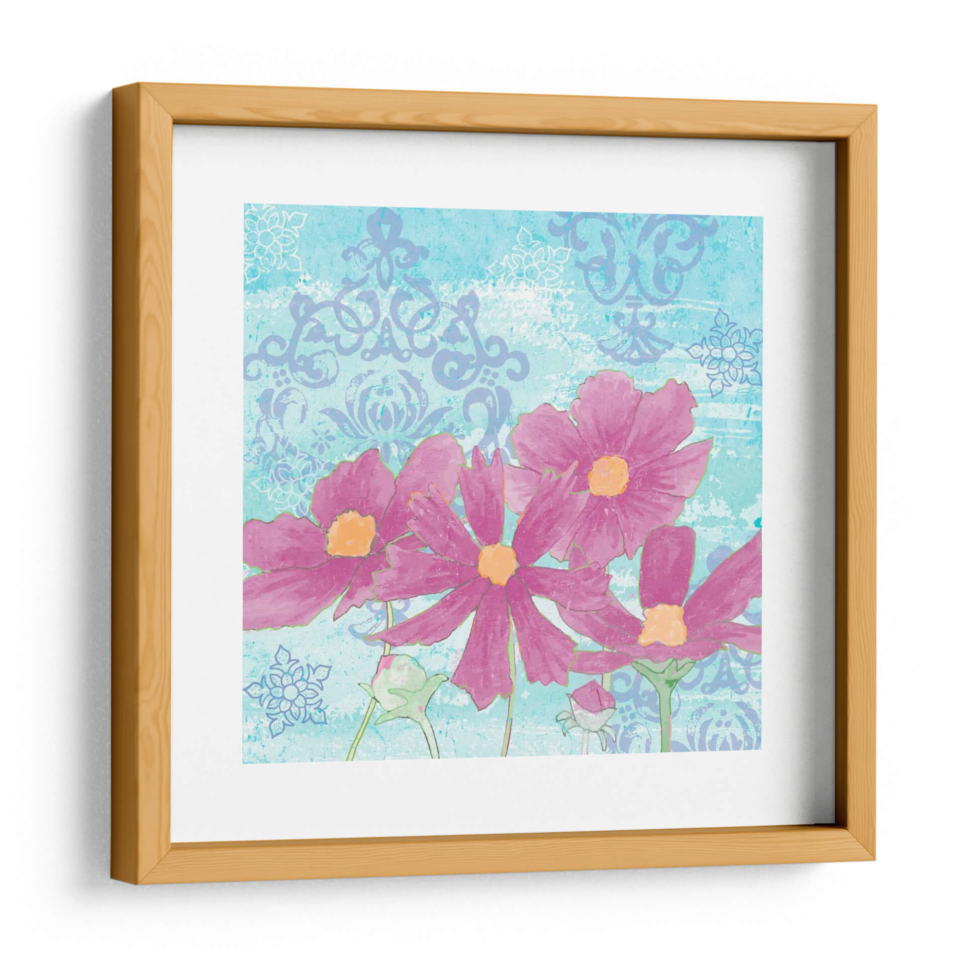 Sumérgete en la vibrante belleza floral de "Coreopsis Tangle II" de Leslie Mark, una obra de arte que captura la esencia de la naturaleza con un toque contemporáneo. Este cuadro decorativo presenta un vibrante despliegue de flores de color fucsia intenso, cuyos pétalos se abren generosamente para revelar centros de tonos cálidos anaranjados. El fondo, de un refrescante tono turquesa, se adorna con sutiles patrones damasquinos y ornamentos florales en un delicado azul lavanda, creando una textura visual rica y un contraste cautivador. La técnica utilizada, que evoca acuarelas y texturas de lienzo desgastado, otorga a la pieza una profundidad y un carácter únicos, fusionando lo orgánico con elementos decorativos clásicos. Ideal para infundir alegría y vitalidad en cualquier espacio, este cuadro es perfecto para salones modernos, dormitorios serenos o estudios creativos. Añade un toque de color y sofisticación natural a tu hogar con esta pieza inspiradora que evoca la frescura de un jardín en plena floración. La combinación de colores y formas abstractas la convierte en una adición versátil y llamativa a tu decoración.