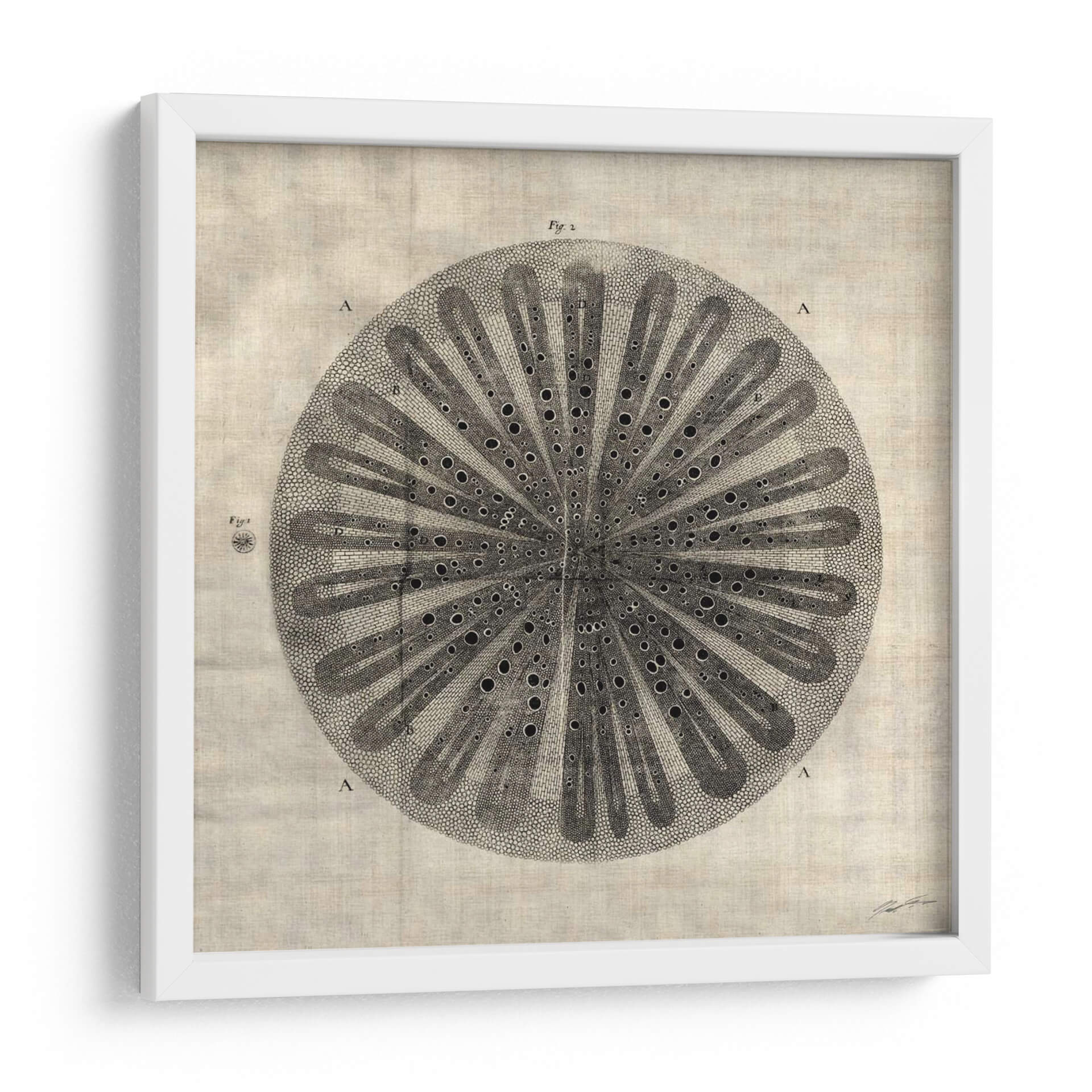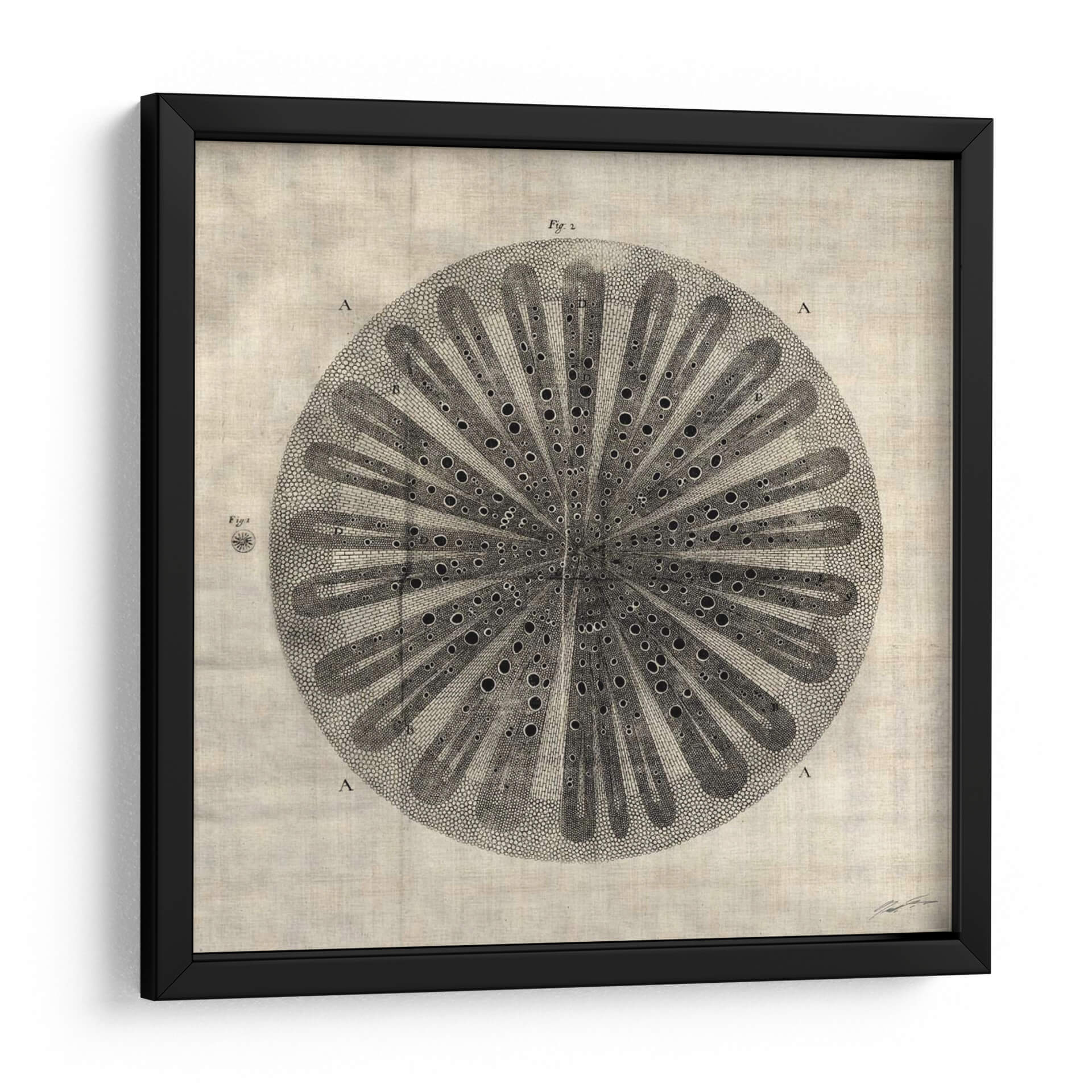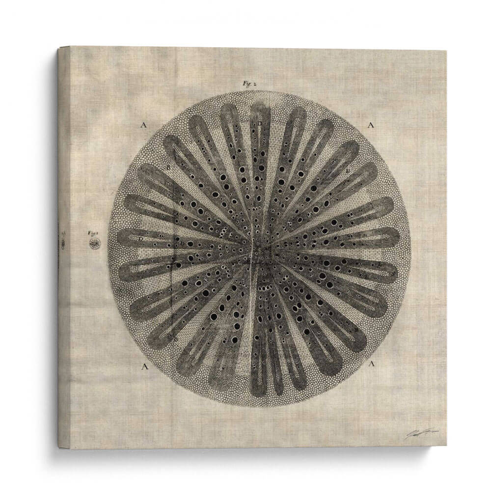 Sumérgete en la fascinante complejidad de "Corte Cruzado III" de John Butler, una obra de arte que evoca la belleza intrincada de la naturaleza a través de un diseño detallado y elegante. Esta pieza, con su estilo que recuerda a ilustraciones botánicas o científicas antiguas, presenta una estructura circular simétrica, llena de finos detalles y un juego de luces y sombras que le otorgan profundidad. Los tonos neutros y tierra de la composición general, combinados con el contraste del dibujo en blanco y negro, crean una atmósfera de calma y sofisticación, perfecta para añadir un toque de elegancia atemporal a cualquier espacio. Ideal para estudios, oficinas o salones modernos, este cuadro decorativo es una invitación a la contemplación y al aprecio por los patrones orgánicos. Su diseño detallado, que podría interpretarse como una sección transversal de un elemento natural, añade un toque intelectual y artístico, convirtiéndolo en un punto focal que genera conversación. "Corte Cruzado III" es más que una simple decoración; es una pieza que aporta serenidad y un sentido de orden al ambiente, fusionando la precisión científica con la sensibilidad artística de una manera única.