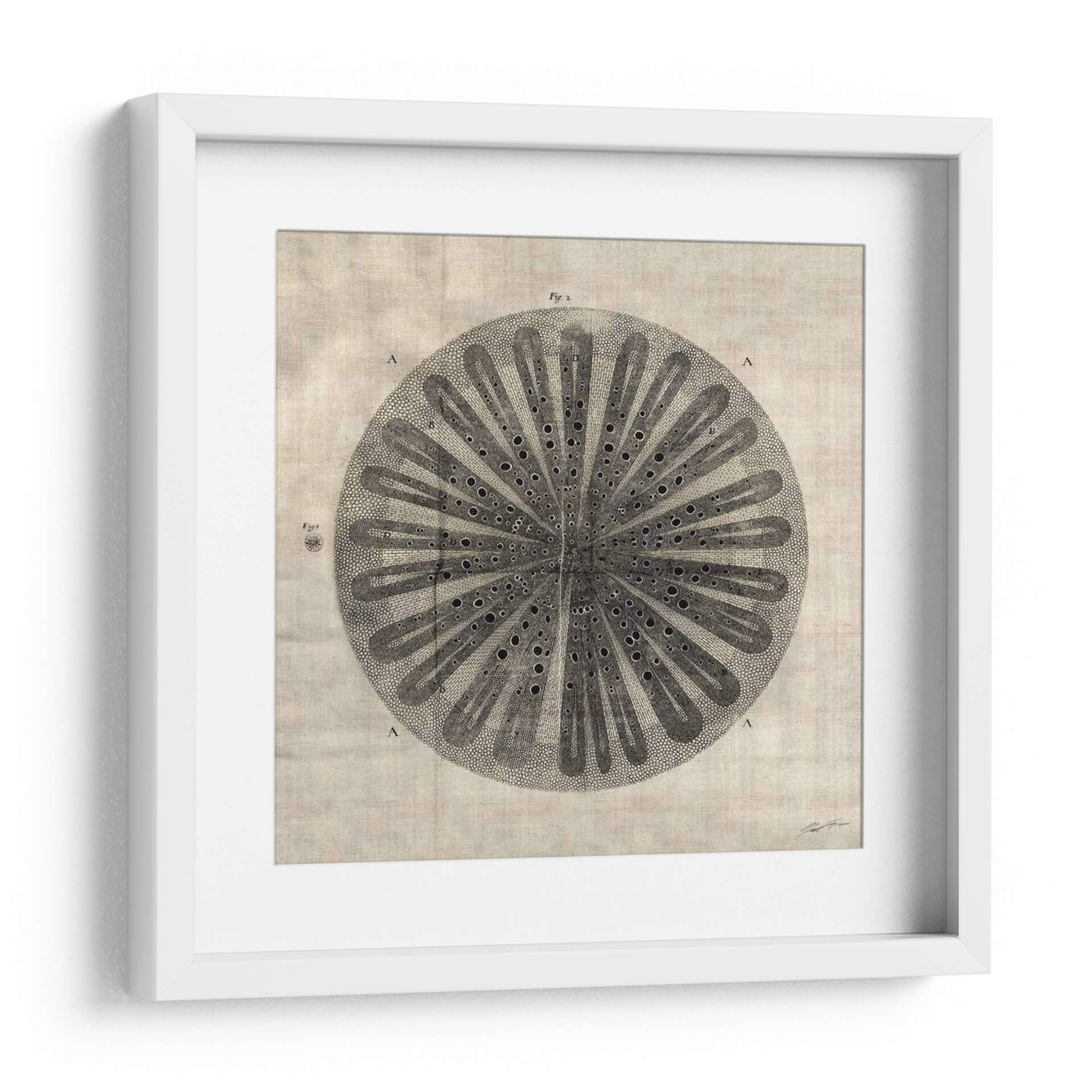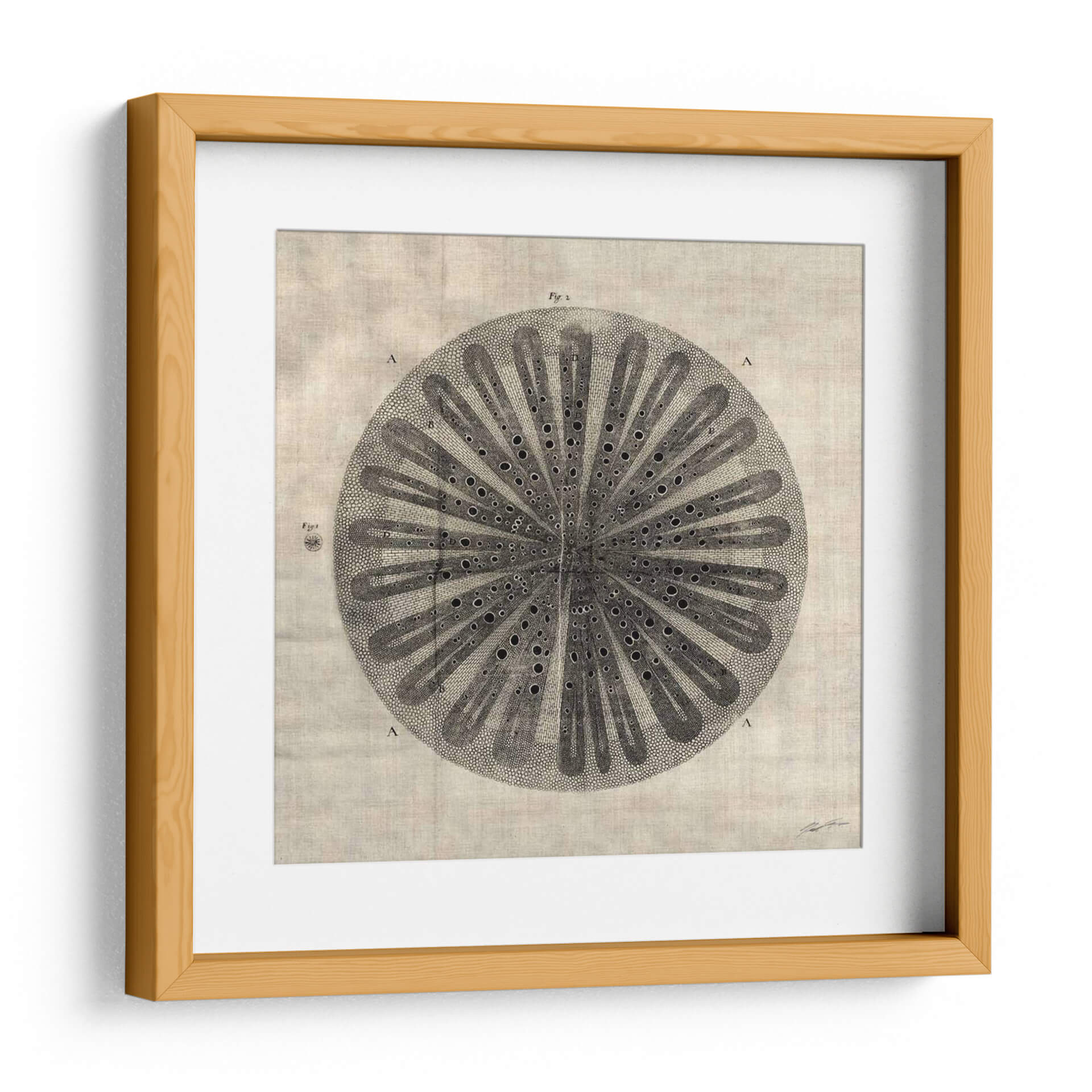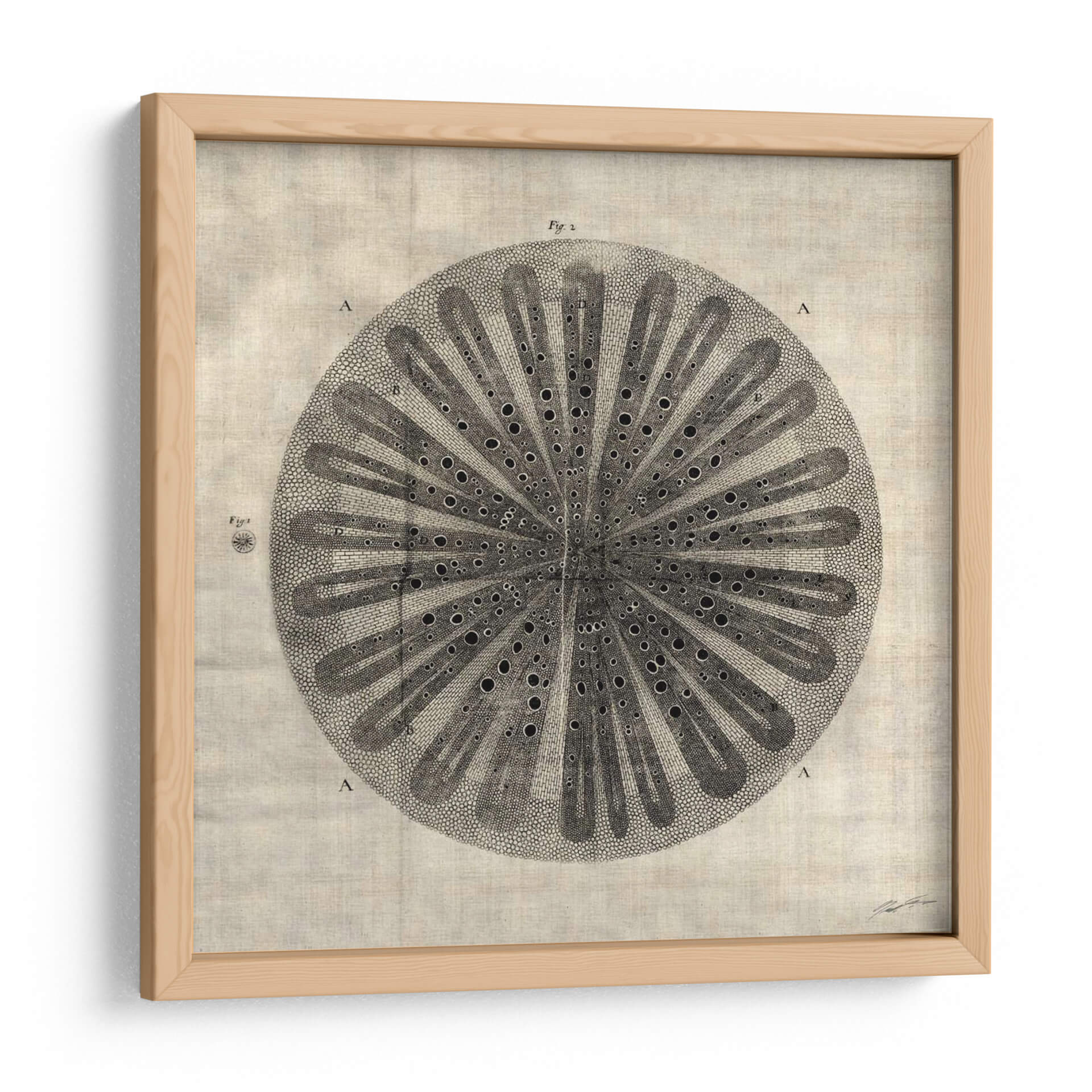 Sumérgete en la fascinante complejidad de "Corte Cruzado III" de John Butler, una obra de arte que evoca la belleza intrincada de la naturaleza a través de un diseño detallado y elegante. Esta pieza, con su estilo que recuerda a ilustraciones botánicas o científicas antiguas, presenta una estructura circular simétrica, llena de finos detalles y un juego de luces y sombras que le otorgan profundidad. Los tonos neutros y tierra de la composición general, combinados con el contraste del dibujo en blanco y negro, crean una atmósfera de calma y sofisticación, perfecta para añadir un toque de elegancia atemporal a cualquier espacio. Ideal para estudios, oficinas o salones modernos, este cuadro decorativo es una invitación a la contemplación y al aprecio por los patrones orgánicos. Su diseño detallado, que podría interpretarse como una sección transversal de un elemento natural, añade un toque intelectual y artístico, convirtiéndolo en un punto focal que genera conversación. "Corte Cruzado III" es más que una simple decoración; es una pieza que aporta serenidad y un sentido de orden al ambiente, fusionando la precisión científica con la sensibilidad artística de una manera única.
