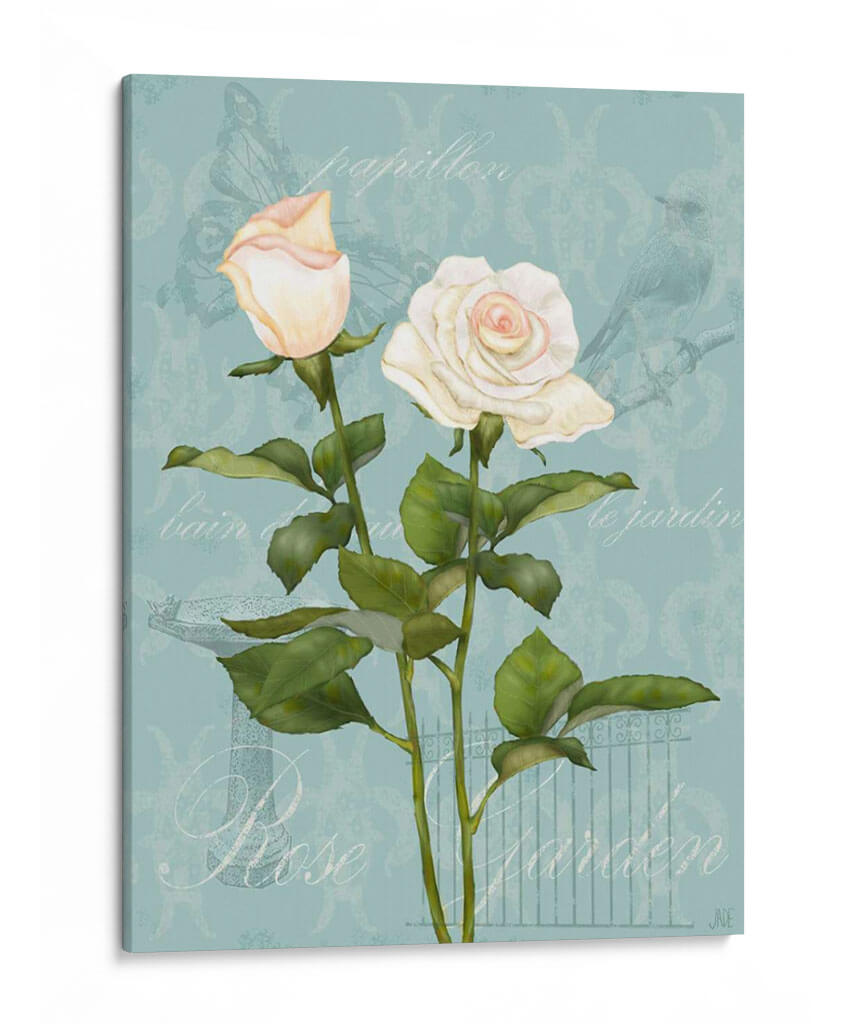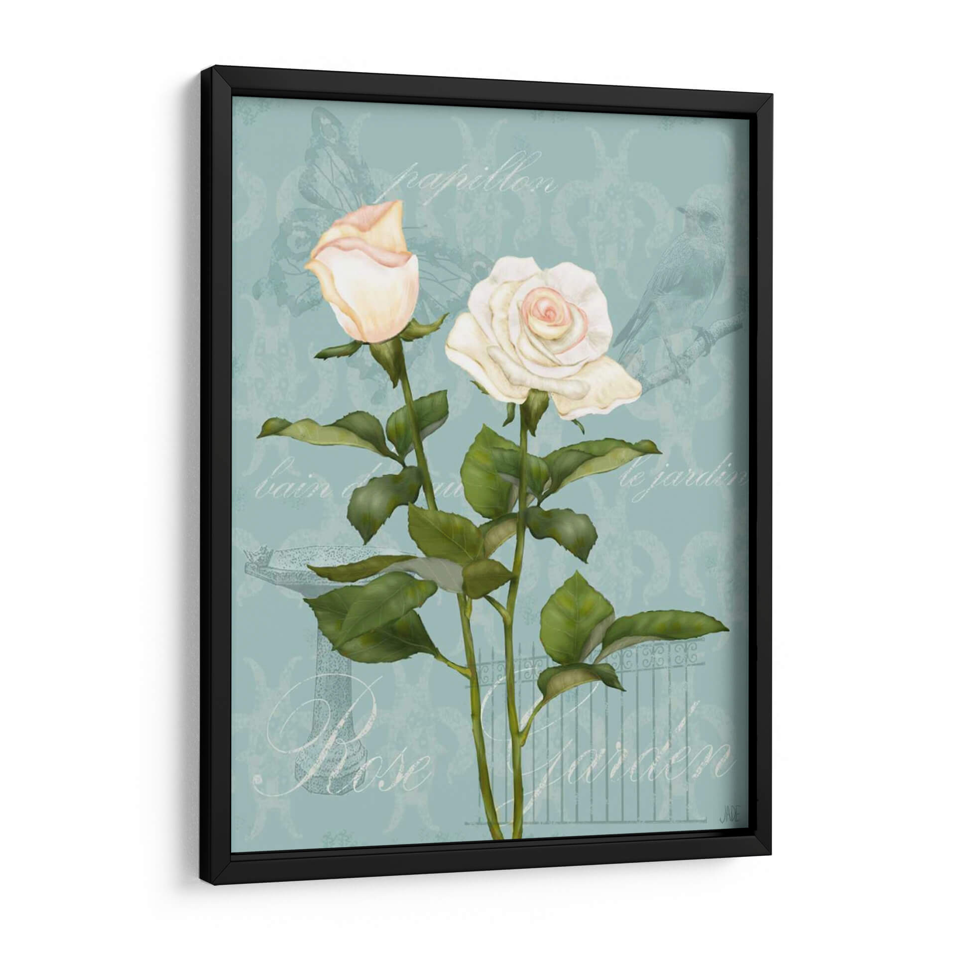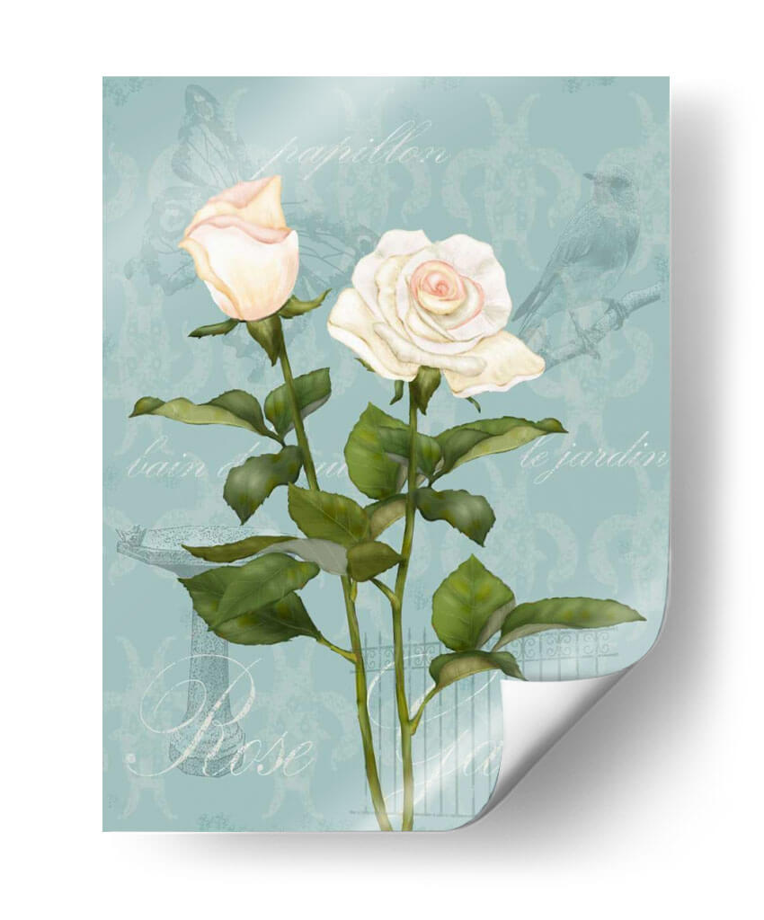 Embellece tu espacio con la delicadeza y el encanto atemporal de "Crema Rosa II", una obra de arte floral que captura la esencia de un jardín sereno. Dos rosas blancas y cremas, una de ellas aún en capullo, se alzan con elegancia sobre un fondo de ensueño en tono azul aguamarina. El diseño se enriquece con sutiles elementos gráficos que evocan la estética vintage y romántica: una mariposa etérea, un pájaro posado en una rama y una valla ornamental, todo ello superpuesto con delicadas filigranas y caligrafía en francés que insinúan "papillon", "bain", "rose" y "le jardin". La paleta de colores suave, centrada en tonos pastel y verdes botánicos, transmite una atmósfera de calma, paz y belleza natural. Esta pieza es ideal para añadir un toque de sofisticación y tranquilidad a tu dormitorio, sala de estar o cualquier rincón que necesite una dosis de frescura y elegancia floral. "Crema Rosa II" es más que una simple decoración; es una invitación a la contemplación y a la apreciación de la belleza efímera de la naturaleza, perfecta para quienes buscan infundir serenidad y estilo refinado en su hogar u oficina.