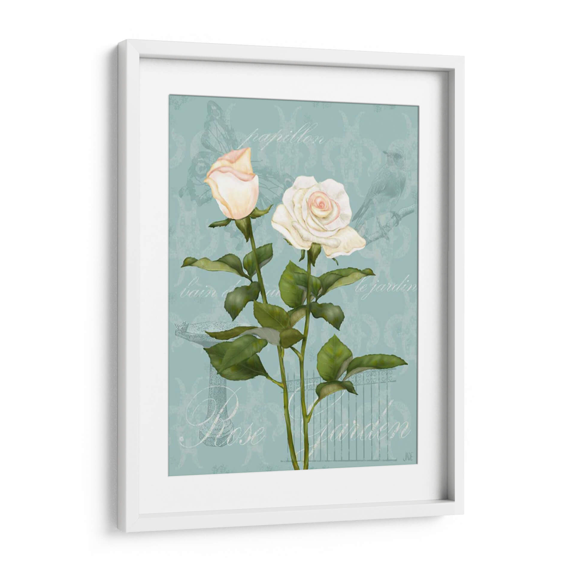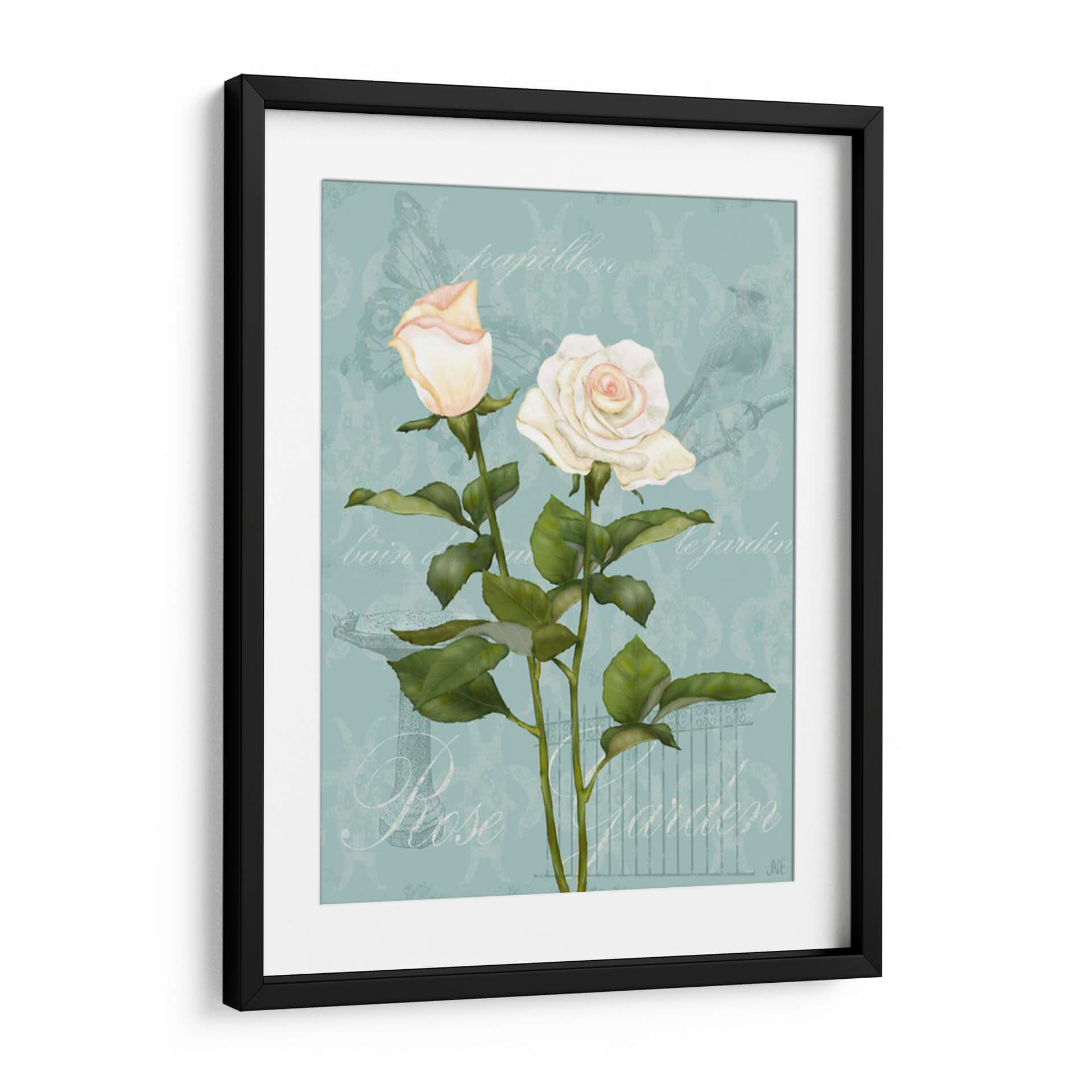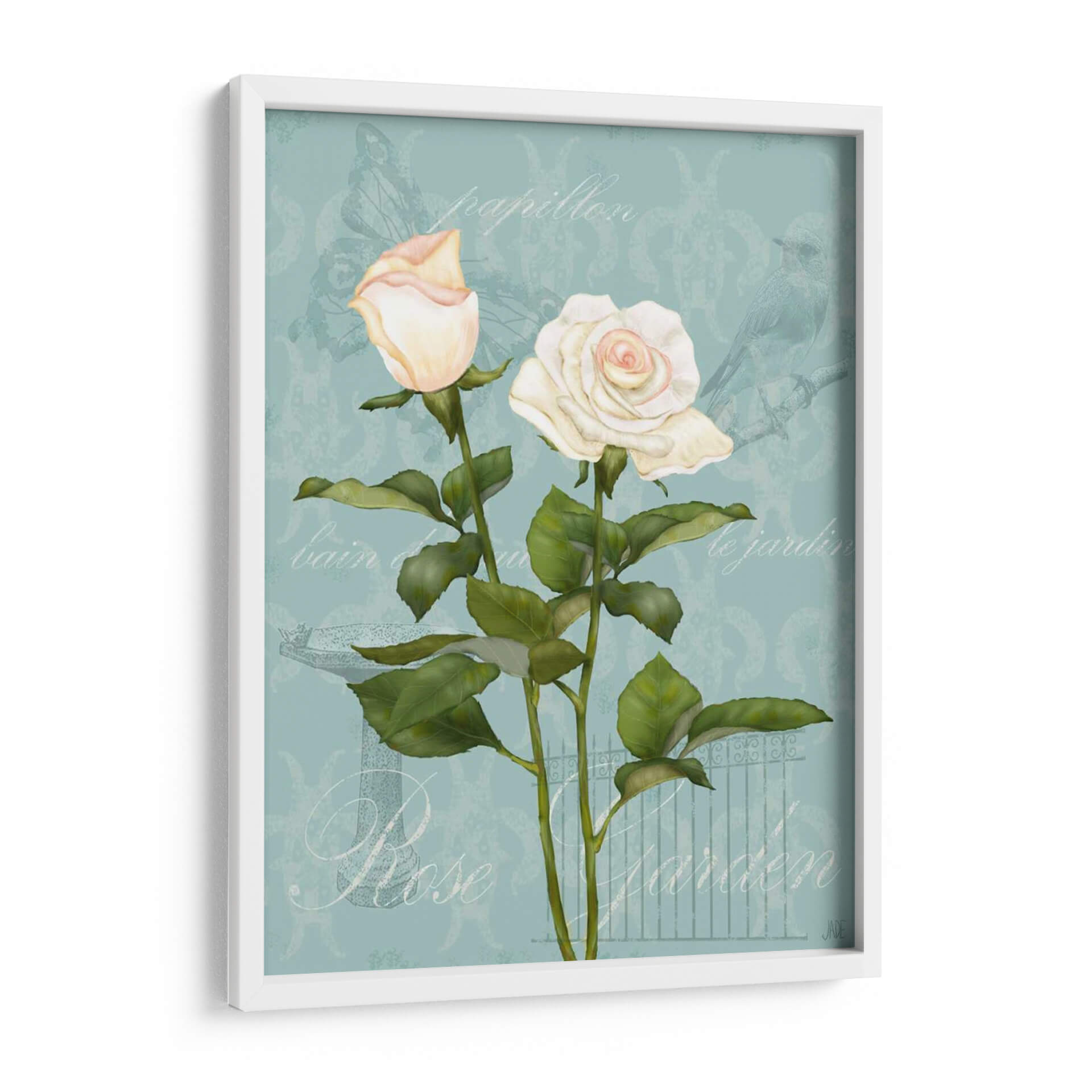 Embellece tu espacio con la delicadeza y el encanto atemporal de "Crema Rosa II", una obra de arte floral que captura la esencia de un jardín sereno. Dos rosas blancas y cremas, una de ellas aún en capullo, se alzan con elegancia sobre un fondo de ensueño en tono azul aguamarina. El diseño se enriquece con sutiles elementos gráficos que evocan la estética vintage y romántica: una mariposa etérea, un pájaro posado en una rama y una valla ornamental, todo ello superpuesto con delicadas filigranas y caligrafía en francés que insinúan "papillon", "bain", "rose" y "le jardin". La paleta de colores suave, centrada en tonos pastel y verdes botánicos, transmite una atmósfera de calma, paz y belleza natural. Esta pieza es ideal para añadir un toque de sofisticación y tranquilidad a tu dormitorio, sala de estar o cualquier rincón que necesite una dosis de frescura y elegancia floral. "Crema Rosa II" es más que una simple decoración; es una invitación a la contemplación y a la apreciación de la belleza efímera de la naturaleza, perfecta para quienes buscan infundir serenidad y estilo refinado en su hogar u oficina.