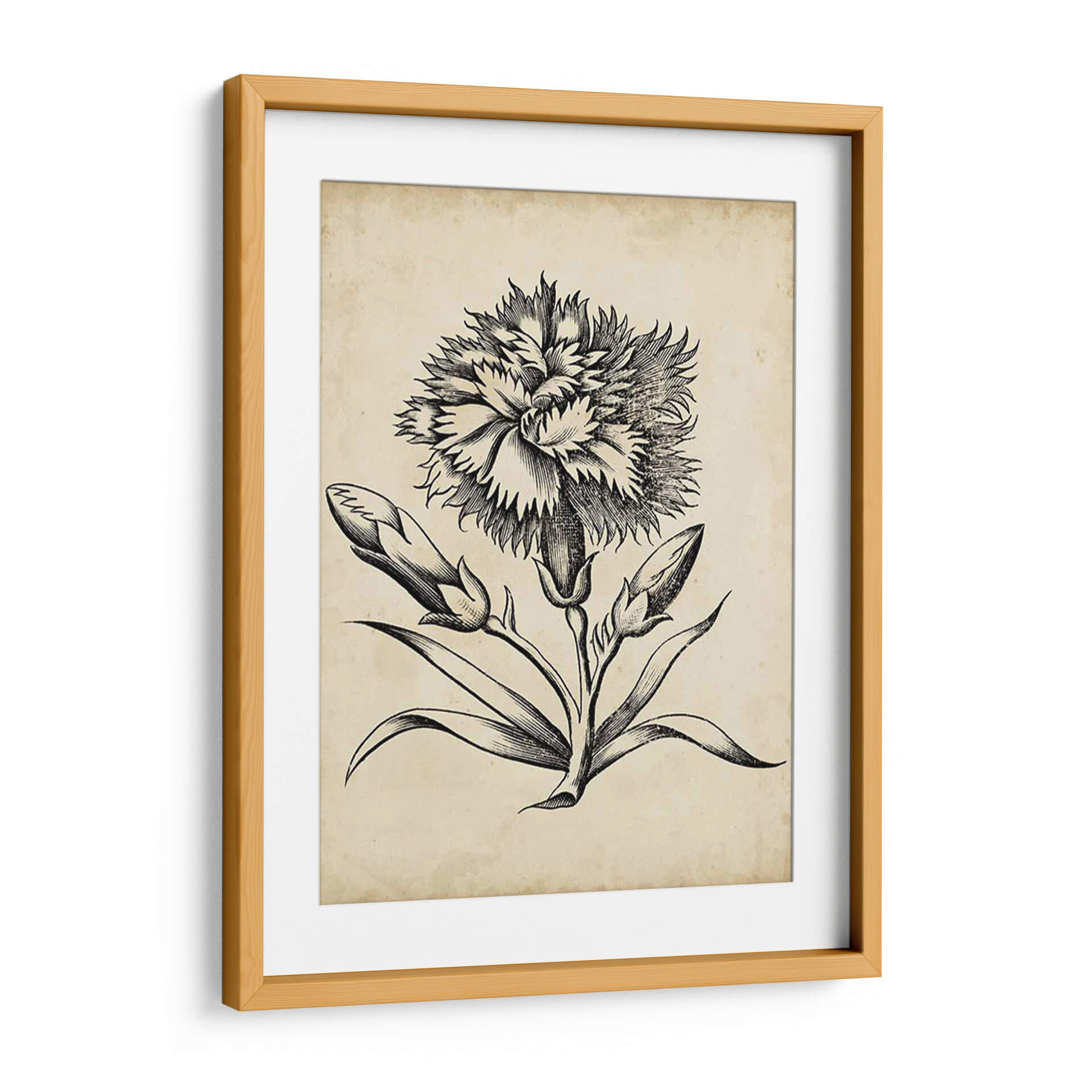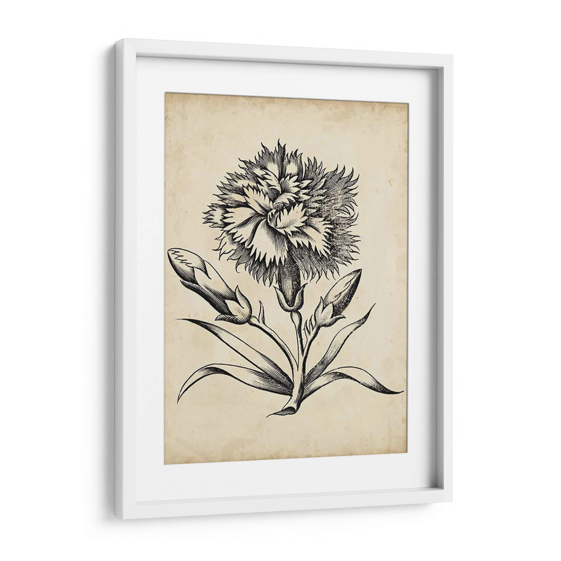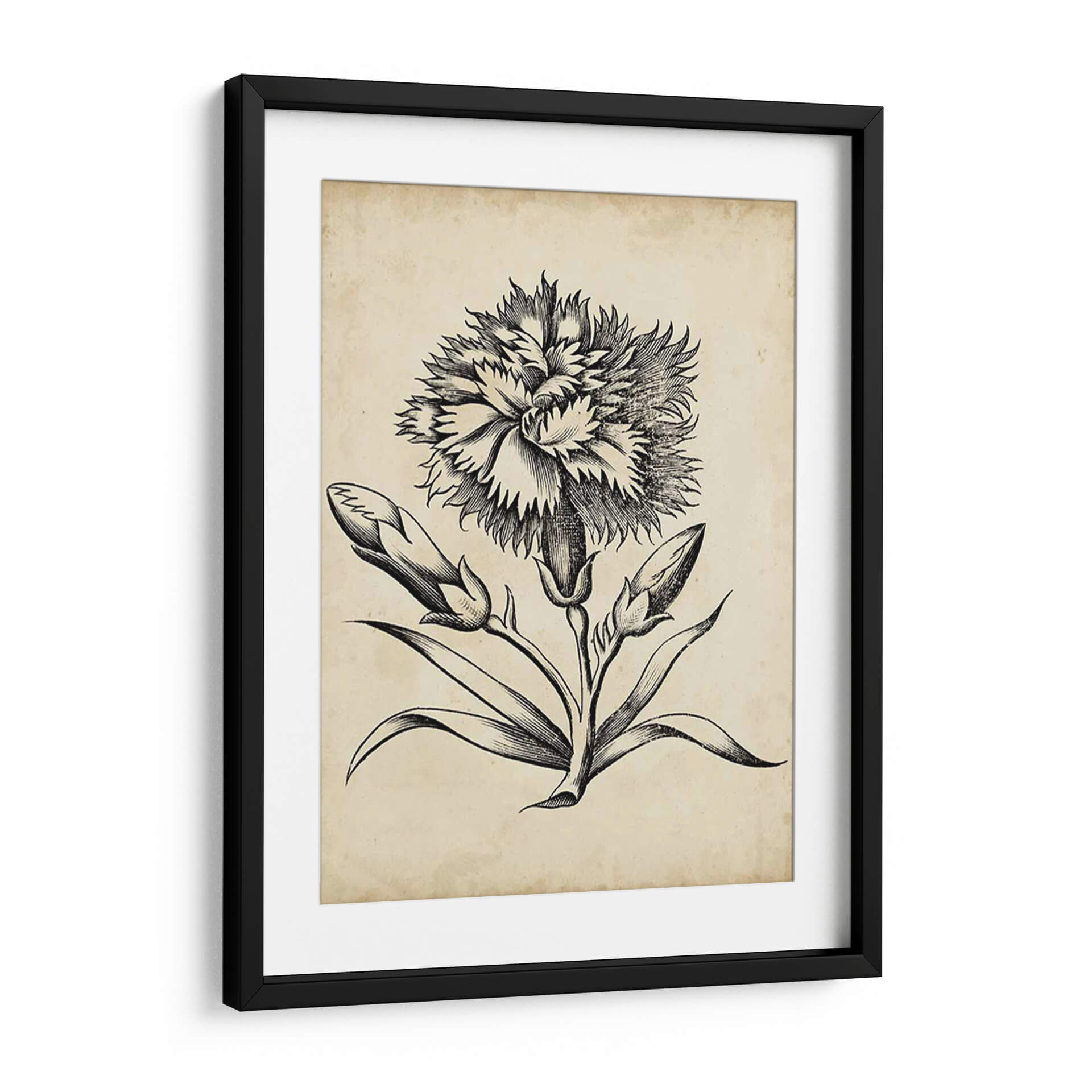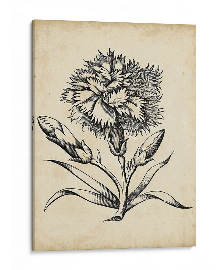Sumérgete en la delicadeza atemporal con este exquisito cuadro decorativo de un floral distinguido, obra del Vision Studio. Esta pieza evoca la elegancia clásica a través de un detallado grabado en blanco y negro sobre un fondo que simula pergamino antiguo, añadiendo un toque de historia y sofisticación a tu hogar u oficina. La composición se centra en una flor principal con pétalos exuberantes y texturizados, rodeada de capullos y hojas elegantemente dibujados, capturando la belleza efímera de la naturaleza en su máxima expresión. Los tonos sepia y el contraste nítido del grabado crean una atmósfera de calma y refinamiento, ideal para espacios que buscan un acento de elegancia discreta. Este cuadro decorativo es perfecto para complementar decoraciones de estilo vintage, rústico o clásico, aportando un punto focal de arte botánico que inspira serenidad y contemplación. Transforma cualquier ambiente con esta obra que combina la precisión artística con la emotividad de la botánica, creando un diálogo visual entre lo antiguo y lo contemporáneo. Una adición perfecta para amantes de la naturaleza y el arte con un gusto por lo clásico.