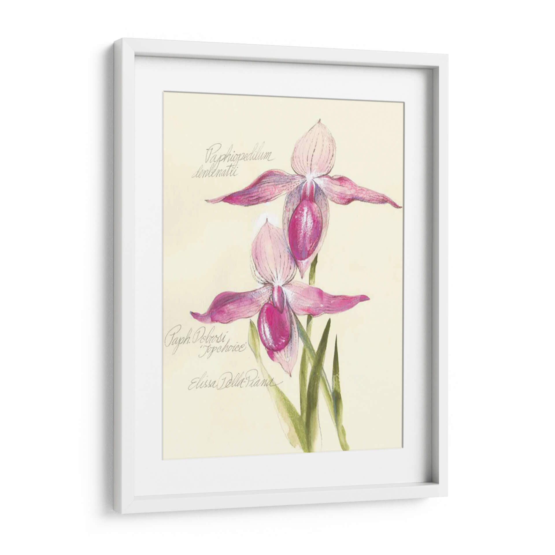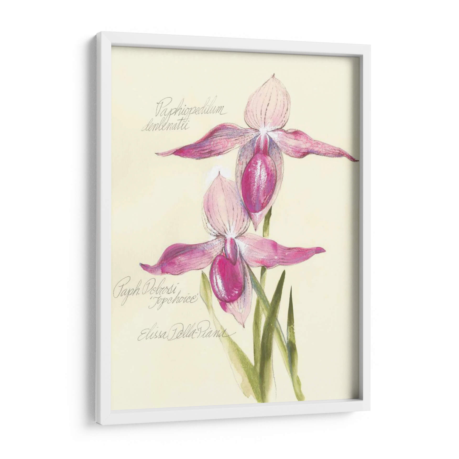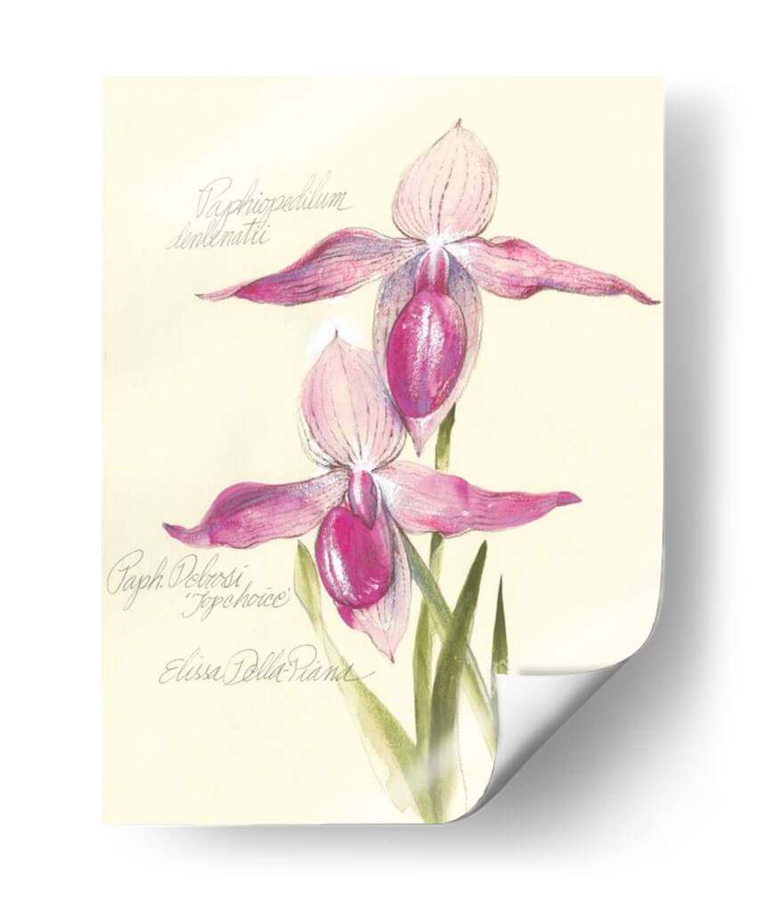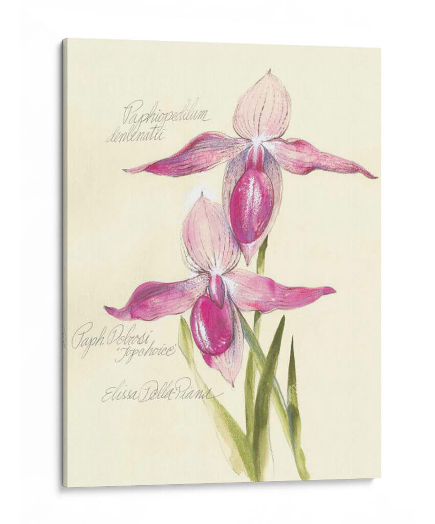 Embellece tu espacio con la delicadeza botánica de "Elissas Garden Vi", una obra de arte cautivadora de Elissa Della-Piana. Este cuadro decorativo presenta una detallada representación de dos orquídeas de zapatilla de Venus, capturadas con una exquisita sensibilidad artística. La paleta de colores, dominada por suaves tonos rosados y fucsias vibrantes en los pétalos de las flores, se complementa a la perfección con el fondo cremoso y las sutiles tonalidades verdes de las hojas. La técnica, que evoca el encanto de las ilustraciones botánicas clásicas con un toque contemporáneo, resalta la textura y la forma única de estas fascinantes flores. La composición es equilibrada y armoniosa, invitando a la contemplación y la admiración de la naturaleza. "Elissas Garden Vi" es una pieza que irradia elegancia, serenidad y un toque de sofisticación natural. Ideal para añadir un acento floral refinado a cualquier habitación, desde un acogedor dormitorio hasta una elegante sala de estar o un estudio inspirador. Este cuadro no es solo una decoración, sino una ventana a la belleza intrínseca de la botánica, perfecta para amantes del arte y la naturaleza que buscan piezas únicas y llenas de encanto para sus hogares u oficinas. Añade un toque de ensueño y frescura a tu entorno con esta maravillosa obra.