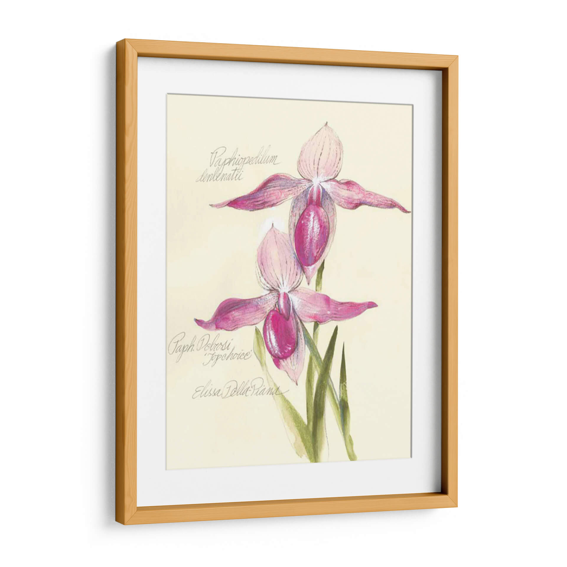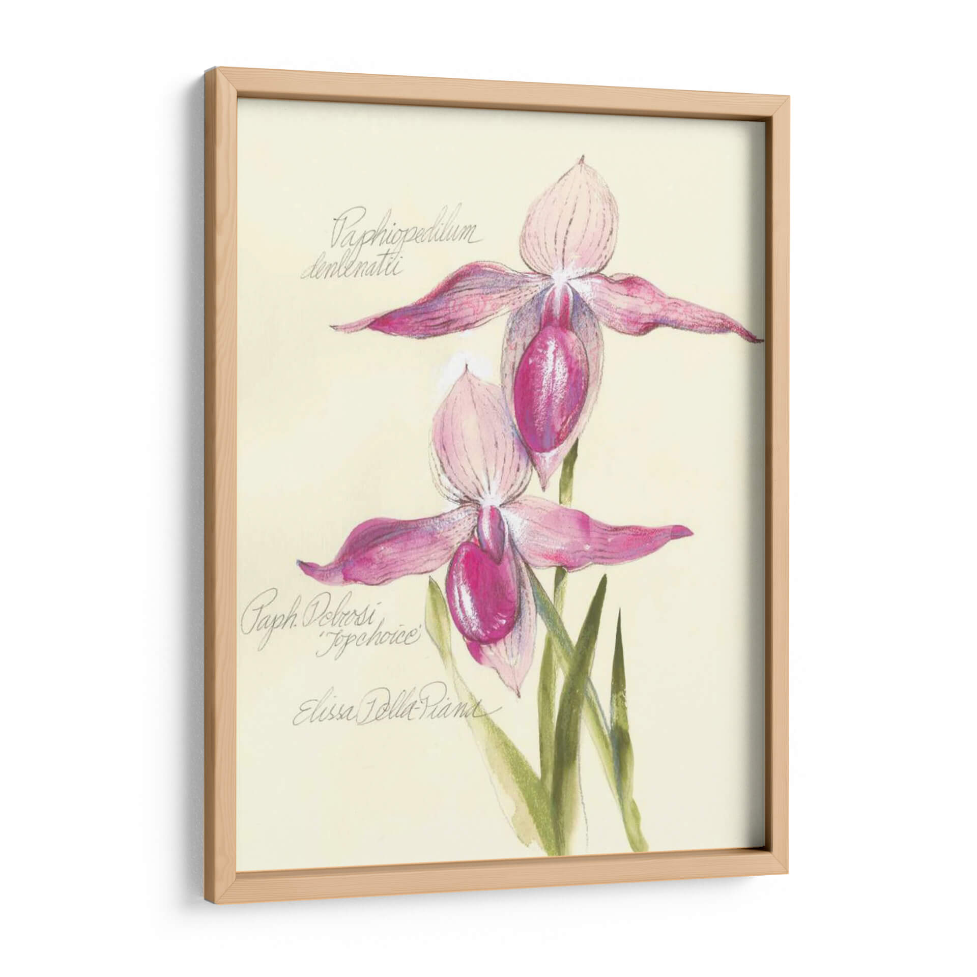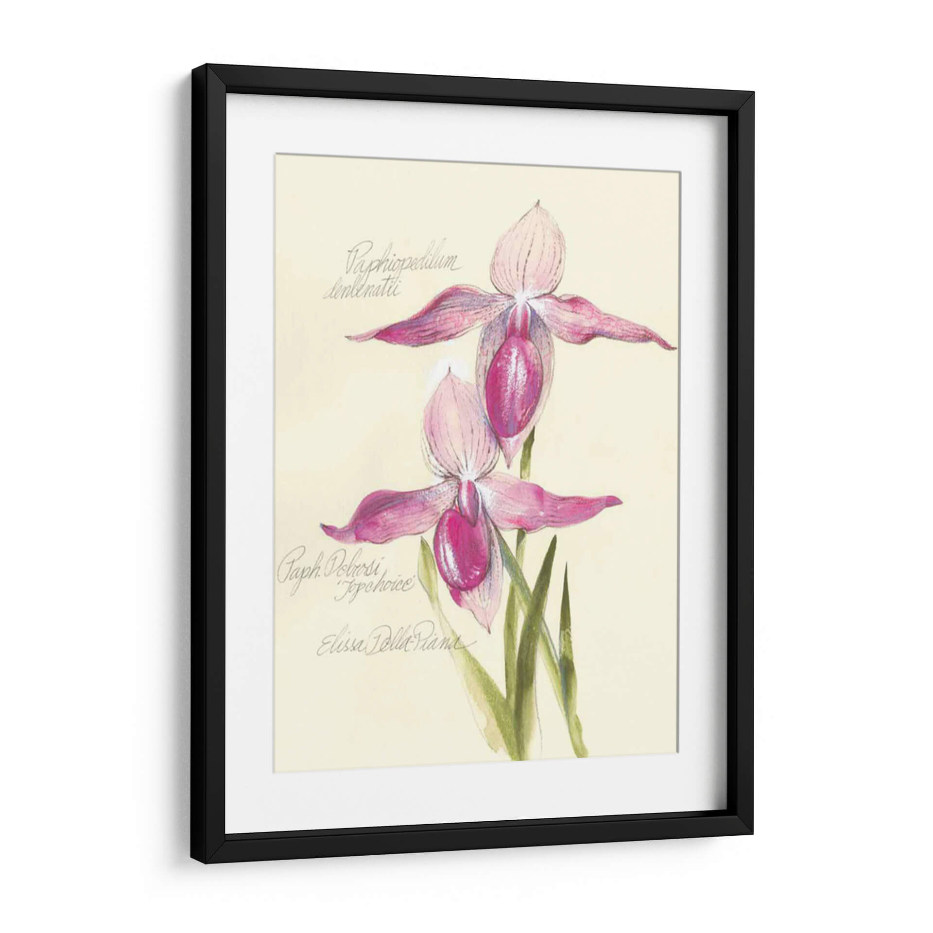 Embellece tu espacio con la delicadeza botánica de "Elissas Garden Vi", una obra de arte cautivadora de Elissa Della-Piana. Este cuadro decorativo presenta una detallada representación de dos orquídeas de zapatilla de Venus, capturadas con una exquisita sensibilidad artística. La paleta de colores, dominada por suaves tonos rosados y fucsias vibrantes en los pétalos de las flores, se complementa a la perfección con el fondo cremoso y las sutiles tonalidades verdes de las hojas. La técnica, que evoca el encanto de las ilustraciones botánicas clásicas con un toque contemporáneo, resalta la textura y la forma única de estas fascinantes flores. La composición es equilibrada y armoniosa, invitando a la contemplación y la admiración de la naturaleza. "Elissas Garden Vi" es una pieza que irradia elegancia, serenidad y un toque de sofisticación natural. Ideal para añadir un acento floral refinado a cualquier habitación, desde un acogedor dormitorio hasta una elegante sala de estar o un estudio inspirador. Este cuadro no es solo una decoración, sino una ventana a la belleza intrínseca de la botánica, perfecta para amantes del arte y la naturaleza que buscan piezas únicas y llenas de encanto para sus hogares u oficinas. Añade un toque de ensueño y frescura a tu entorno con esta maravillosa obra.