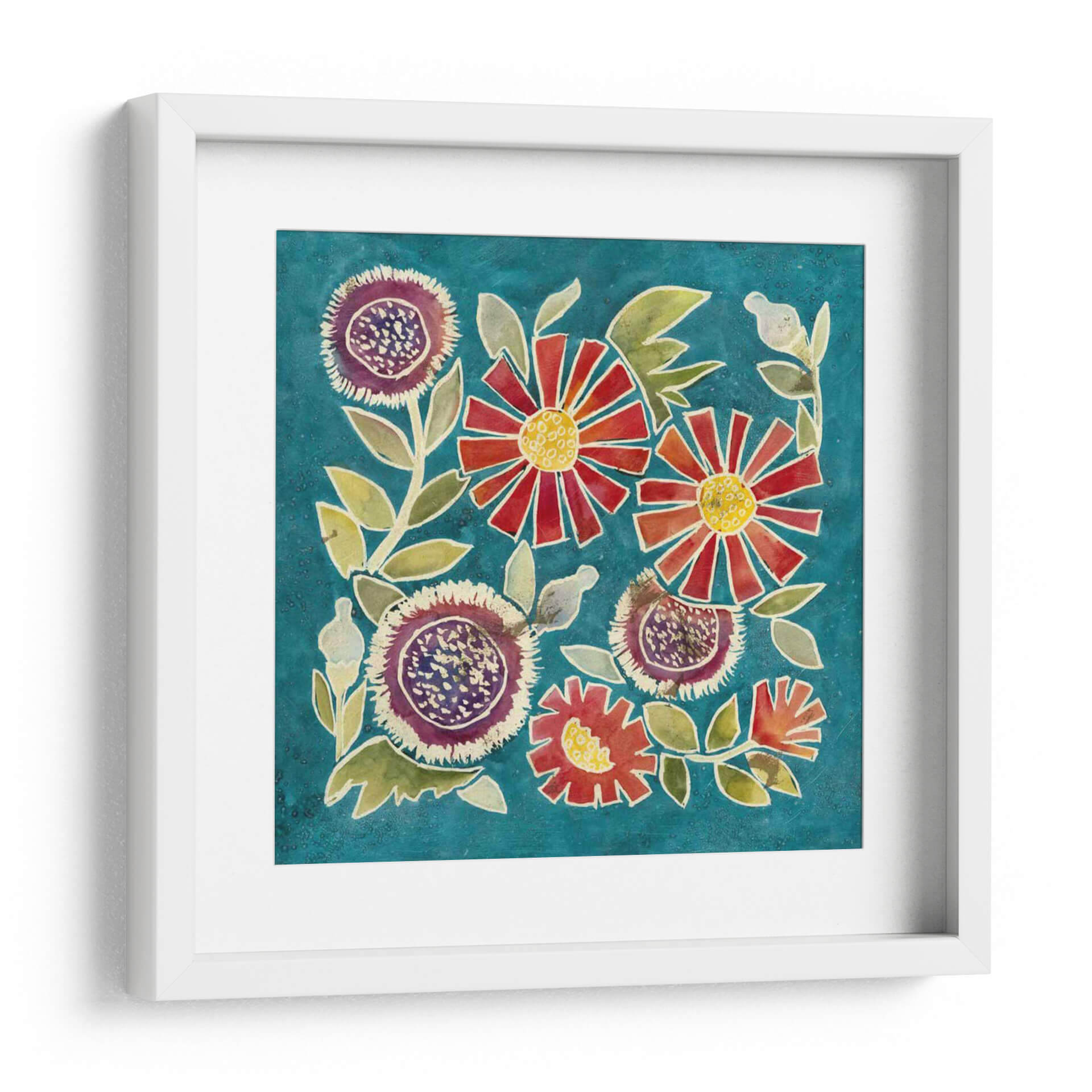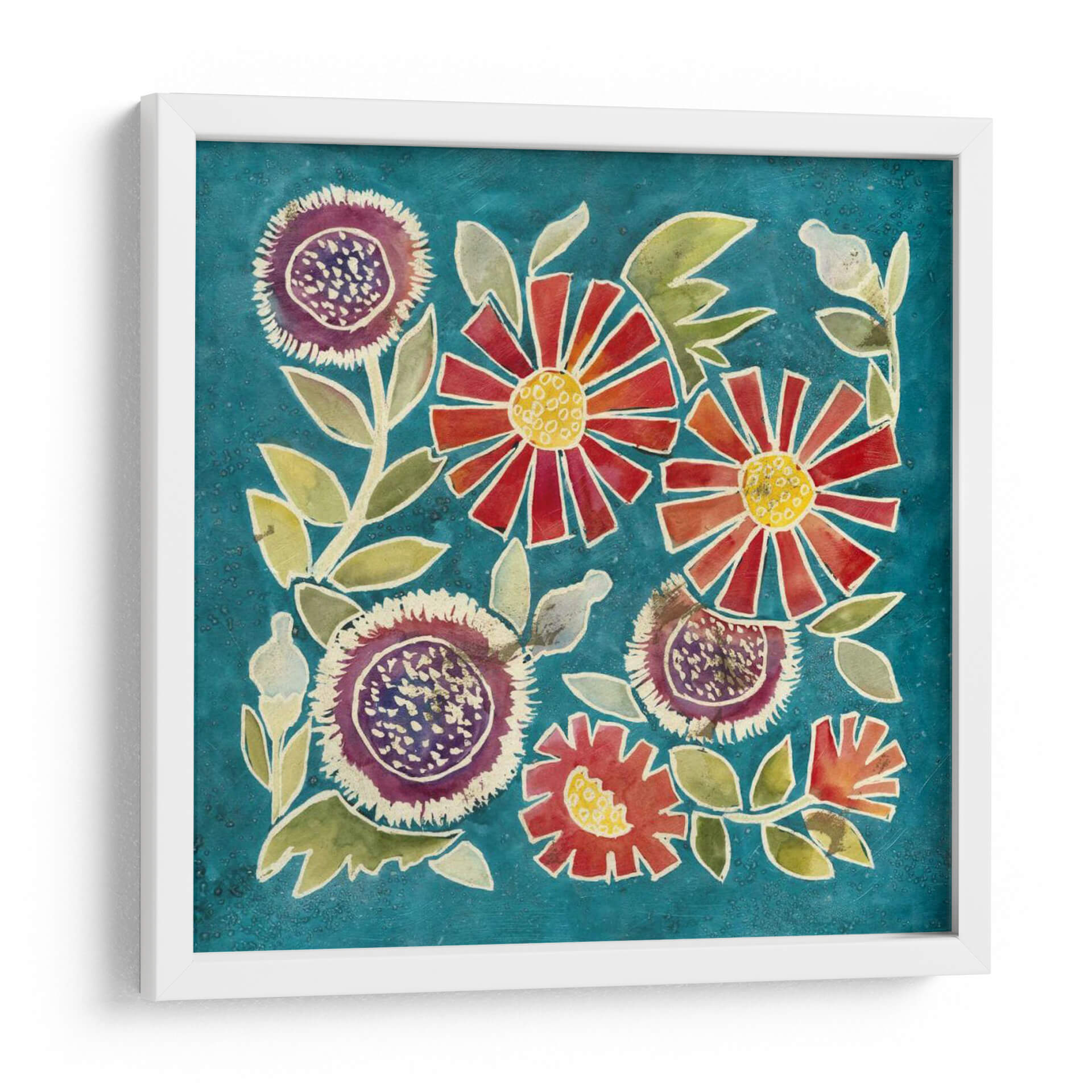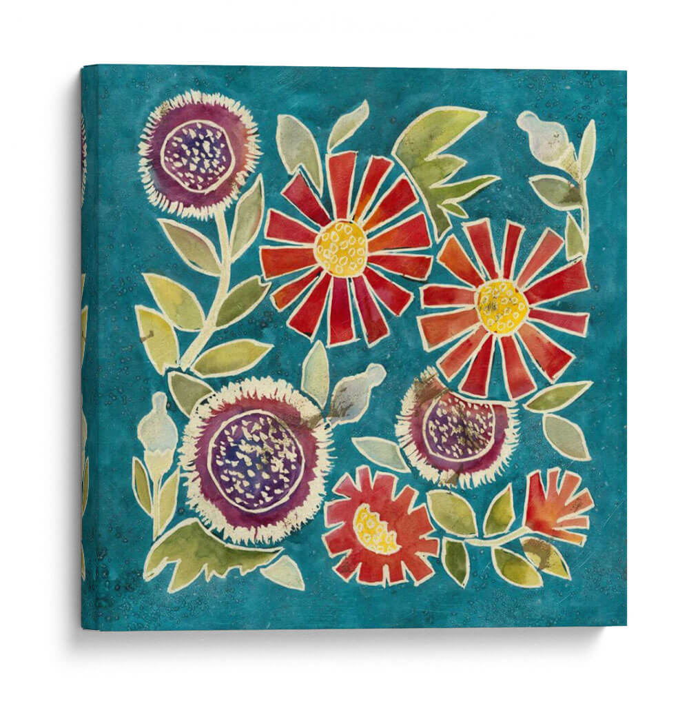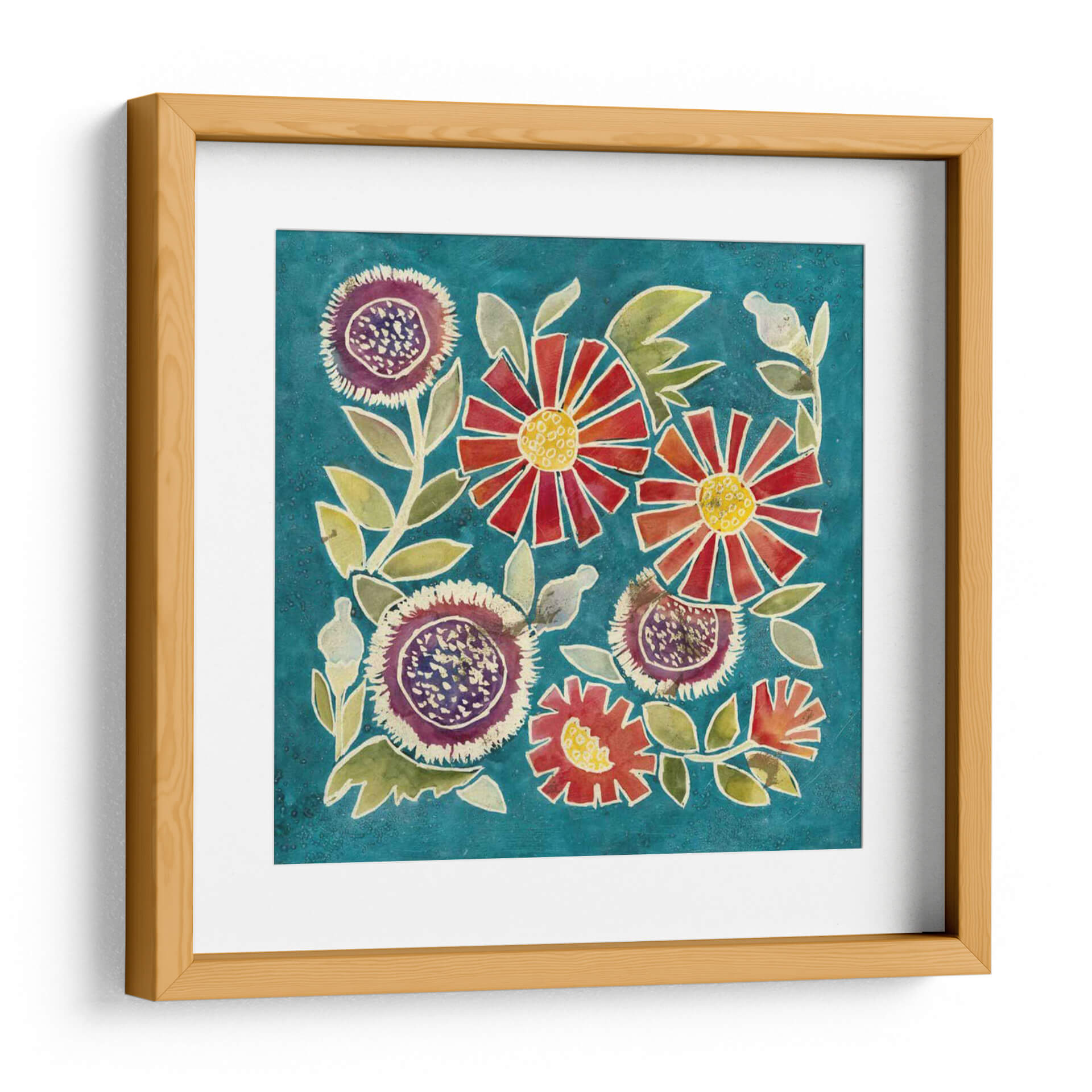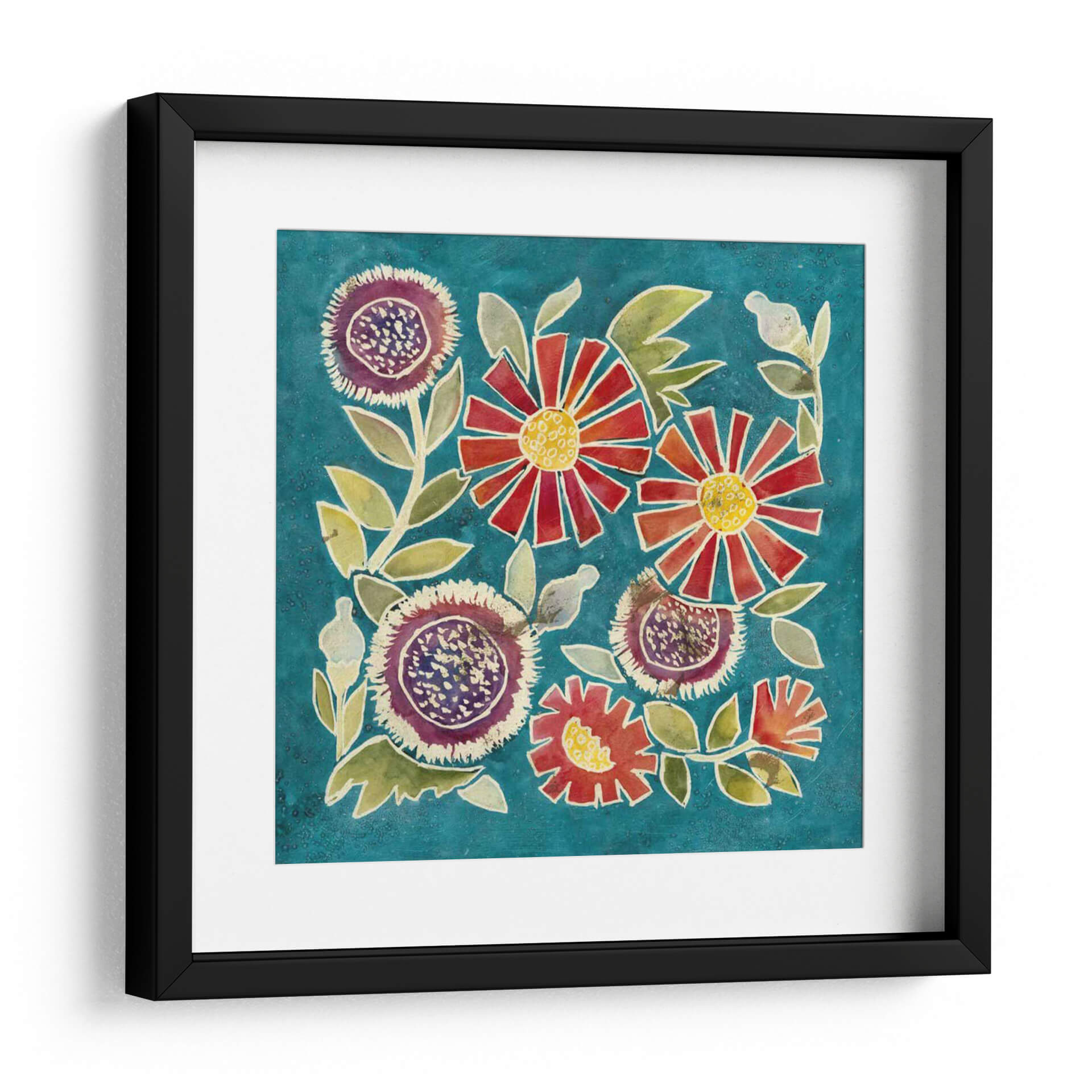Embellece tu espacio con "Emma Floral Ii", una cautivadora obra de arte floral digital que irradia vitalidad y encanto. Esta pieza, creada por Megan Meagher, presenta una vibrante disposición de flores estilizadas sobre un fondo profundo y texturizado de color turquesa o azul verdoso. Los pétalos rojos y naranjas de las flores principales contrastan audazmente con los centros amarillos y los detalles en púrpura de otras variedades, creando una composición visualmente impactante. Las hojas verdes y las ramas se entrelazan delicadamente, aportando un toque de naturaleza y frescura. El estilo se inclina hacia lo decorativo y moderno, con líneas fluidas y una ejecución que sugiere la técnica de la acuarela o el batik, aunque es una creación digital. La atmósfera general es alegre y optimista, con una energía sutil que puede transformar cualquier habitación. Este cuadro decorativo es ideal para añadir un toque de color y sofisticación a salas de estar, comedores, dormitorios o estudios. Su diseño floral contemporáneo lo convierte en una elección perfecta para quienes buscan una decoración de pared que sea a la vez artística y accesible, capaz de despertar alegría y admiración en cualquier observador. Dale vida a tus paredes con este imprescindible cuadro floral.
