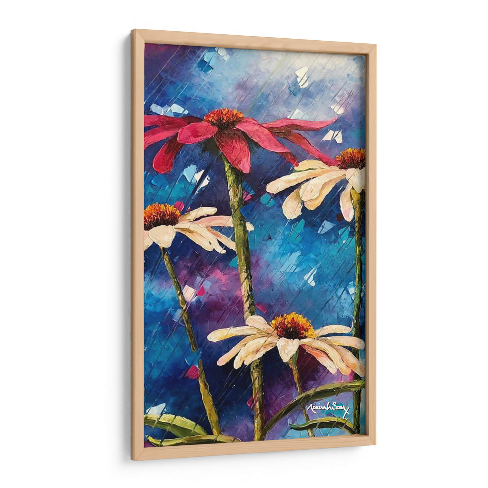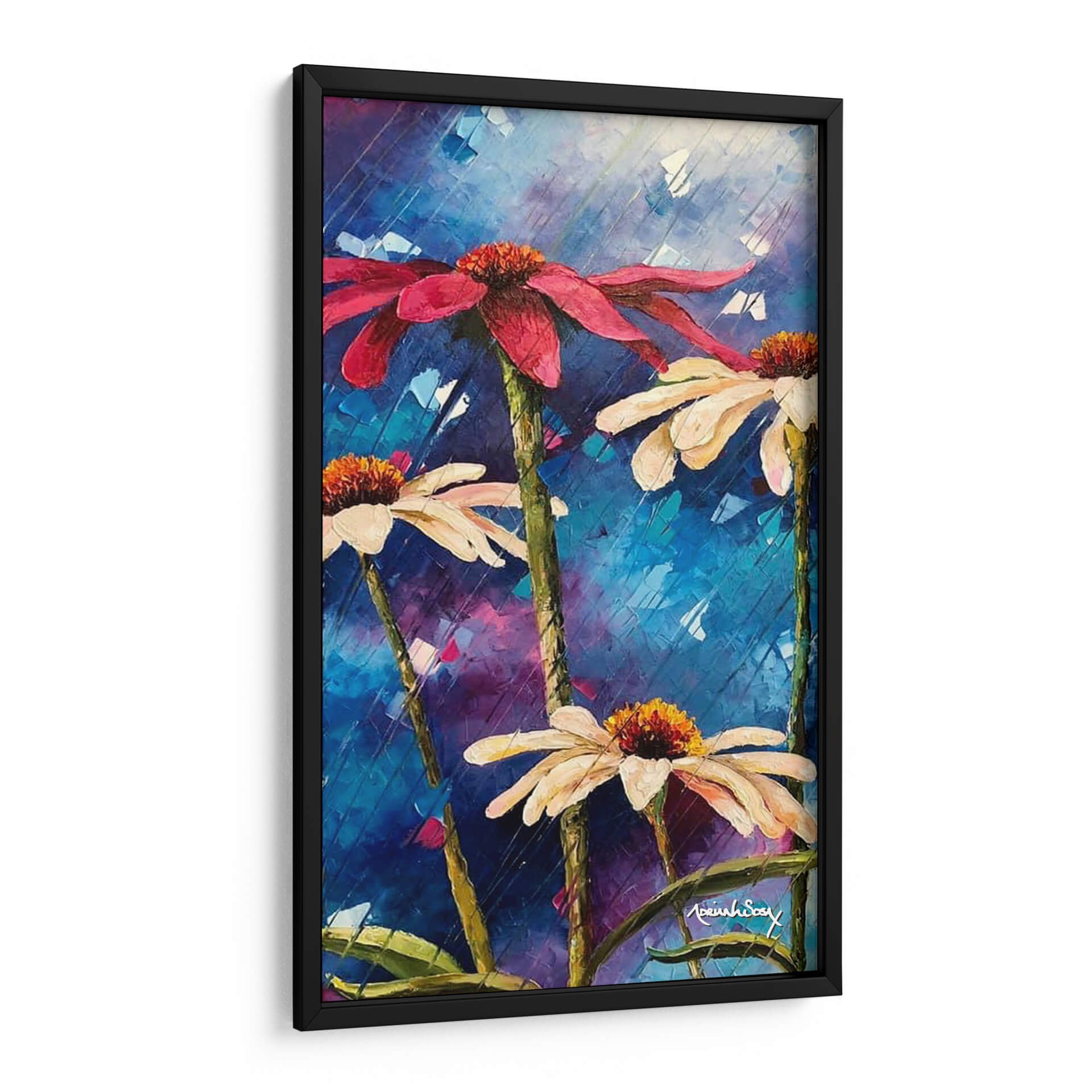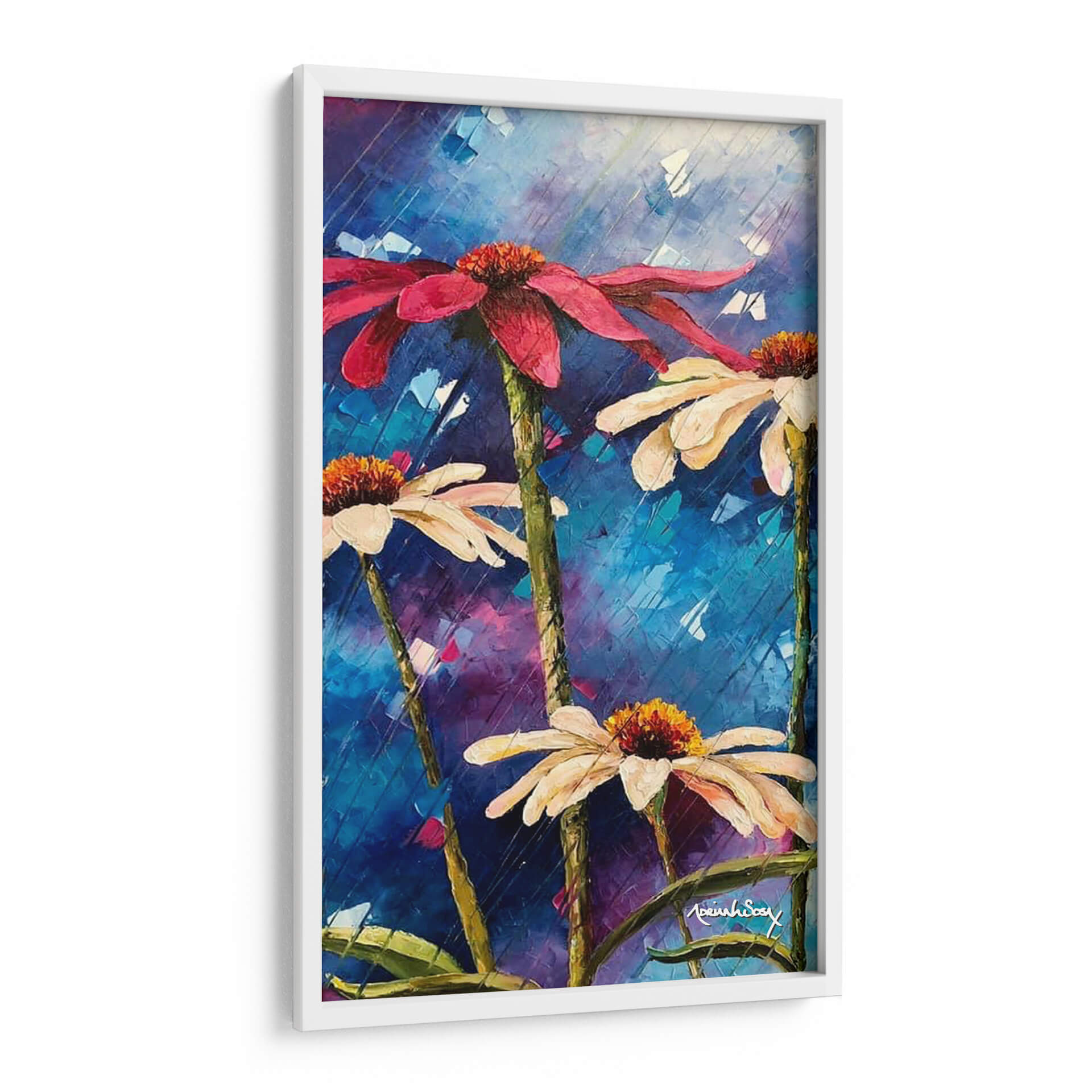 Sumérgete en la vibrante belleza de "En la lluvia", una obra de arte cautivadora de Adriana Sosa que captura la esencia de la naturaleza con una explosión de color y textura. Este cuadro decorativo presenta un primer plano de flores de margarita bañadas por la lluvia, donde los pétalos blancos y rosados contrastan audazmente con un fondo de azules intensos y toques de púrpura y rosa vibrantes. La técnica expresionista, con pinceladas audaces y empastadas, dota a la pieza de una energía palpable y una profundidad visual que invita a la contemplación. El juego de luces y sombras, junto con la representación casi abstracta de las gotas de lluvia, crea una atmósfera dinámica y a la vez serena. "En la lluvia" es ideal para añadir un toque de vitalidad y sofisticación a cualquier espacio, ya sea un salón moderno, un estudio inspirador o un dormitorio tranquilo. Su estilo único lo convierte en un punto focal memorable que evoca la fuerza y la delicadeza de la naturaleza en su máxima expresión. Este cuadro decorativo contemporáneo es perfecto para quienes buscan piezas de arte originales que transmitan emoción y carácter, transformando cualquier pared en una ventana a un mundo de color y sentimiento.