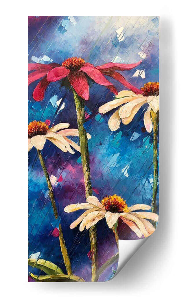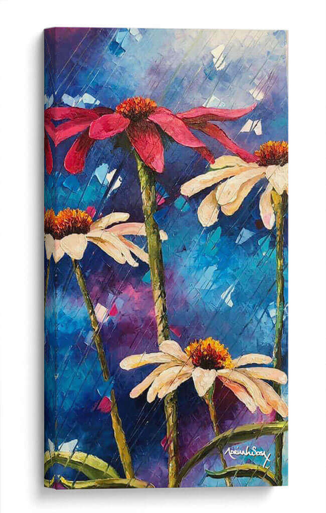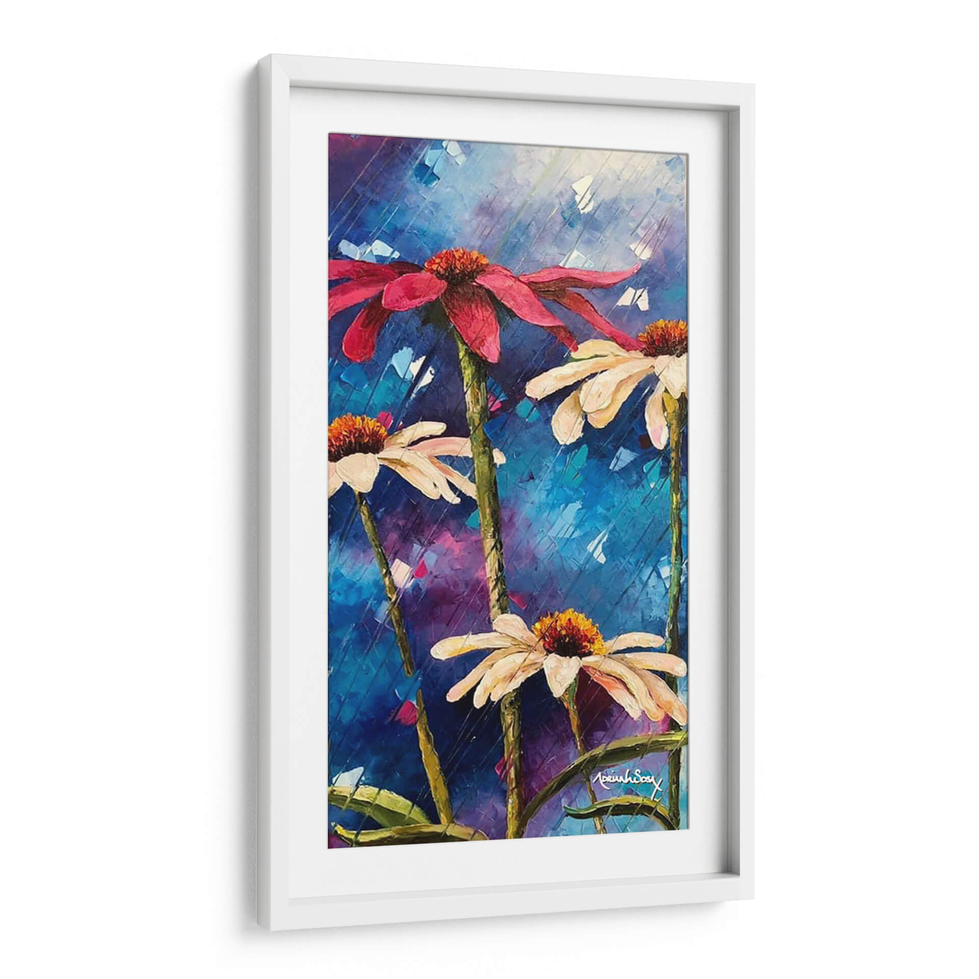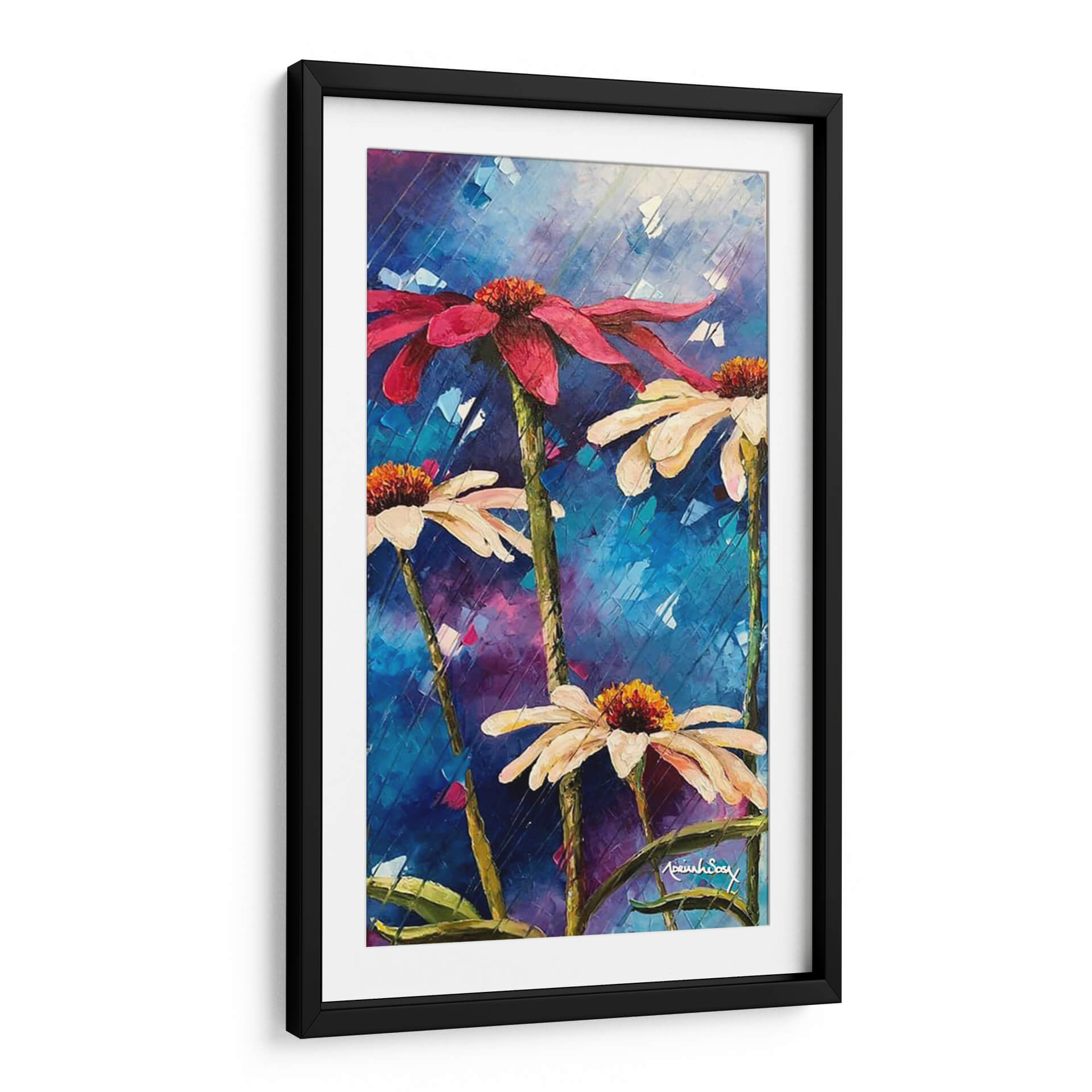 Sumérgete en la vibrante belleza de "En la lluvia", una obra de arte cautivadora de Adriana Sosa que captura la esencia de la naturaleza con una explosión de color y textura. Este cuadro decorativo presenta un primer plano de flores de margarita bañadas por la lluvia, donde los pétalos blancos y rosados contrastan audazmente con un fondo de azules intensos y toques de púrpura y rosa vibrantes. La técnica expresionista, con pinceladas audaces y empastadas, dota a la pieza de una energía palpable y una profundidad visual que invita a la contemplación. El juego de luces y sombras, junto con la representación casi abstracta de las gotas de lluvia, crea una atmósfera dinámica y a la vez serena. "En la lluvia" es ideal para añadir un toque de vitalidad y sofisticación a cualquier espacio, ya sea un salón moderno, un estudio inspirador o un dormitorio tranquilo. Su estilo único lo convierte en un punto focal memorable que evoca la fuerza y la delicadeza de la naturaleza en su máxima expresión. Este cuadro decorativo contemporáneo es perfecto para quienes buscan piezas de arte originales que transmitan emoción y carácter, transformando cualquier pared en una ventana a un mundo de color y sentimiento.