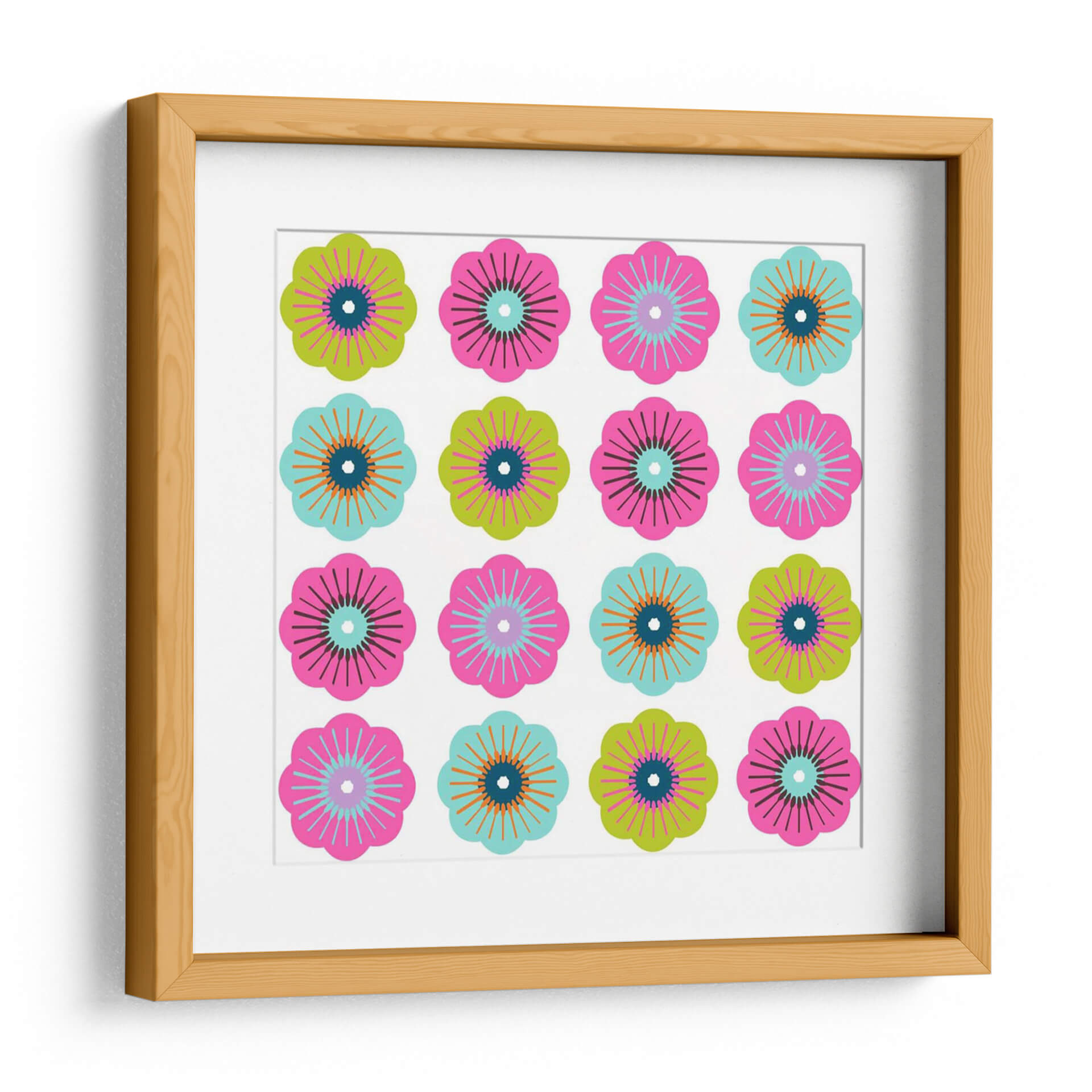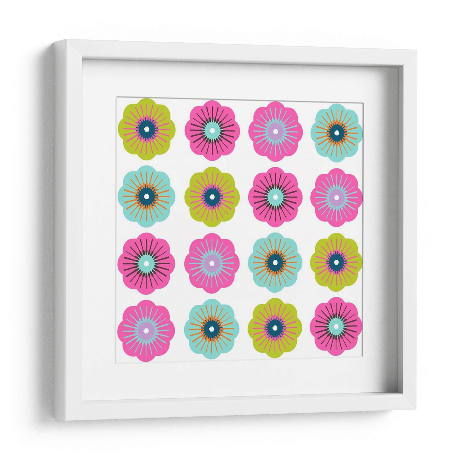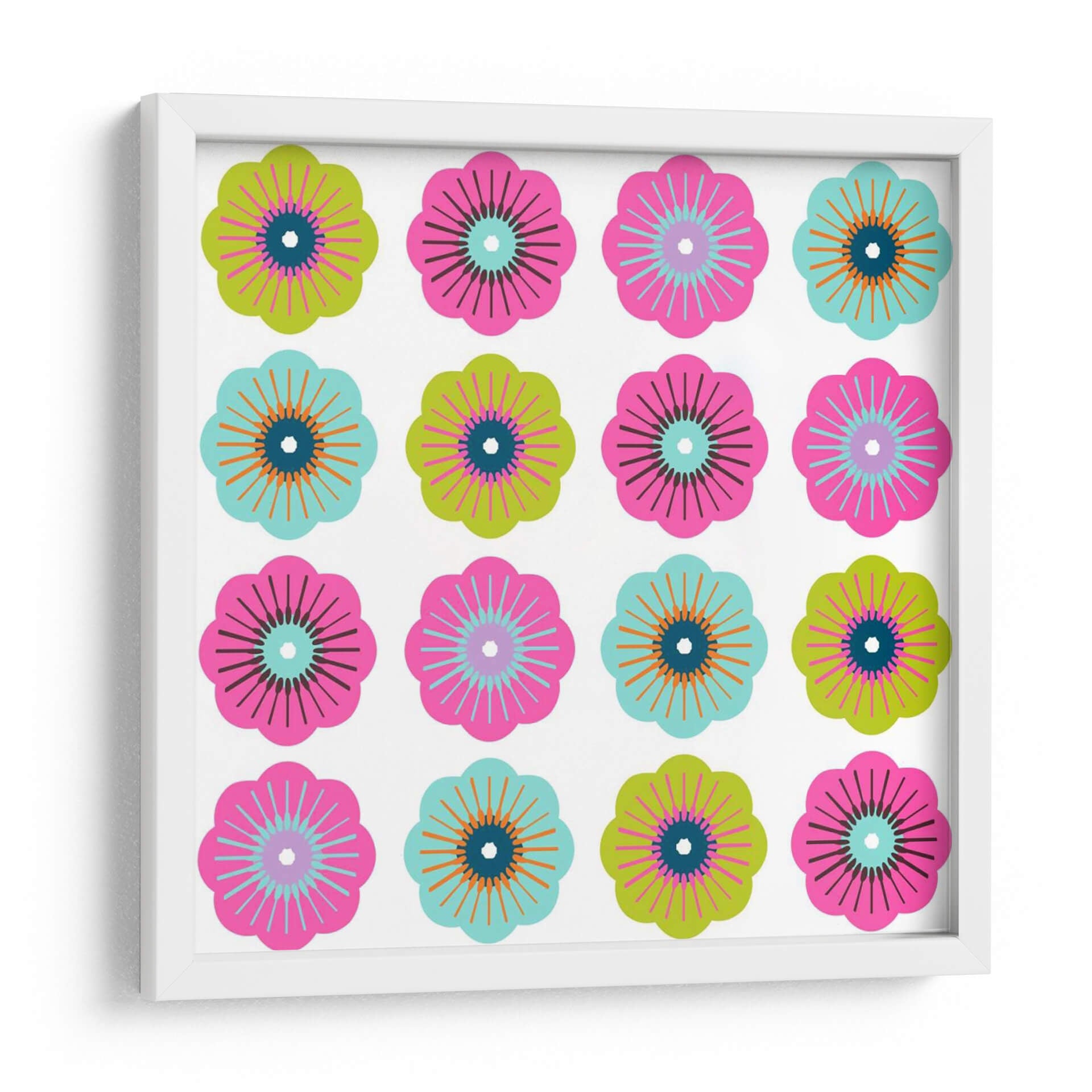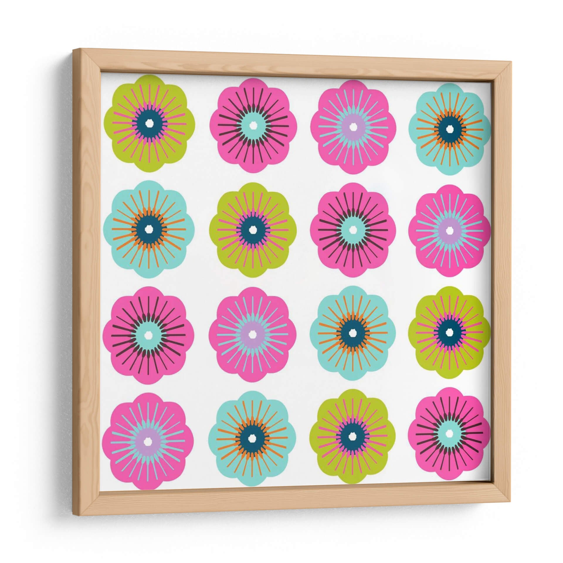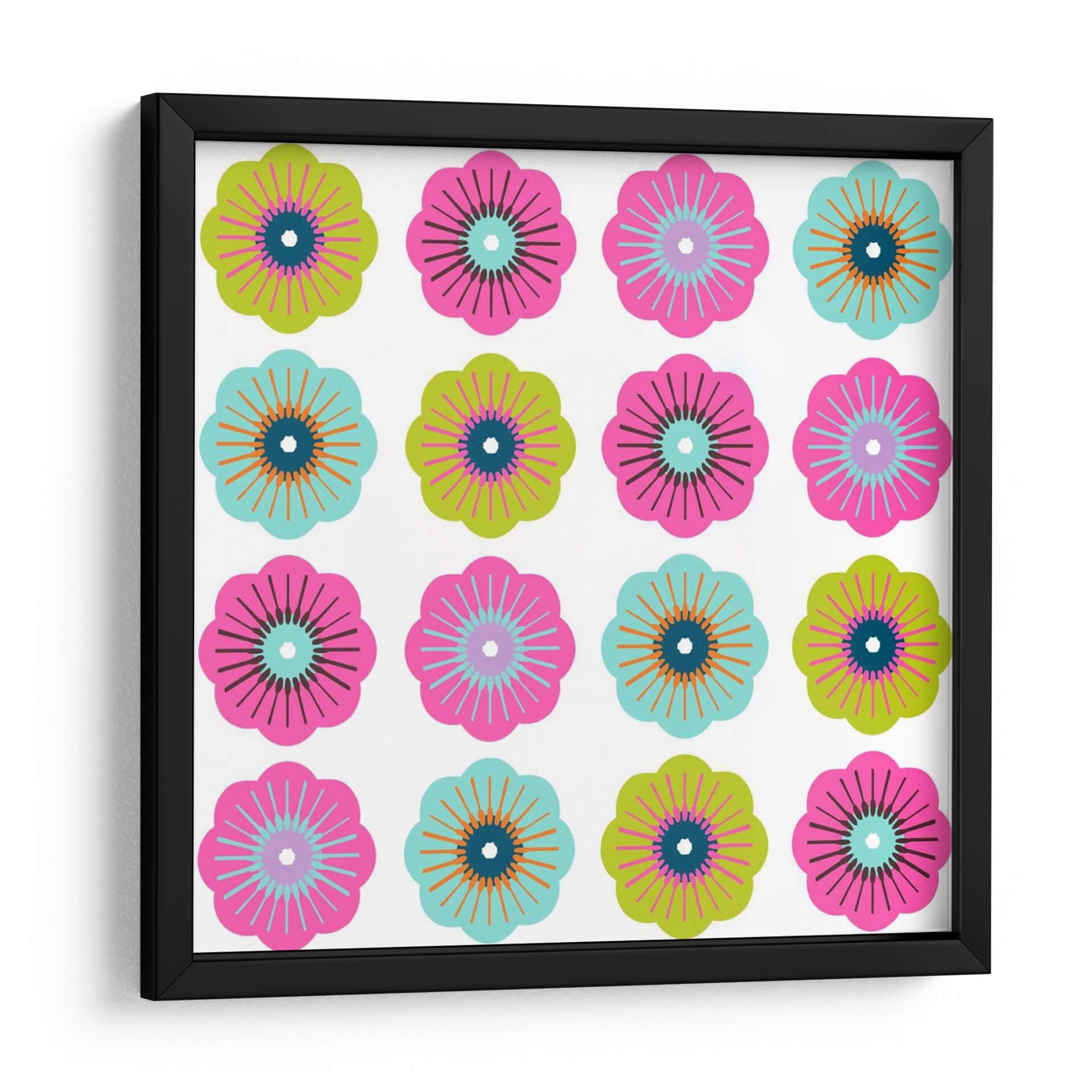 Transforma tu espacio con el vibrante cuadro decorativo 'Encantos II' de Nicole Ketchum, una explosión de color y alegría que dará vida a cualquier habitación. Esta obra maestra contemporánea presenta un patrón repetitivo de flores estilizadas en una paleta audaz que combina tonos vibrantes de rosa, verde lima, azul turquesa y acentos naranjas y morados, todo sobre un fondo blanco limpio. Cada flor, con su centro detallado y pétalos radiantes, irradia una energía positiva y un toque lúdico, creando una atmósfera de optimismo y frescura. El estilo gráfico y moderno de 'Encantos II' lo convierte en el complemento perfecto para interiores contemporáneos, salas de estar, dormitorios o incluso espacios de trabajo que buscan un acento de color y un diseño llamativo. Imagina cómo este cuadro decorativo puede convertirse en el punto focal de tu decoración, aportando personalidad y un estilo único. La composición simétrica y el diseño repetitivo ofrecen un ritmo visual agradable, ideal para quienes aprecian el arte moderno con un toque de naturaleza. Añade un toque de encanto y sofisticación a tu hogar u oficina con esta pieza inspiradora.