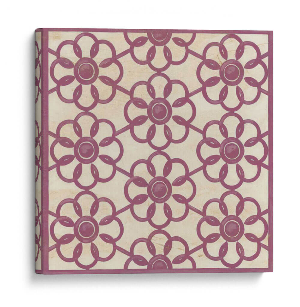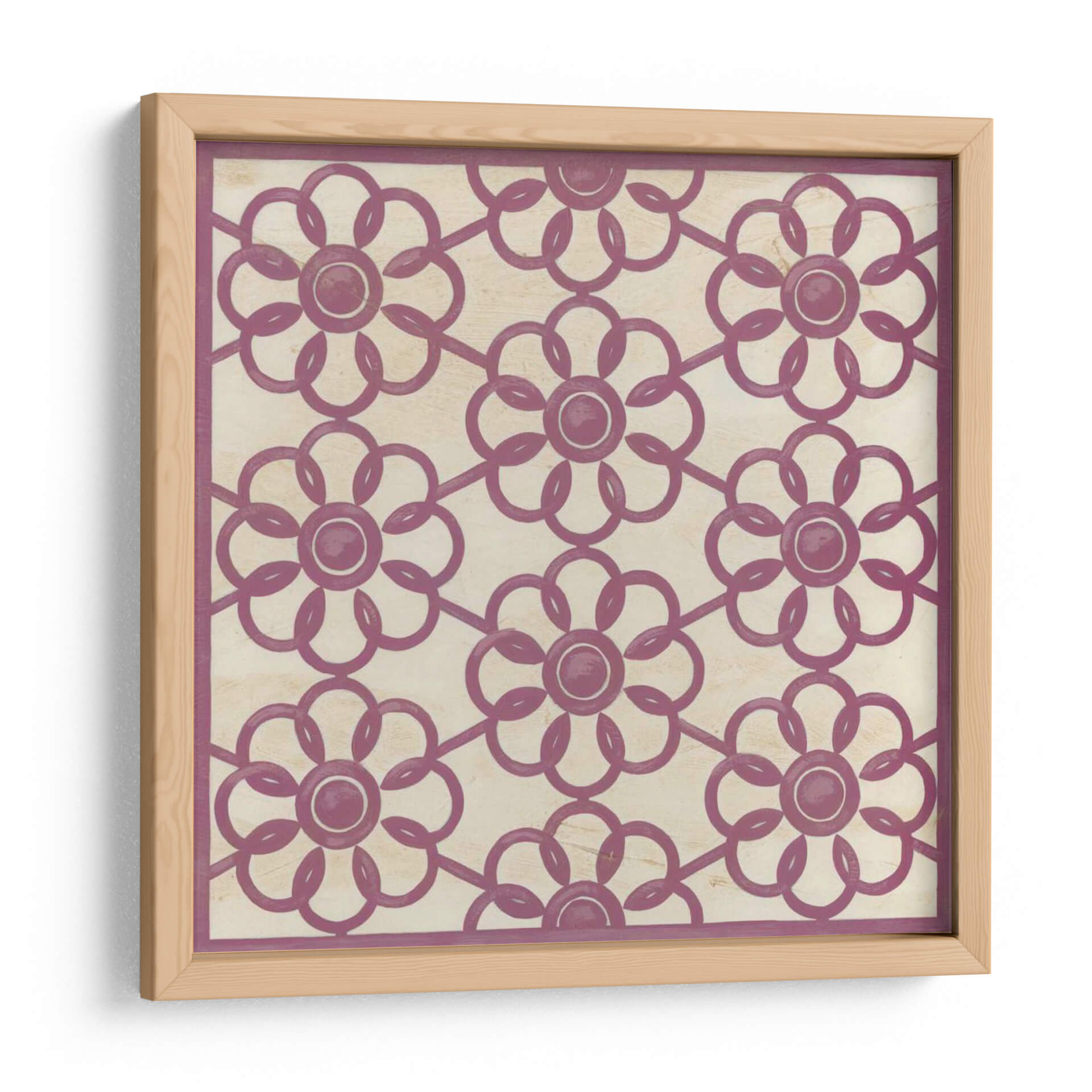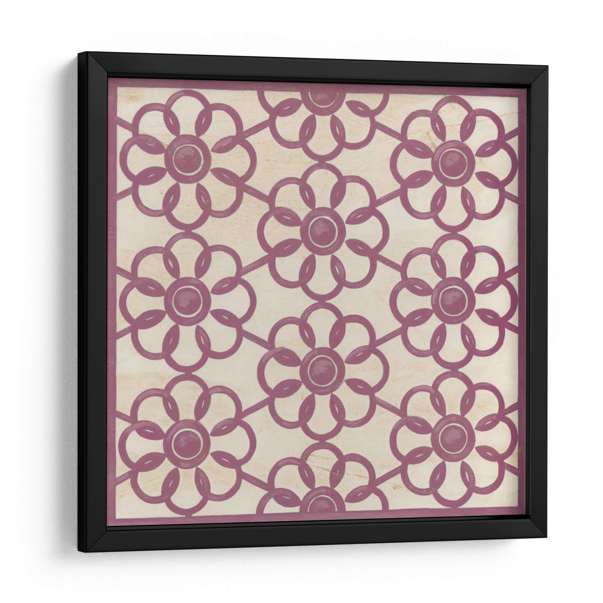 Aporta un toque de encanto botánico y diseño geométrico a tu espacio con "Floral Trellis IV" de June Erica Vess. Esta obra de arte presenta un patrón repetitivo de flores estilizadas en un vibrante tono púrpura, enmarcadas por una sutil textura de fondo en tonos crema y beige que evoca una sensación de calidez y antigüedad. La composición simétrica y las líneas fluidas de las formas florales crean una armonía visual que es a la vez relajante y cautivadora. Ideal para quienes buscan añadir un elemento decorativo con un aire clásico pero contemporáneo, este cuadro es perfecto para salones, dormitorios o incluso pasillos, aportando una dosis de color y elegancia sin ser abrumador. La repetición del motivo floral invita a la contemplación y añade profundidad, convirtiéndolo en un punto focal ideal que complementa una variedad de estilos decorativos, desde el bohemio hasta el moderno. Transforma tu hogar u oficina con esta pieza que celebra la belleza de la naturaleza a través de una lente de diseño refinado, creando un ambiente acogedor y sofisticado.