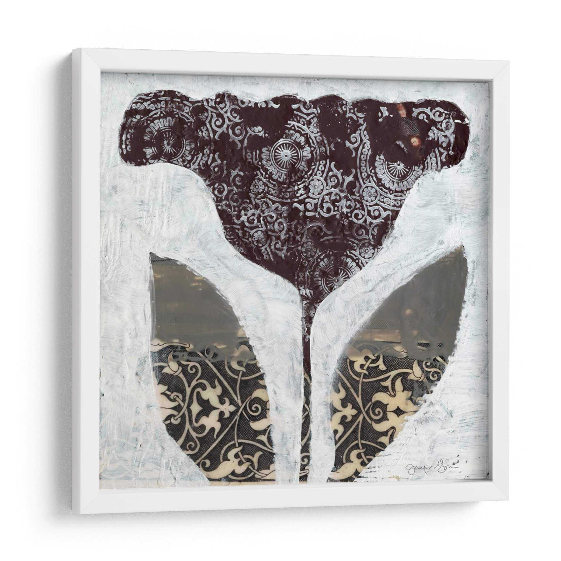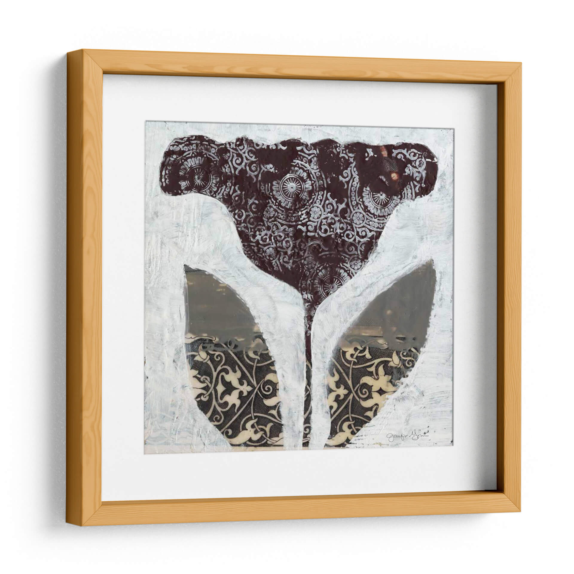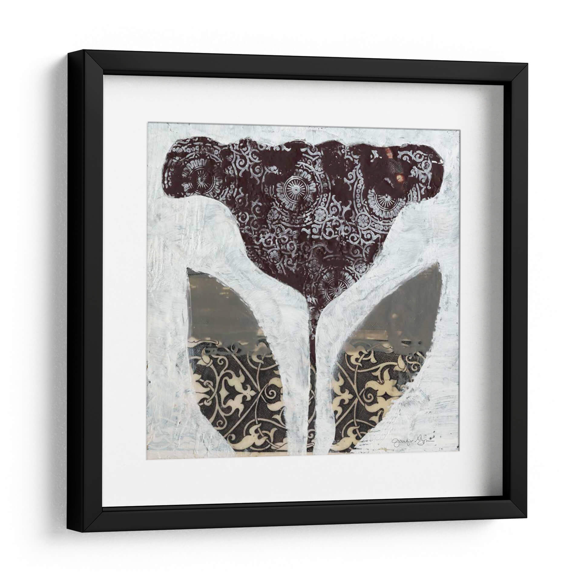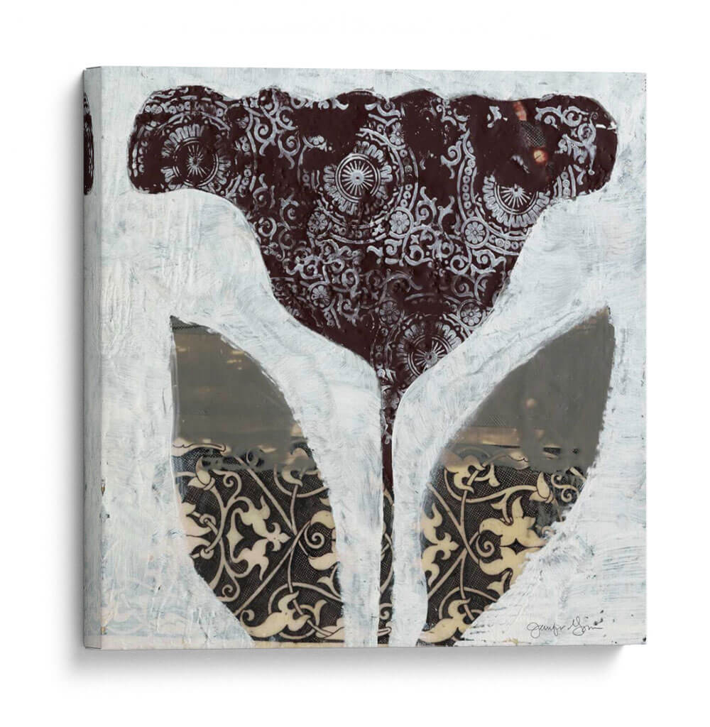 Sumérgete en la elegancia atemporal de 'Flores Populares III', una obra de arte que fusiona lo orgánico con patrones intrincados. El diseño central presenta una flor estilizada en un profundo tono burdeos, adornada con un delicado estampado damasquino en blanco y plateado que evoca sensaciones de lujo y tradición. Las hojas, integradas con texturas visuales y patrones gráficos contrastantes en blanco y negro, complementan la figura principal, creando una composición dinámica y visualmente atractiva. El fondo, texturizado en blanco roto y con toques sutiles de gris, proporciona un lienzo limpio que permite que los detalles de la flor resalten, añadiendo profundidad y un aire moderno a la pieza. Esta obra es ideal para espacios que buscan un toque de sofisticación y un punto focal de interés, como una sala de estar, un recibidor o una oficina. Su paleta de colores neutros con el contraste del burdeos la convierte en una adición versátil a cualquier esquema decorativo, aportando carácter sin abrumar. 'Flores Populares III' invita a la contemplación, ofreciendo una reinterpretación contemporánea de la belleza floral con un diseño distintivo y cautivador que enriquecerá tu hogar u oficina.