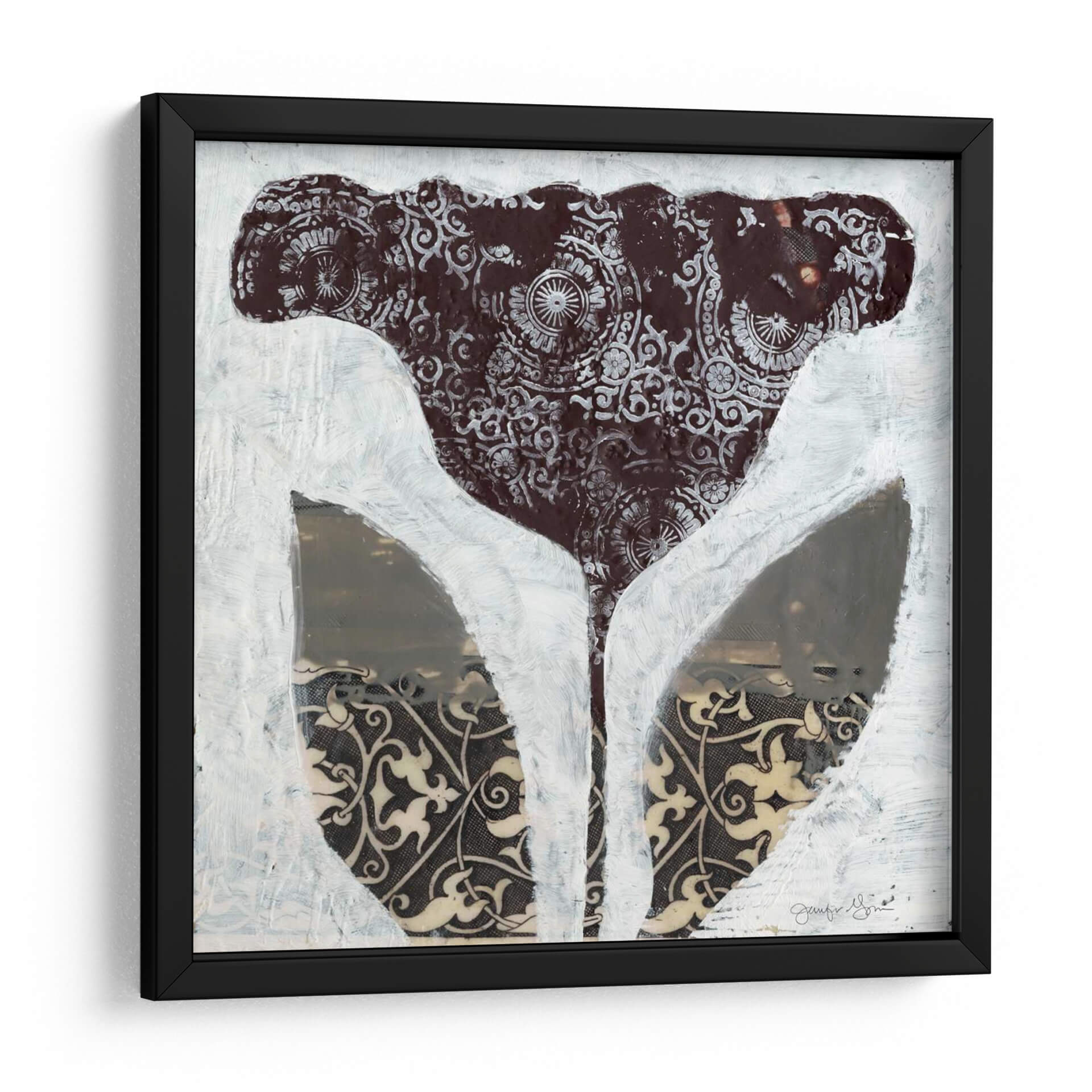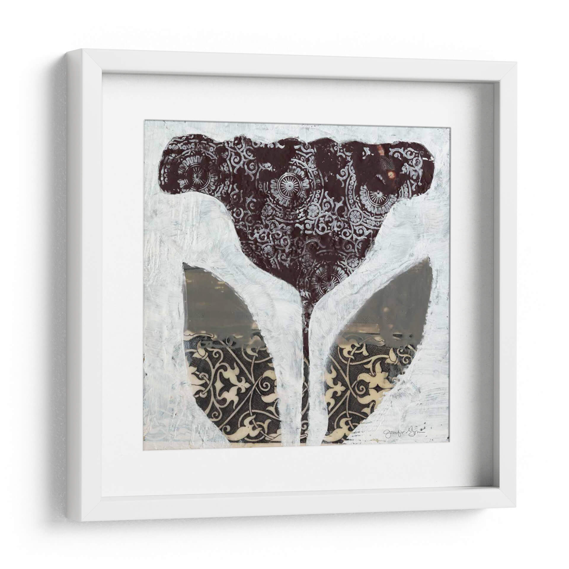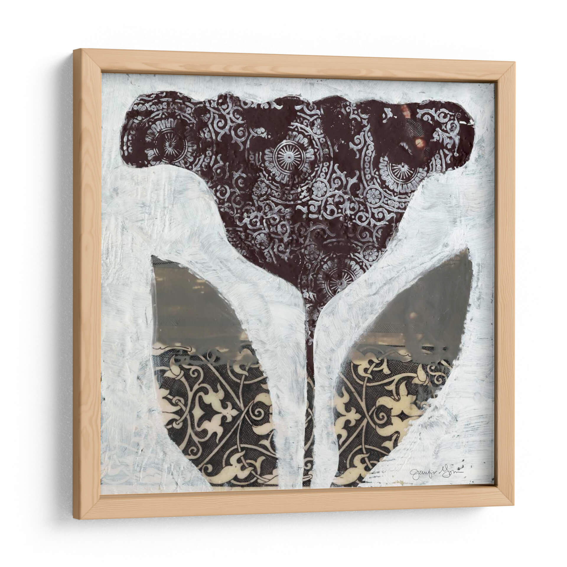 Sumérgete en la elegancia atemporal de 'Flores Populares III', una obra de arte que fusiona lo orgánico con patrones intrincados. El diseño central presenta una flor estilizada en un profundo tono burdeos, adornada con un delicado estampado damasquino en blanco y plateado que evoca sensaciones de lujo y tradición. Las hojas, integradas con texturas visuales y patrones gráficos contrastantes en blanco y negro, complementan la figura principal, creando una composición dinámica y visualmente atractiva. El fondo, texturizado en blanco roto y con toques sutiles de gris, proporciona un lienzo limpio que permite que los detalles de la flor resalten, añadiendo profundidad y un aire moderno a la pieza. Esta obra es ideal para espacios que buscan un toque de sofisticación y un punto focal de interés, como una sala de estar, un recibidor o una oficina. Su paleta de colores neutros con el contraste del burdeos la convierte en una adición versátil a cualquier esquema decorativo, aportando carácter sin abrumar. 'Flores Populares III' invita a la contemplación, ofreciendo una reinterpretación contemporánea de la belleza floral con un diseño distintivo y cautivador que enriquecerá tu hogar u oficina.