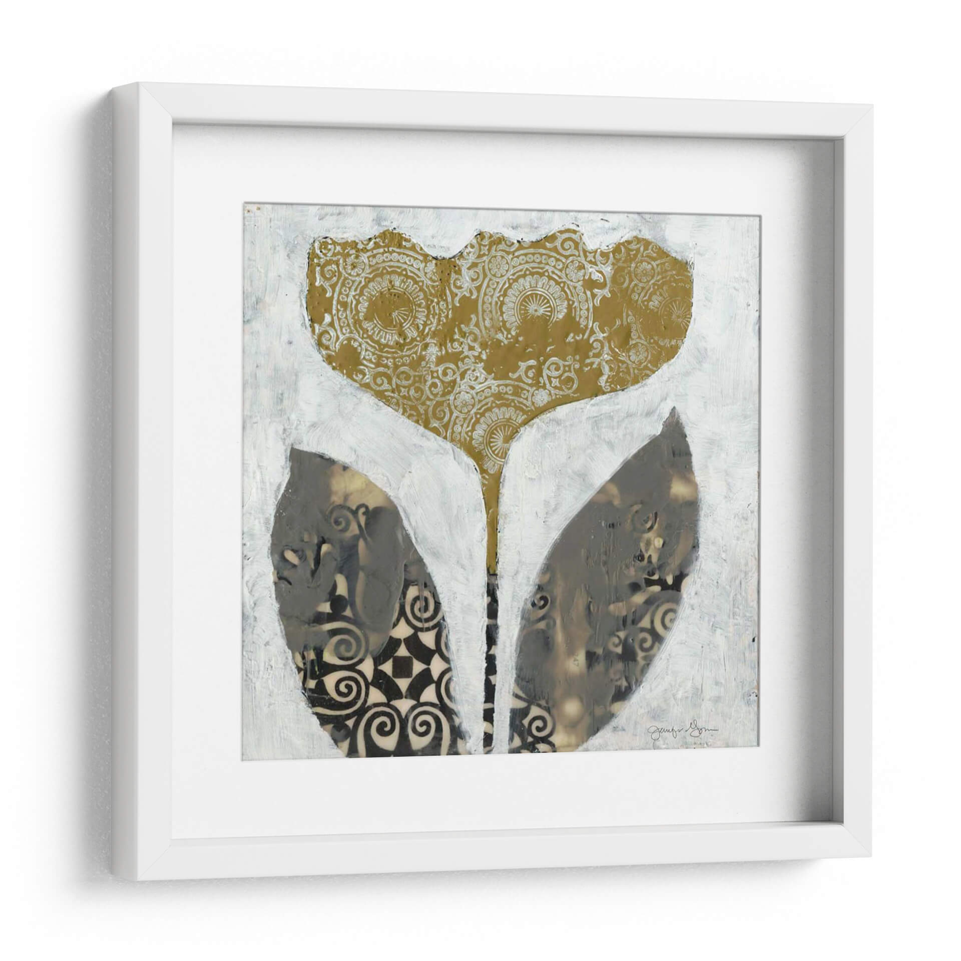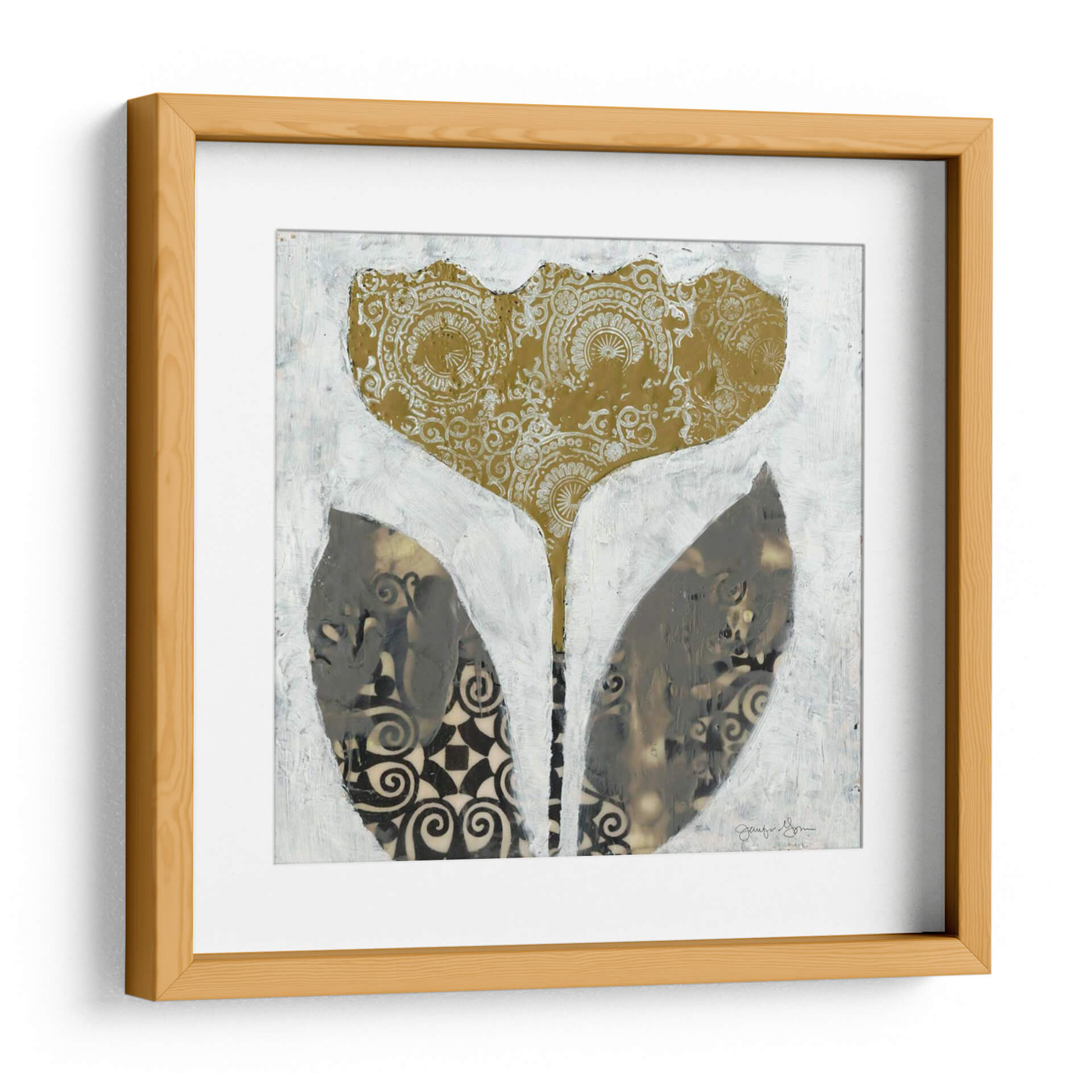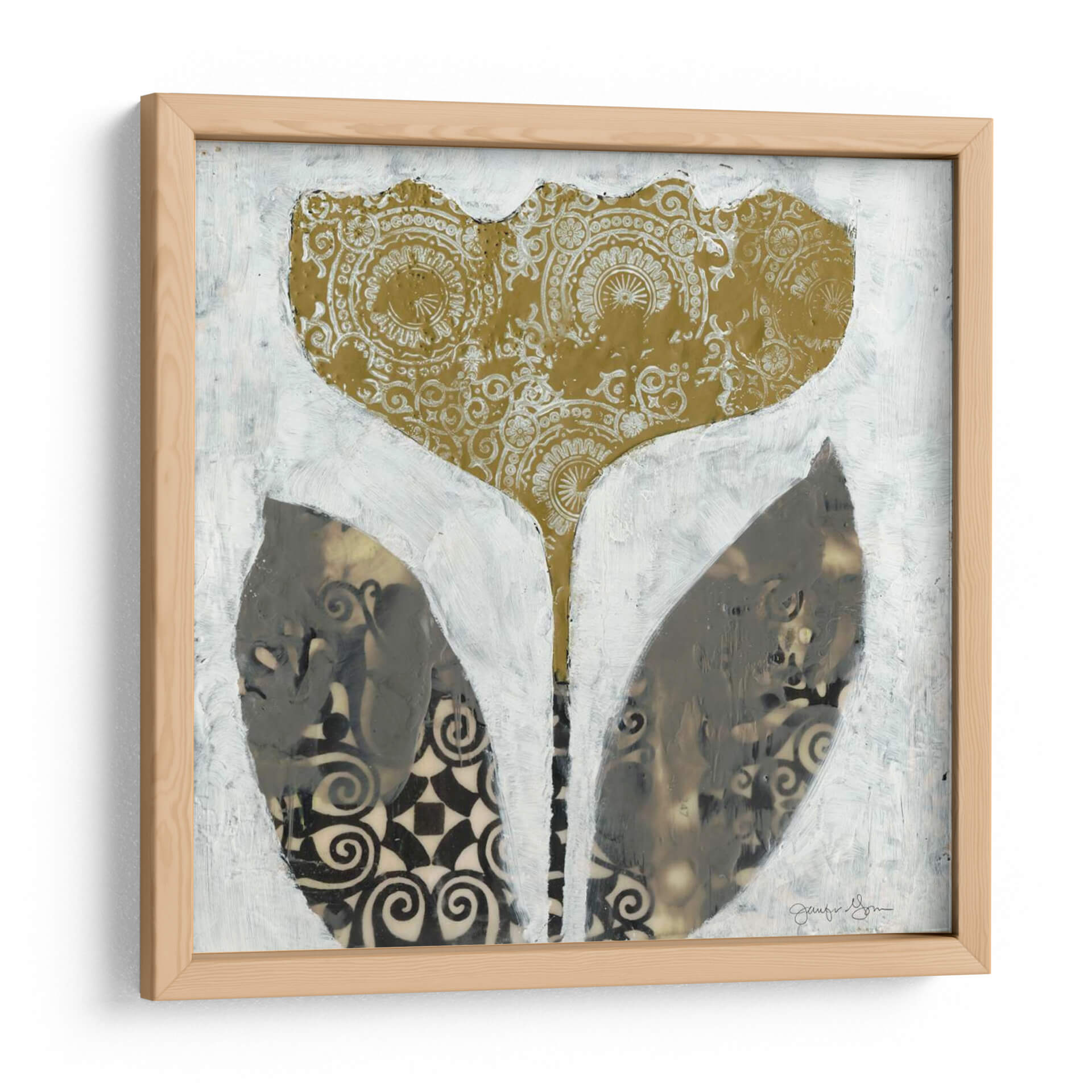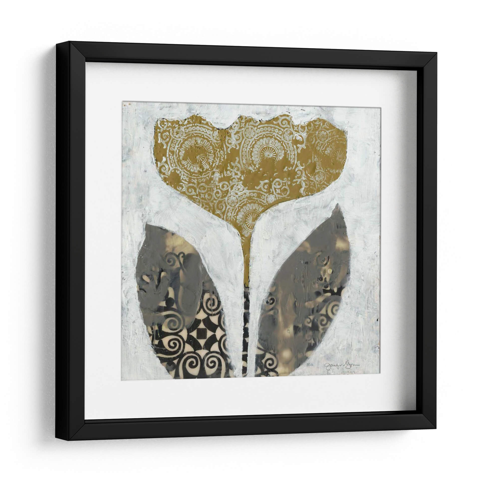Sumérgete en la belleza botánica reinventada con "Flores Populares Iv", una obra de Jennifer Goldberger que fusiona lo clásico con lo contemporáneo. Este cuadro decorativo presenta una flor estilizada, donde los pétalos superiores irradian un vibrante tono dorado adornado con intrincados patrones paisley y mandalas, evocando una sensación de lujo y tradición. Los pétalos inferiores, representados con texturas ricas en tonos tierra y grises, contrastan maravillosamente, incorporando motivos geométricos y remolinos que añaden profundidad y un toque moderno. El fondo blanco texturizado aporta luminosidad y sirve como lienzo perfecto para que la flor destaque. La composición es equilibrada y centrada, creando un punto focal armonioso ideal para salas de estar, dormitorios o estudios. La técnica mixta y el uso de patrones crean una pieza única que atrae la mirada y estimula la imaginación, perfecta para quienes buscan un arte decorativo que combine elegancia atemporal con un aire de originalidad. Añade un toque de sofisticación y vitalidad a tu hogar con esta cautivadora representación floral.