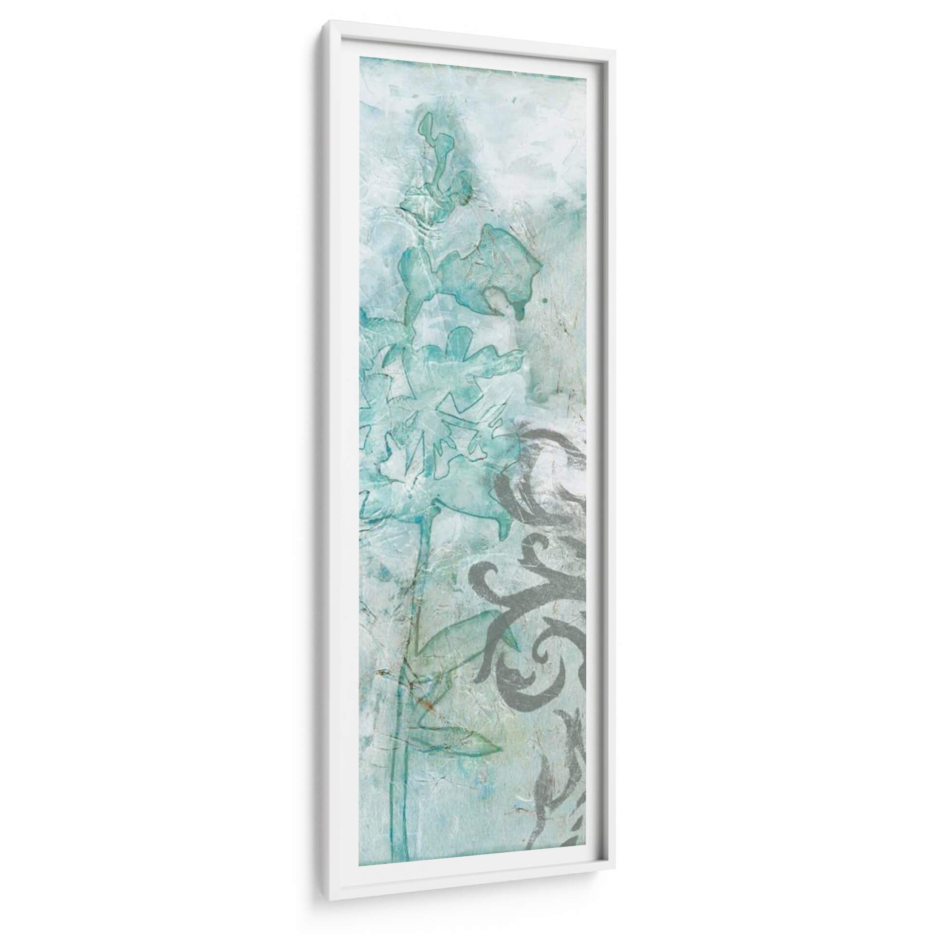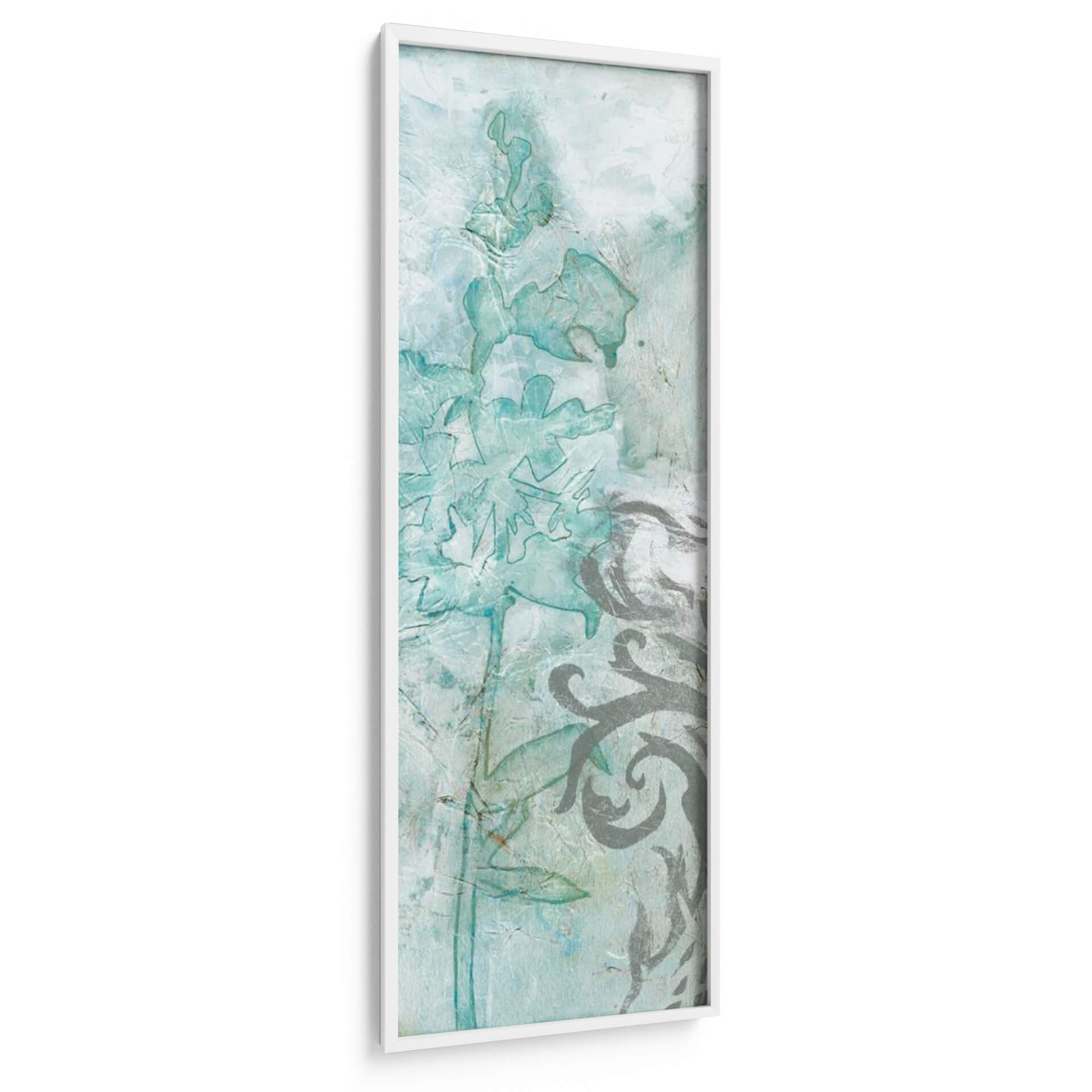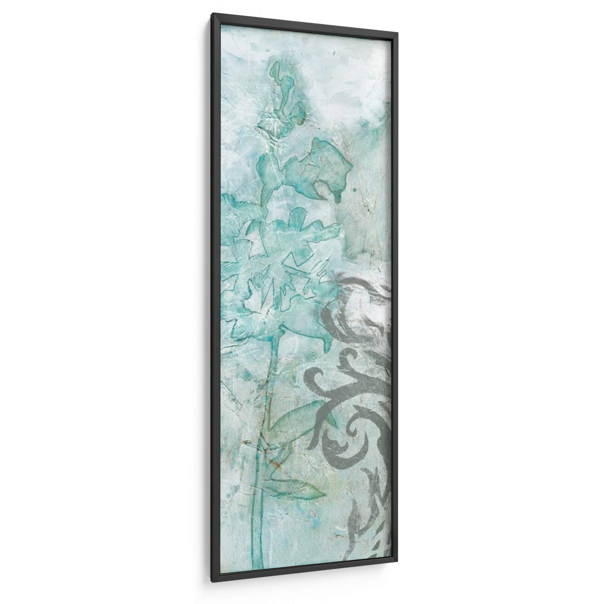 Sumérgete en la delicadeza etérea de "Flower Spray III", una obra de arte que captura la esencia de la naturaleza con un toque contemporáneo. Esta pieza vertical presenta una composición inspirada en delicadas flores y elementos botánicos, renderizadas en una paleta de suaves tonos turquesa, azules pálidos y grises texturizados. La técnica de Jennifer Goldberger evoca una sensación de acuarela o fresco, con capas translúcidas y un acabado texturizado que añade profundidad y un aire artesanal. Las formas florales, sutilmente delineadas y con contornos que sugieren movimiento, se entrelazan con motivos ornamentales en un contraste armonioso de lo orgánico y lo decorativo. "Flower Spray III" es perfecta para añadir un toque de serenidad y sofisticación a cualquier espacio. Imagina este cuadro decorativo como el punto focal de un dormitorio tranquilo, aportando calma y belleza natural, o como un elemento refinado en un salón o recibidor que busca una atmósfera elegante y relajada. Su diseño vertical lo hace ideal para paredes estrechas o para complementar otras decoraciones, creando una atmósfera de ensueño y frescura.
