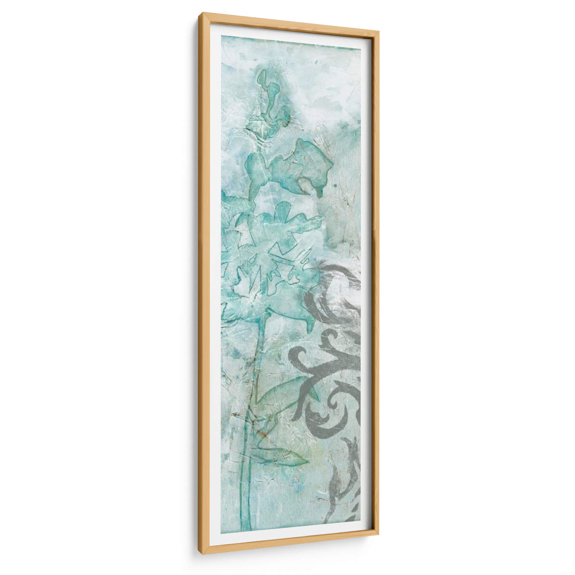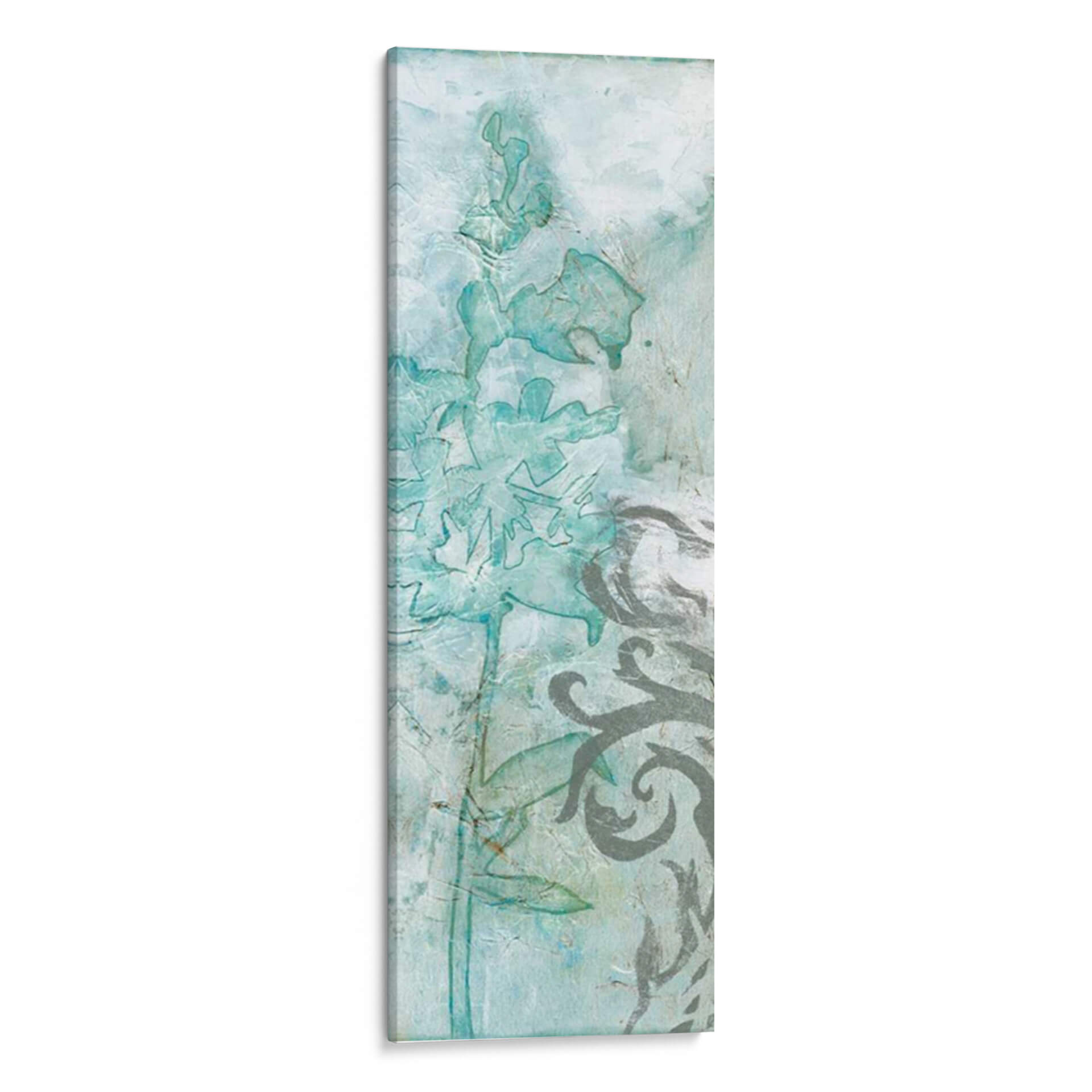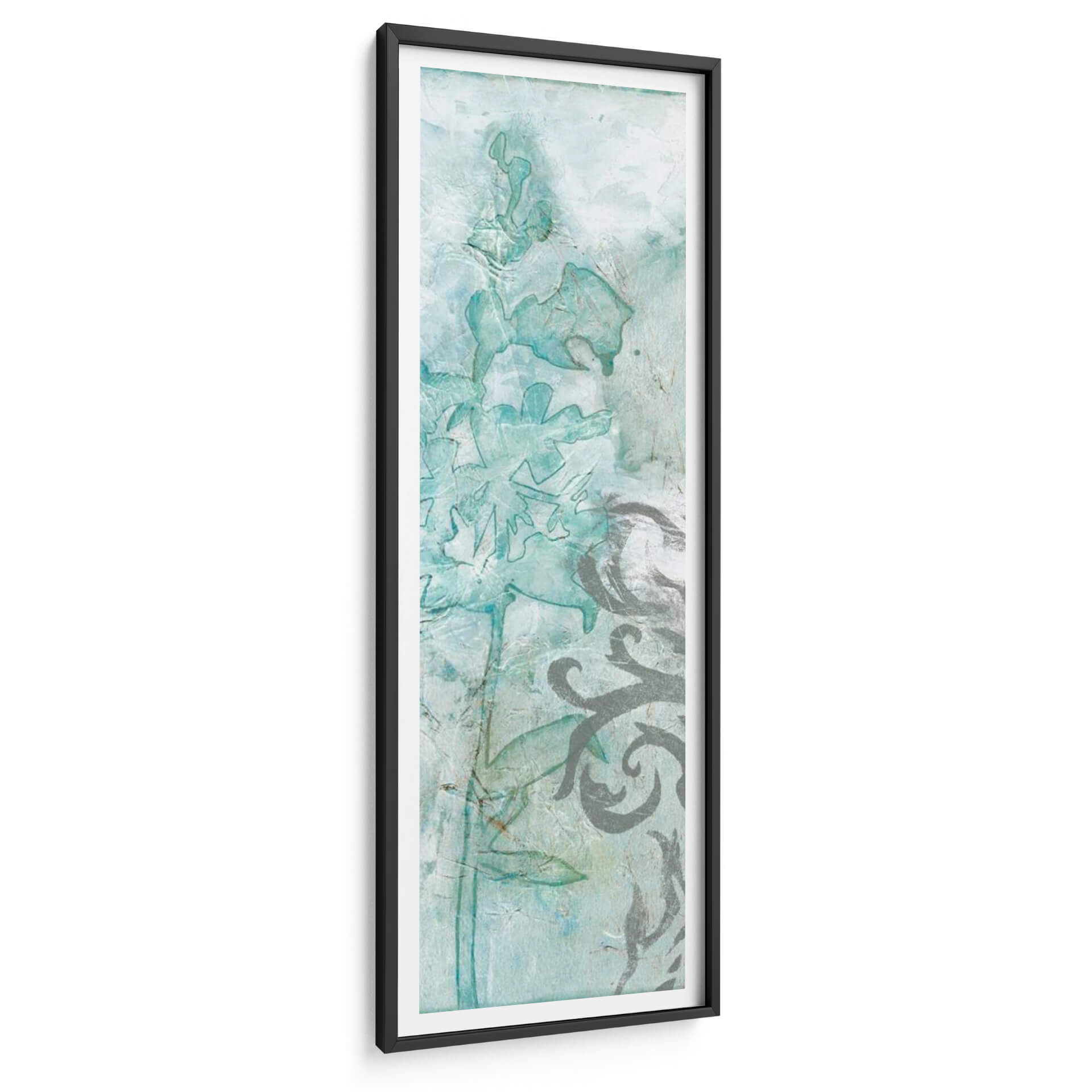 Sumérgete en la delicadeza etérea de "Flower Spray III", una obra de arte que captura la esencia de la naturaleza con un toque contemporáneo. Esta pieza vertical presenta una composición inspirada en delicadas flores y elementos botánicos, renderizadas en una paleta de suaves tonos turquesa, azules pálidos y grises texturizados. La técnica de Jennifer Goldberger evoca una sensación de acuarela o fresco, con capas translúcidas y un acabado texturizado que añade profundidad y un aire artesanal. Las formas florales, sutilmente delineadas y con contornos que sugieren movimiento, se entrelazan con motivos ornamentales en un contraste armonioso de lo orgánico y lo decorativo. "Flower Spray III" es perfecta para añadir un toque de serenidad y sofisticación a cualquier espacio. Imagina este cuadro decorativo como el punto focal de un dormitorio tranquilo, aportando calma y belleza natural, o como un elemento refinado en un salón o recibidor que busca una atmósfera elegante y relajada. Su diseño vertical lo hace ideal para paredes estrechas o para complementar otras decoraciones, creando una atmósfera de ensueño y frescura.