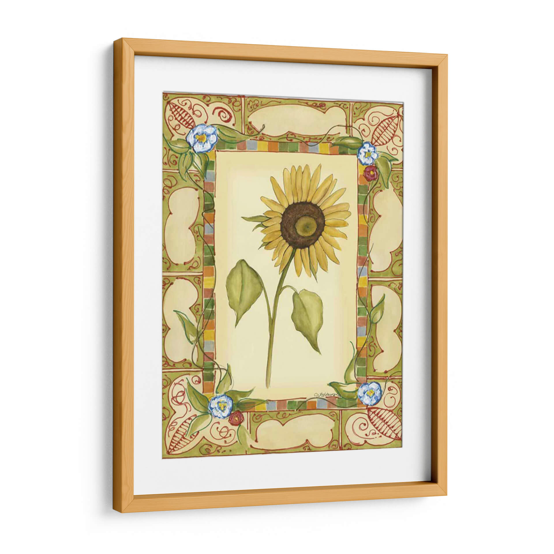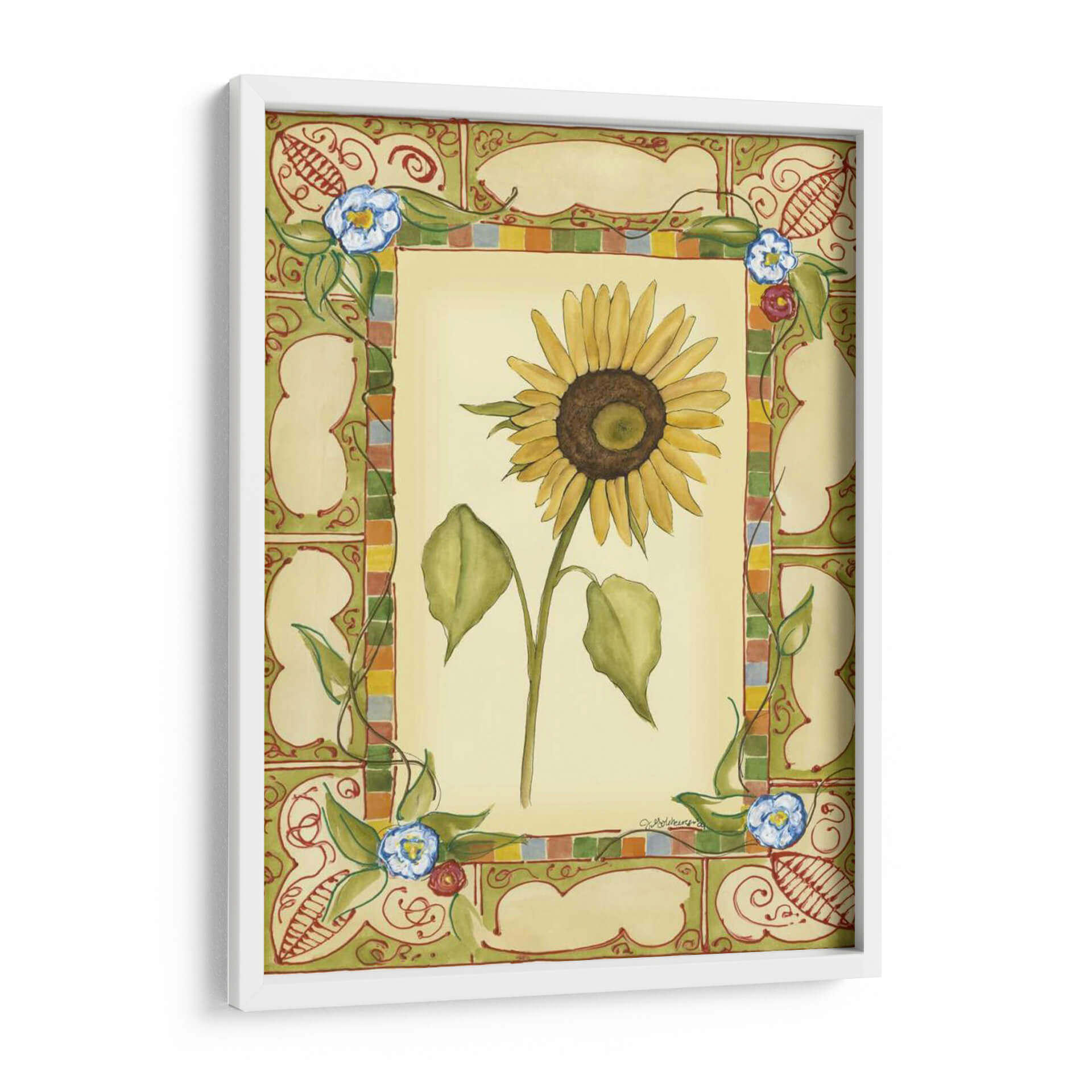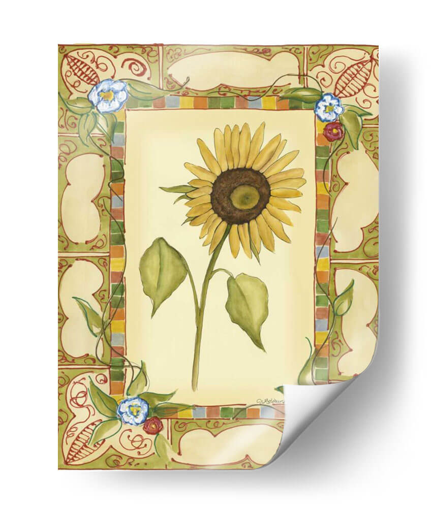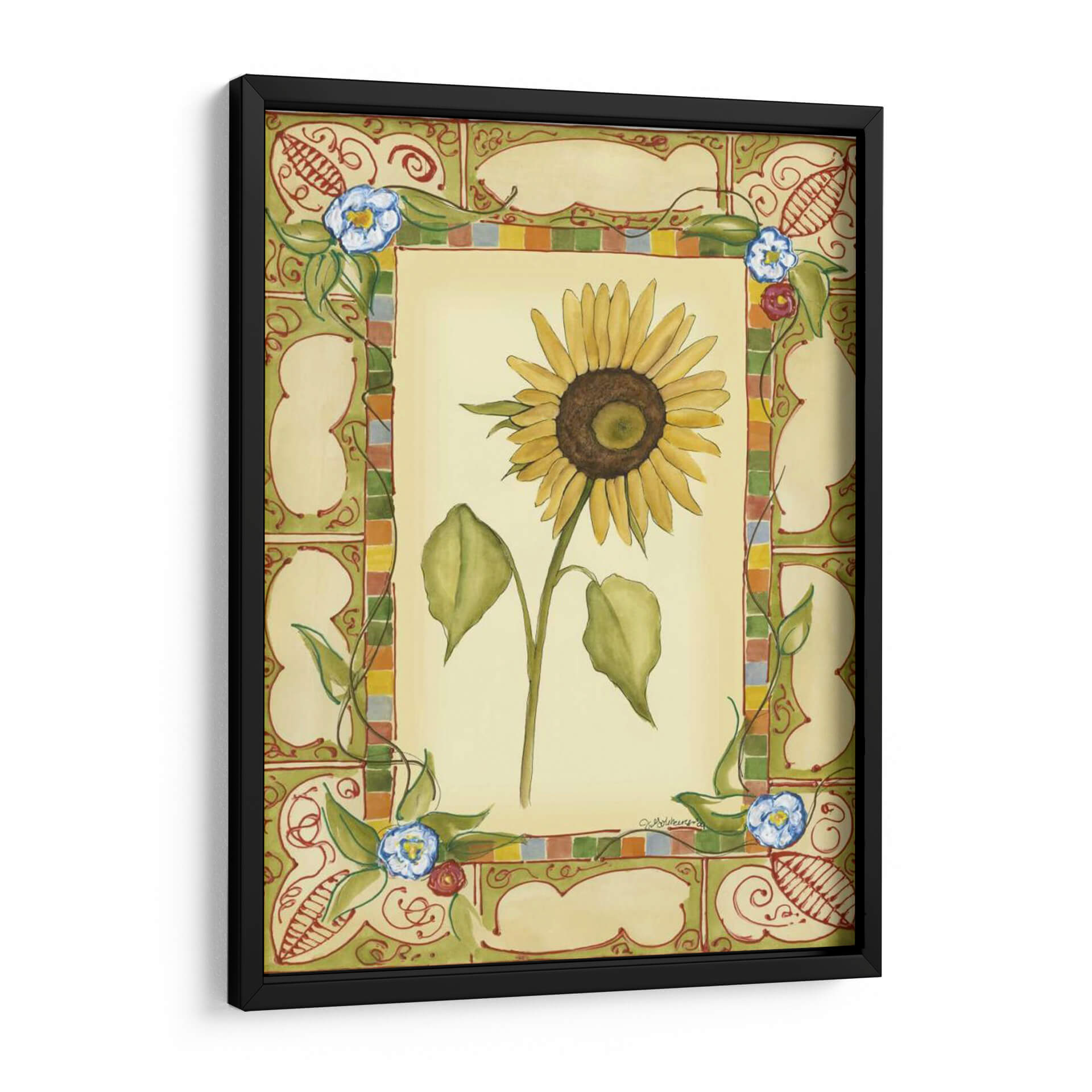Inyecta calidez y el encanto de la naturaleza en tu hogar con este cautivador cuadro decorativo 'French Country Sunflower II' de Jennifer Goldberger. La obra presenta un vibrante girasol en el centro, con sus pétalos amarillos desplegándose majestuosamente y un detallado centro oscuro, capturando la esencia misma del verano y la abundancia. El girasol se alza sobre un fondo suavemente coloreado en tonos crema y marfil, lo que permite que el sujeto principal resalte con una presencia serena y elegante. Un intrincado marco digital, adornado con motivos florales, remolinos verdes y pequeños mosaicos de colores, rodea la escena, añadiendo un toque rústico y artesanal que evoca el estilo francés de campo. La paleta de colores, dominada por amarillos cálidos, verdes naturales y toques de azul y rojo en las flores decorativas del marco, crea una atmósfera acogedora y alegre. Este cuadro es perfecto para dar vida a cualquier espacio, desde una cocina luminosa hasta una sala de estar o un dormitorio, aportando una sensación de optimismo y conexión con la naturaleza. Su estilo, que fusiona lo clásico con un toque contemporáneo, lo convierte en una pieza versátil para diversas decoraciones.