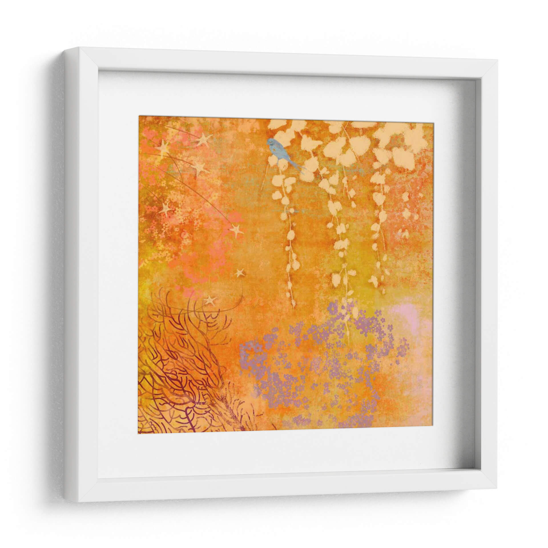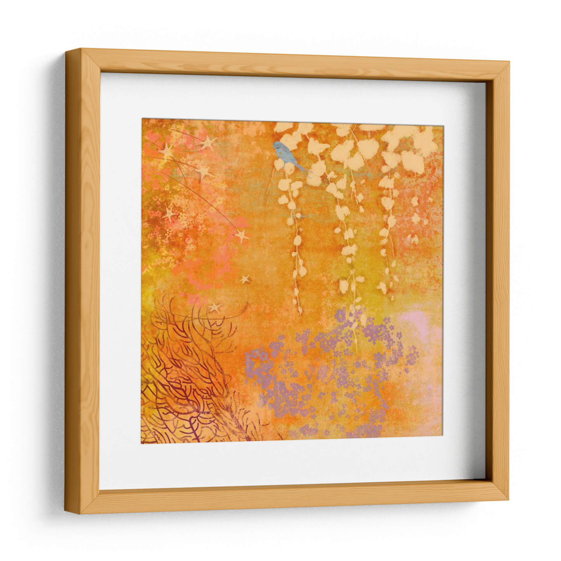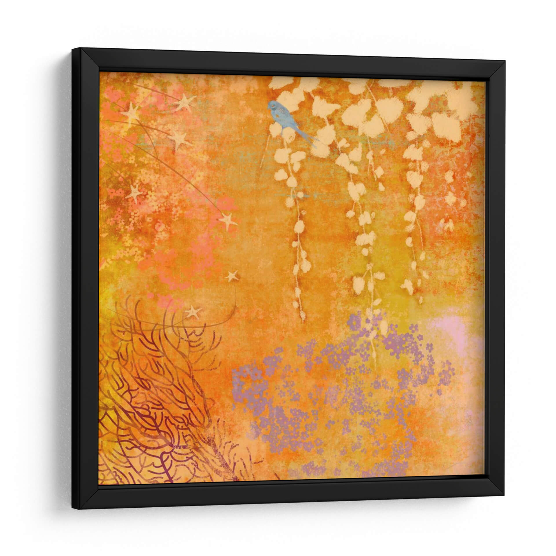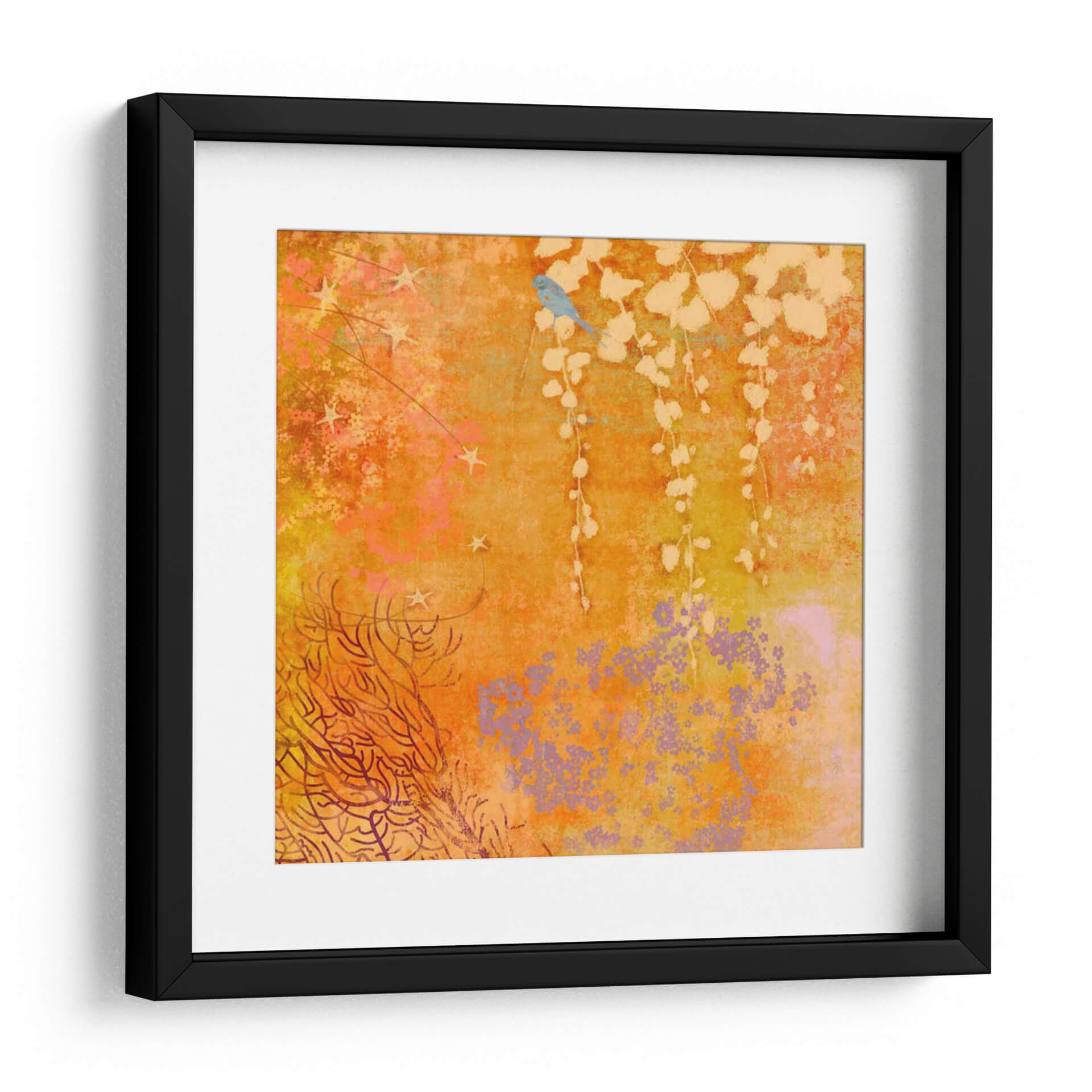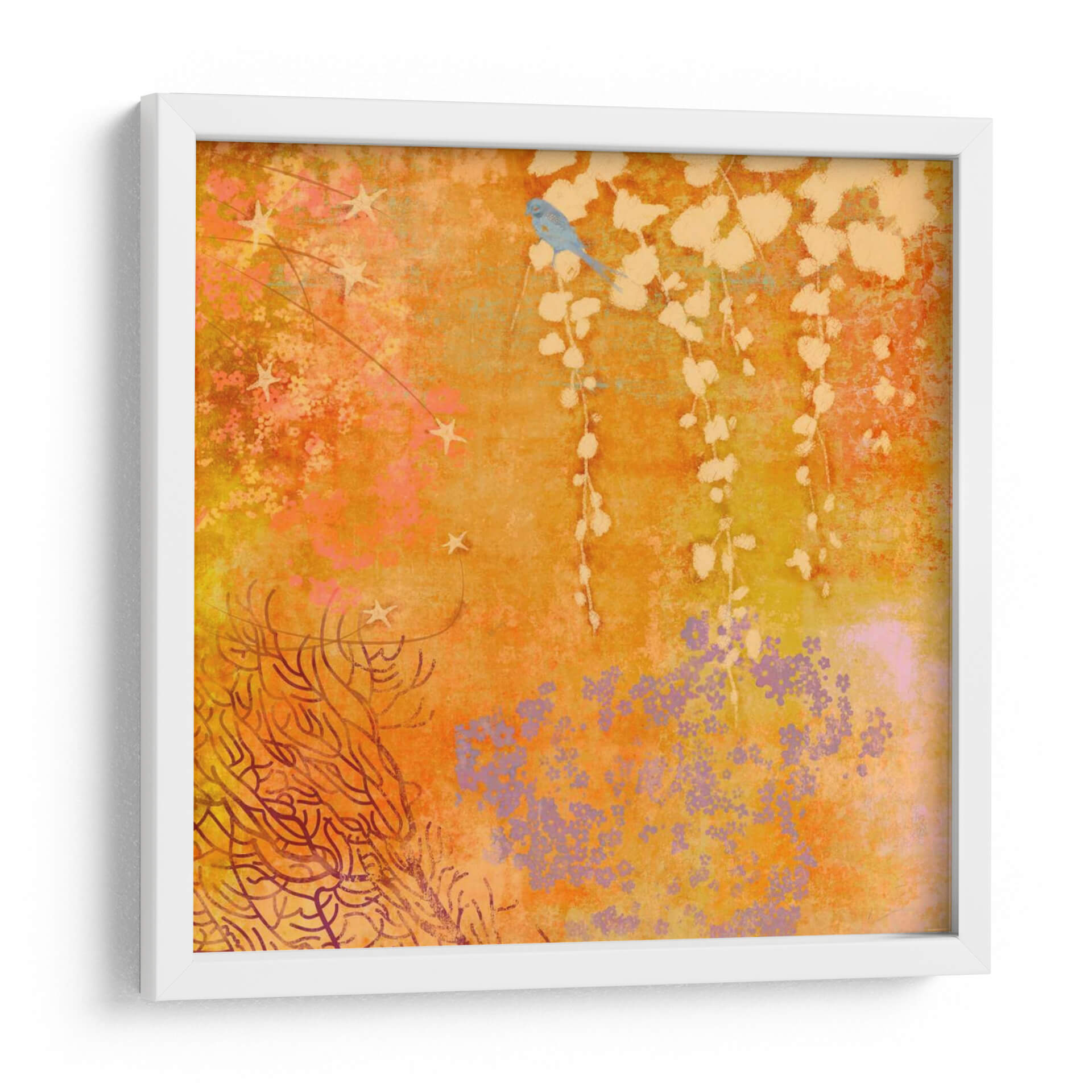 Sumérgete en la calidez y el encanto de "Ginger Fall III", una obra de arte digital que evoca la serenidad de la naturaleza con un toque de fantasía. Este cuadro decorativo captura la esencia de un jardín otoñal en plena efervescencia, dominado por una vibrante paleta de naranjas, amarillos y toques de lila y rosa. En el centro, un delicado pájaro azul posado en una rama suspendida añade un punto focal de dulzura y tranquilidad, mientras que sutiles elementos estrellados y una exuberante vegetación en tonos tierra y coral componen el resto de la escena. La composición, con su mezcla de texturas y formas orgánicas, crea una atmósfera onírica y acogedora, perfecta para infundir vida y color en cualquier espacio. Ideal para quienes buscan un arte que combine la belleza natural con una estética contemporánea y soñadora, este cuadro es un acierto seguro para salones, dormitorios o estudios que deseen un toque de originalidad y calma. Transforma tu hogar en un santuario de inspiración con esta pieza única que invita a la contemplación y al bienestar.