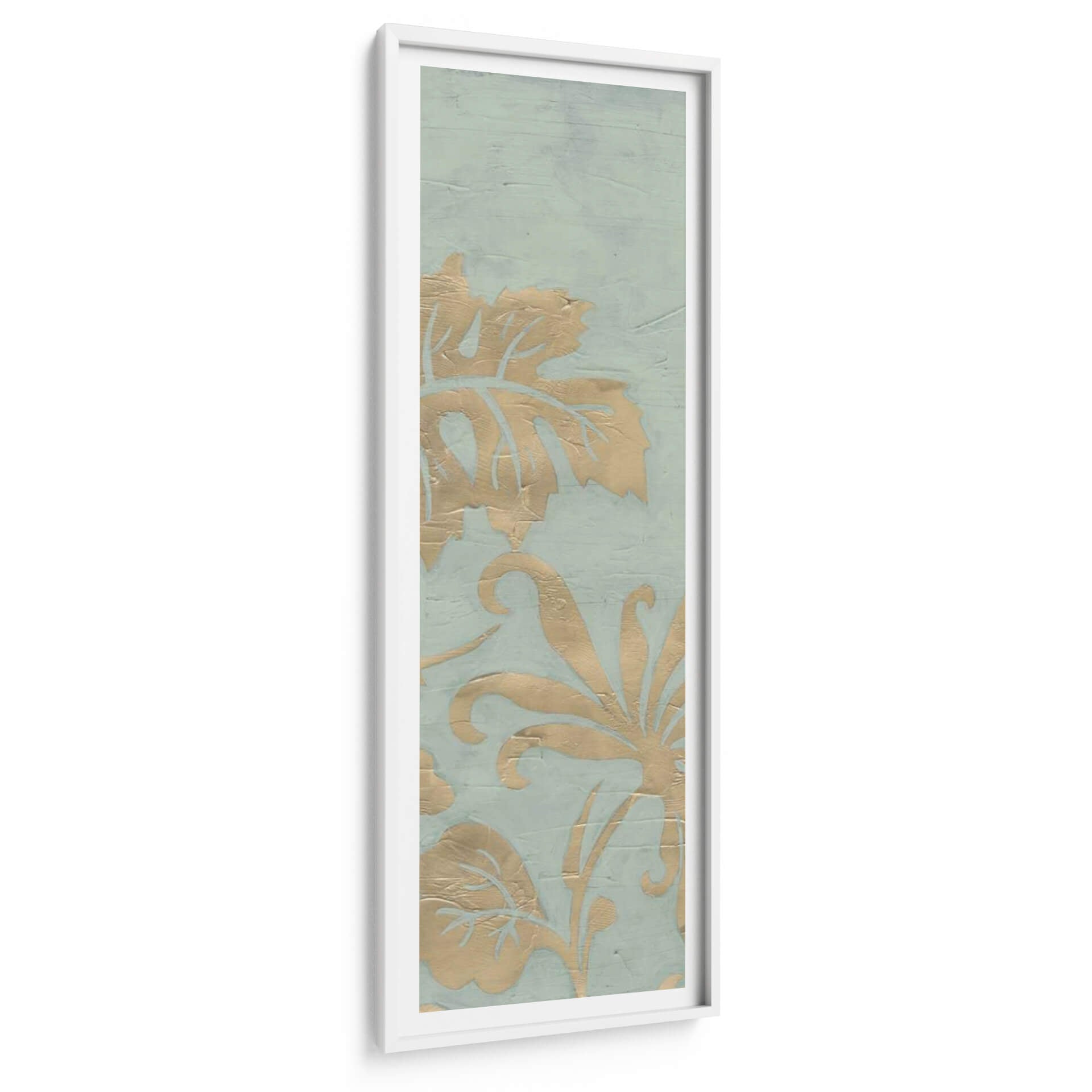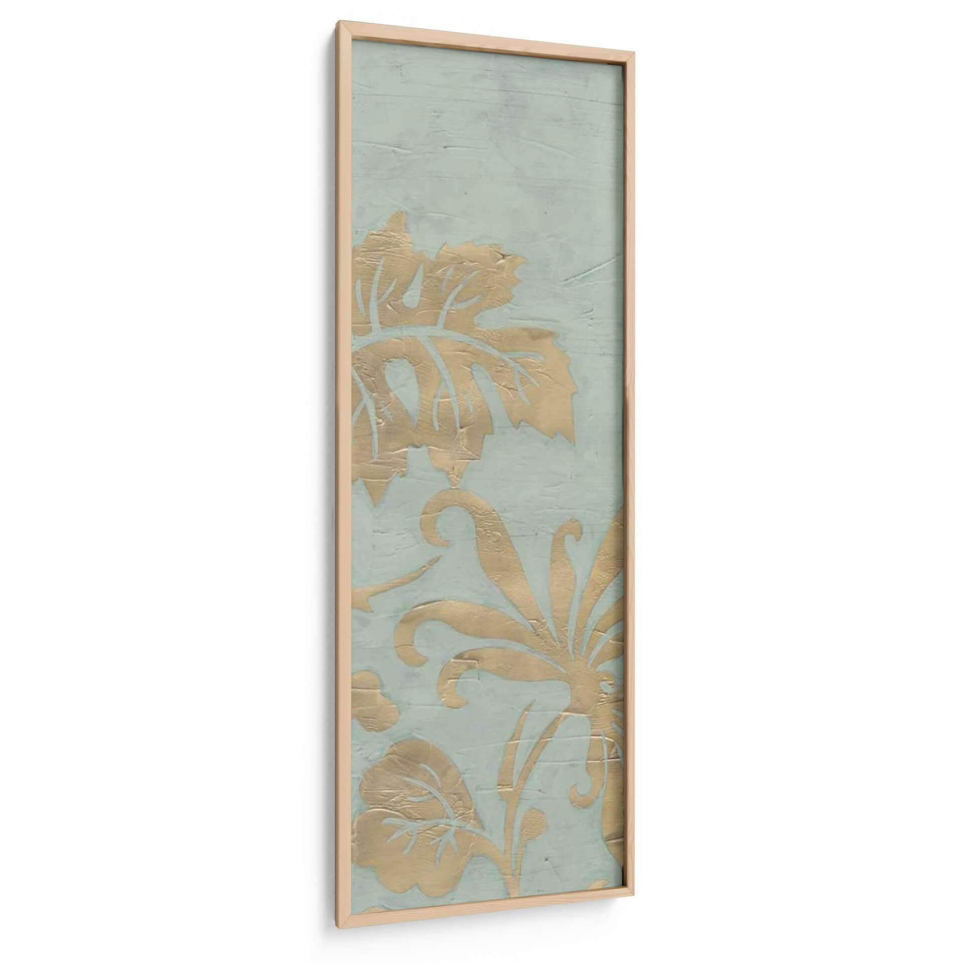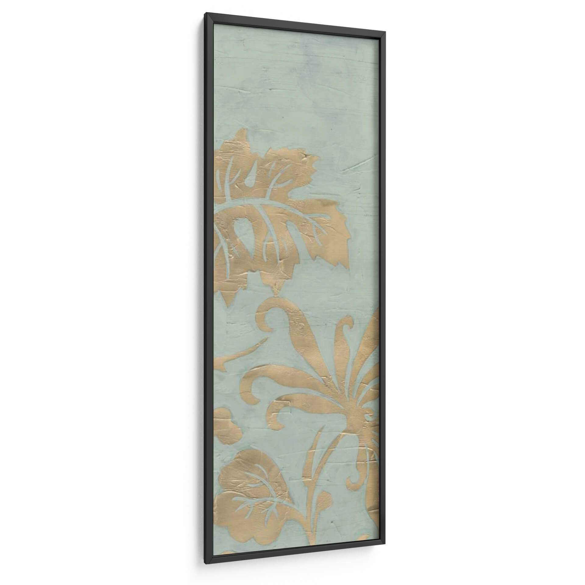 Transforma tu espacio con el cautivador cuadro decorativo 'Gracioso Jardín Tríptico I' de June Erica Vess. Esta obra de arte presenta un delicado patrón floral en tonos dorados sobre un sereno fondo azul verdoso, evoca una sensación de elegancia atemporal y sofisticación natural. Los intrincados detalles de las hojas y las volutas florales, aplicados con una textura sutil que imita la acuarela o el estuco, crean profundidad y dimensión, invitando a la contemplación. La paleta de colores, suave y armoniosa, aporta una atmósfera de calma y serenidad, ideal para cualquier rincón que busque un toque de tranquilidad y belleza. Su formato vertical y su diseño estilo damasco lo convierten en una pieza versátil, perfecta para realzar salones, dormitorios o incluso pasillos. Este cuadro decorativo no solo embellece tu hogar, sino que también añade una narrativa visual sutil, fusionando elementos botánicos con un diseño moderno. Es una elección excepcional para quienes aprecian el arte contemporáneo con un aire clásico y buscan piezas que inspiren paz y bienestar en su entorno diario.