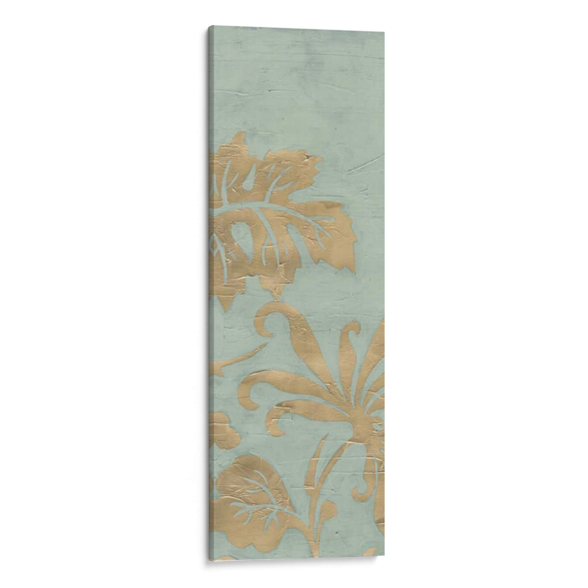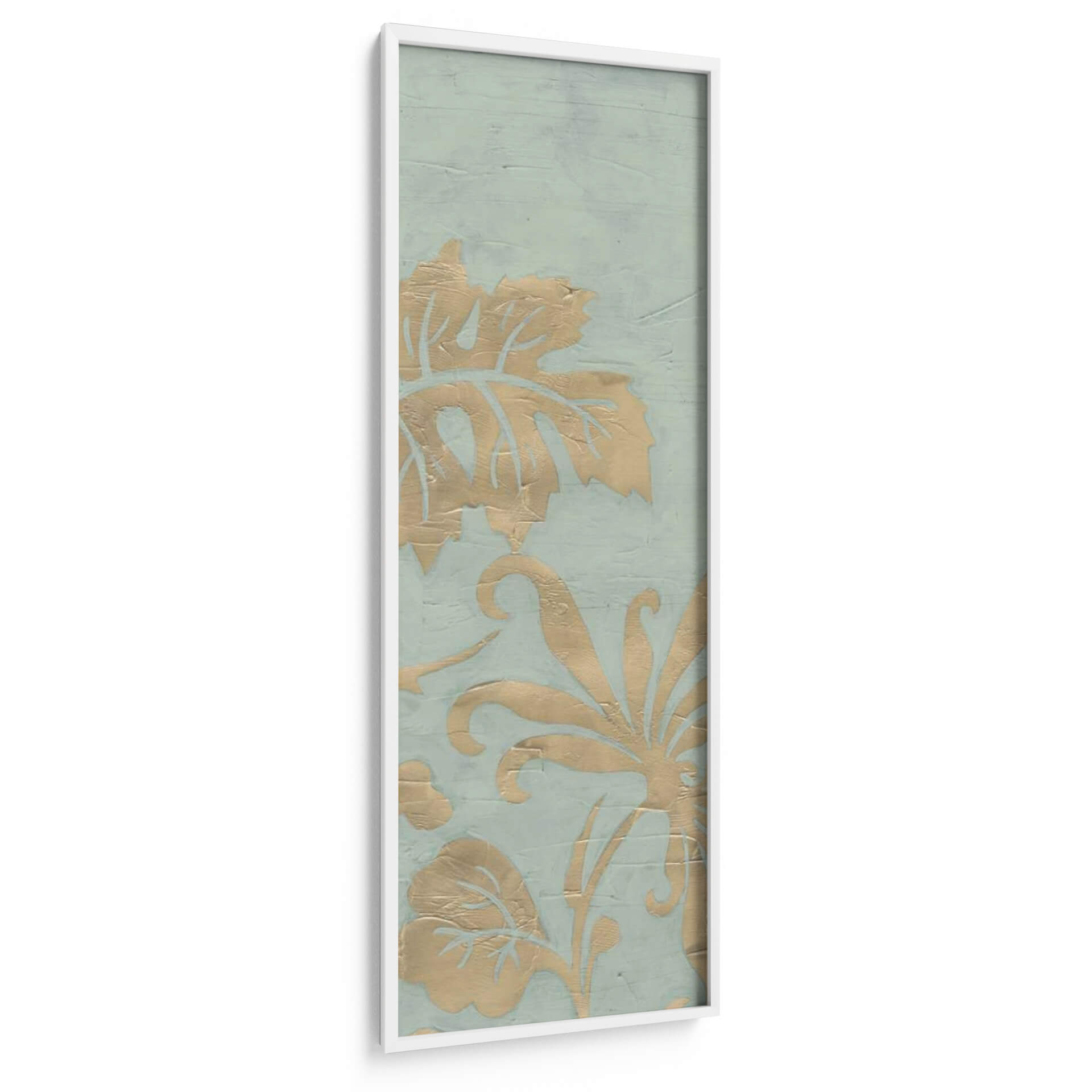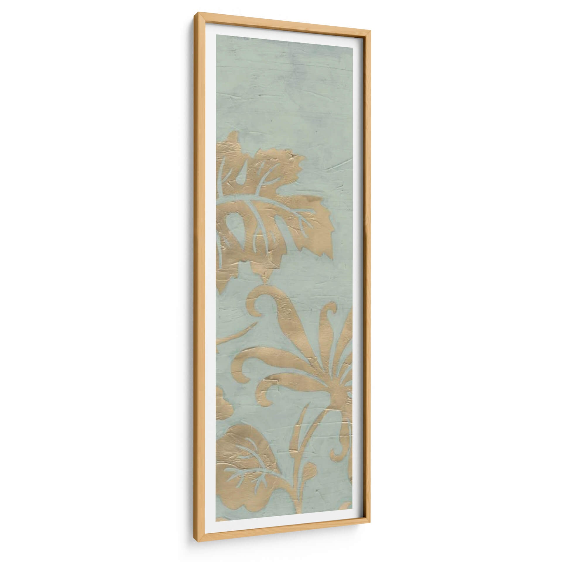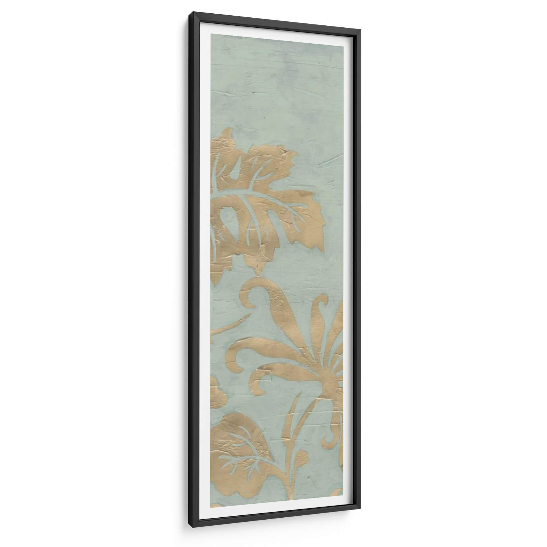 Transforma tu espacio con el cautivador cuadro decorativo 'Gracioso Jardín Tríptico I' de June Erica Vess. Esta obra de arte presenta un delicado patrón floral en tonos dorados sobre un sereno fondo azul verdoso, evoca una sensación de elegancia atemporal y sofisticación natural. Los intrincados detalles de las hojas y las volutas florales, aplicados con una textura sutil que imita la acuarela o el estuco, crean profundidad y dimensión, invitando a la contemplación. La paleta de colores, suave y armoniosa, aporta una atmósfera de calma y serenidad, ideal para cualquier rincón que busque un toque de tranquilidad y belleza. Su formato vertical y su diseño estilo damasco lo convierten en una pieza versátil, perfecta para realzar salones, dormitorios o incluso pasillos. Este cuadro decorativo no solo embellece tu hogar, sino que también añade una narrativa visual sutil, fusionando elementos botánicos con un diseño moderno. Es una elección excepcional para quienes aprecian el arte contemporáneo con un aire clásico y buscan piezas que inspiren paz y bienestar en su entorno diario.