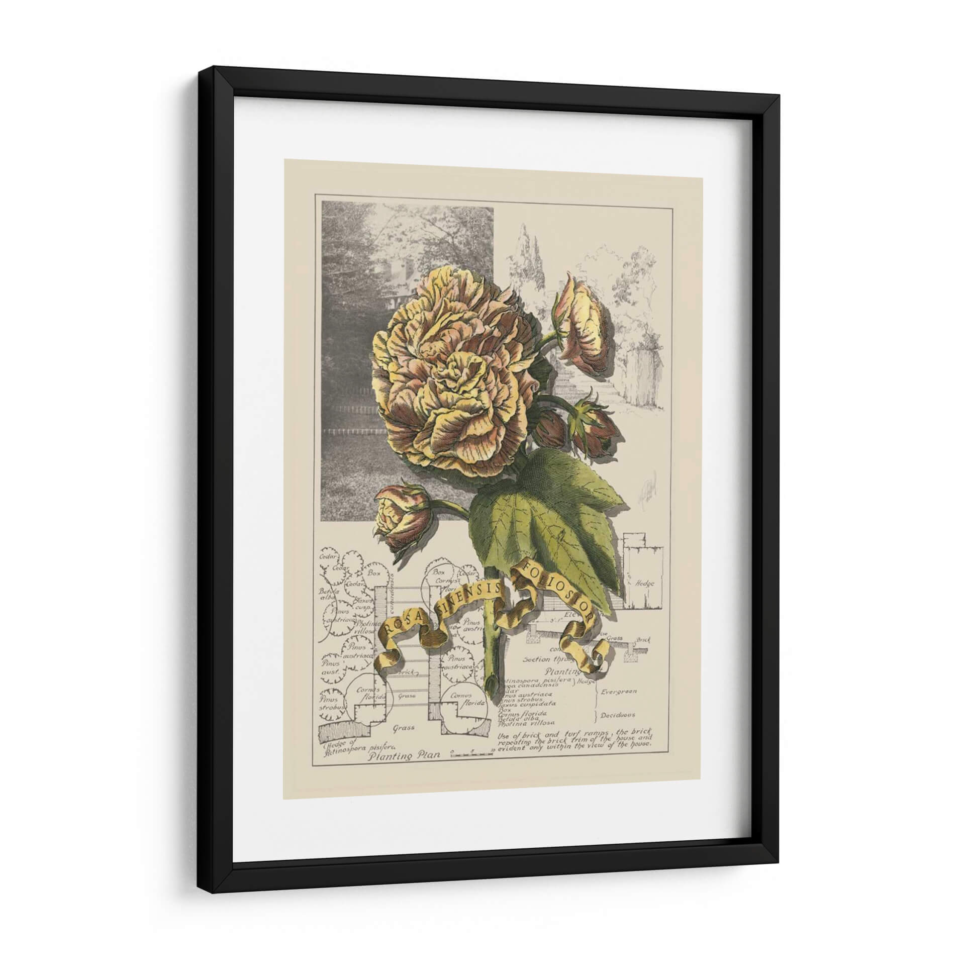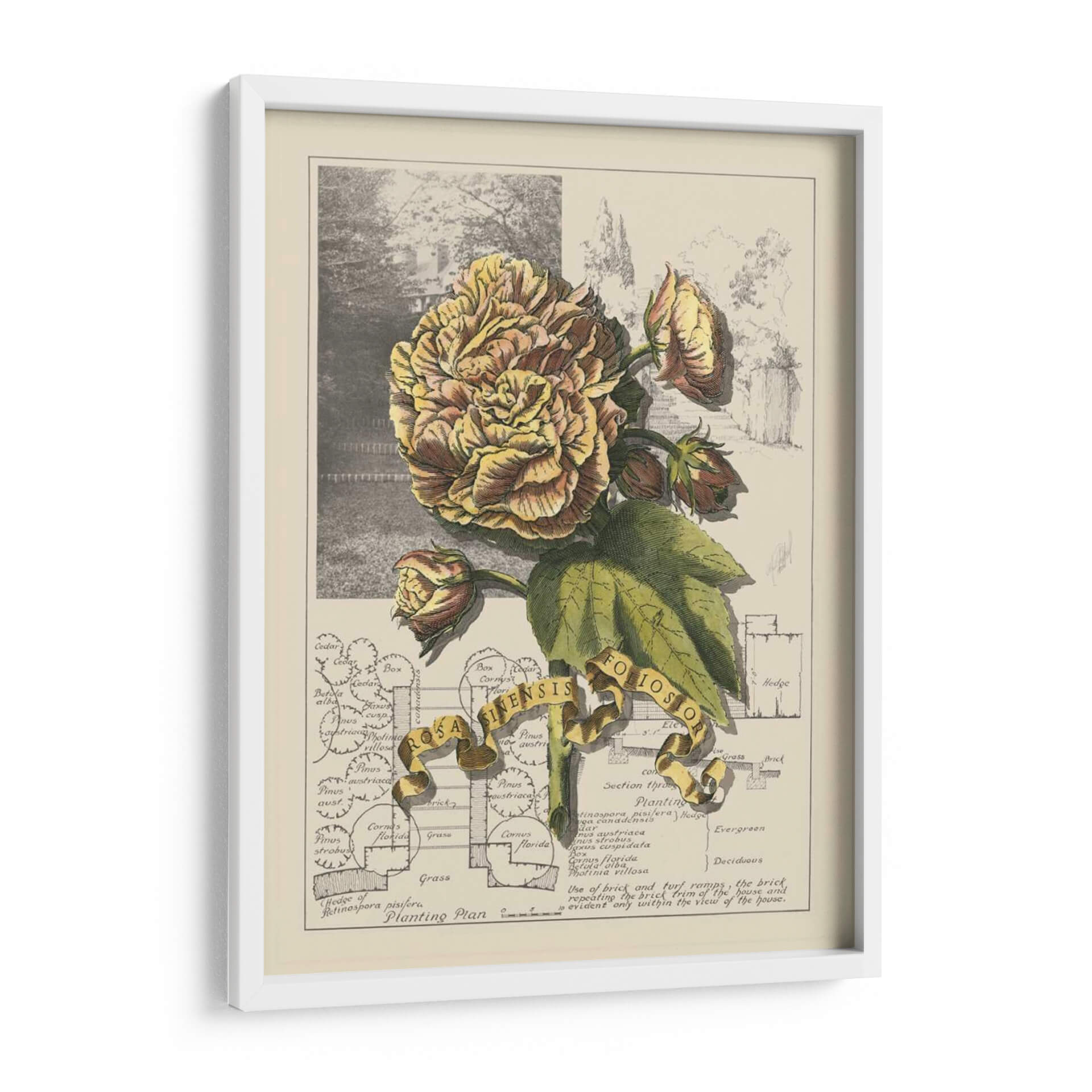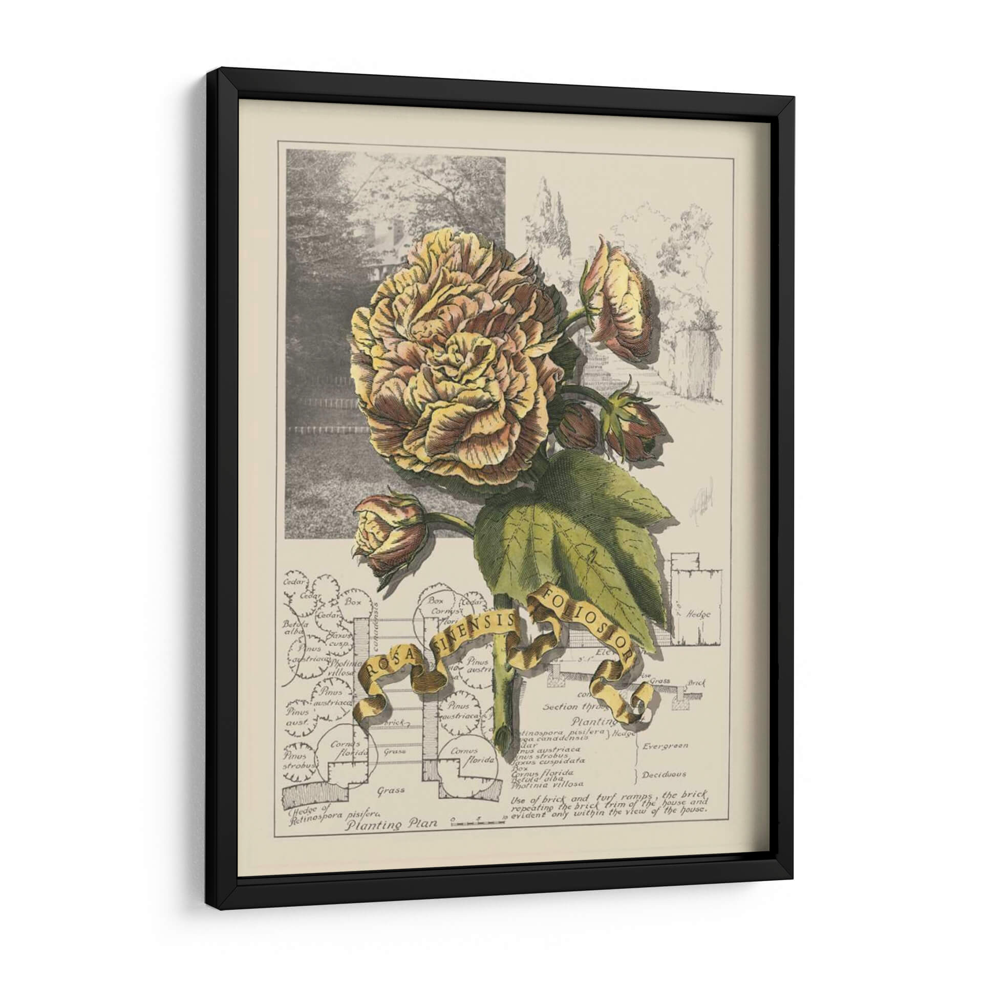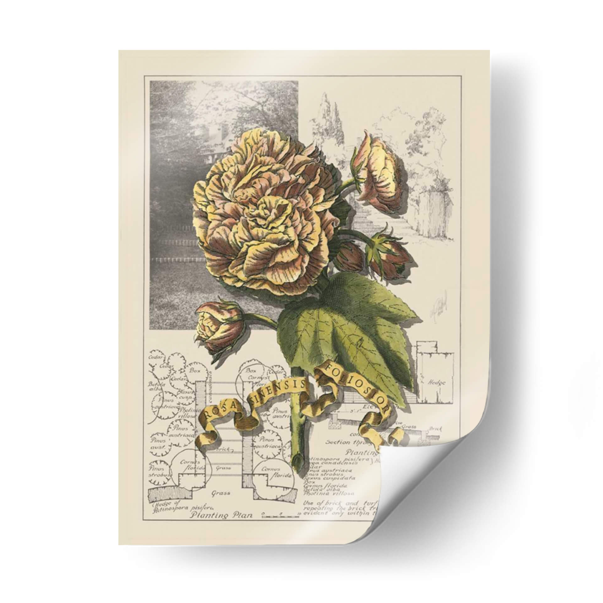 Sumérgete en la delicadeza botánica con "Jardín En Junio II", una obra de arte que captura la opulencia de una flor exuberante en plena floración. La pieza presenta una detallada ilustración de una rosa de tonos dorados y rosados, rodeada de sus capullos y hojas verdes, todo ello sobre un fondo que evoca un jardín histórico y un plano de plantación. La paleta de colores, dominada por amarillos cálidos, marrones terrosos y verdes naturales, crea una atmósfera de serenidad y nostalgia, perfecta para añadir un toque de elegancia atemporal a cualquier espacio. El estilo de ilustración botánica, con sus líneas precisas y sombreado meticuloso, aporta un aire de sofisticación y conocimiento. Esta obra es ideal para crear un rincón de lectura acogedor, embellecer una sala de estar clásica o dar vida a un estudio con un toque de la naturaleza y la historia. "Jardín En Junio II" no es solo un cuadro, es una ventana a la belleza perdurable de la botánica y el diseño paisajístico, invitando a la contemplación y al aprecio por el detalle.