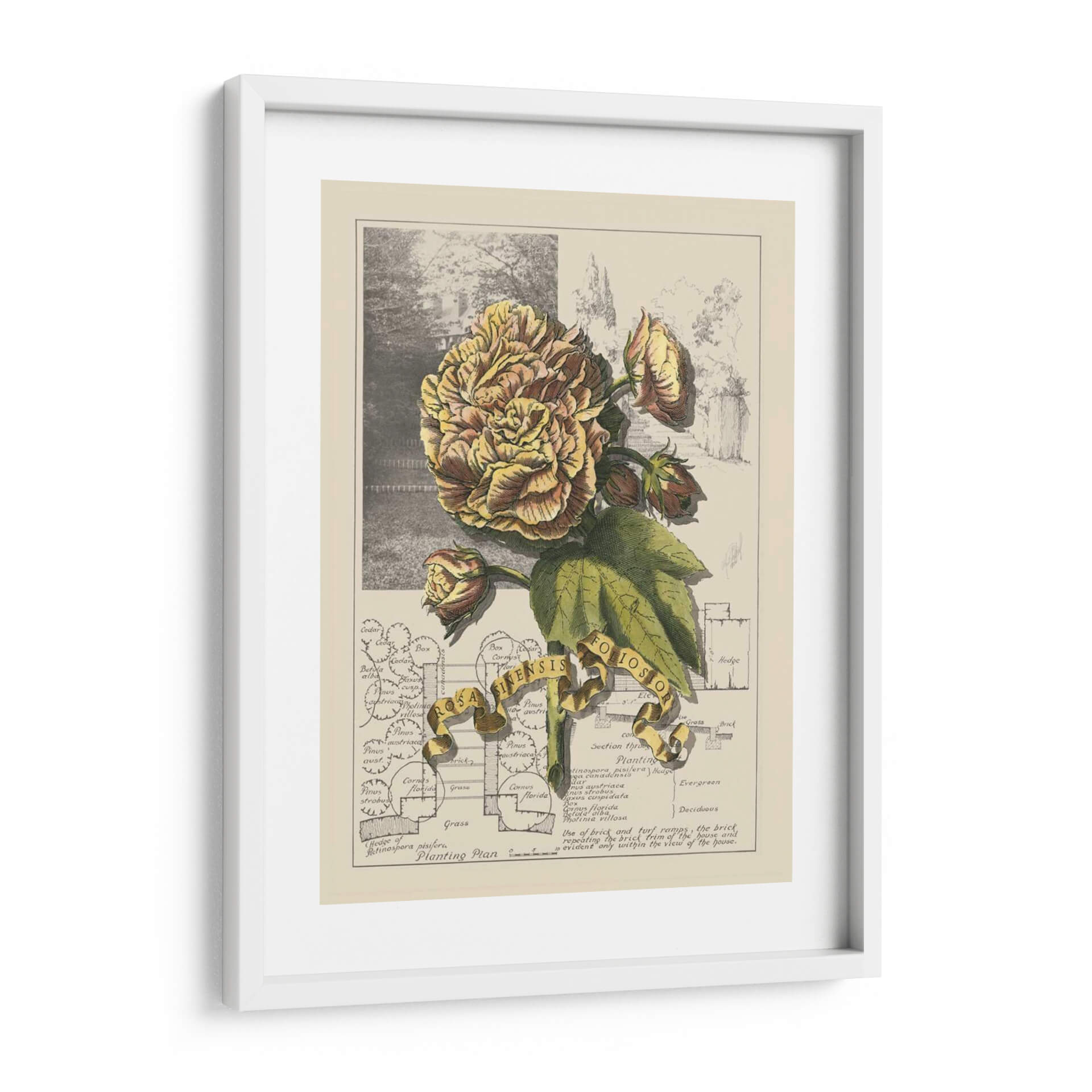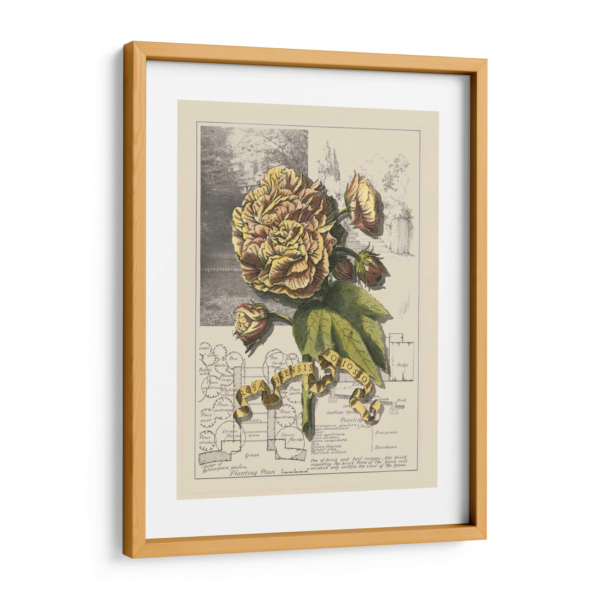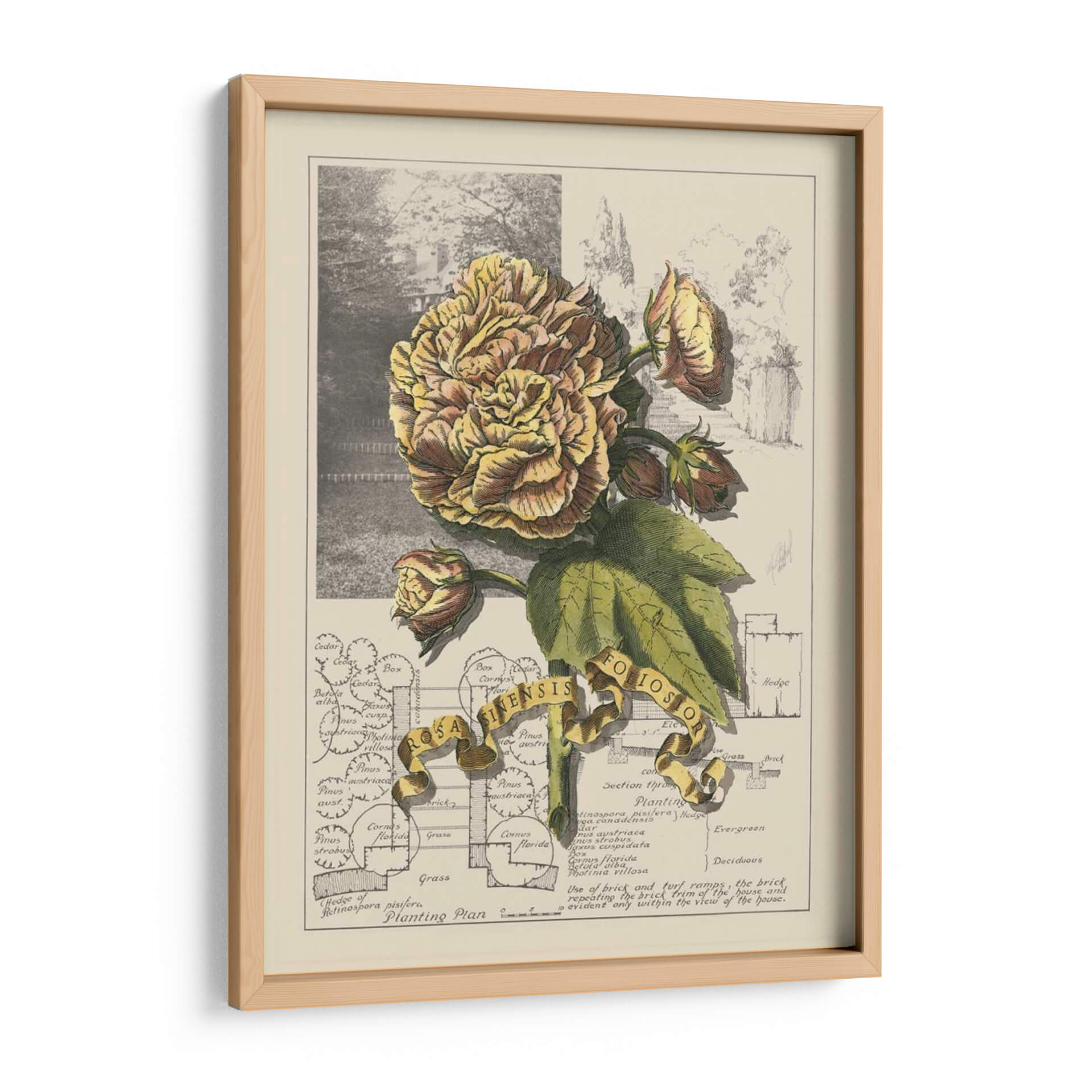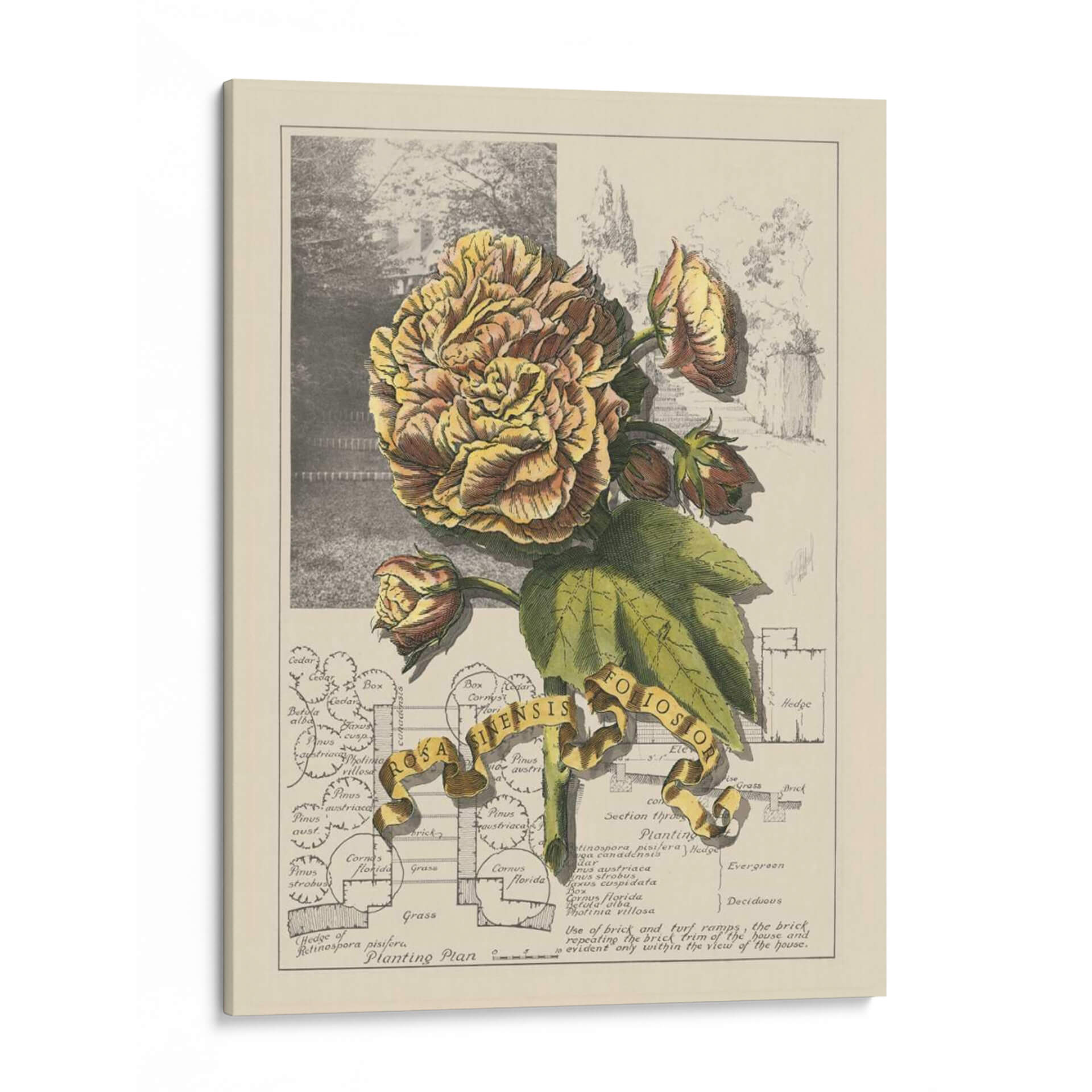 Sumérgete en la delicadeza botánica con "Jardín En Junio II", una obra de arte que captura la opulencia de una flor exuberante en plena floración. La pieza presenta una detallada ilustración de una rosa de tonos dorados y rosados, rodeada de sus capullos y hojas verdes, todo ello sobre un fondo que evoca un jardín histórico y un plano de plantación. La paleta de colores, dominada por amarillos cálidos, marrones terrosos y verdes naturales, crea una atmósfera de serenidad y nostalgia, perfecta para añadir un toque de elegancia atemporal a cualquier espacio. El estilo de ilustración botánica, con sus líneas precisas y sombreado meticuloso, aporta un aire de sofisticación y conocimiento. Esta obra es ideal para crear un rincón de lectura acogedor, embellecer una sala de estar clásica o dar vida a un estudio con un toque de la naturaleza y la historia. "Jardín En Junio II" no es solo un cuadro, es una ventana a la belleza perdurable de la botánica y el diseño paisajístico, invitando a la contemplación y al aprecio por el detalle.