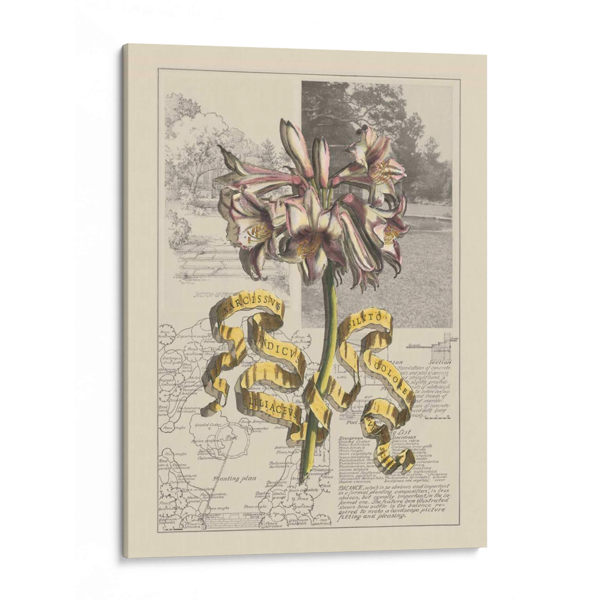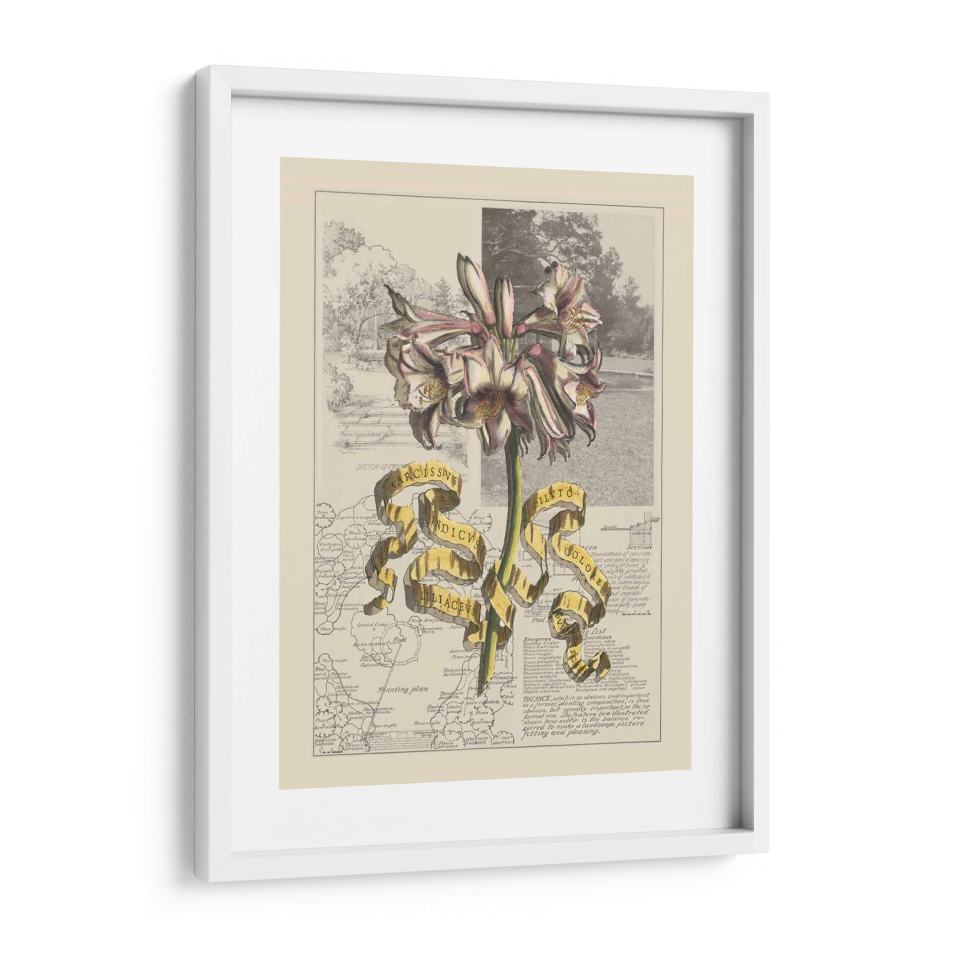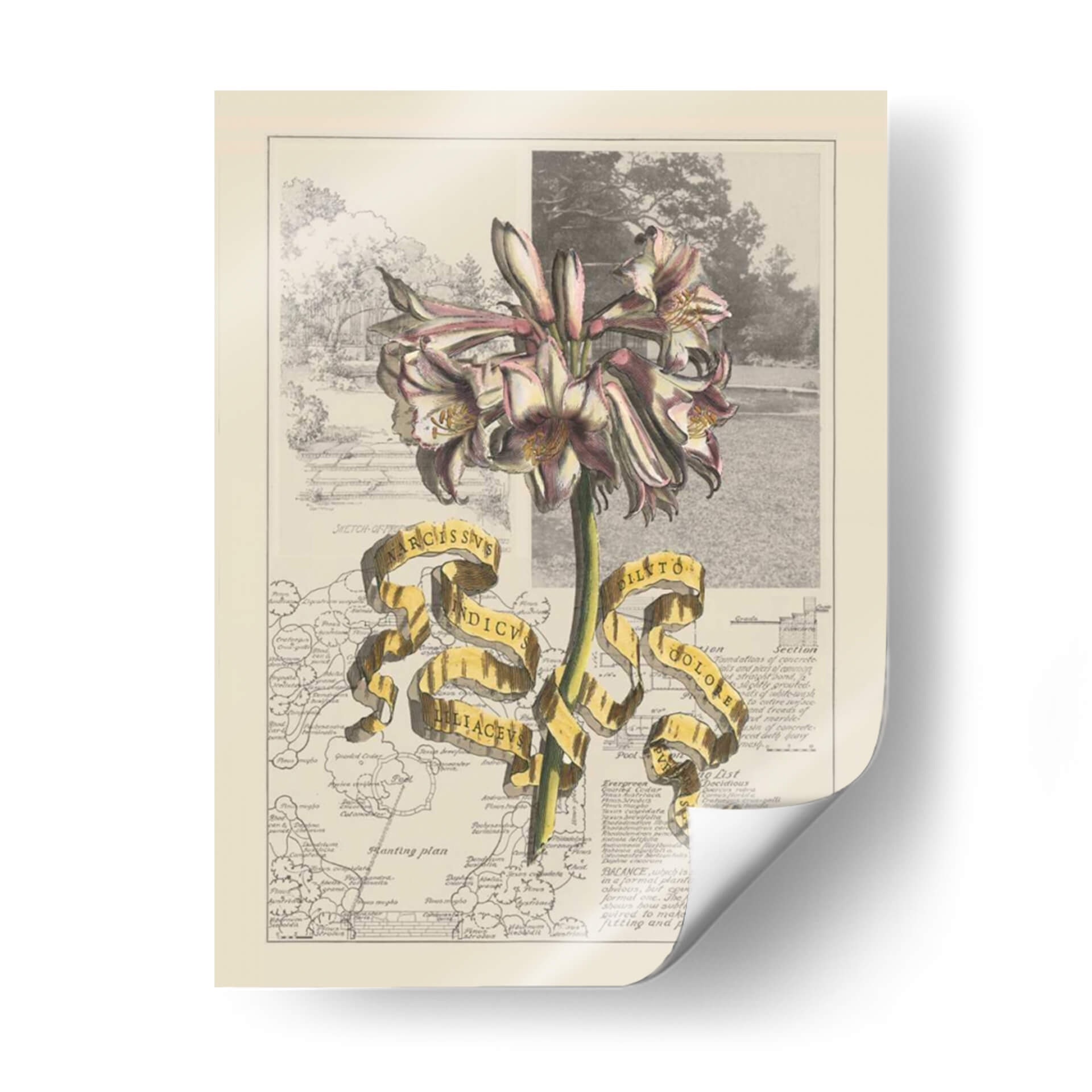 Embellece tu espacio con el 'Jardín en Junio IV', una obra de arte digital que fusiona la delicadeza botánica con un toque de misterio cartográfico. Este cuadro decorativo presenta una impresionante flor en primer plano, con pétalos que varían entre el blanco, rosa pálido y toques de borgoña, resaltando su estructura detallada y elegante. Detrás de la flor, se despliega un collage visual que combina un boceto arquitectónico de un jardín clásico con fragmentos de mapas antiguos y textos técnicos. La paleta de colores, dominada por tonos tierra, sepia y toques de verde y blanco, crea una atmósfera nostálgica y erudita. La cinta dorada que atraviesa la composición añade un elemento de sorpresa y jerarquía, conteniendo inscripciones latinas que evocan un sentido de descubrimiento científico y botánico. Esta pieza es ideal para añadir un punto de interés intelectual y estético a tu estudio, biblioteca o salón, invitando a la contemplación y al aprecio por la belleza natural y la historia. Transforma tus paredes en una ventana a un mundo de ciencia y arte fusionados, aportando sofisticación y un encanto vintage a tu decoración contemporánea.