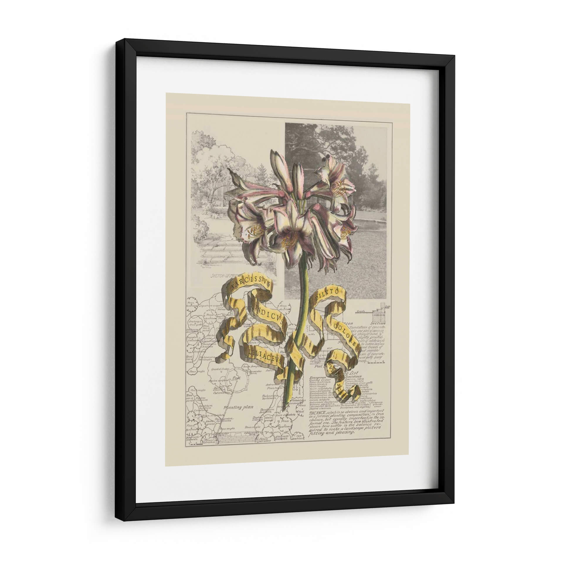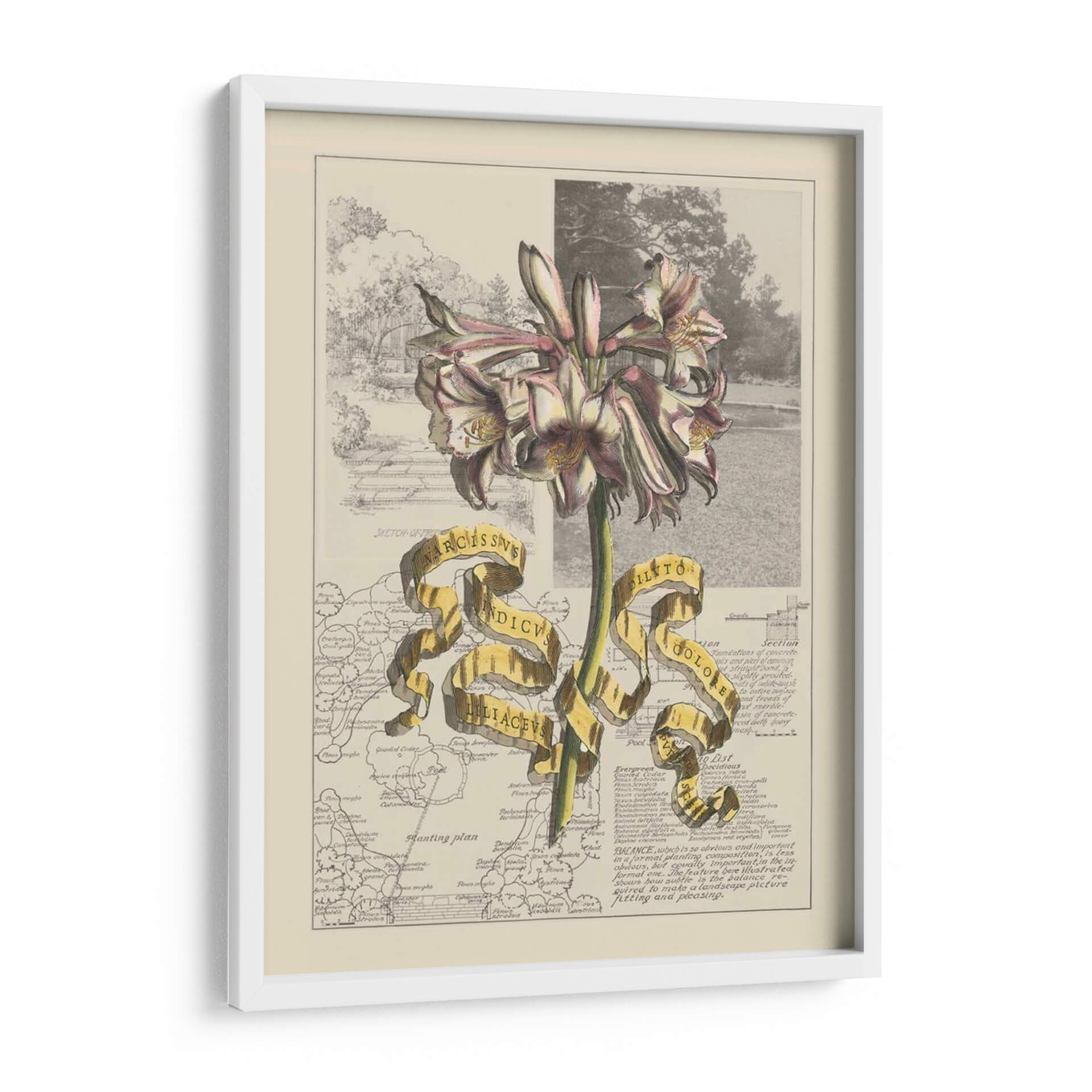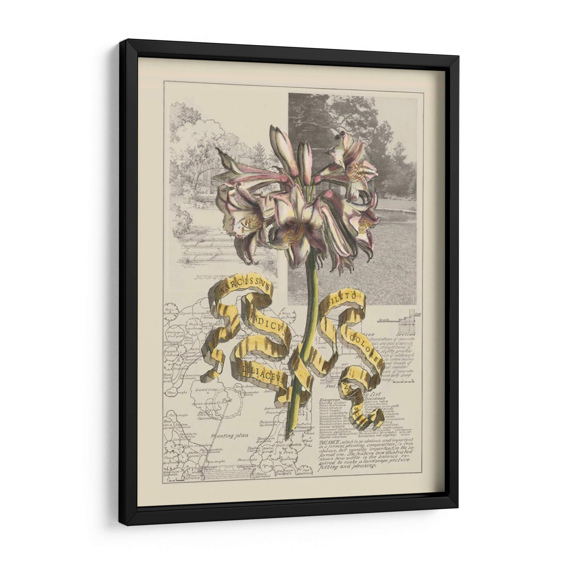 Embellece tu espacio con el 'Jardín en Junio IV', una obra de arte digital que fusiona la delicadeza botánica con un toque de misterio cartográfico. Este cuadro decorativo presenta una impresionante flor en primer plano, con pétalos que varían entre el blanco, rosa pálido y toques de borgoña, resaltando su estructura detallada y elegante. Detrás de la flor, se despliega un collage visual que combina un boceto arquitectónico de un jardín clásico con fragmentos de mapas antiguos y textos técnicos. La paleta de colores, dominada por tonos tierra, sepia y toques de verde y blanco, crea una atmósfera nostálgica y erudita. La cinta dorada que atraviesa la composición añade un elemento de sorpresa y jerarquía, conteniendo inscripciones latinas que evocan un sentido de descubrimiento científico y botánico. Esta pieza es ideal para añadir un punto de interés intelectual y estético a tu estudio, biblioteca o salón, invitando a la contemplación y al aprecio por la belleza natural y la historia. Transforma tus paredes en una ventana a un mundo de ciencia y arte fusionados, aportando sofisticación y un encanto vintage a tu decoración contemporánea.