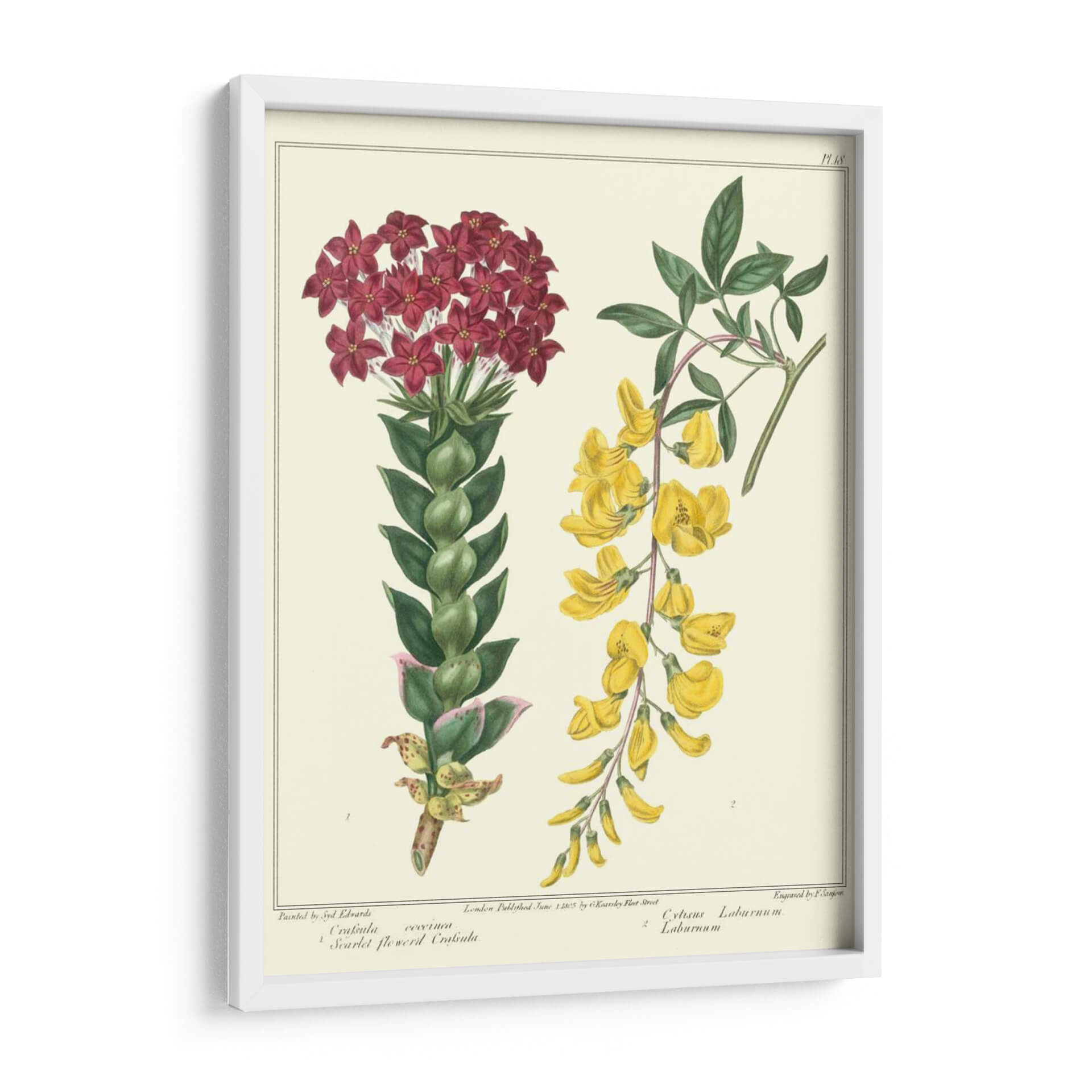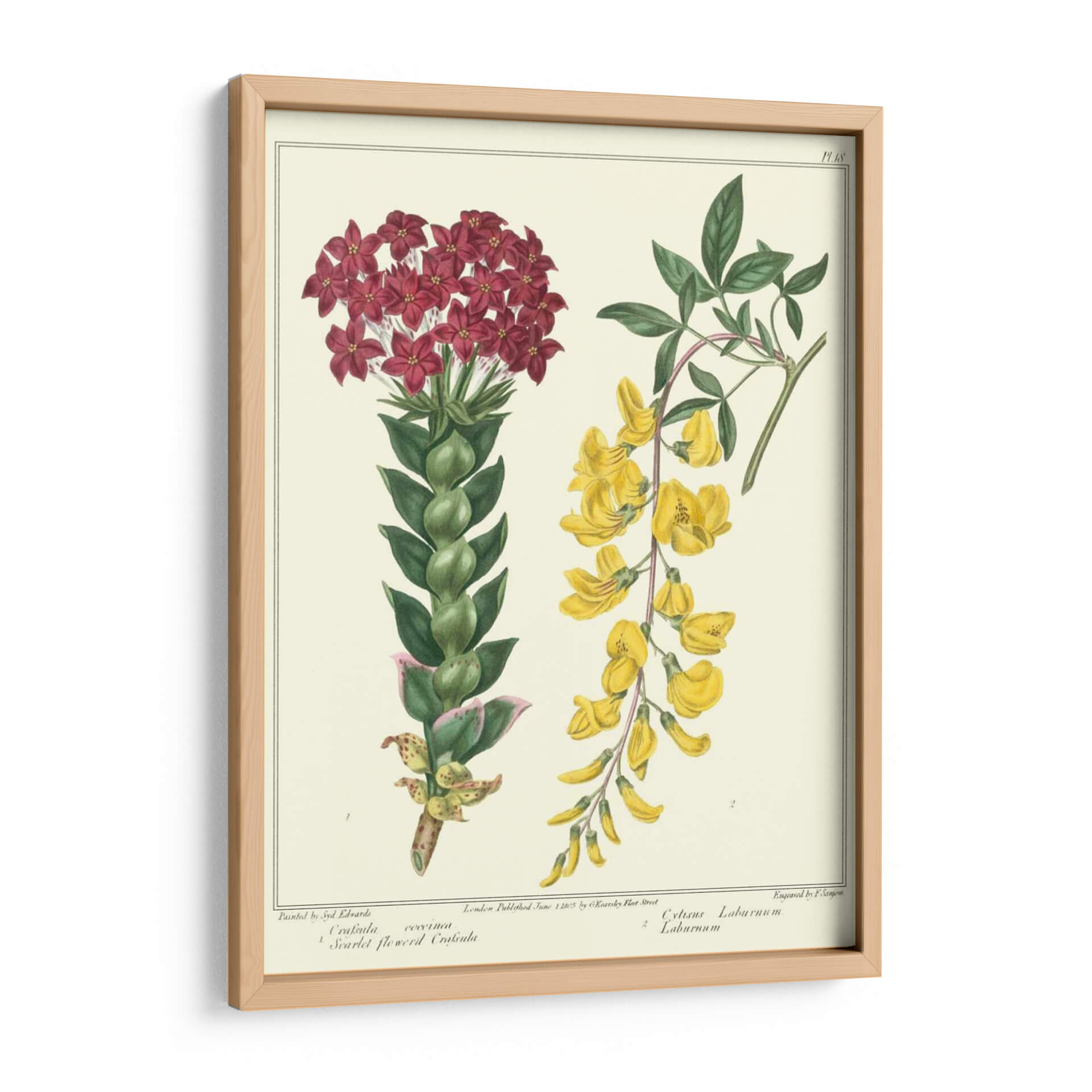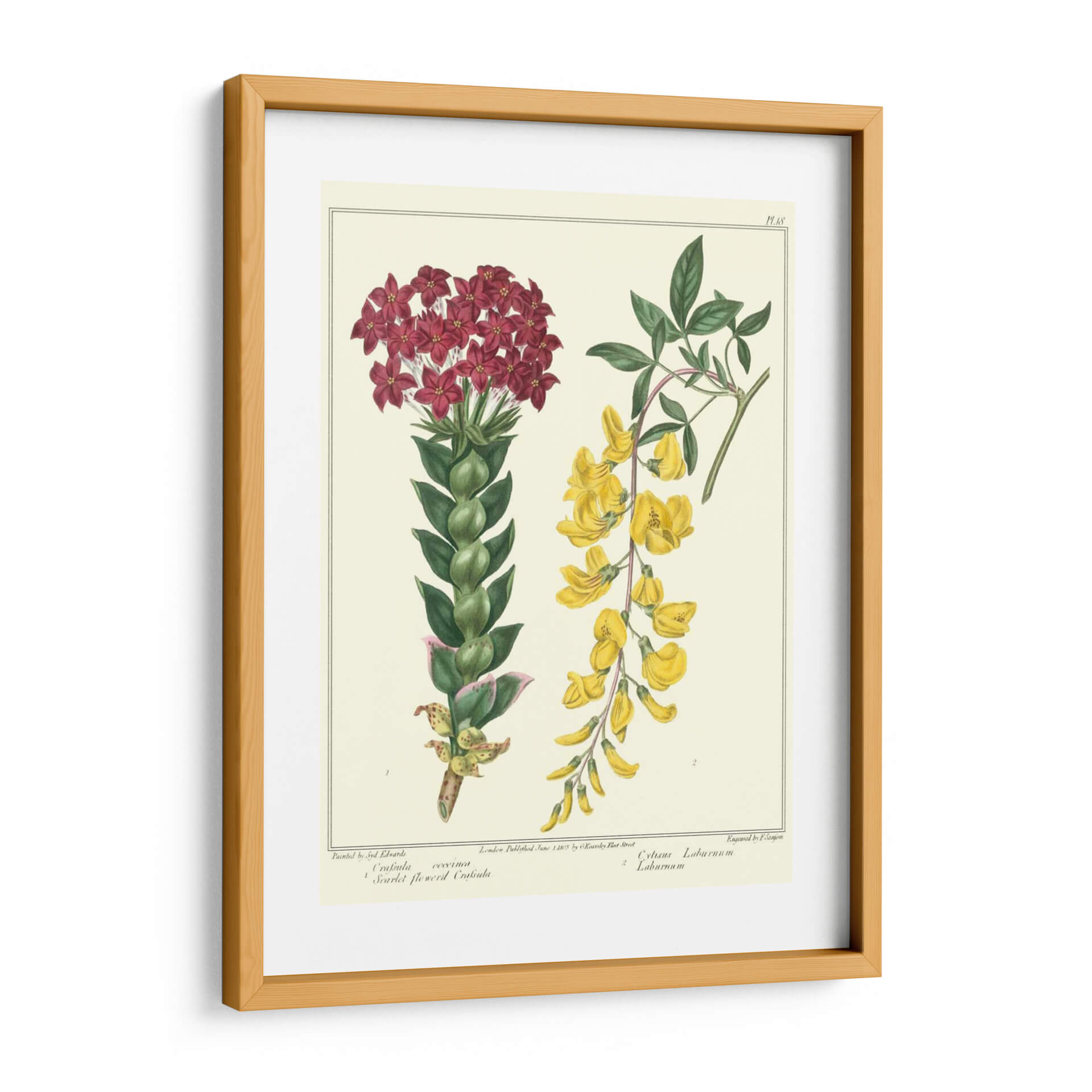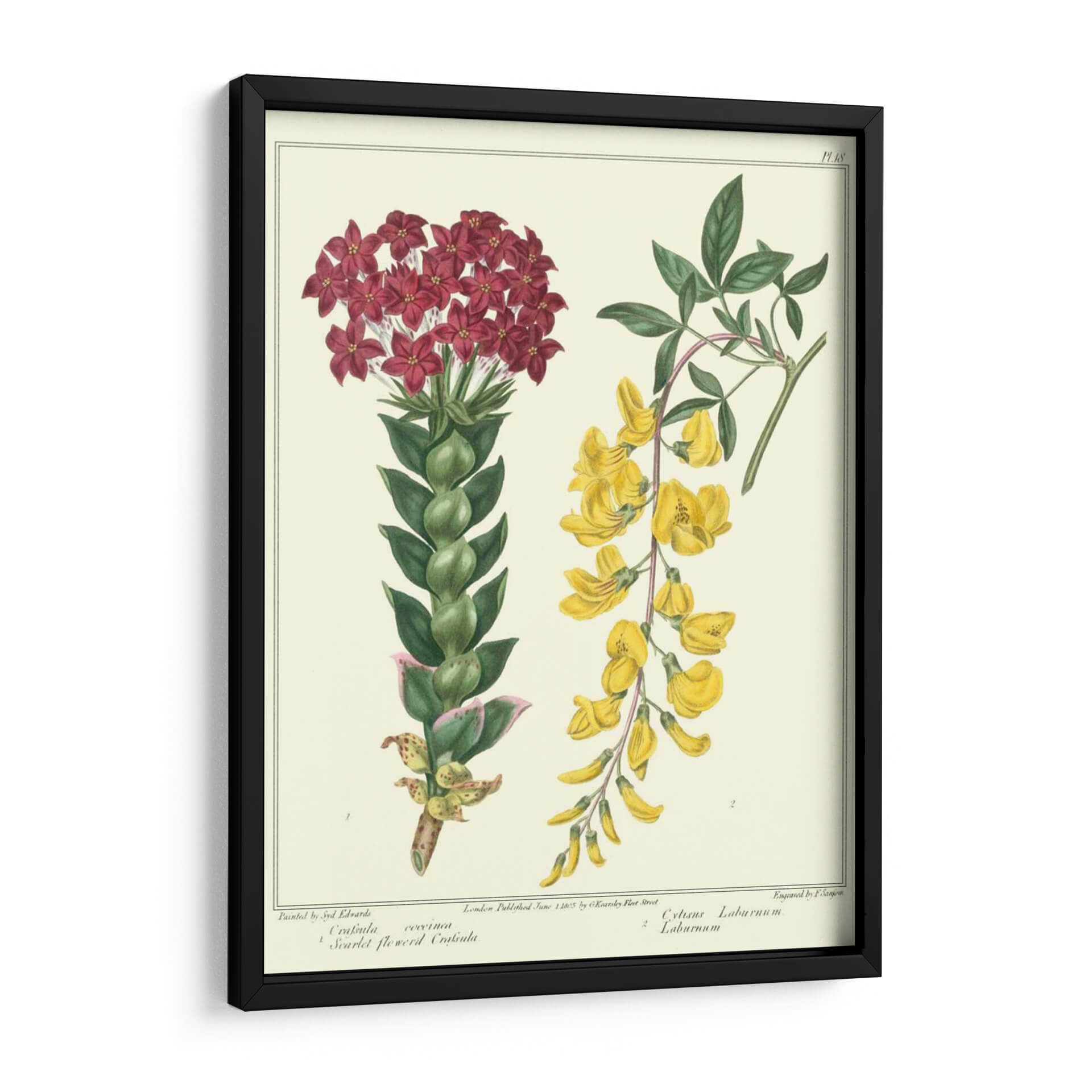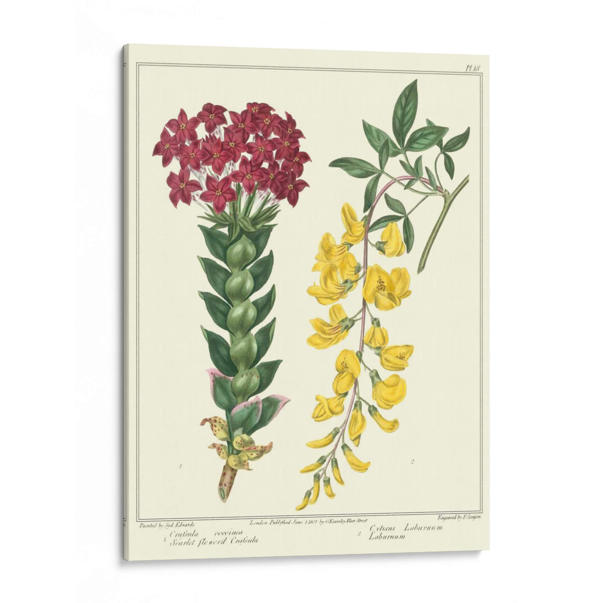 Sumérgete en la delicadeza botánica con este exquisito cuadro decorativo, una obra que celebra la belleza de la naturaleza a través de las detalladas ilustraciones de Sydenham Edwards. Titulada 'Jardineros Deleite V', esta pieza captura la esencia de dos plantas distintas con una precisión y un encanto que transportan al espectador a un jardín sereno. La composición presenta un vibrante racimo de flores rojas intensas sobre un tallo robusto con hojas verdes, contrastando armoniosamente con un delicado ramo de flores amarillas colgantes que aportan una nota de ligereza y alegría. La paleta de colores, dominada por verdes profundos, rojos apasionados y amarillos solares, crea una atmósfera de vitalidad y elegancia natural. Este cuadro decorativo es ideal para añadir un toque de clasicismo y color a cualquier espacio, ya sea un salón, un estudio o un dormitorio. Su estilo, que recuerda a las ilustraciones científicas antiguas, aporta un aire de sofisticación y conocimiento. Invita la serenidad y la exuberancia de la botánica a tu hogar con esta obra de arte que es tanto educativa como estéticamente placentera, un verdadero deleite para los amantes de la naturaleza y el arte.