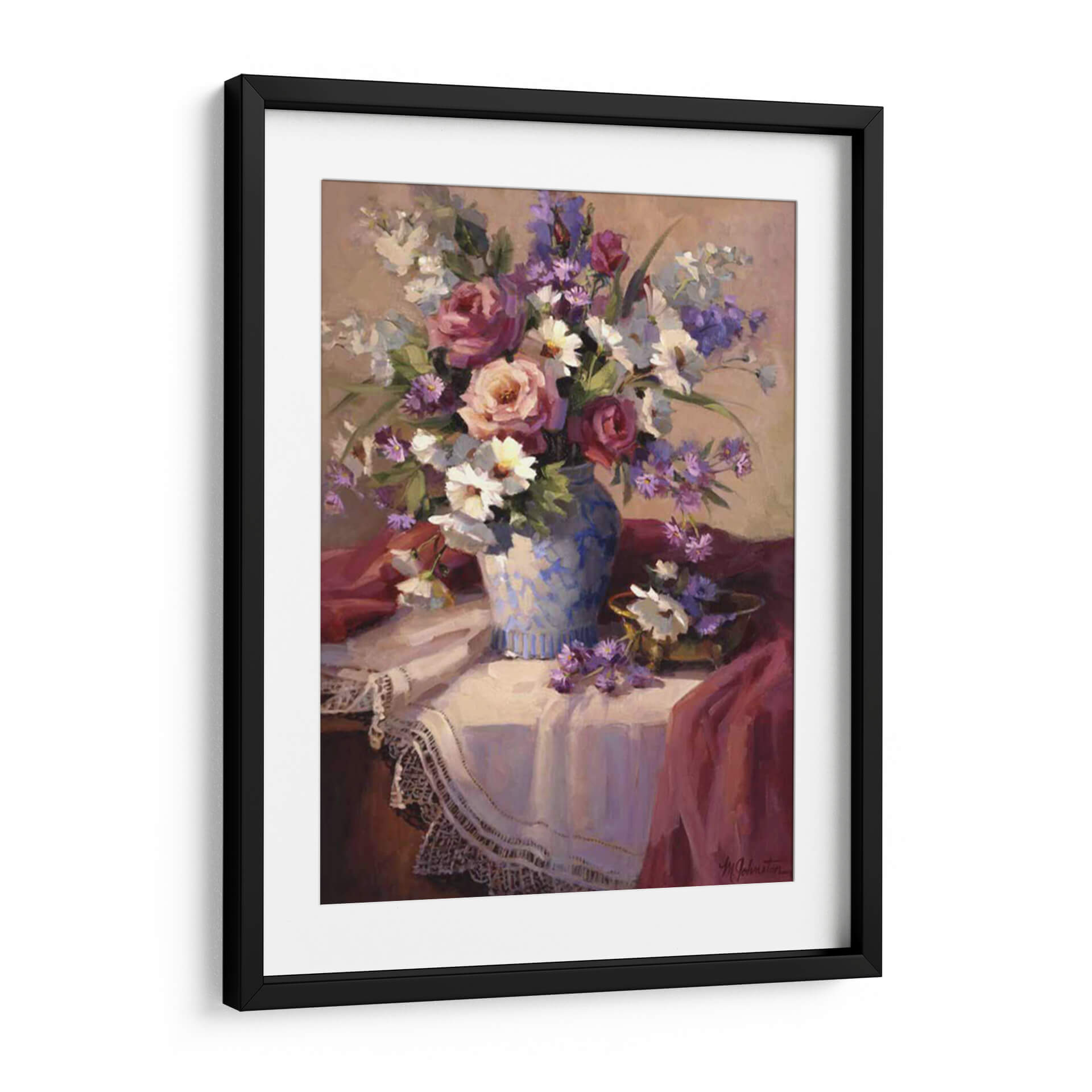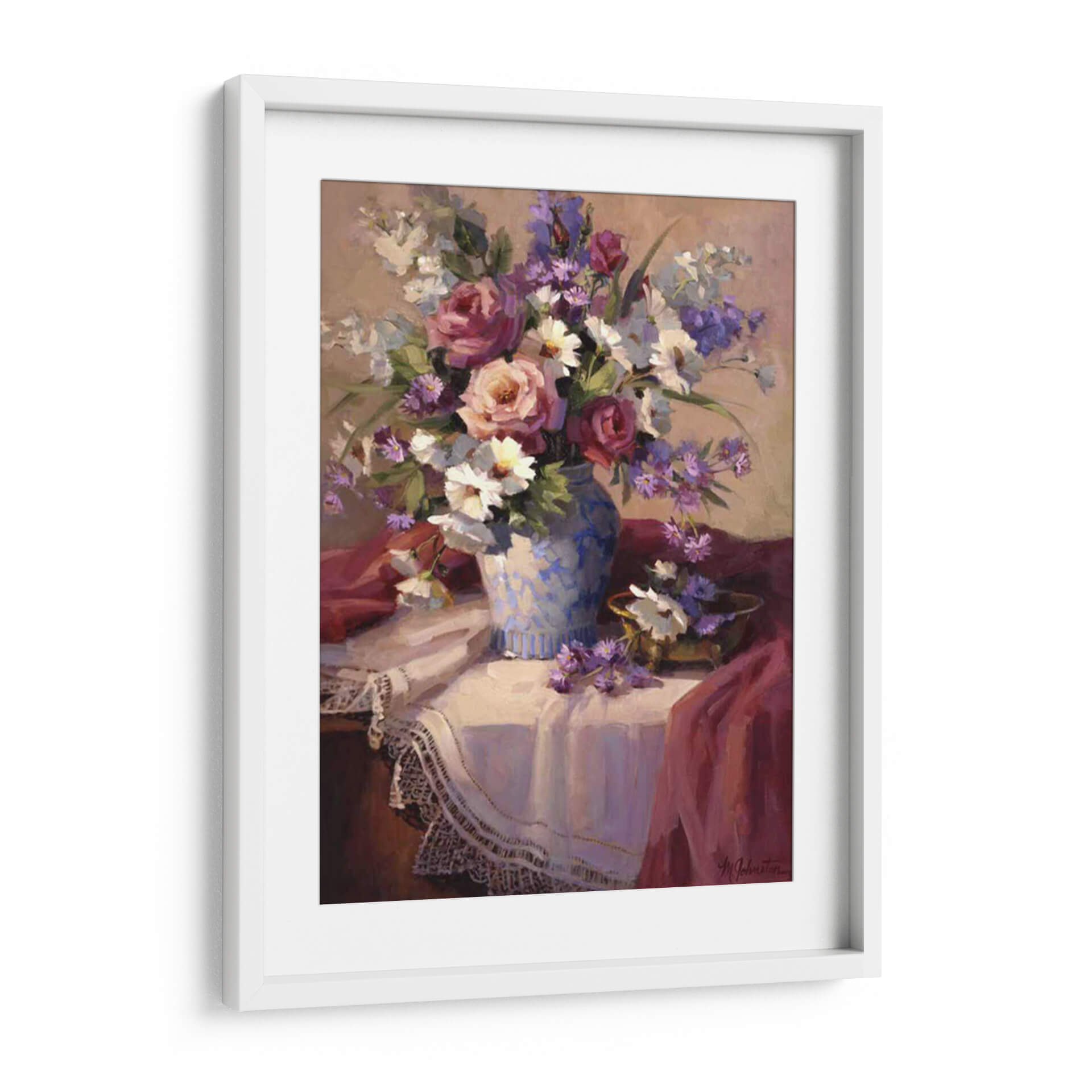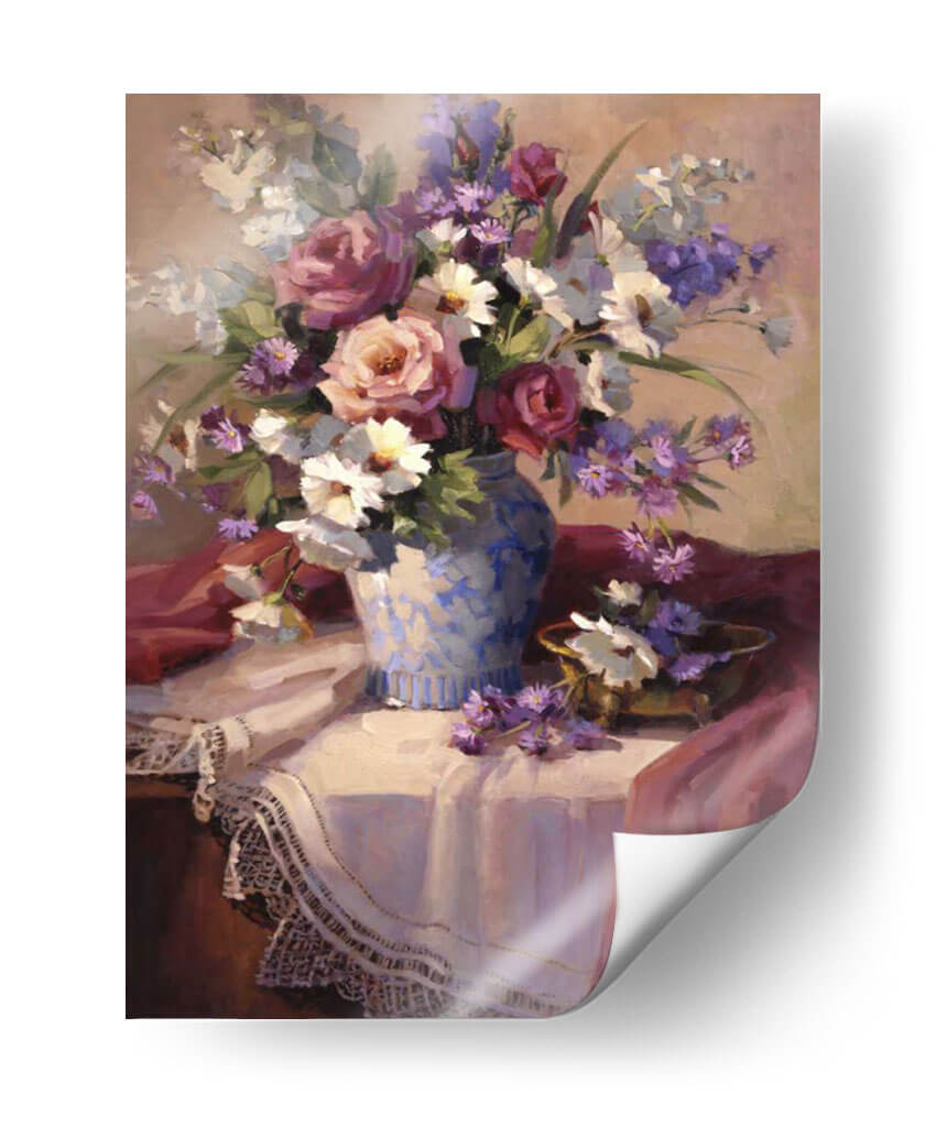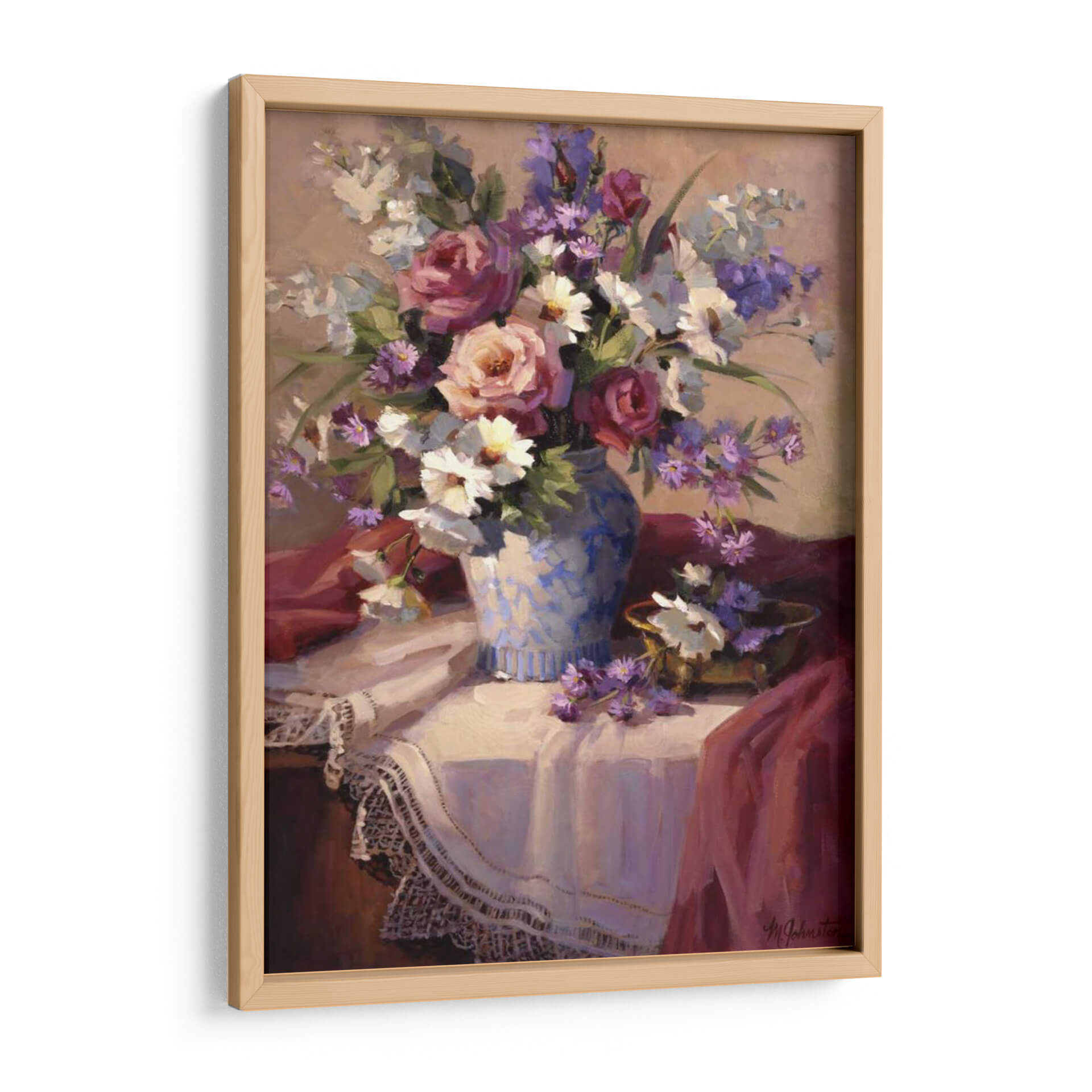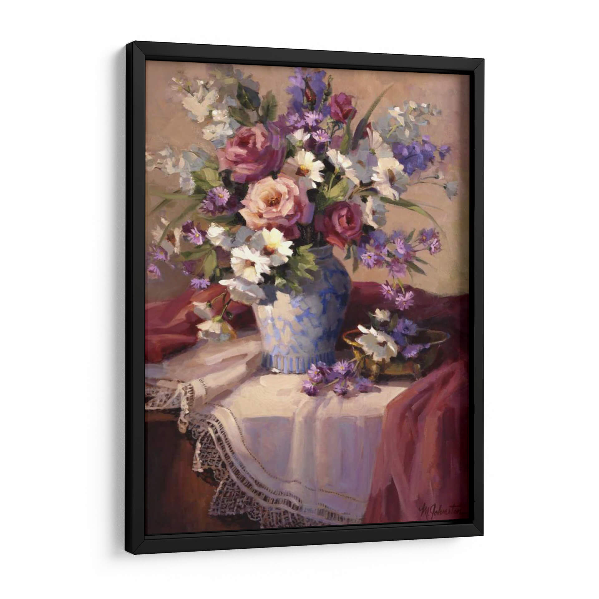 Embárquese en un viaje visual con "Lanzamiento De Primavera" de Maxine Johnston, una obra de arte que captura la efímera belleza de la naturaleza en pleno florecimiento. Este cuadro decorativo presenta un exuberante ramo de flores dispuestas en un jarrón azul con un intrincado diseño, creando un punto focal vibrante y lleno de vida. La paleta de colores, dominada por rosas suaves, blancos puros, violetas profundos y toques de verde, evoca una sensación de alegría y frescura primaveral. Las pinceladas expresivas de Johnston dan textura y profundidad a los pétalos y hojas, invitando al espectador a una contemplación íntima. Un delicado mantel de encaje y una tela de color borgoña complementan la escena, añadiendo un toque de elegancia clásica. Esta pieza es ideal para añadir un estallido de color y sofisticación a cualquier sala de estar, comedor o incluso un dormitorio, transformando el espacio en un oasis de tranquilidad y belleza floral. "Lanzamiento De Primavera" es más que una simple obra de arte; es una celebración de la vida y la renovación, perfecta para aquellos que aprecian el arte detallado y lleno de emociones.