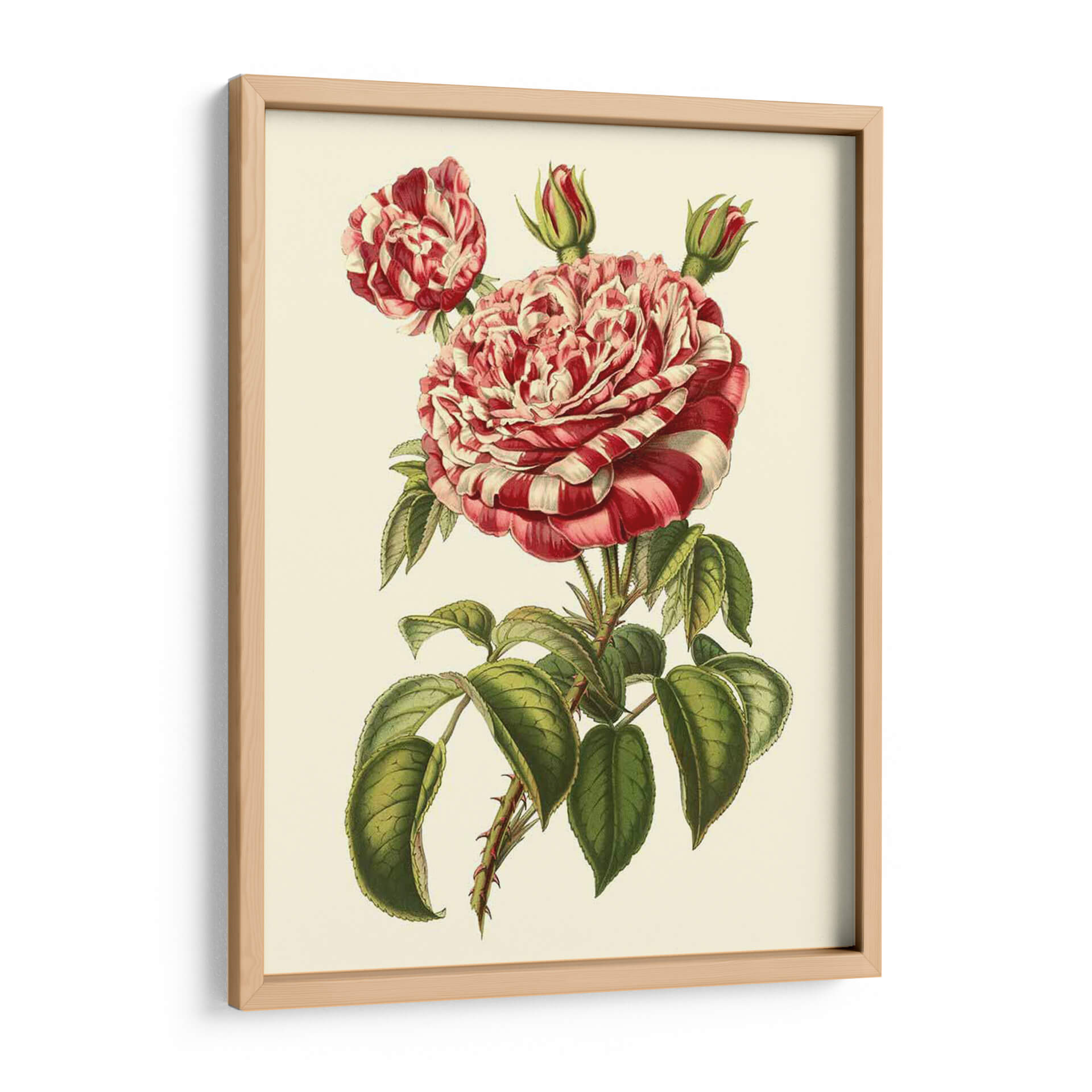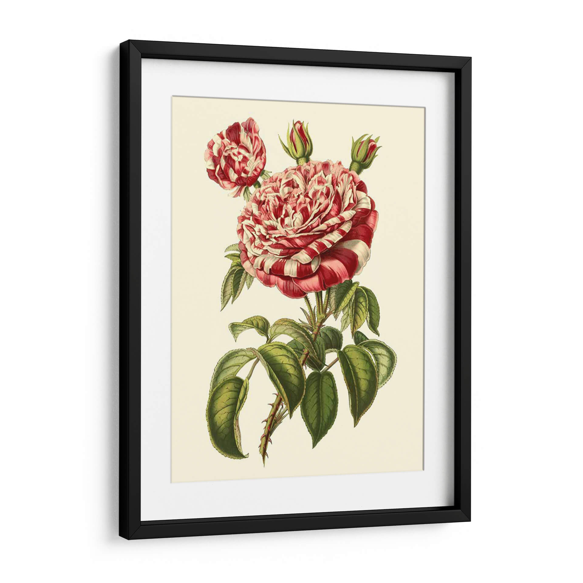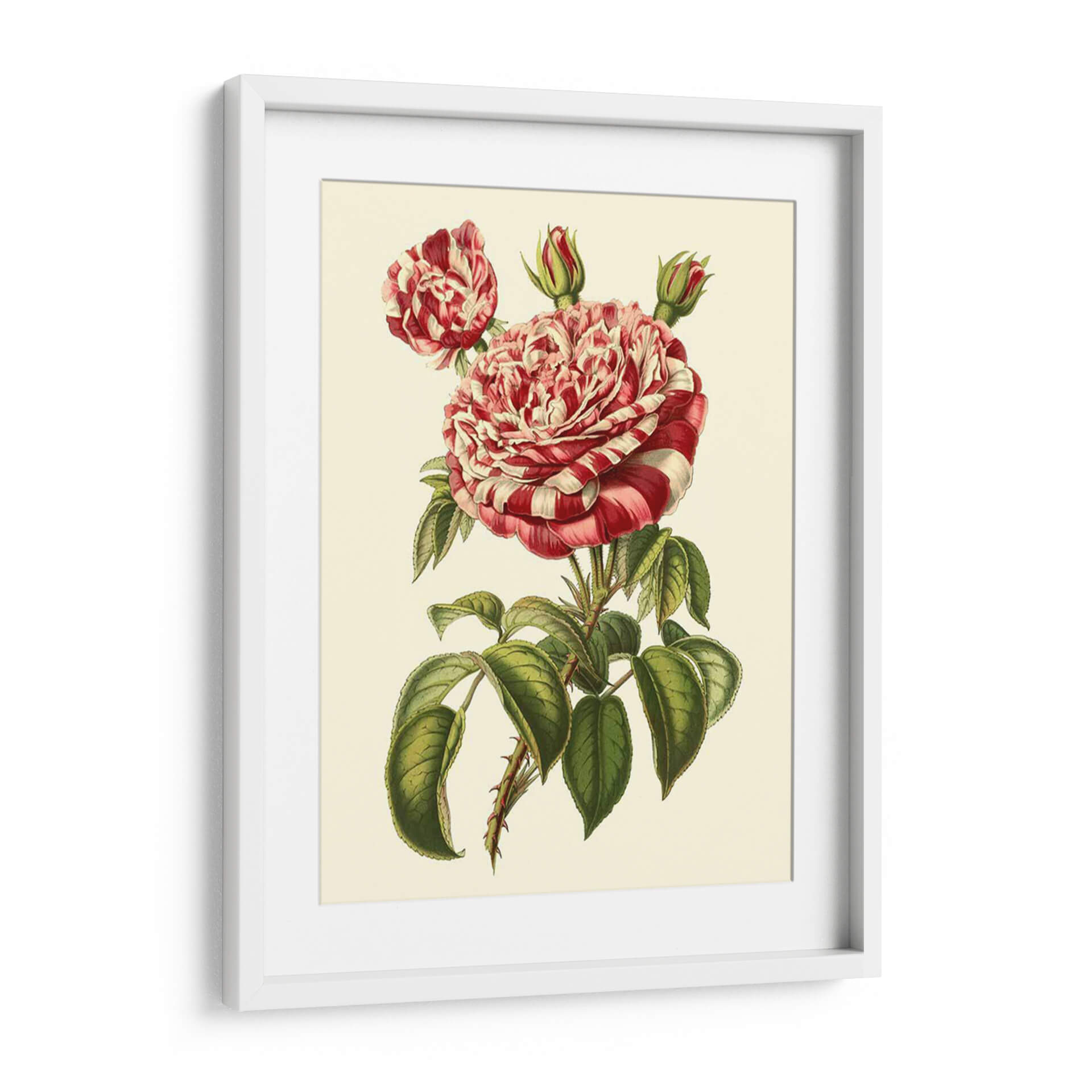 Embellece tu espacio con la exquisita obra de arte "Magnífica Rosa Vi" de Horto Van Houtteano. Este cuadro decorativo captura la delicadeza y la exuberancia de una rosa en plena floración, con pétalos vibrantes que alternan tonos de rojo intenso y blanco cremoso, creando un patrón visualmente cautivador. La composición se centra en el capullo principal, detalladamente renderizado, junto a un capullo secundario y dos brotes prometedores, rodeados por un follaje verde profundo y realista, adornado con espinas sutiles que añaden un toque de carácter orgánico. La paleta de colores, con sus contrastes nítidos y un fondo suave y neutro, permite que la rosa sea la protagonista indiscutible, aportando elegancia y un aire de sofisticación botánica a cualquier habitación. Ideal para añadir un toque de naturaleza y color a salas de estar, dormitorios o estudios, esta pieza evoca una sensación de belleza clásica y atemporal. Su estilo realista y botánico lo convierte en una elección perfecta para quienes aprecian la precisión artística y la maravilla del mundo floral, añadiendo un punto focal de serenidad y encanto natural.