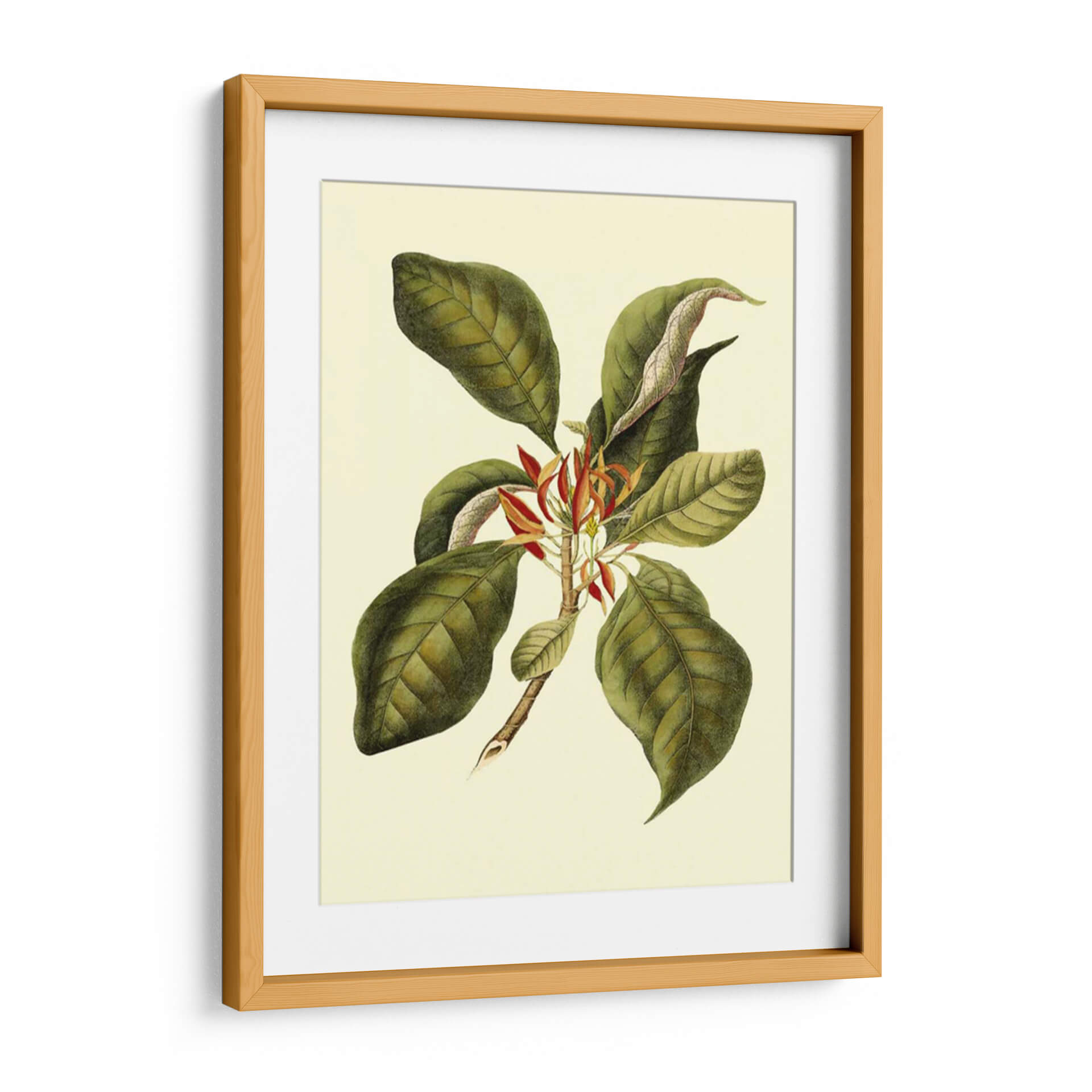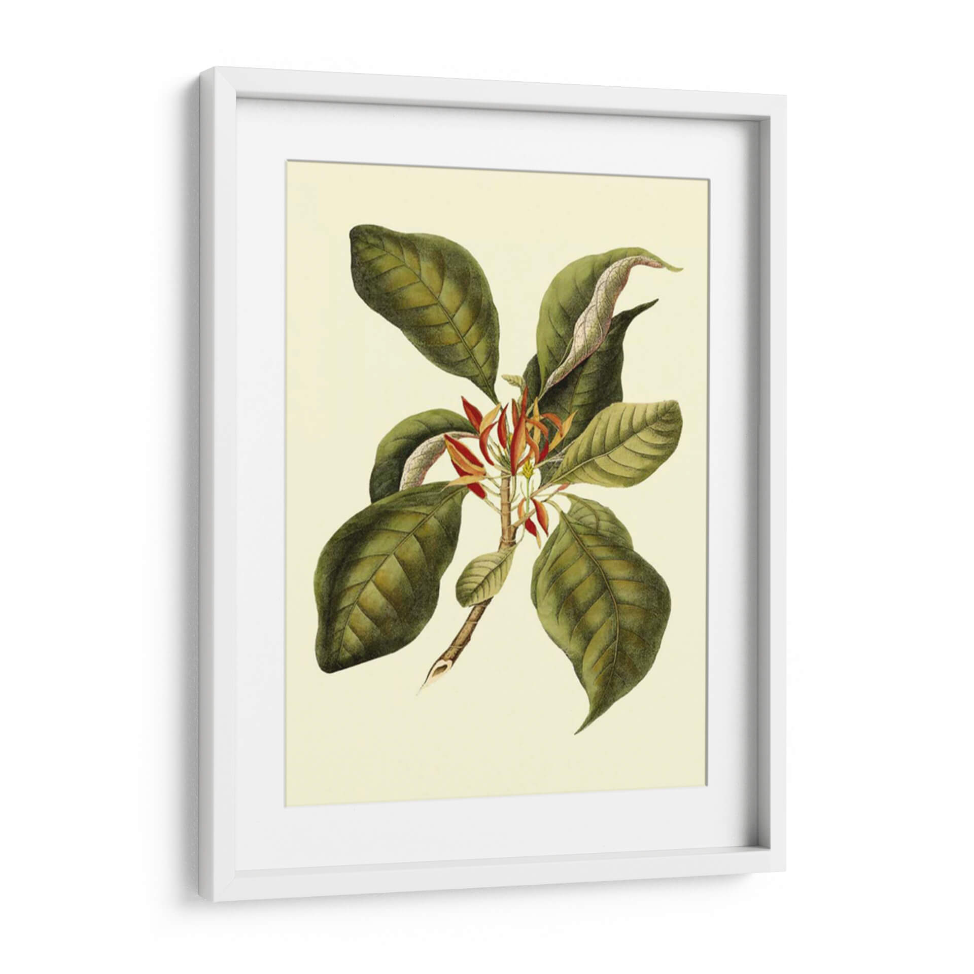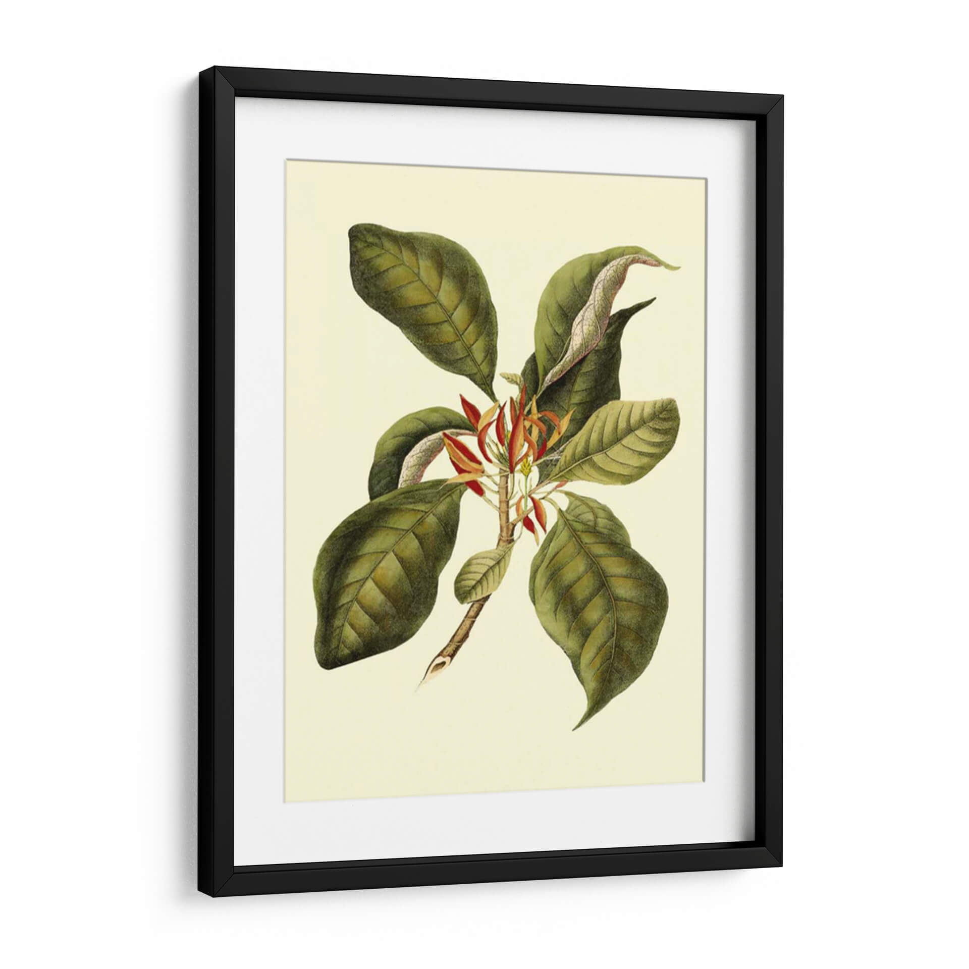 Sumérgete en la elegancia botánica con "Magnificent Follaje III", una obra de arte que captura la exuberancia de la naturaleza con un toque de sofisticación clásica. Este cuadro decorativo presenta una rama detallada, adornada con grandes hojas verdes de tonalidades ricas y venas marcadas, que contrastan delicadamente con las vibrantes flores rojas y anaranjadas que emergen en el centro. La paleta de colores, dominada por verdes profundos, toques de rojo carmesí y un fondo crema suave, evoca una sensación de calma y conexión con el mundo natural. La técnica empleada recuerda a las ilustraciones botánicas científicas, aportando un aire de autenticidad y detalle minucioso. Su composición equilibrada y el estilo que fusiona lo realista con una sutil estilización lo convierten en una pieza versátil, perfecta para añadir un acento de vida y serenidad a cualquier espacio. Ideal para salones, dormitorios o estudios que busquen un toque de refinamiento orgánico. Este cuadro decorativo es una invitación a la contemplación, aportando belleza atemporal a tu hogar u oficina.