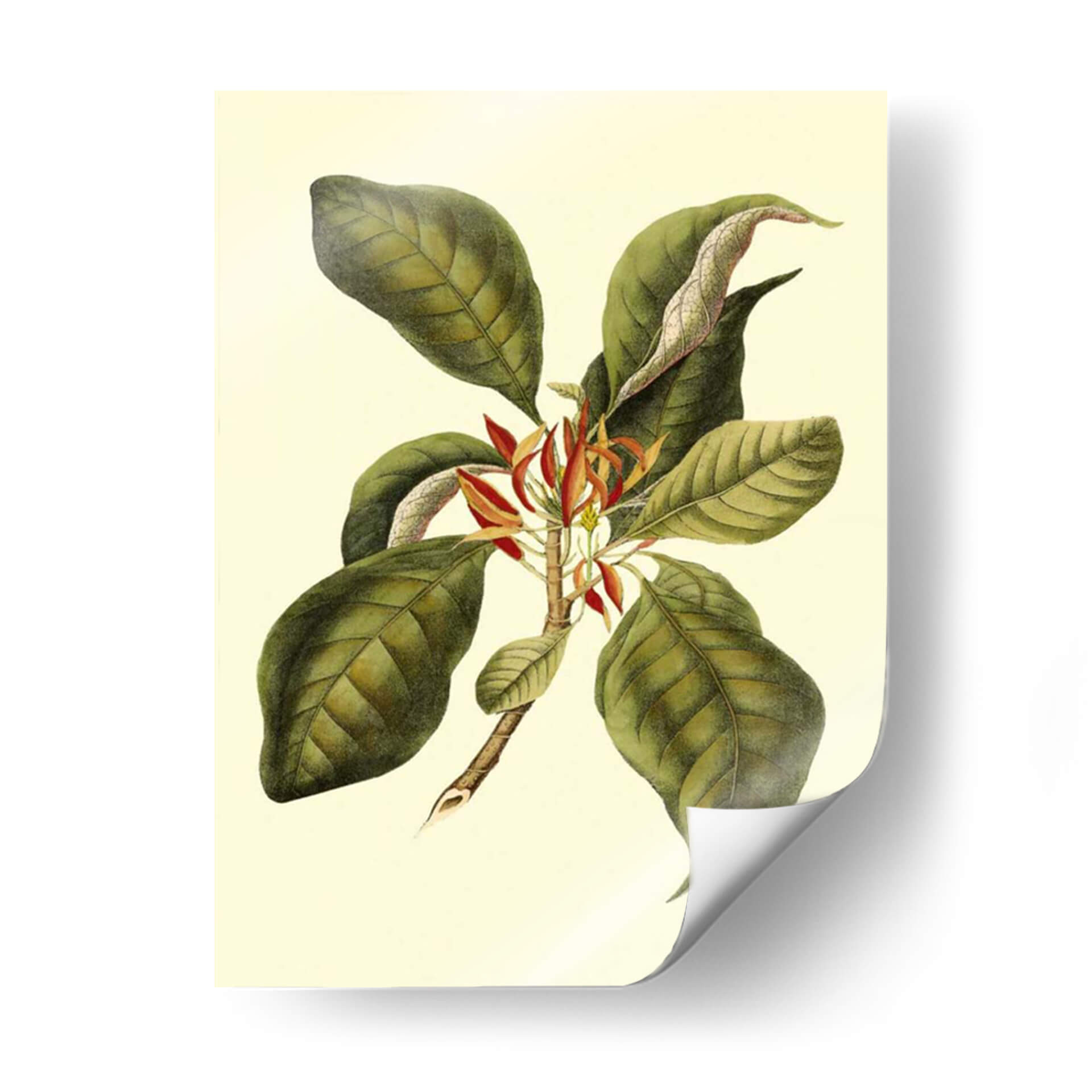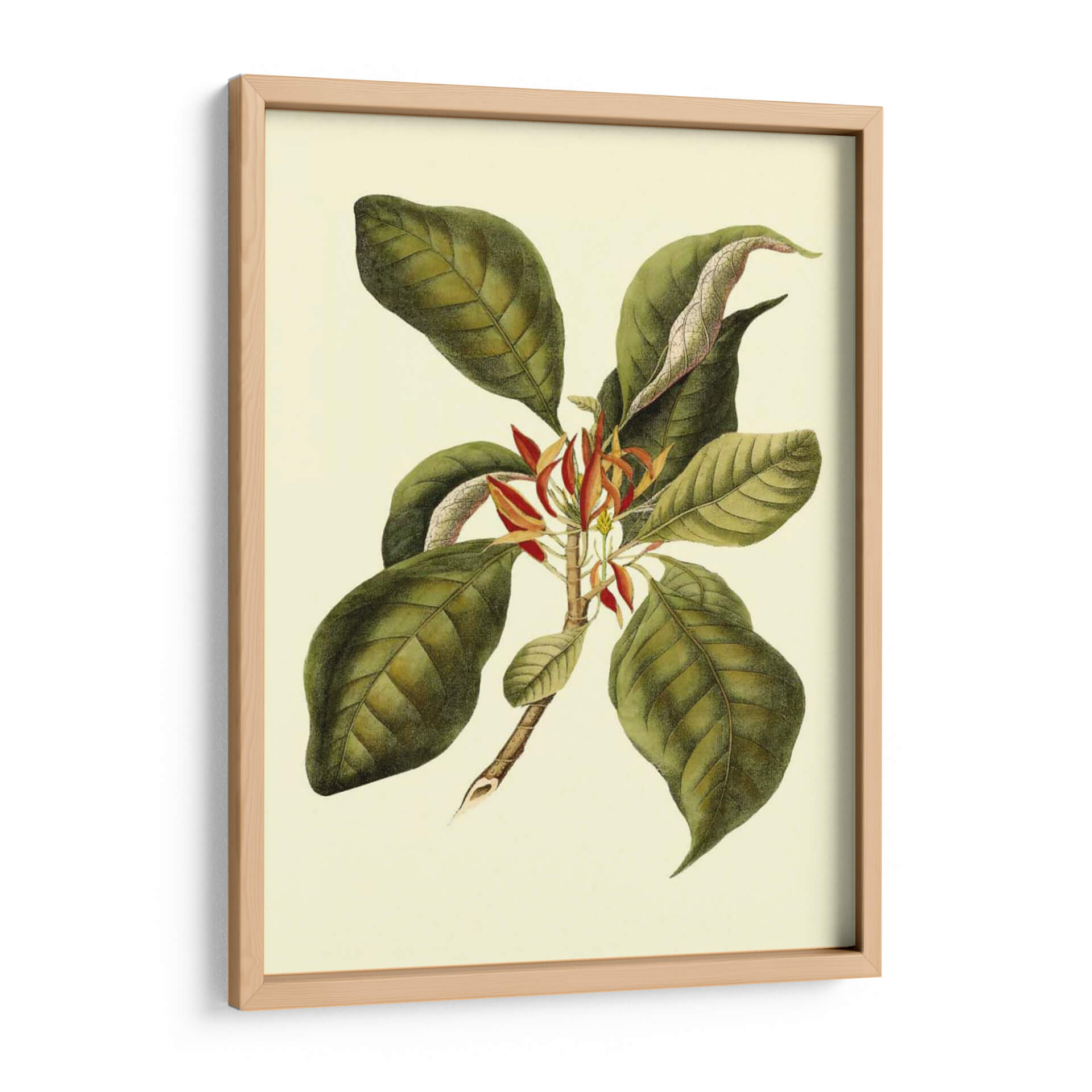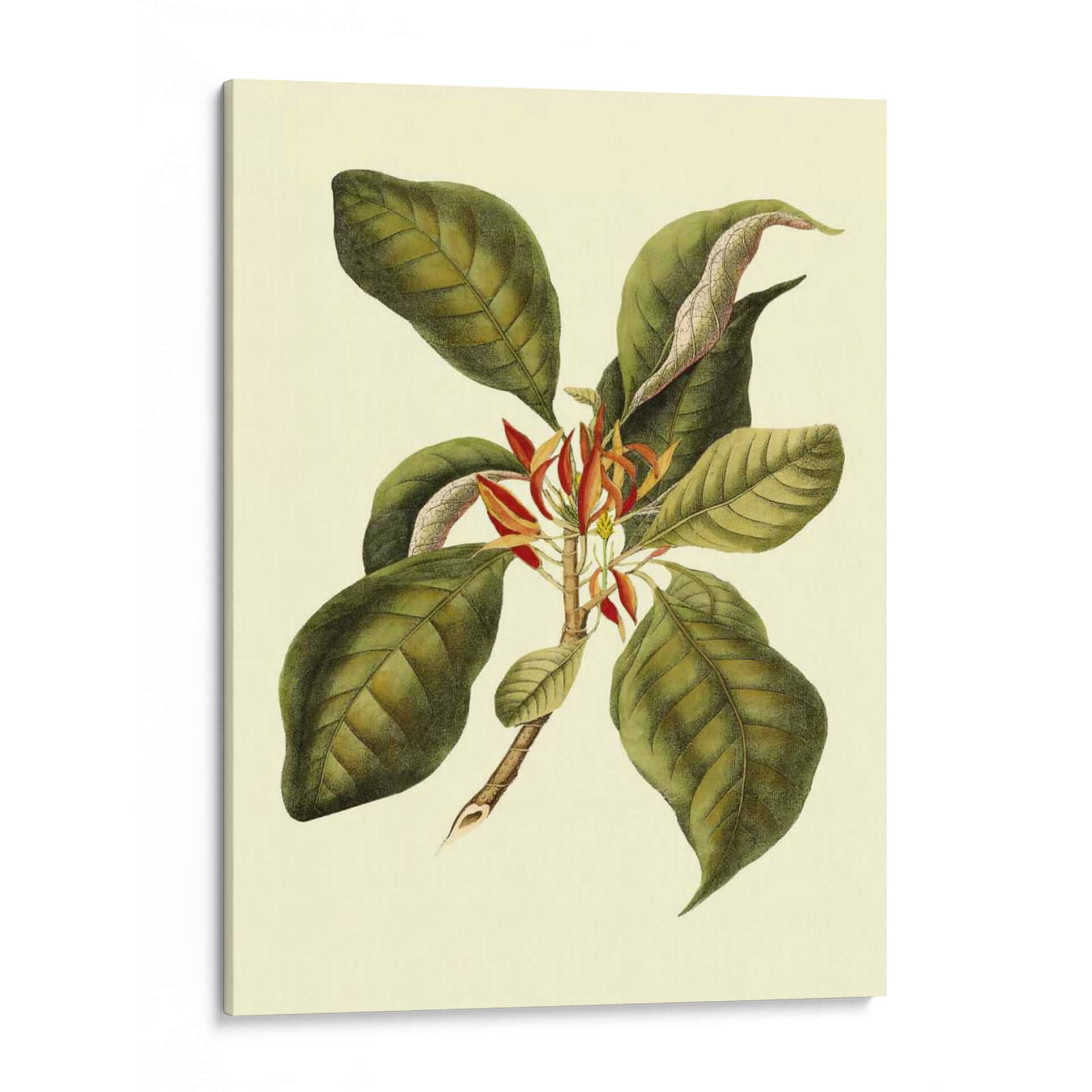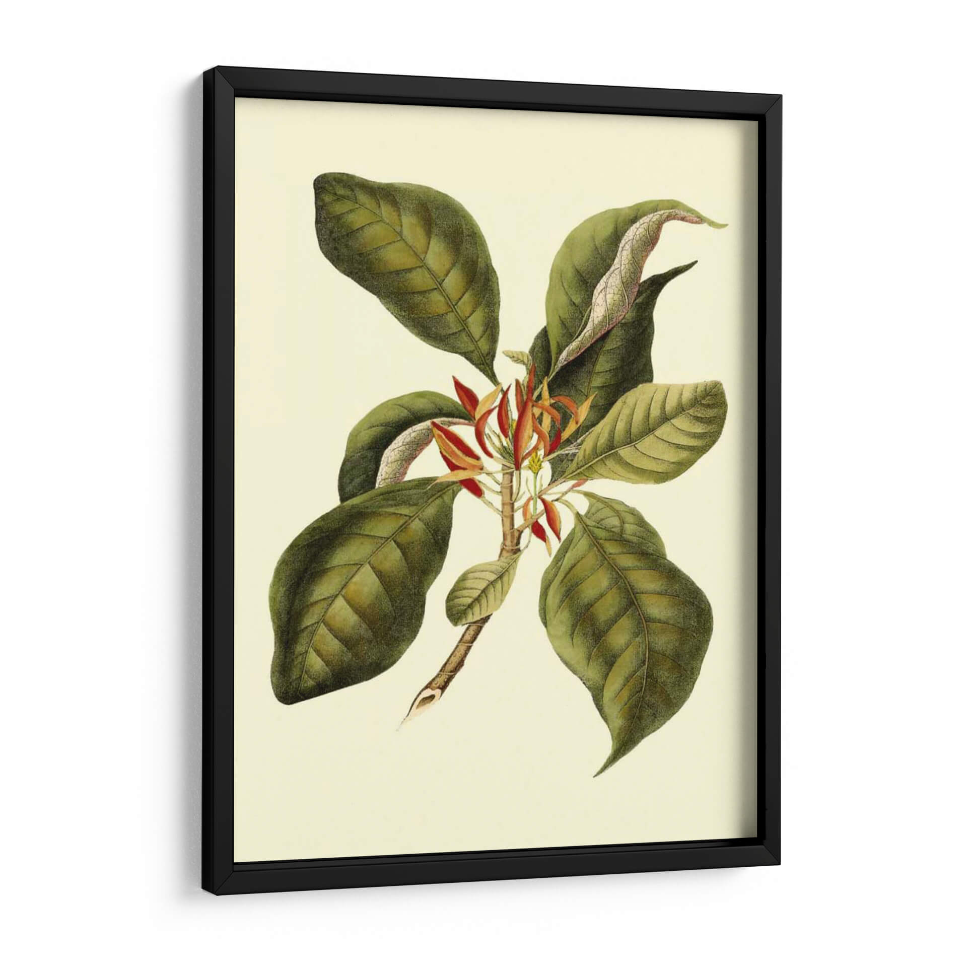 Sumérgete en la elegancia botánica con "Magnificent Follaje III", una obra de arte que captura la exuberancia de la naturaleza con un toque de sofisticación clásica. Este cuadro decorativo presenta una rama detallada, adornada con grandes hojas verdes de tonalidades ricas y venas marcadas, que contrastan delicadamente con las vibrantes flores rojas y anaranjadas que emergen en el centro. La paleta de colores, dominada por verdes profundos, toques de rojo carmesí y un fondo crema suave, evoca una sensación de calma y conexión con el mundo natural. La técnica empleada recuerda a las ilustraciones botánicas científicas, aportando un aire de autenticidad y detalle minucioso. Su composición equilibrada y el estilo que fusiona lo realista con una sutil estilización lo convierten en una pieza versátil, perfecta para añadir un acento de vida y serenidad a cualquier espacio. Ideal para salones, dormitorios o estudios que busquen un toque de refinamiento orgánico. Este cuadro decorativo es una invitación a la contemplación, aportando belleza atemporal a tu hogar u oficina.