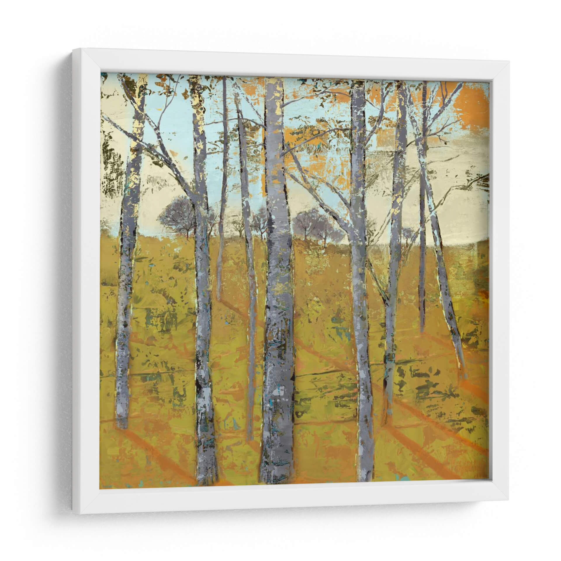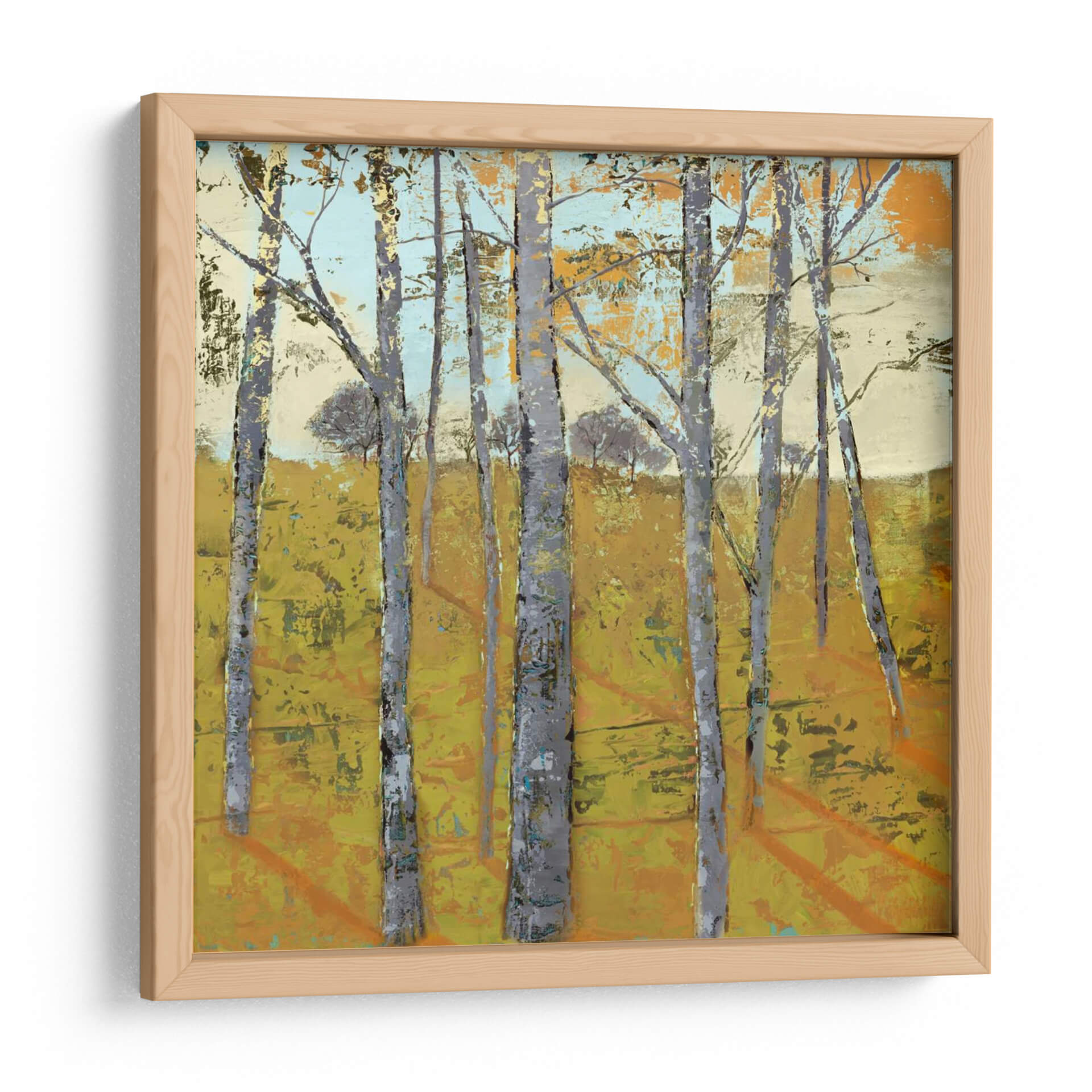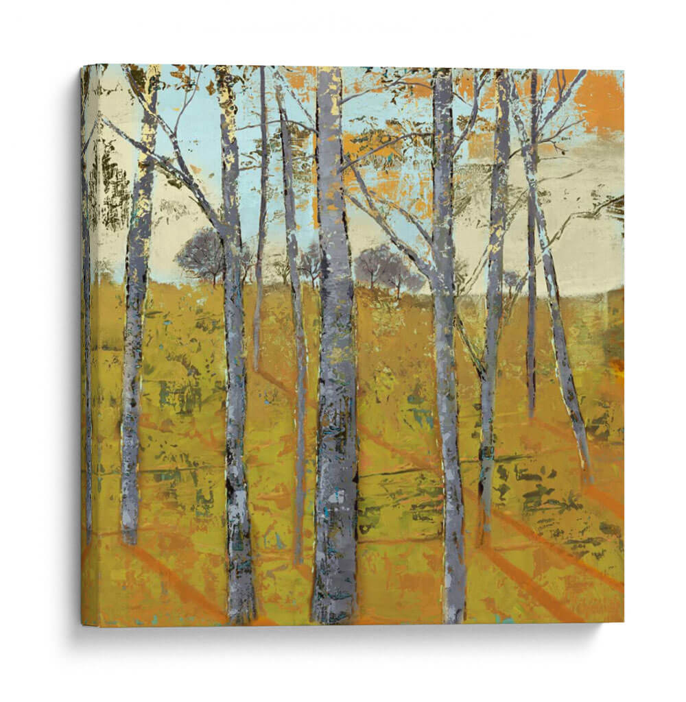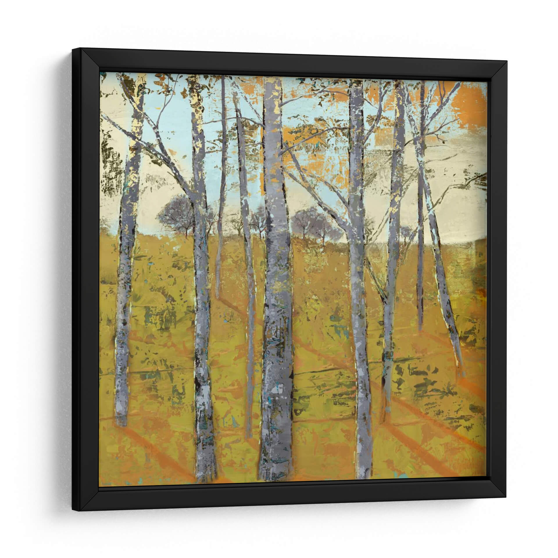 Sumérgete en la serenidad del bosque con "Matorral en la Colina II", una cautivadora obra de arte de Julie Joy. Este cuadro decorativo captura la esencia de un paisaje arbolado con una paleta de colores vibrantes y texturas ricas. Las esbeltas siluetas de los árboles grises y plateados se alzan contra un fondo de amarillos dorados y ocres, evocando la calidez del otoño o la luz dorada del atardecer. Las sombras proyectadas en el suelo añaden profundidad y un toque de misterio a la composición. El estilo, que fusiona elementos figurativos con un tratamiento abstracto y texturizado, crea una pieza visualmente atractiva que invita a la contemplación. "Matorral en la Colina II" es ideal para añadir un toque de naturaleza y sofisticación a cualquier espacio, desde salones y comedores hasta oficinas o estudios. Su atmósfera tranquila y la riqueza de sus tonos tierra lo convierten en una elección perfecta para quienes buscan una conexión con la naturaleza y un elemento decorativo que transmita calma y elegancia. Esta pieza transformará tus paredes en una ventana a un paisaje evocador y lleno de vida.