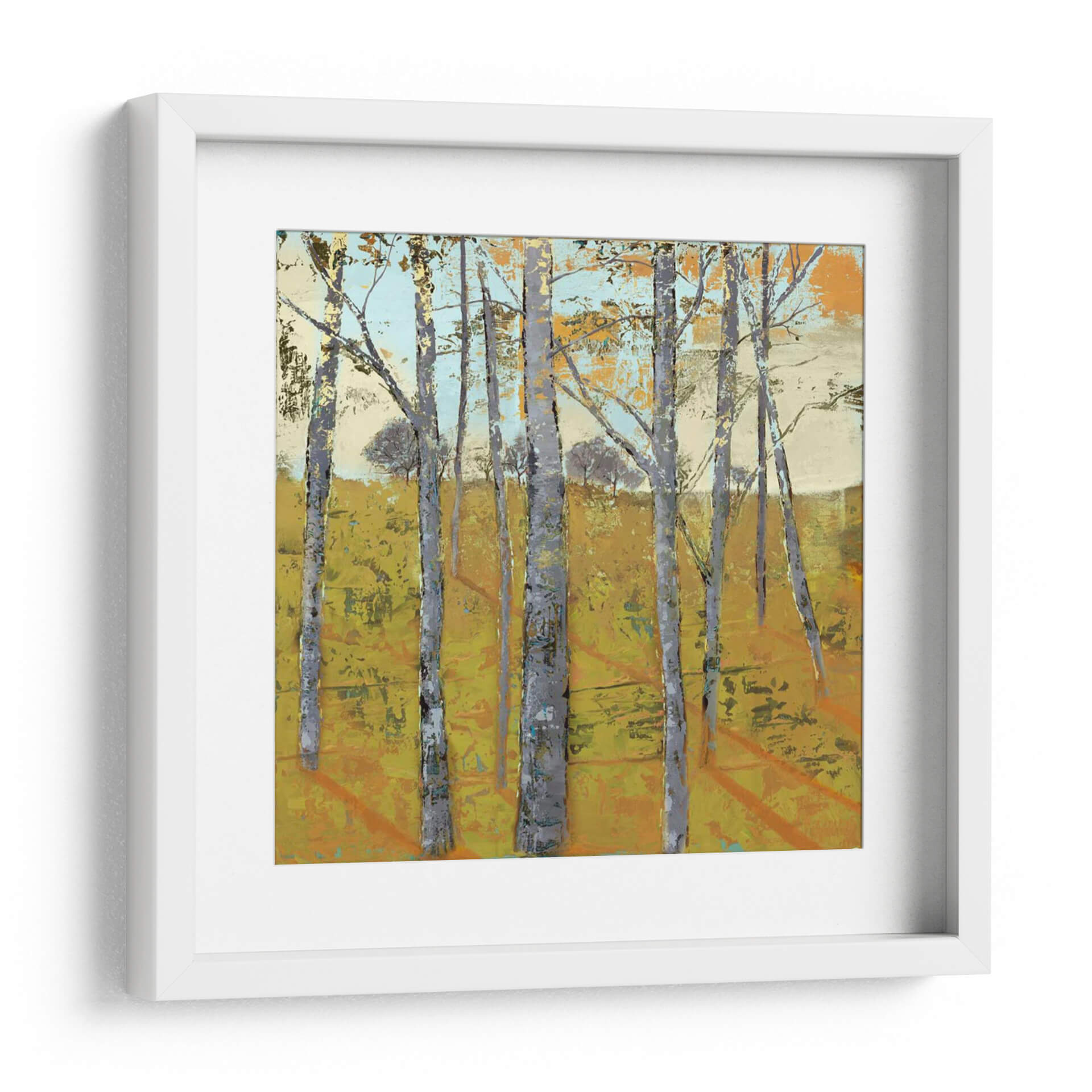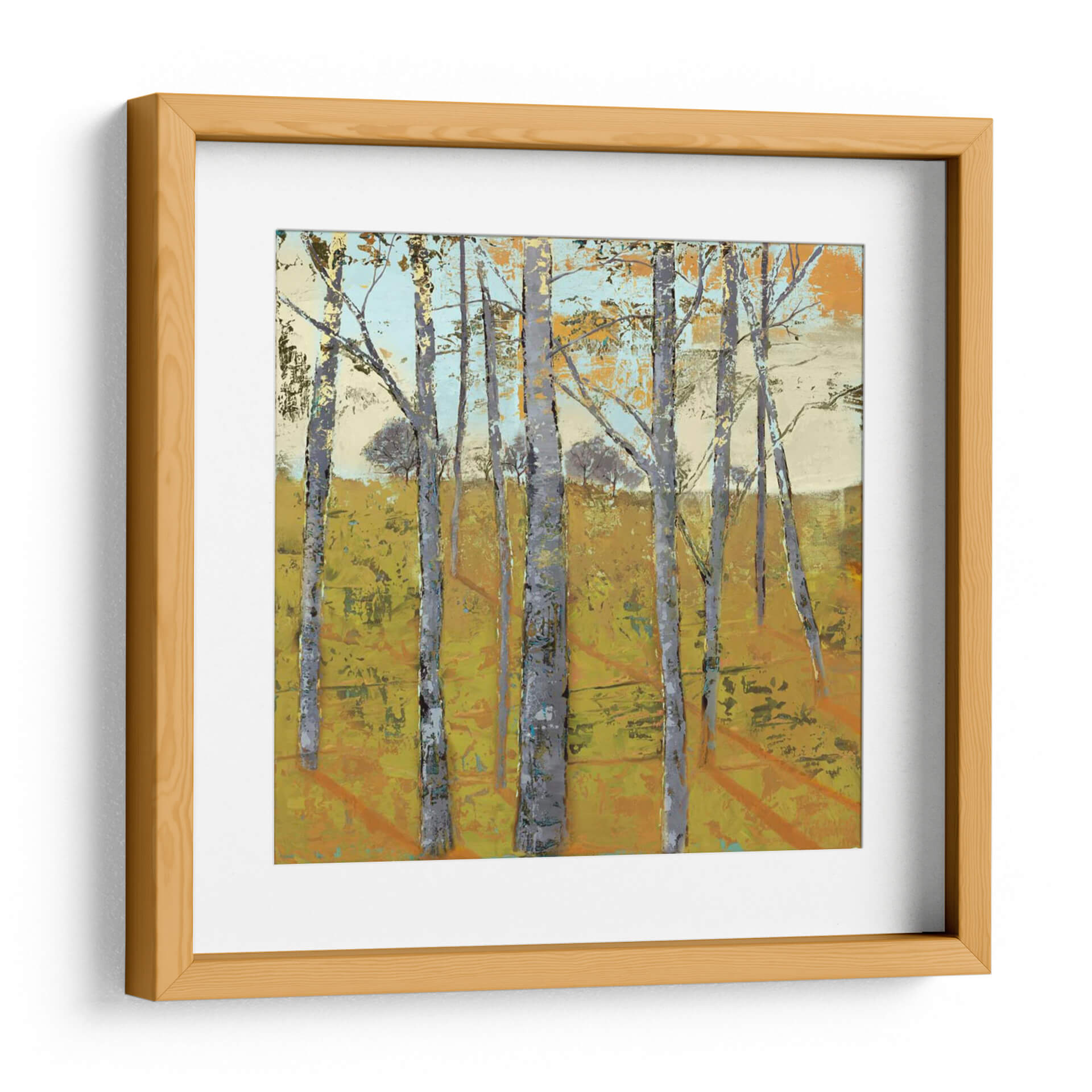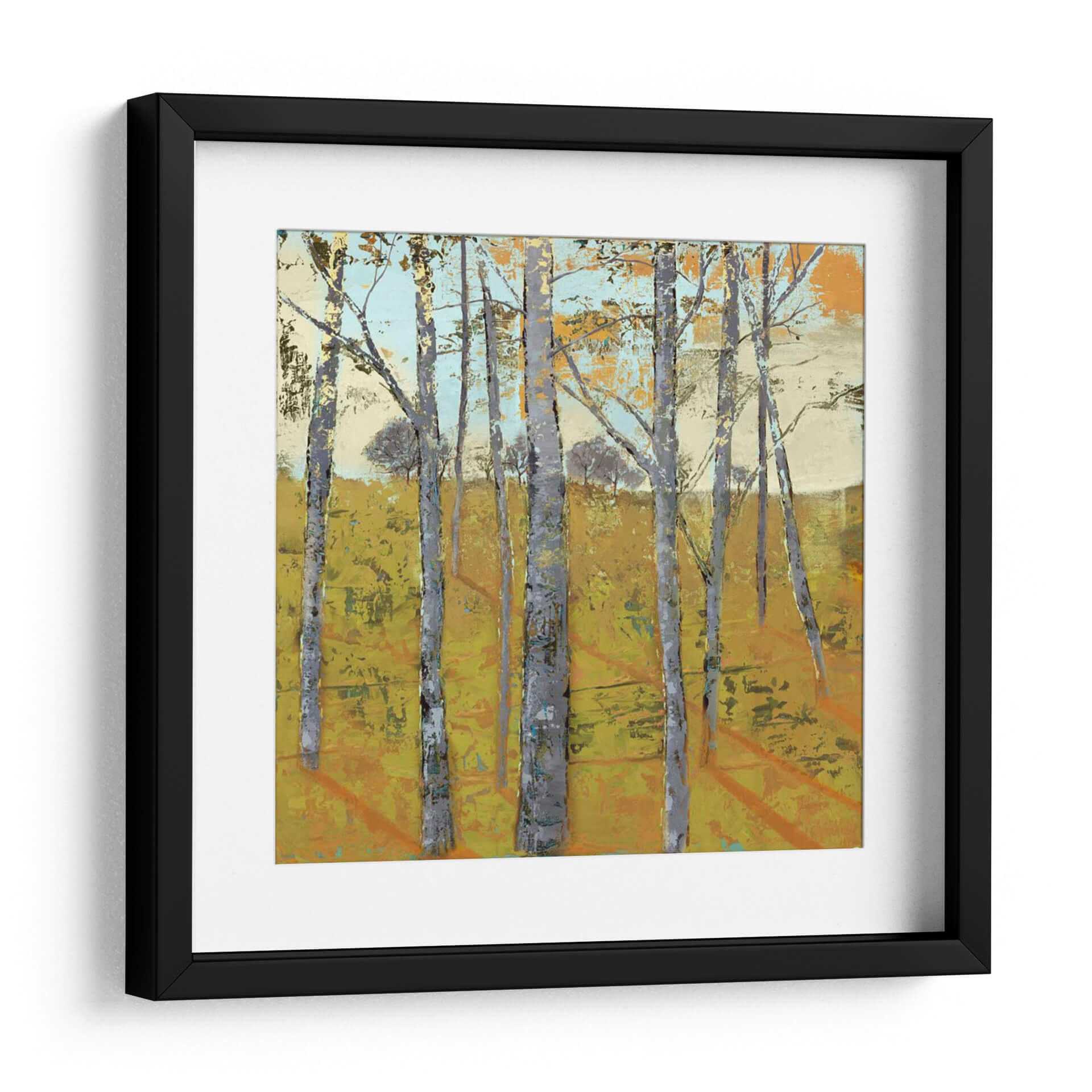 Sumérgete en la serenidad del bosque con "Matorral en la Colina II", una cautivadora obra de arte de Julie Joy. Este cuadro decorativo captura la esencia de un paisaje arbolado con una paleta de colores vibrantes y texturas ricas. Las esbeltas siluetas de los árboles grises y plateados se alzan contra un fondo de amarillos dorados y ocres, evocando la calidez del otoño o la luz dorada del atardecer. Las sombras proyectadas en el suelo añaden profundidad y un toque de misterio a la composición. El estilo, que fusiona elementos figurativos con un tratamiento abstracto y texturizado, crea una pieza visualmente atractiva que invita a la contemplación. "Matorral en la Colina II" es ideal para añadir un toque de naturaleza y sofisticación a cualquier espacio, desde salones y comedores hasta oficinas o estudios. Su atmósfera tranquila y la riqueza de sus tonos tierra lo convierten en una elección perfecta para quienes buscan una conexión con la naturaleza y un elemento decorativo que transmita calma y elegancia. Esta pieza transformará tus paredes en una ventana a un paisaje evocador y lleno de vida.