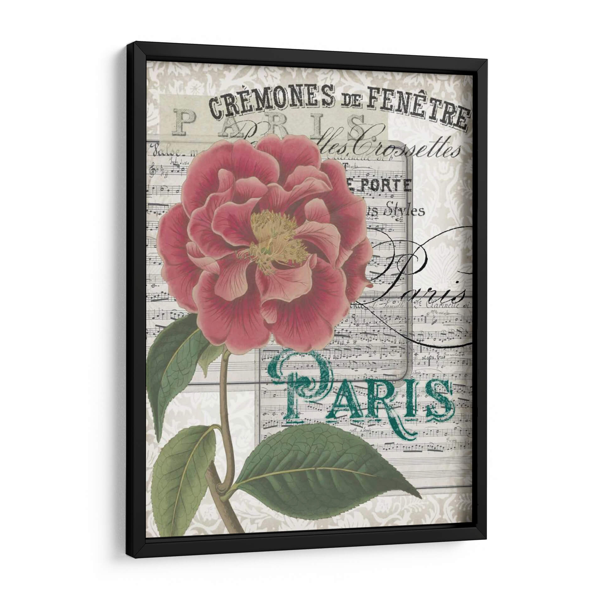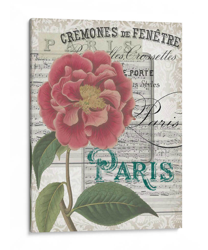 Sumérgete en la elegancia parisina con "Musical Paris III", una obra de arte que combina la delicadeza de una flor exuberante con el encanto de la música y la iconografía de la ciudad de la luz. Esta pieza cautivadora presenta una detallada ilustración botánica de una rosa o peonía en tonos vibrantes de rosa y carmín, con un centro amarillento que aporta calidez. El fondo se compone de partituras antiguas y texturas sutiles que evocan una atmósfera vintage y romántica, con elementos gráficos en francés y la palabra "PARIS" en un distintivo color verde azulado. La composición, centrada en la flor, es equilibrada y estéticamente agradable, invitando a la contemplación. "Musical Paris III" es ideal para añadir un toque de sofisticación y un aire de nostalgia a cualquier espacio, ya sea una sala de estar, un dormitorio o un estudio. Su estilo lo hace perfecto para decoraciones de interiores clásicas, shabby chic o con un toque bohemio. Deja que esta obra de arte transportarte a las calles de París, rodeado de belleza floral y melodías atemporales. Es una adición perfecta para aquellos que aprecian la belleza clásica y el encanto francés en su decoración de pared.