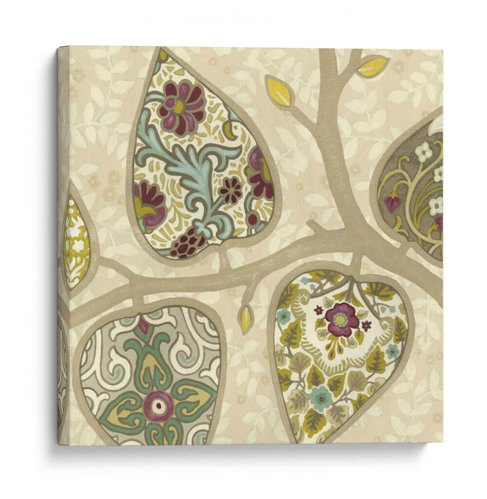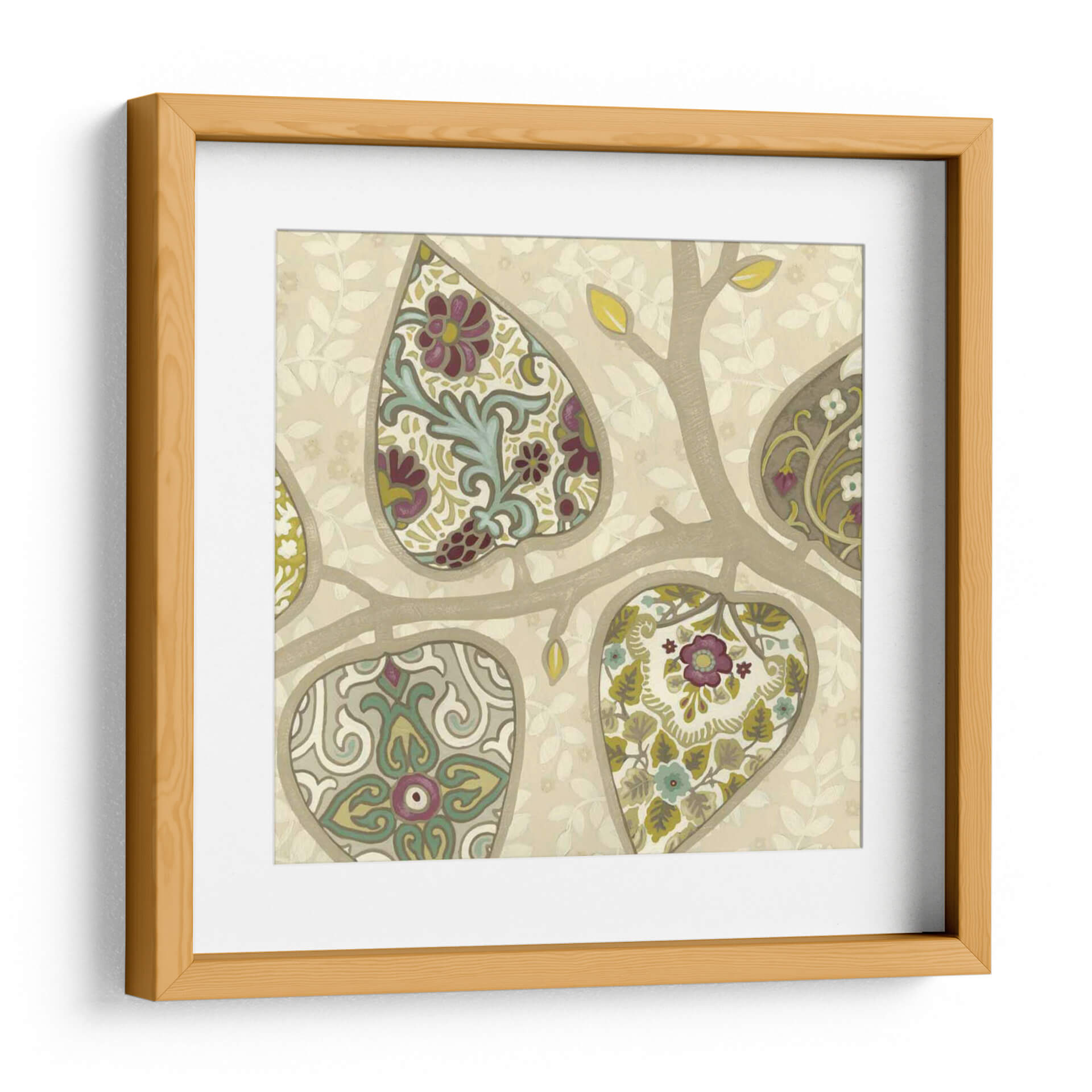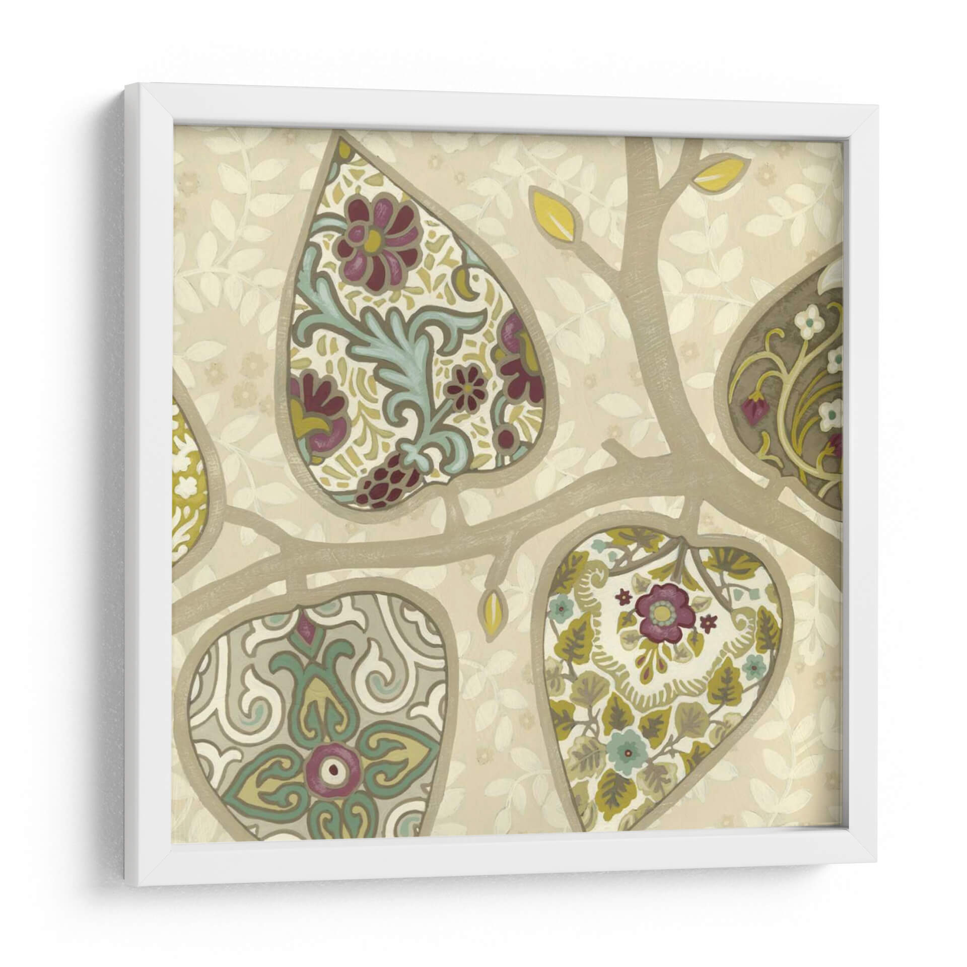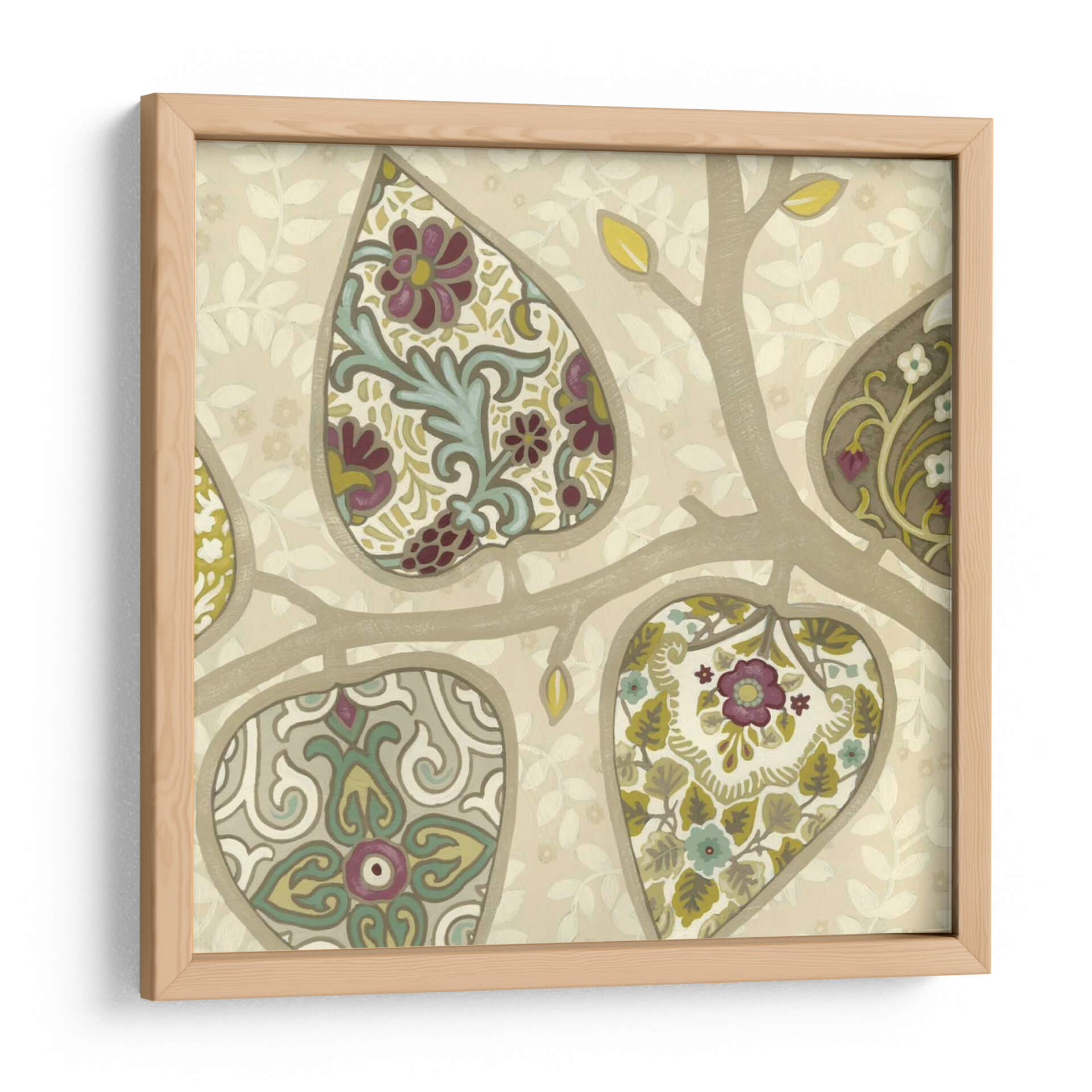 Embárcate en un viaje visual con "Patrones En Follaje I", una obra de arte decorativo que evoca la sofisticación de los textiles botánicos y los patrones intrincados. Esta pieza, creada por June Erica Vess, fusiona la calidez de tonos tierra con delicados acentos de color, presentando un diseño inspirado en la naturaleza pero estilizado con un toque artístico contemporáneo. Las hojas, representadas como escudos ornamentales, se despliegan en un patrón rítmico sobre un fondo sutilmente texturizado, creando una sensación de profundidad y serenidad. Cada 'hoja' es un microcosmos de diseño, albergando mini-patrones florales y geométricos en armonía con tonos ciruela, verde azulado y amarillos pálidos. La composición es equilibrada y orgánica, con ramas estilizadas que conectan las formas principales, sugiriendo un árbol de la vida moderno. Esta obra es ideal para añadir un toque de elegancia y calma a cualquier espacio, desde una sala de estar contemporánea hasta un sereno dormitorio o un estudio creativo. Su diseño detallado y su paleta de colores sofisticada la convierten en una elección perfecta para quienes aprecian el arte que combina la belleza de lo natural con la abstracción artística, aportando un aire de refinamiento atemporal a tu decoración.