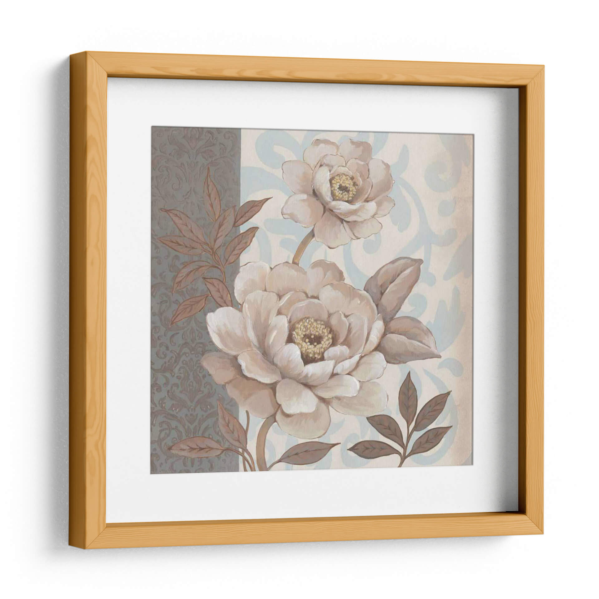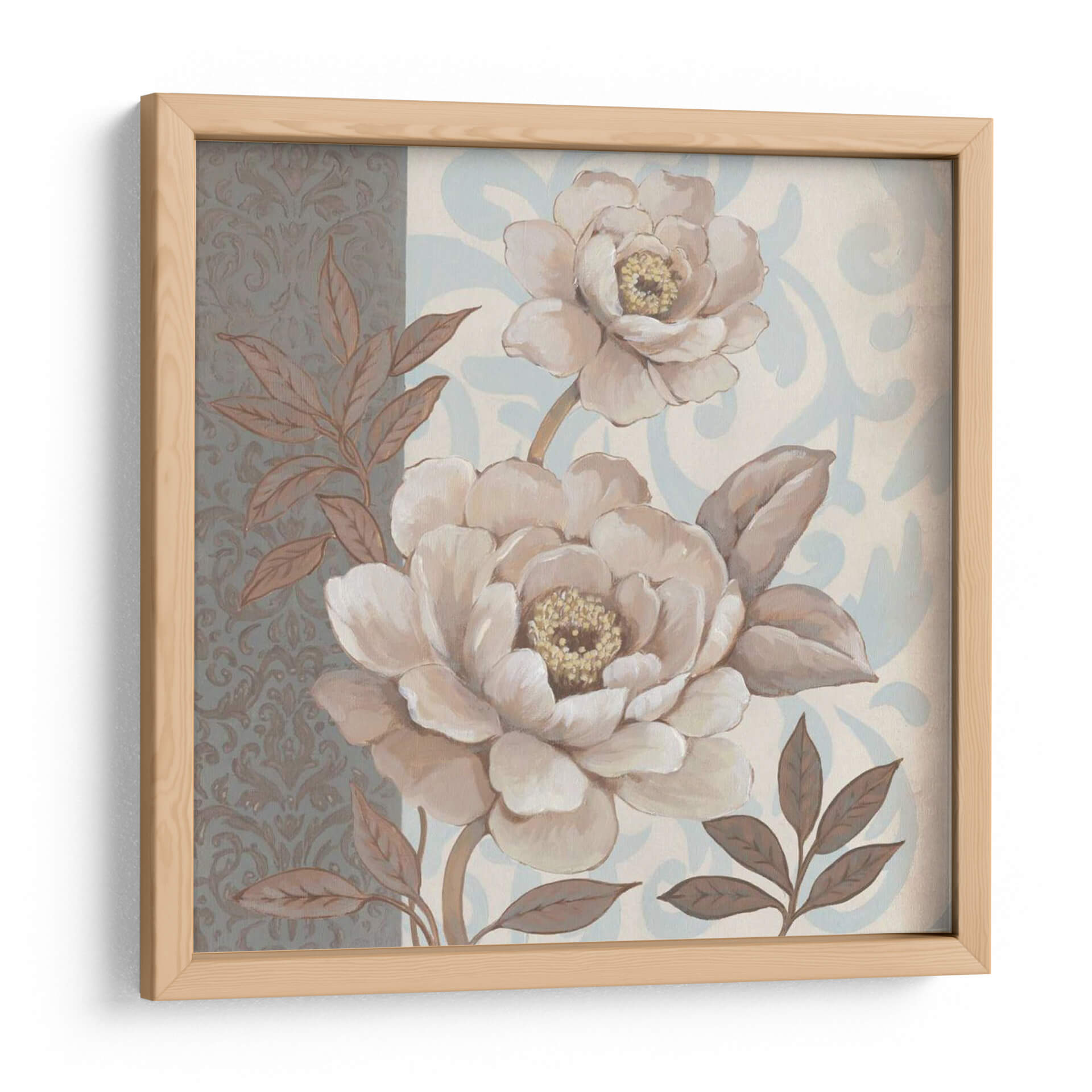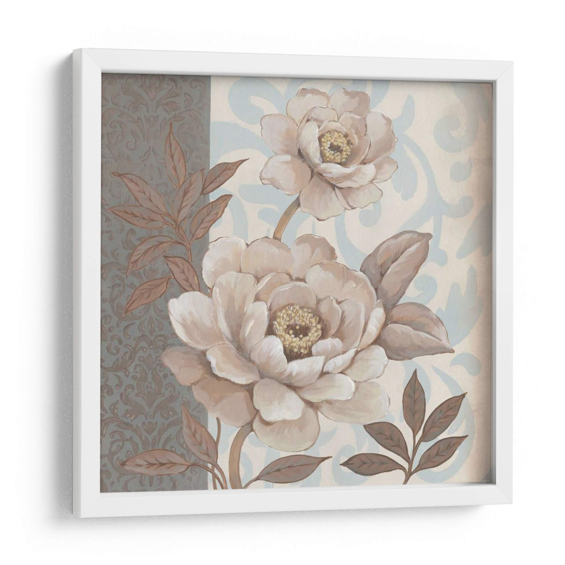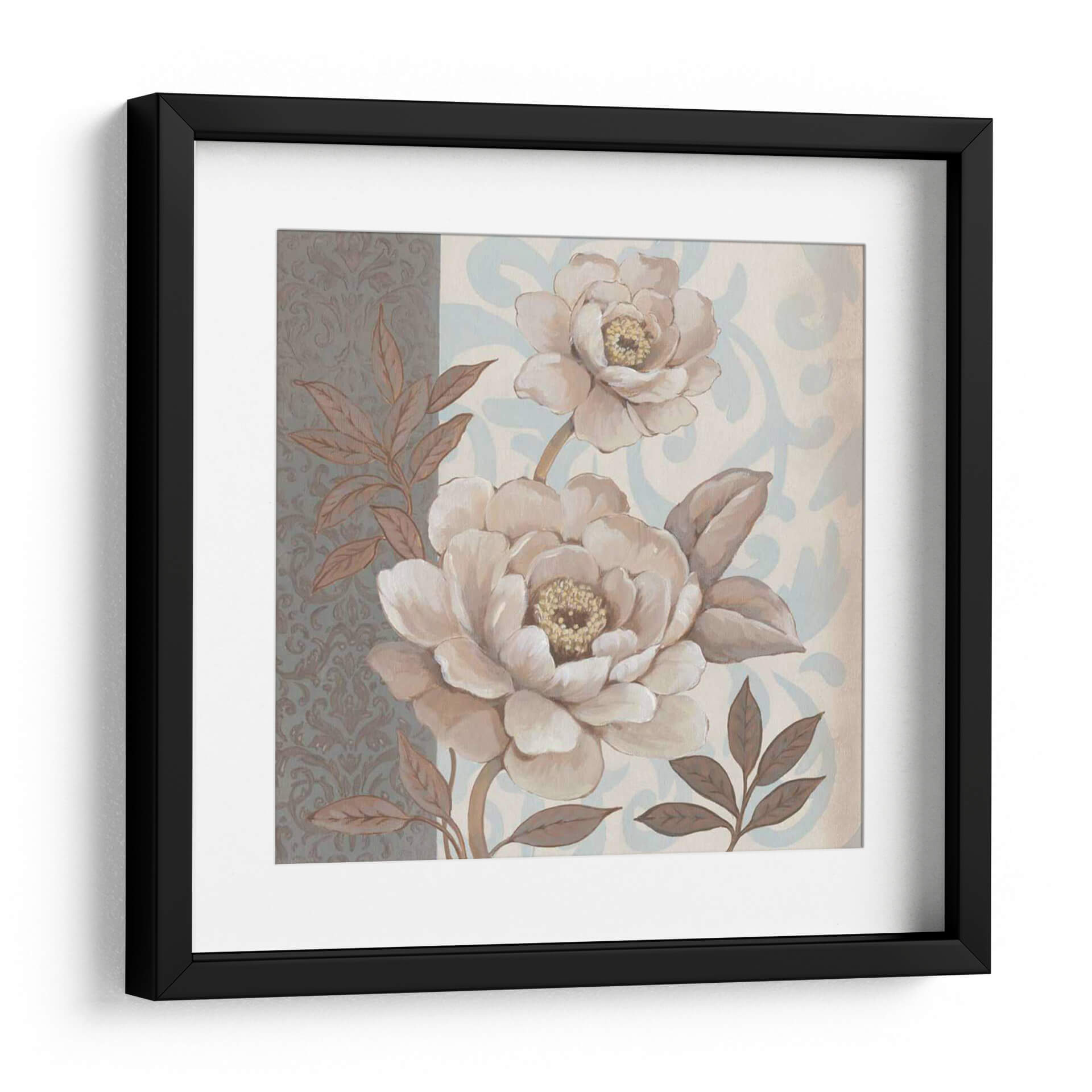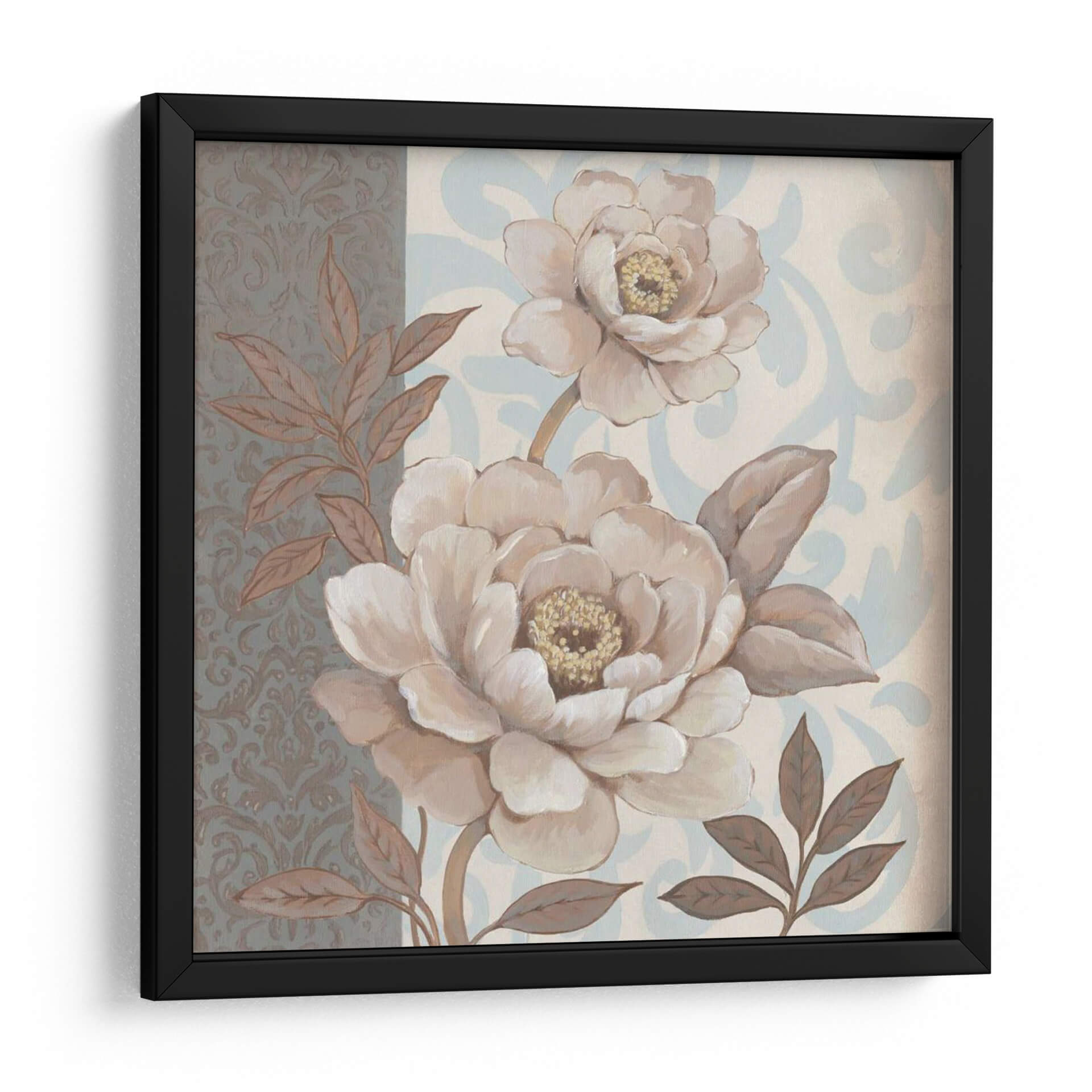 Adéntrate en un oasis de serenidad y elegancia con 'Peonía Parisina II', una obra de arte de Tim O'Toole que captura la delicadeza de las flores en plena floración. Esta pieza presenta dos peonías de tonos suaves, casi etéreos, con pétalos que se despliegan con una gracia sutil, revelando centros detallados en tonos dorados y ocre. El fondo se divide en dos secciones: una banda vertical a la izquierda con un intrincado patrón damasquino en tonos grises y marrones, y a la derecha, un fondo más claro con un diseño floral estilizado en azul pálido, que aporta un contraste delicado. Las hojas, representadas en tonos tierra y cobrizos, complementan la paleta de colores, creando una atmósfera sofisticada y tranquila. El estilo pictórico, con pinceladas visibles pero refinadas, evoca una sensación de arte clásico reinterpretado para espacios contemporáneos. Este cuadro decorativo es perfecto para añadir un toque de calma y refinamiento a cualquier dormitorio, sala de estar o estudio. Su composición equilibrada y su paleta de colores neutros lo convierten en una adición versátil que armoniza con una amplia gama de estilos decorativos, desde el moderno hasta el tradicional, aportando siempre una sensación de lujo discreto.