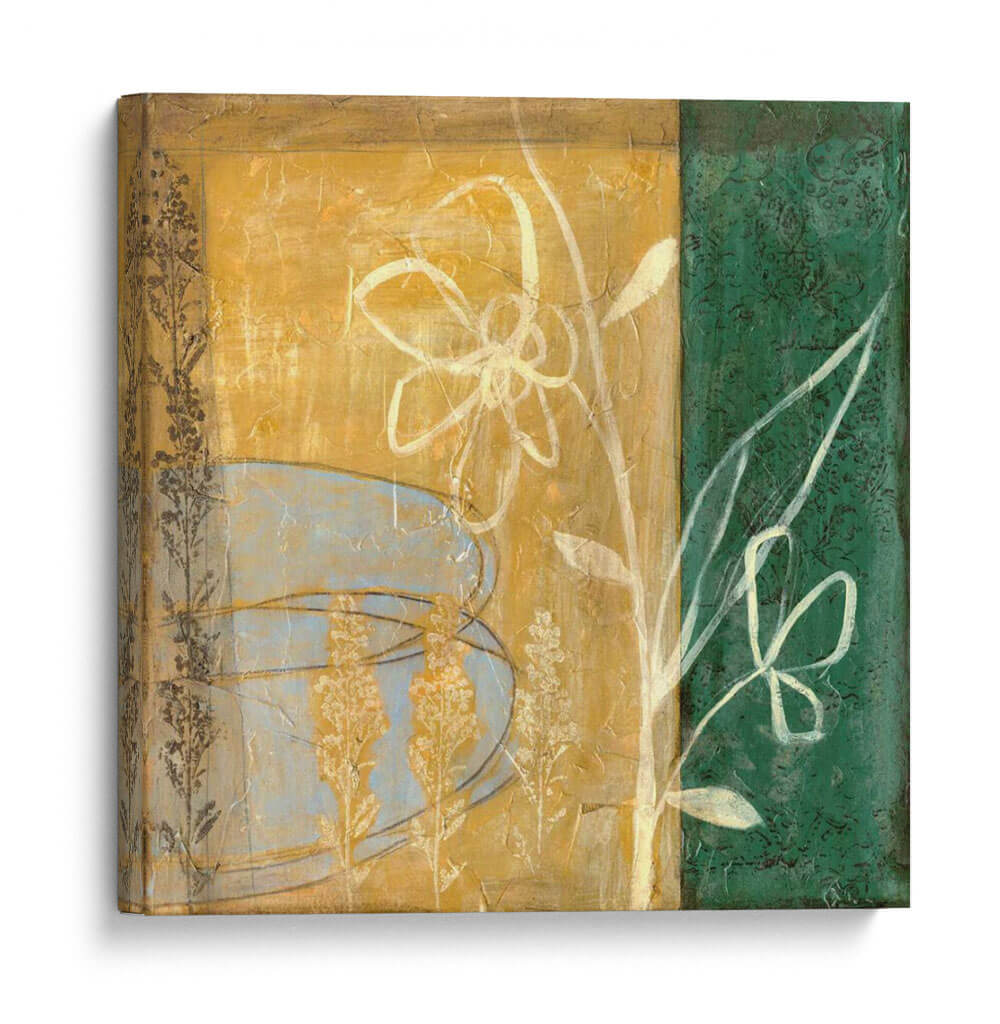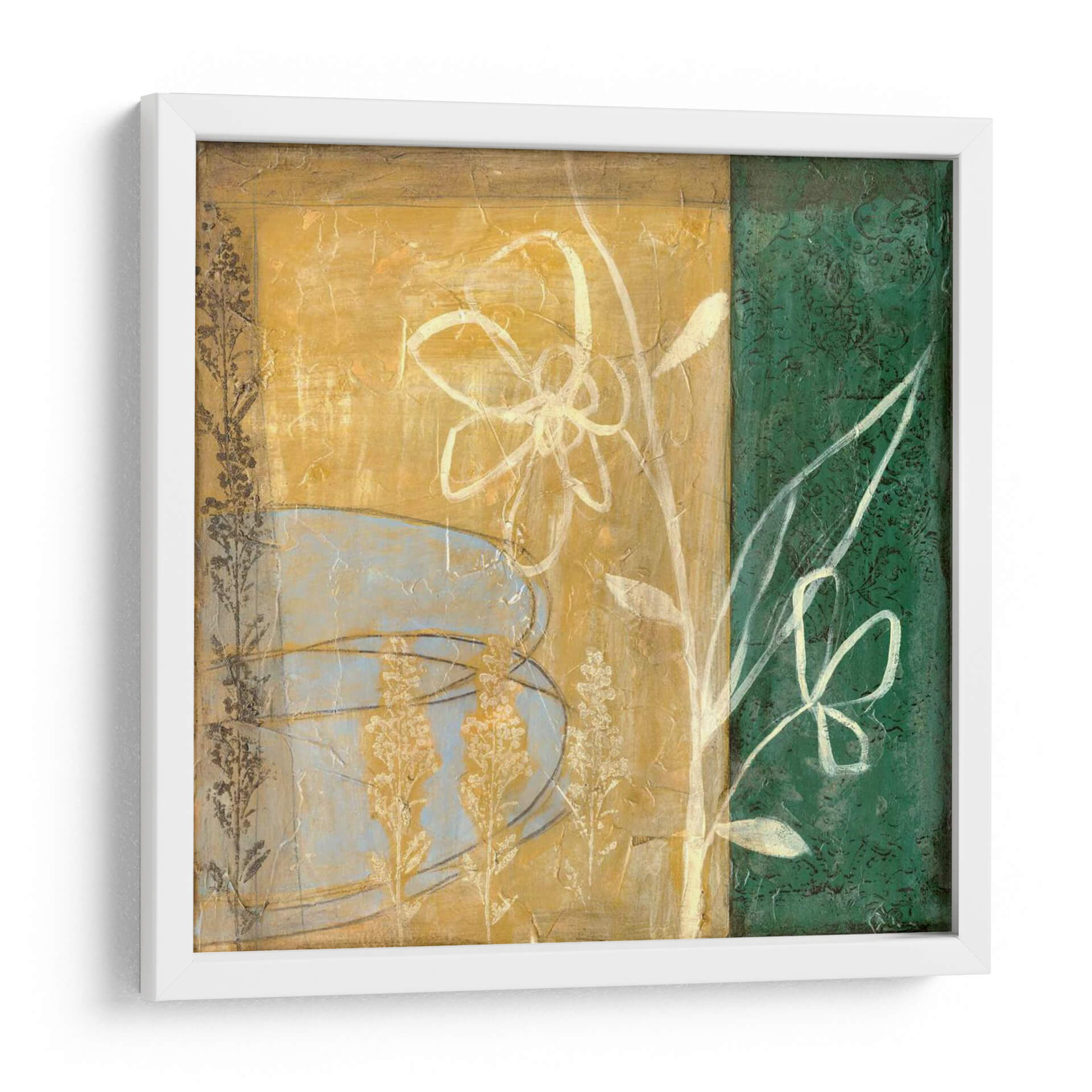 Este encantador cuadro decorativo, titulado 'Pequeñas Flores Silvestres Prensadas IV' por Jennifer Goldberger, es una celebración delicada de la naturaleza capturada en un estilo contemporáneo. La obra presenta una composición dividida, con una sección superior de color ocre rústico texturizado y una banda vertical a la derecha de un profundo verde esmeralda. Sobre el fondo ocre, se aprecian formas abstractas y etéreas en tonos azul pálido, que sugieren pétalos o elementos orgánicos suaves, junto a delicados motivos de flores secas en tonos dorados. Un gran contorno blanco de una flor estilizada domina la parte central, irradiando una sensación de pureza y crecimiento, complementado por el sutil boceto de otra flor y hojas en el lado verde. La paleta de colores, que combina ocres cálidos, verdes profundos y toques de azul y blanco, crea una atmósfera serena pero vibrante, perfecta para infundir calma y un toque de sofisticación botánica a cualquier espacio. Este cuadro decorativo es ideal para salones, dormitorios o estudios, aportando un aire de tranquilidad y belleza natural a la decoración de interiores.