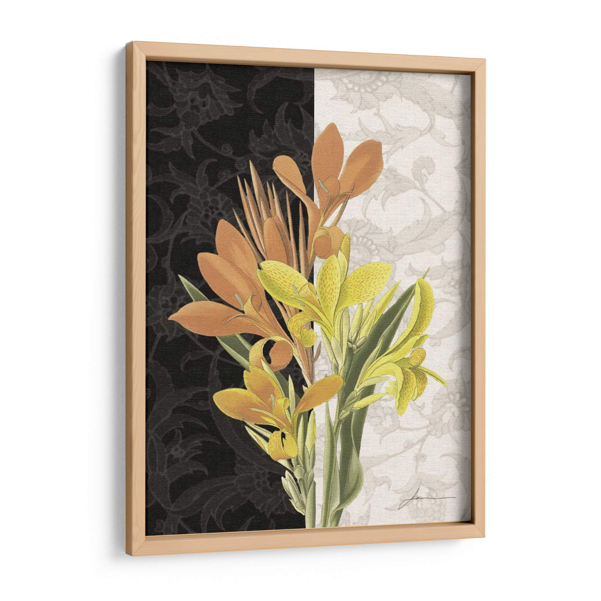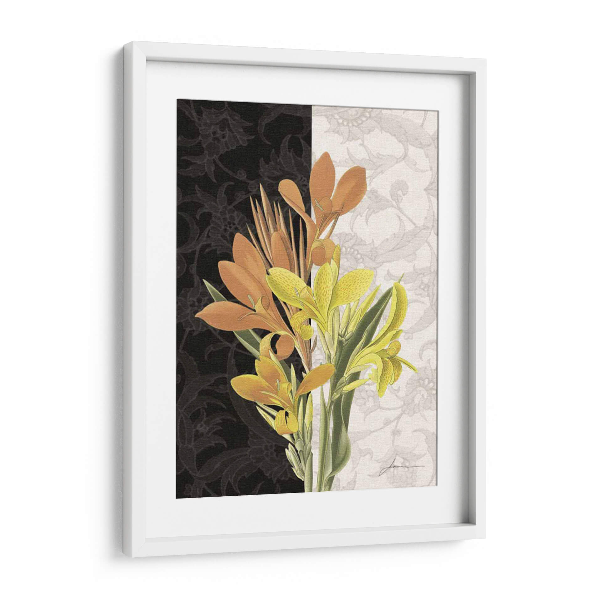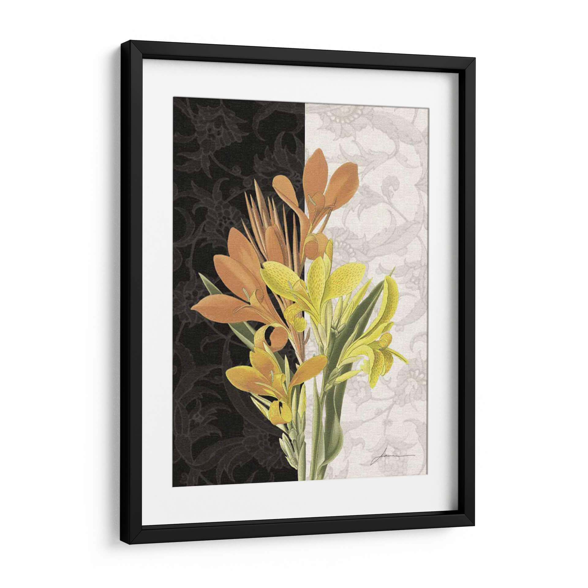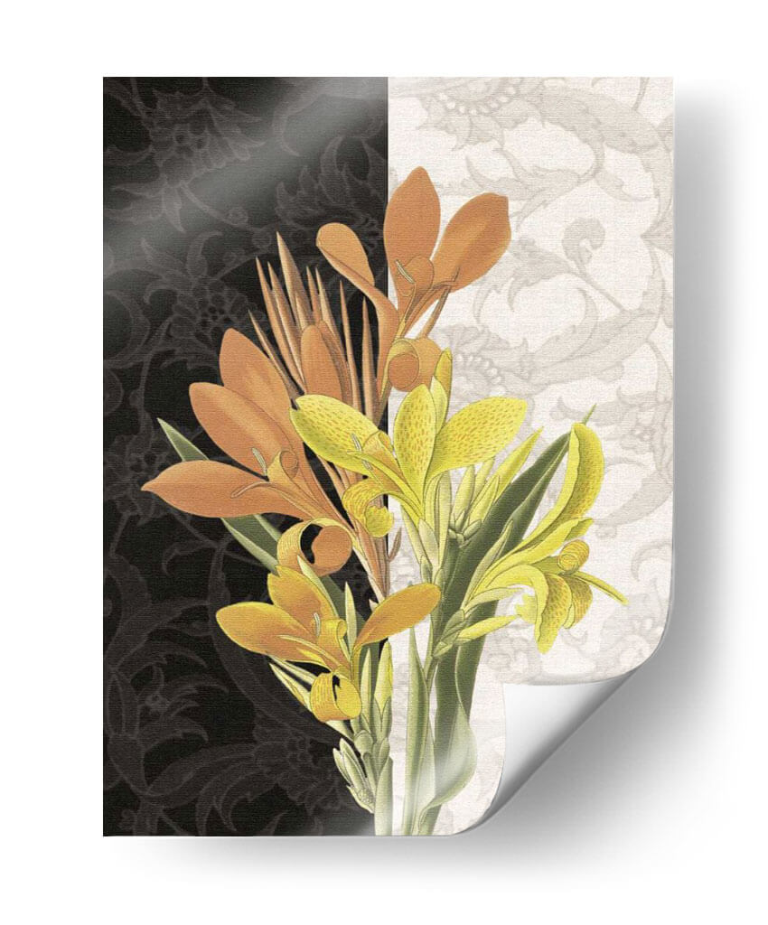 Embellece tu hogar con "Pieza Central I", una obra de arte contemporáneo que fusiona la vitalidad de la naturaleza con un diseño audaz. Este cuadro decorativo presenta un vibrante ramo de flores de canna en tonos naranjas y amarillos intensos, que contrastan de manera espectacular con un fondo dividido. El lado izquierdo exhibe un patrón floral intrincado en negro profundo, aportando misterio y sofisticación, mientras que el lado derecho se ilumina con un delicado motivo floral en tonos claros, creando una sensación de amplitud y elegancia. La composición equilibrada, con las flores emergentes desde la parte inferior, captura la esencia del crecimiento y la belleza efímera. Ideal para salas de estar modernas, comedores o incluso oficinas, este cuadro aporta un toque de color y un aire de refinamiento natural. Su estilo, que combina elementos botánicos realistas con un tratamiento gráfico audaz, lo convierte en una pieza única capaz de transformar cualquier ambiente, añadiendo un punto focal artístico y lleno de vida que invita a la contemplación. "Pieza Central I" es más que una decoración; es una declaración de estilo y una ventana a la expresividad del arte contemporáneo.
