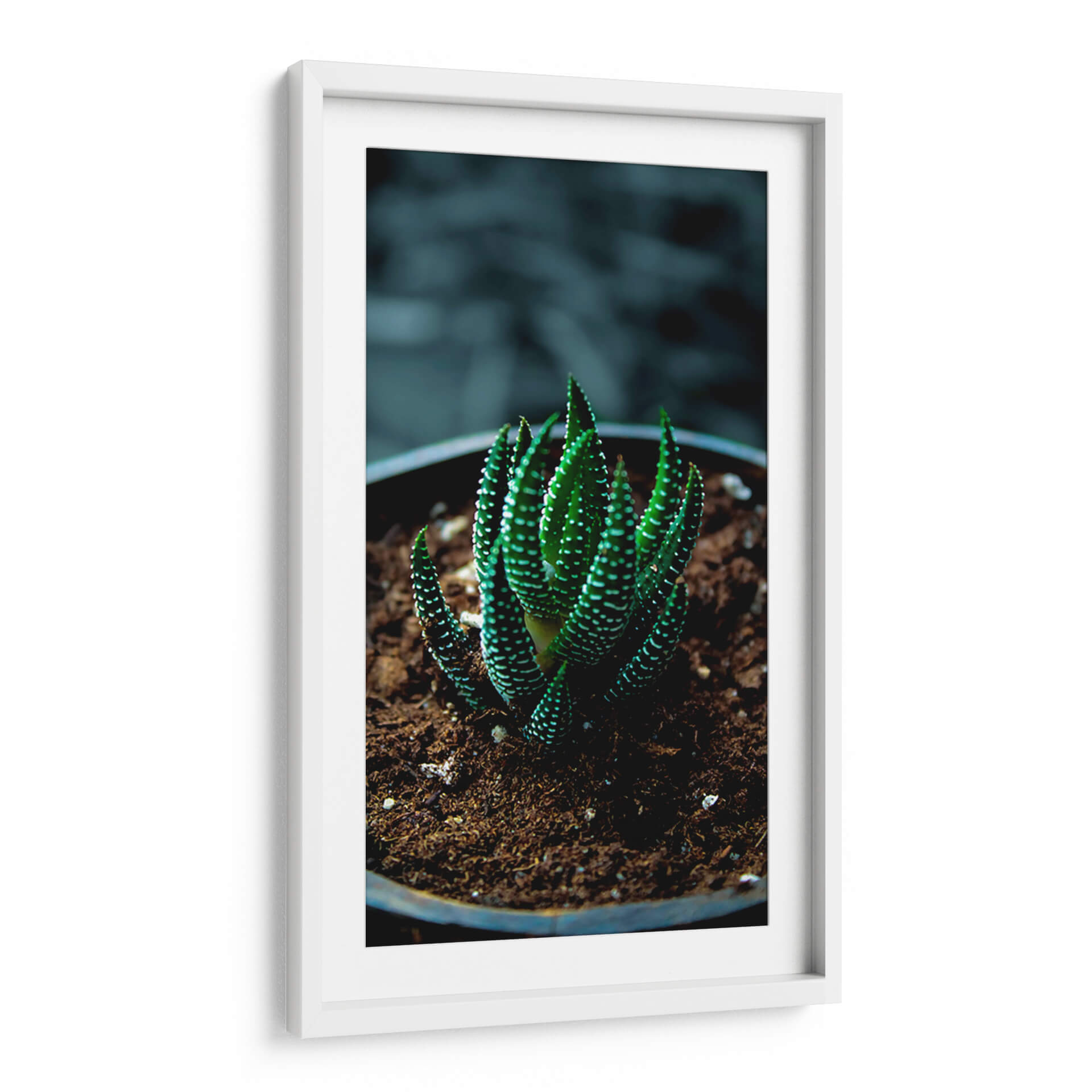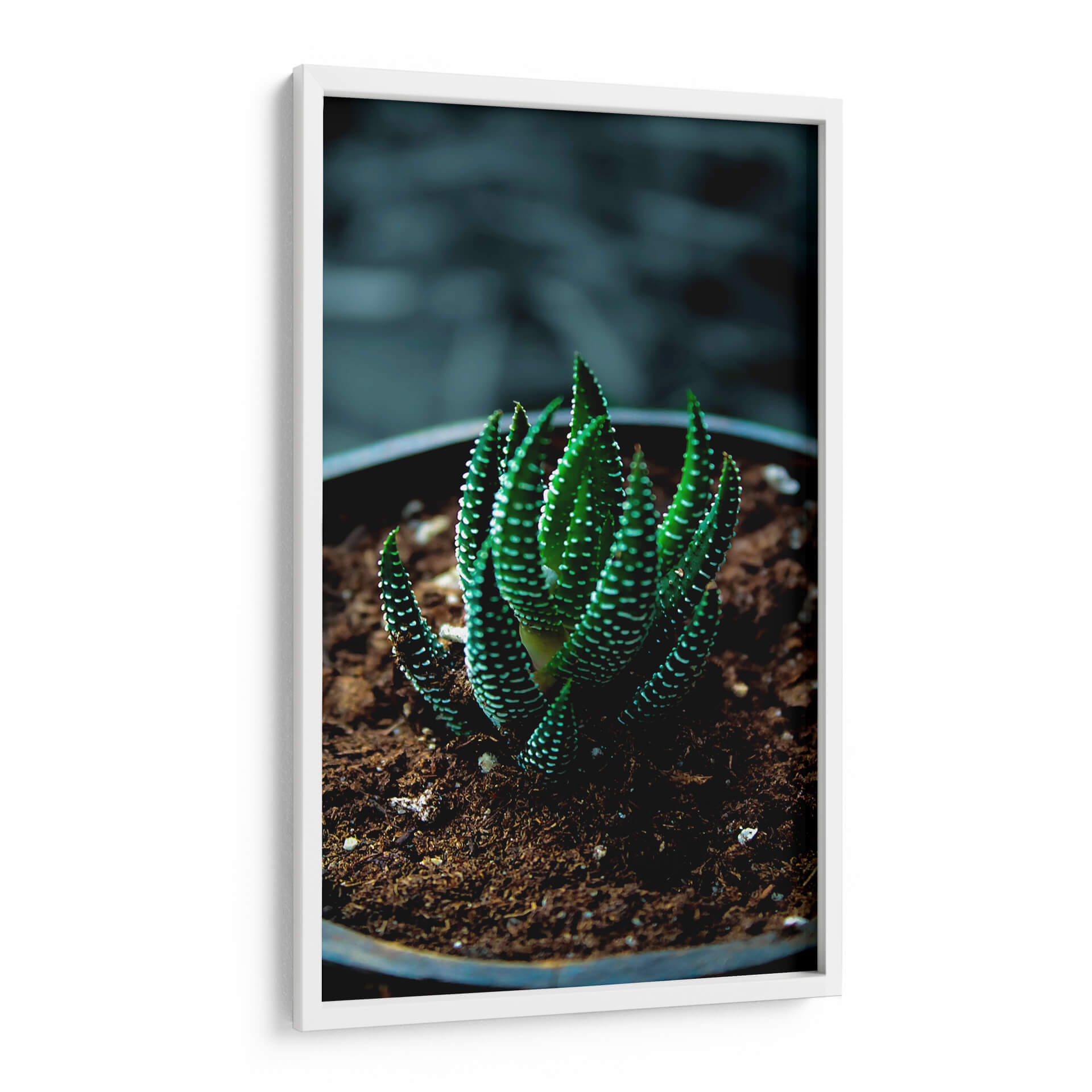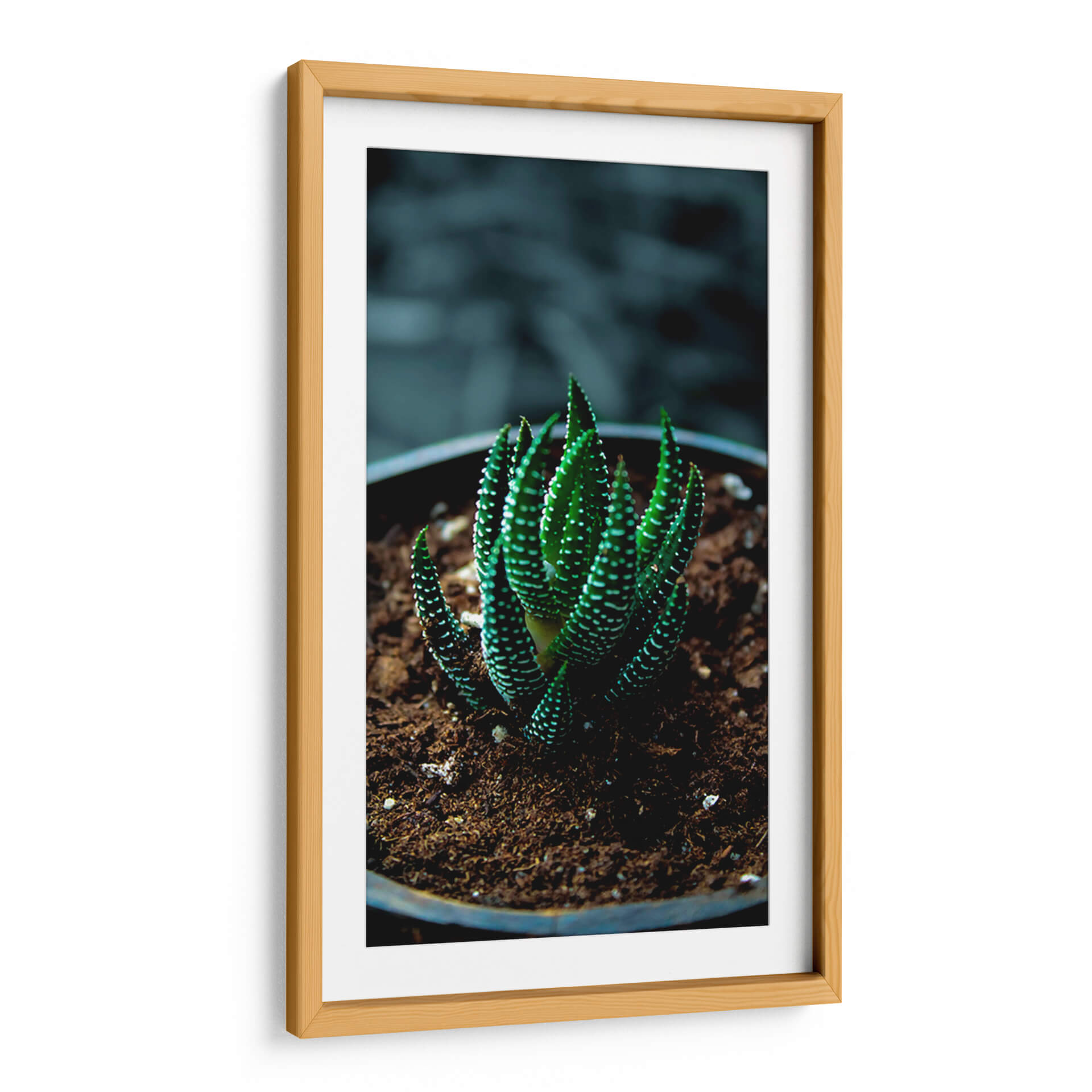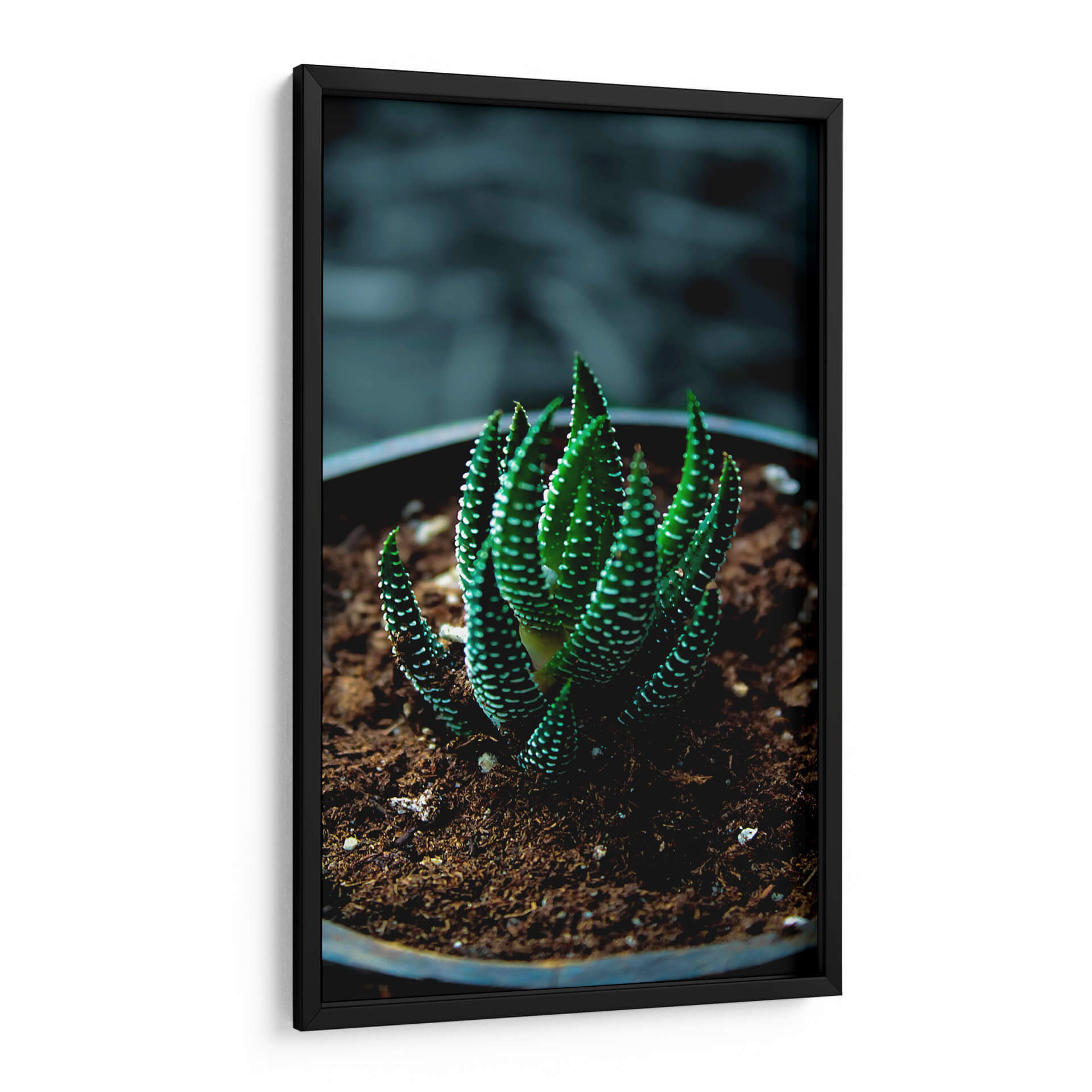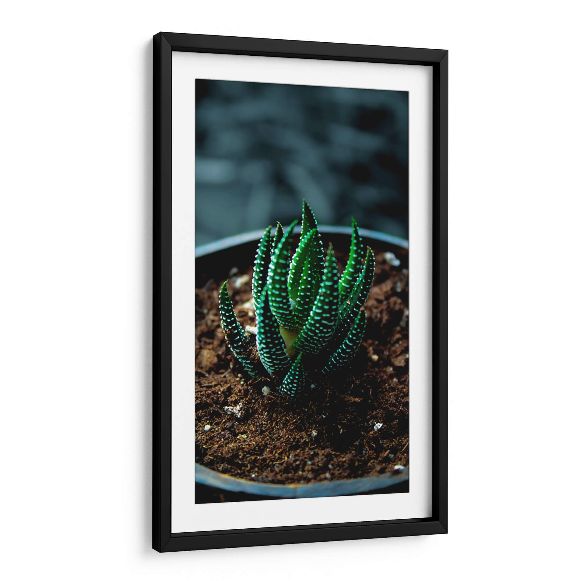Captura la esencia de la naturaleza y la intrincada belleza de la vida vegetal con este cautivador cuadro decorativo 'Planta Cebra'. La obra presenta un primer plano detallado de una suculenta, específicamente una planta cebra (Haworthia fasciata), con sus características hojas alargadas y carnosa cubiertas de distintivas marcas blancas que crean un patrón hipnótico. El contraste entre el verde vibrante de las hojas y el marrón terroso del sustrato, todo enmarcado por un fondo oscuro y desenfocado, realza la textura y la forma tridimensional de la planta. La iluminación, sutil pero efectiva, modela las formas y resalta las pequeñas gotas de humedad o rocío que puedan adornar las hojas, añadiendo un toque de frescura y vitalidad. Este cuadro decorativo es una oda a la resistencia y la elegancia minimalista del reino vegetal, transmitiendo una sensación de calma, orden y conexión con la tierra. Su estilo fotográfico y detallado lo convierte en una pieza versátil, perfecta para añadir un toque de serenidad y un elemento natural a cualquier espacio, desde un rincón de lectura acogedor hasta una oficina moderna o un dormitorio tranquilo. Ideal para amantes de las plantas, la botánica y aquellos que buscan una decoración que inspire paz y crecimiento.