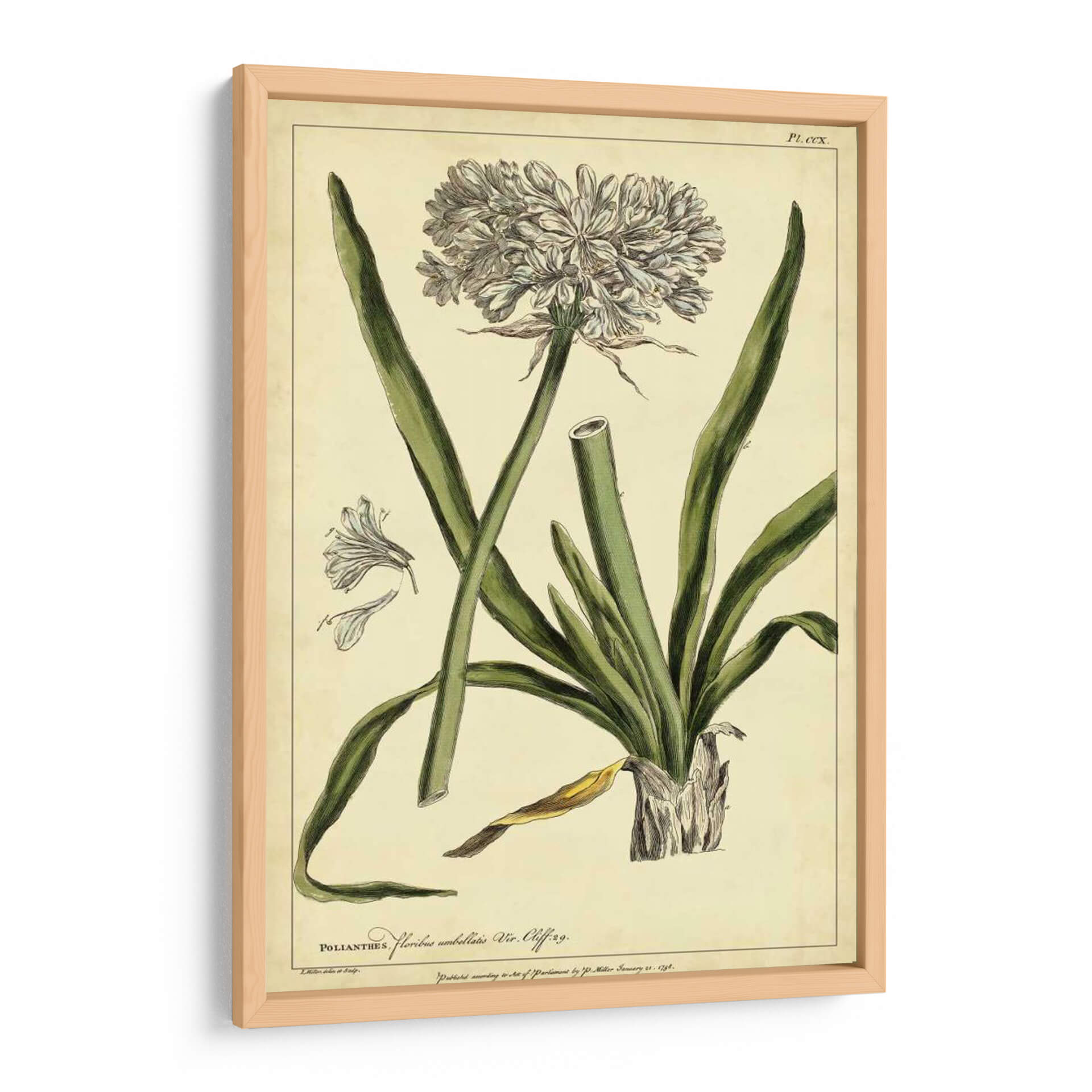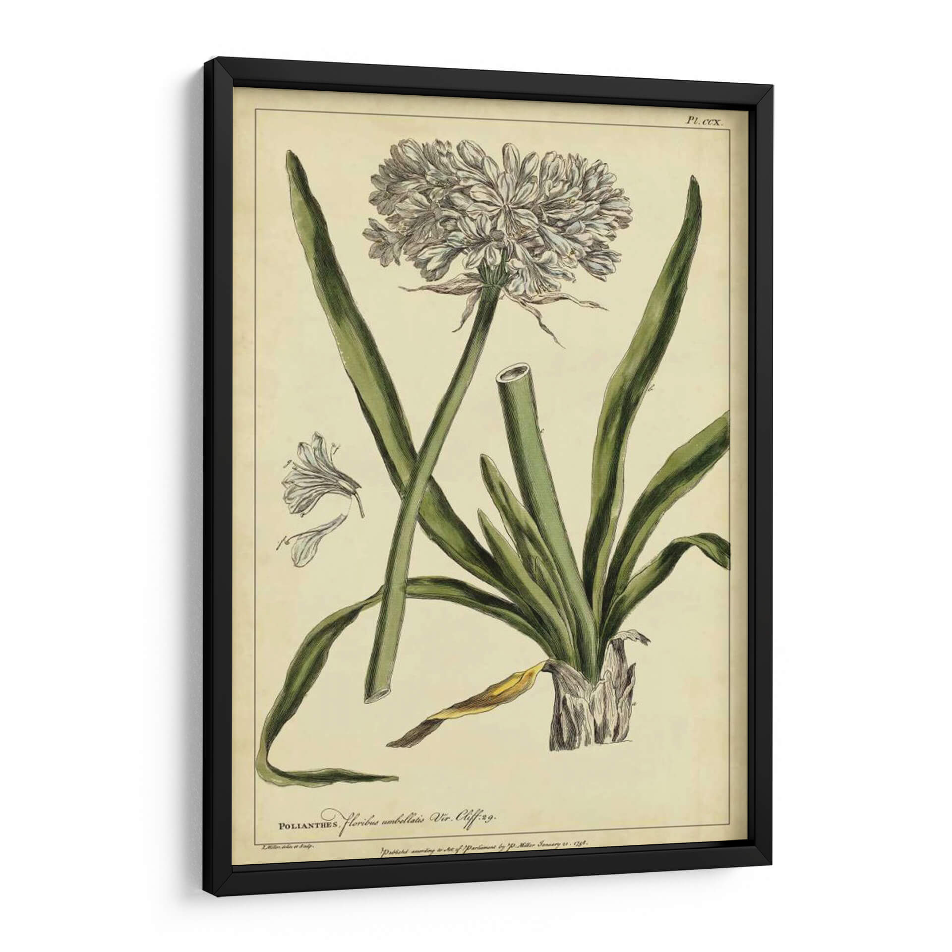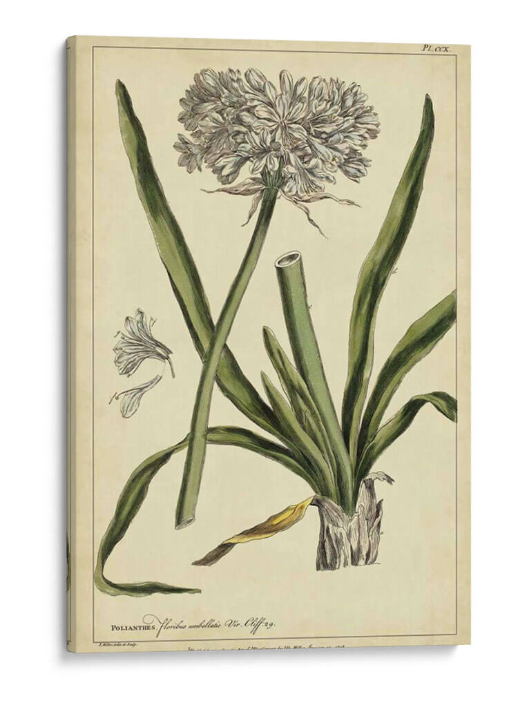 Embellece tu hogar con este exquisito cuadro decorativo botánico, una reproducción fiel de la obra "Poliantes, Pl. Ccx" del artista Philip Miller. Esta pieza evoca la belleza clásica de la ilustración científica, presentando una detallada representación de una flor con sus pétalos intrincados y hojas alargadas, todo sobre un fondo de tono pergamino que le otorga un aire atemporal. La paleta de colores, dominada por verdes suaves y blancos delicados, crea una atmósfera de serenidad y elegancia natural, perfecta para cualquier espacio que busque un toque de sofisticación botánica. Ideal para salas de estar, estudios o incluso oficinas, este cuadro decorativo de estilo vintage aportará un aire de refinamiento y conexión con la naturaleza. Su composición equilibrada y el detalle artístico lo convierten en un punto focal encantador, invitando a la contemplación y añadiendo una dimensión de historia natural a tu decoración. Una elección perfecta para amantes del arte botánico y aquellos que aprecian la belleza de la flora representada con maestría y precisión.